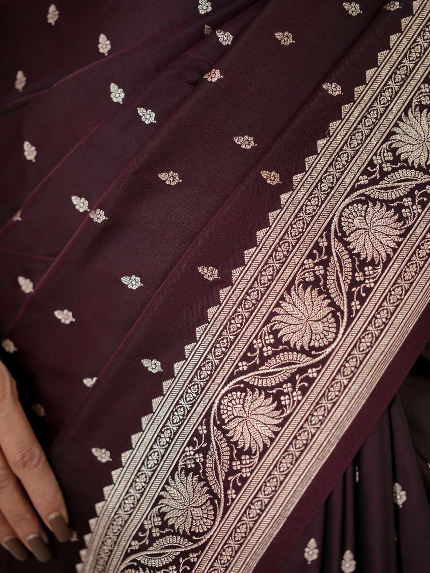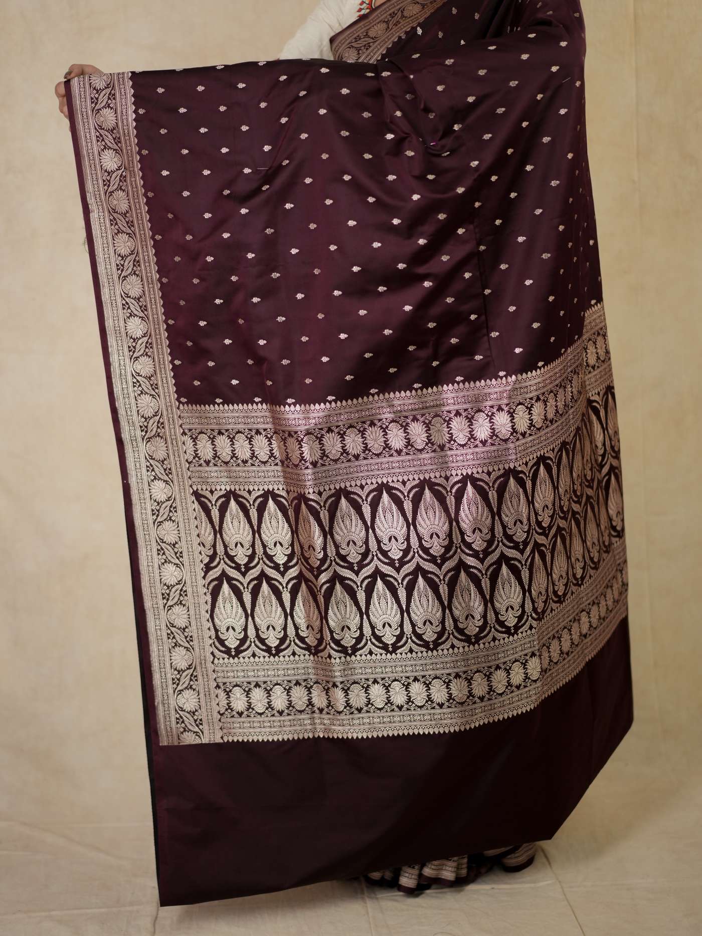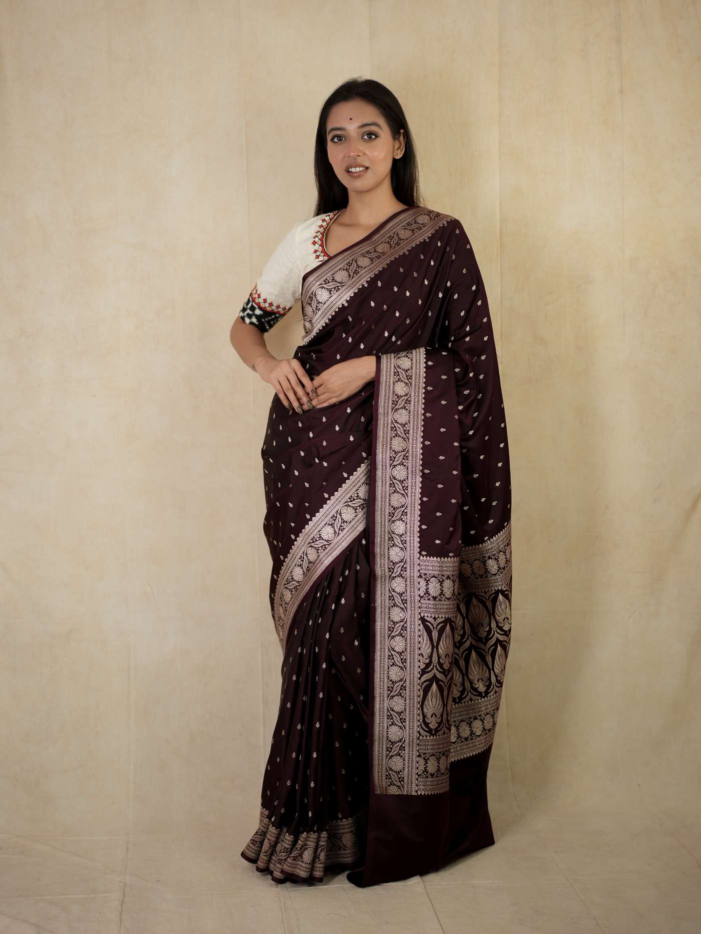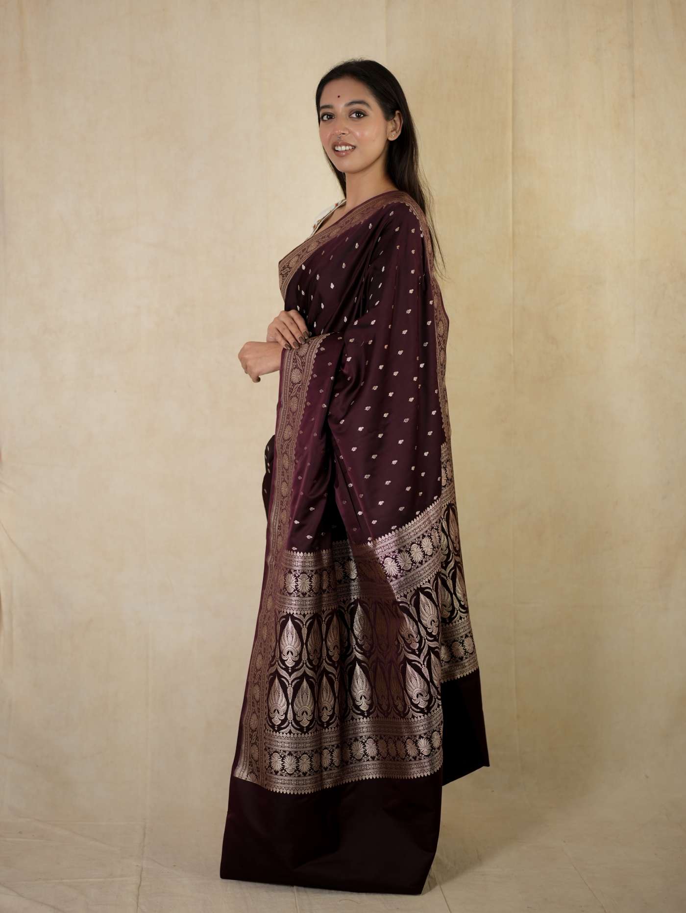 Experience regal elegance with our dark brown silk Art Banarasi saree, adorned with delicate butta motifs woven across the body. The saree is enhanced with a richly detailed antique golden zari border. The pallu showcases elaborate floral and paisley motifs in shimmering zari work, reflecting classic Banarasi craftsmanship—perfect for weddings and grand festive occasions.