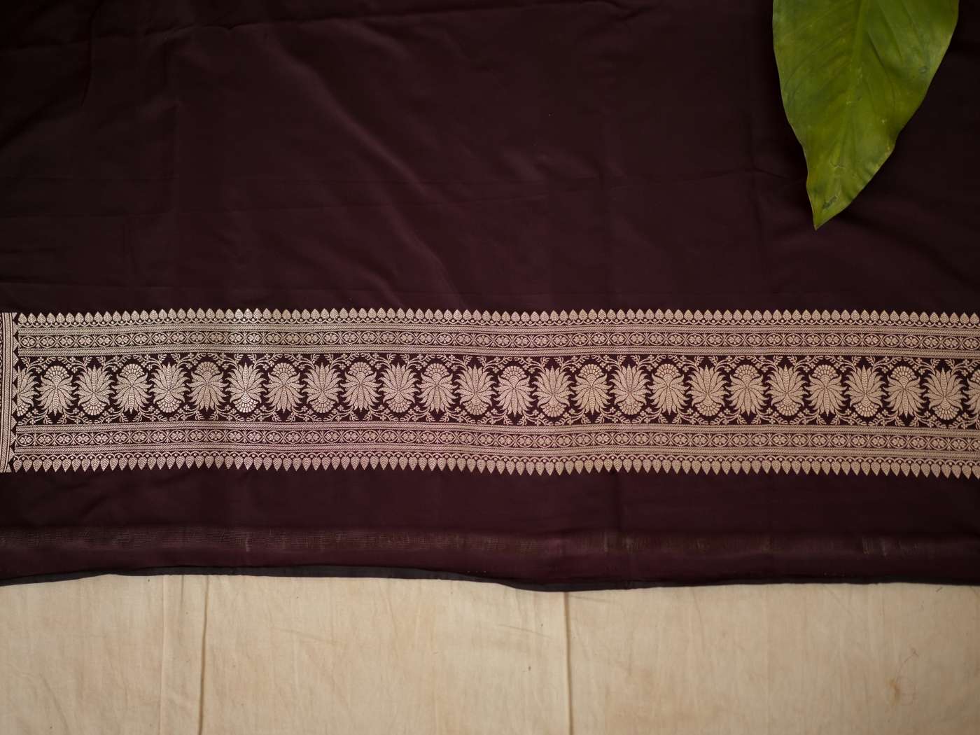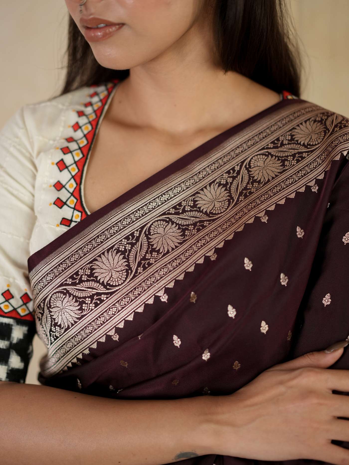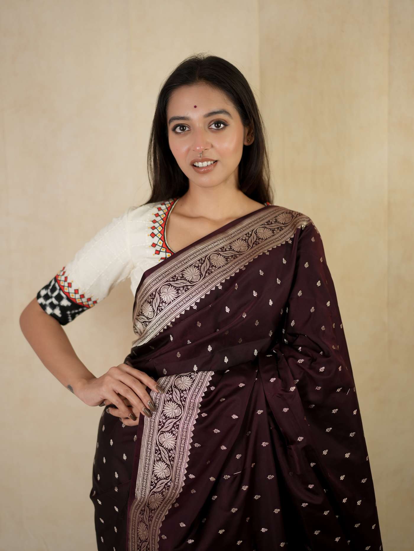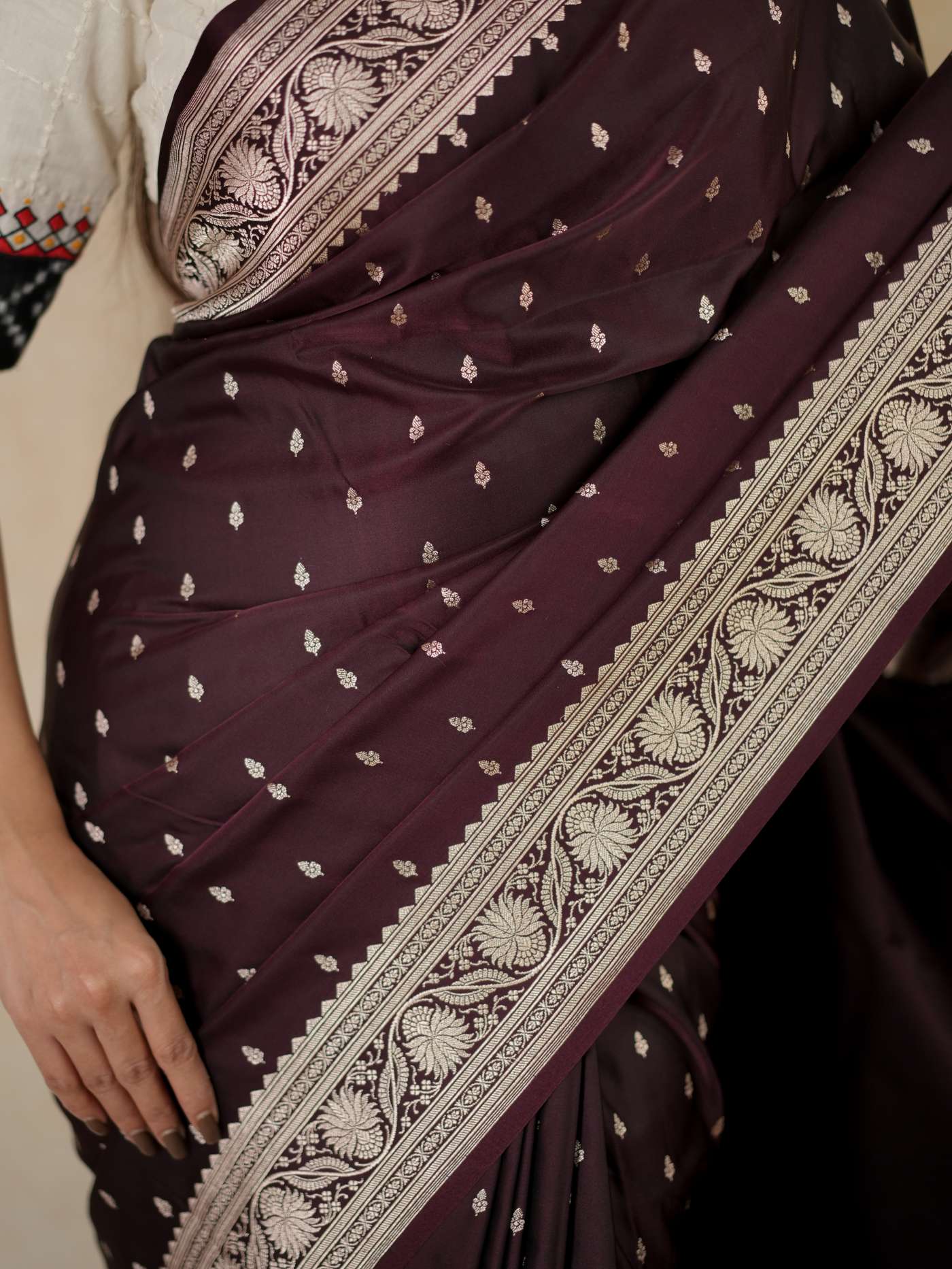 Experience regal elegance with our dark brown silk Art Banarasi saree, adorned with delicate butta motifs woven across the body. The saree is enhanced with a richly detailed antique golden zari border. The pallu showcases elaborate floral and paisley motifs in shimmering zari work, reflecting classic Banarasi craftsmanship—perfect for weddings and grand festive occasions.