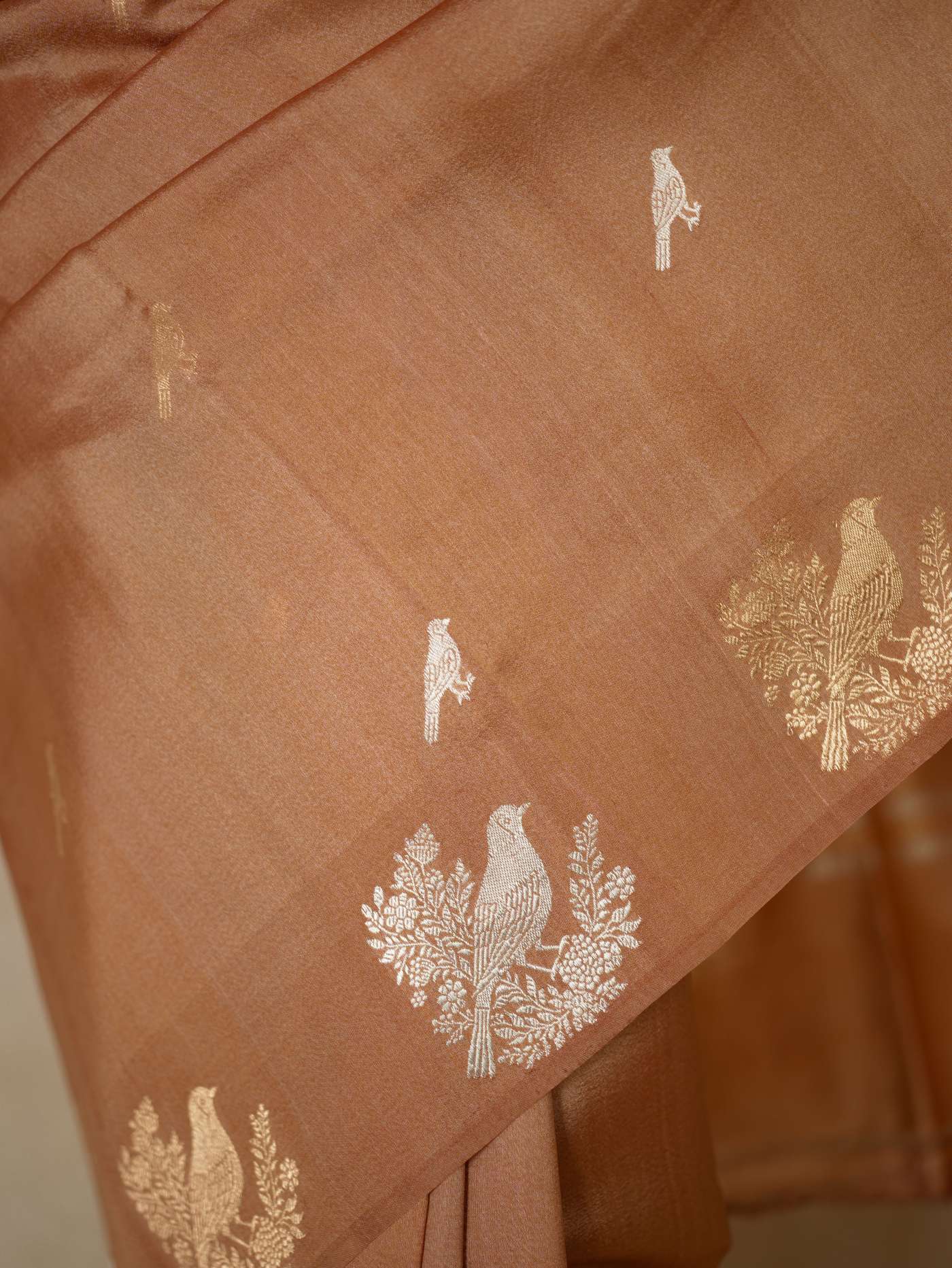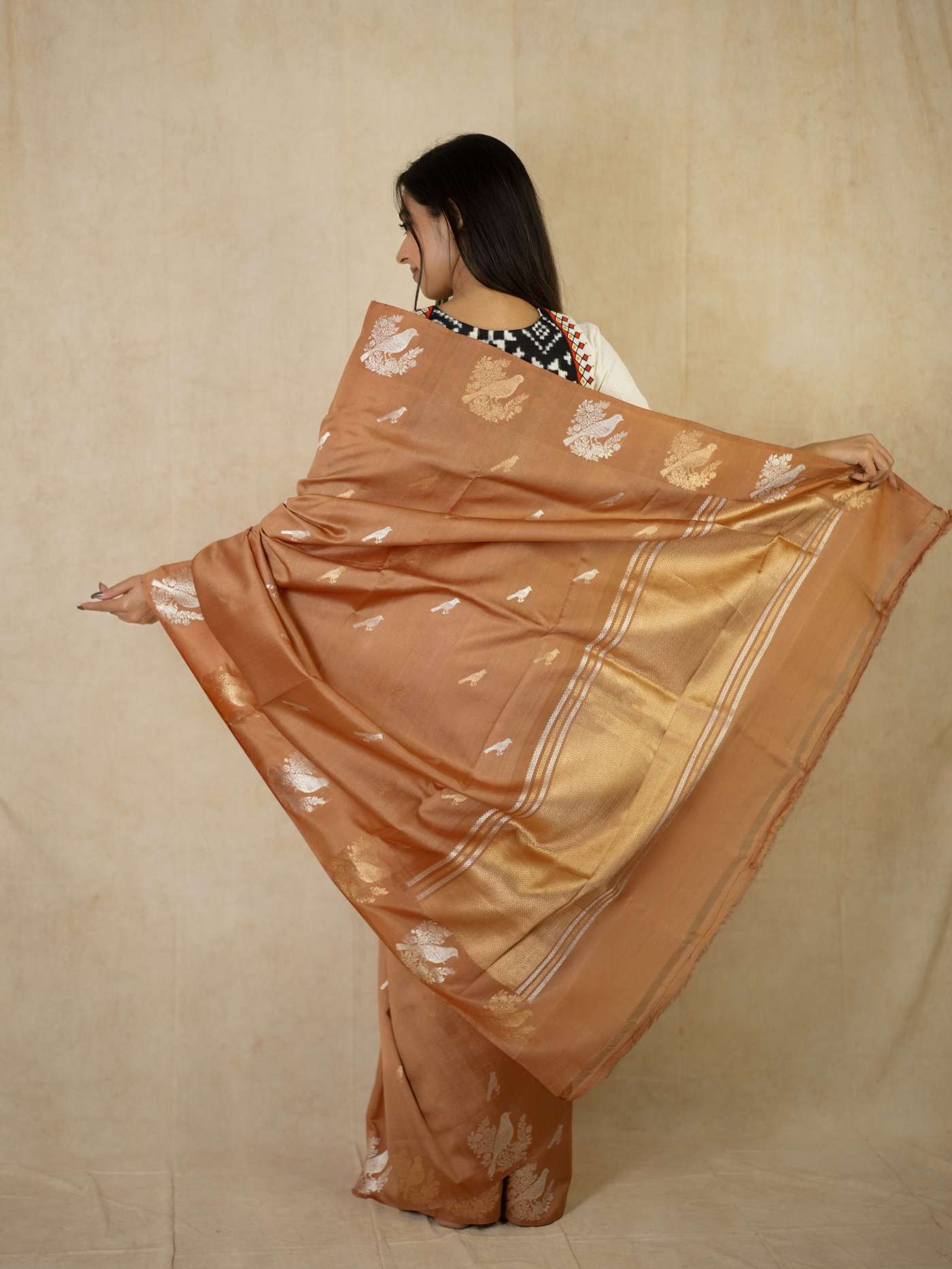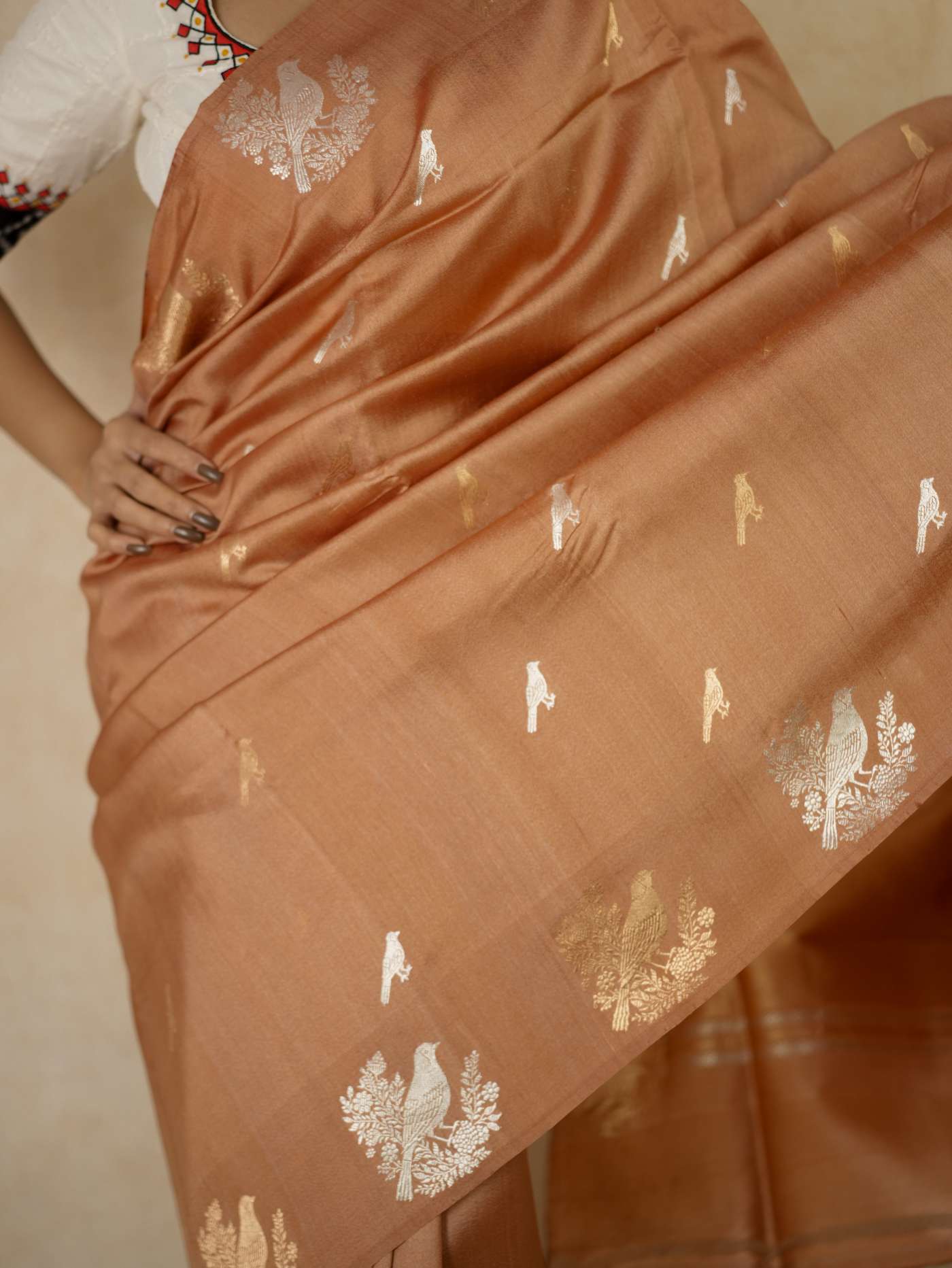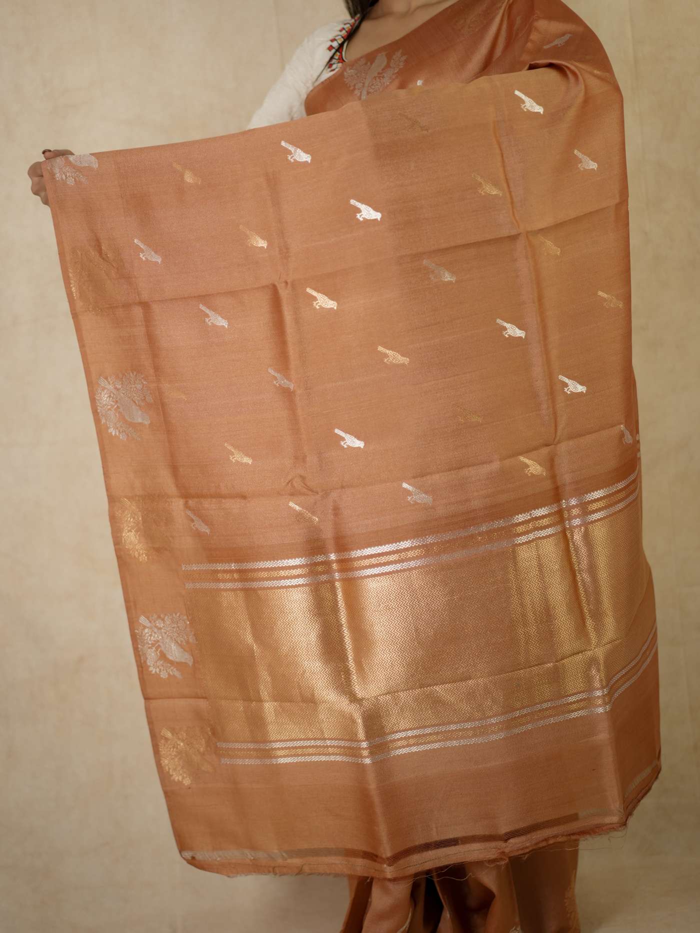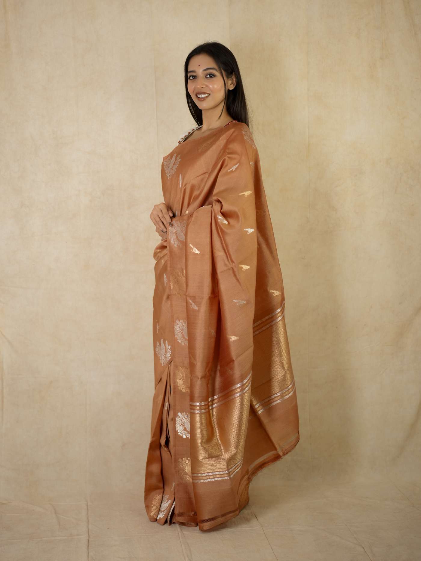 Delve into the subtle elegance of this peach Tussar Banarasi saree, adorned with delicate silver and antique gold butta motifs gracefully spread across the body. The soft texture is enhanced by refined silver zari work on the border and pallu, featuring traditional floral and geometric patterns. Ideal for festive gatherings and special occasions, this saree exudes timeless charm and understated Banarasi sophistication.