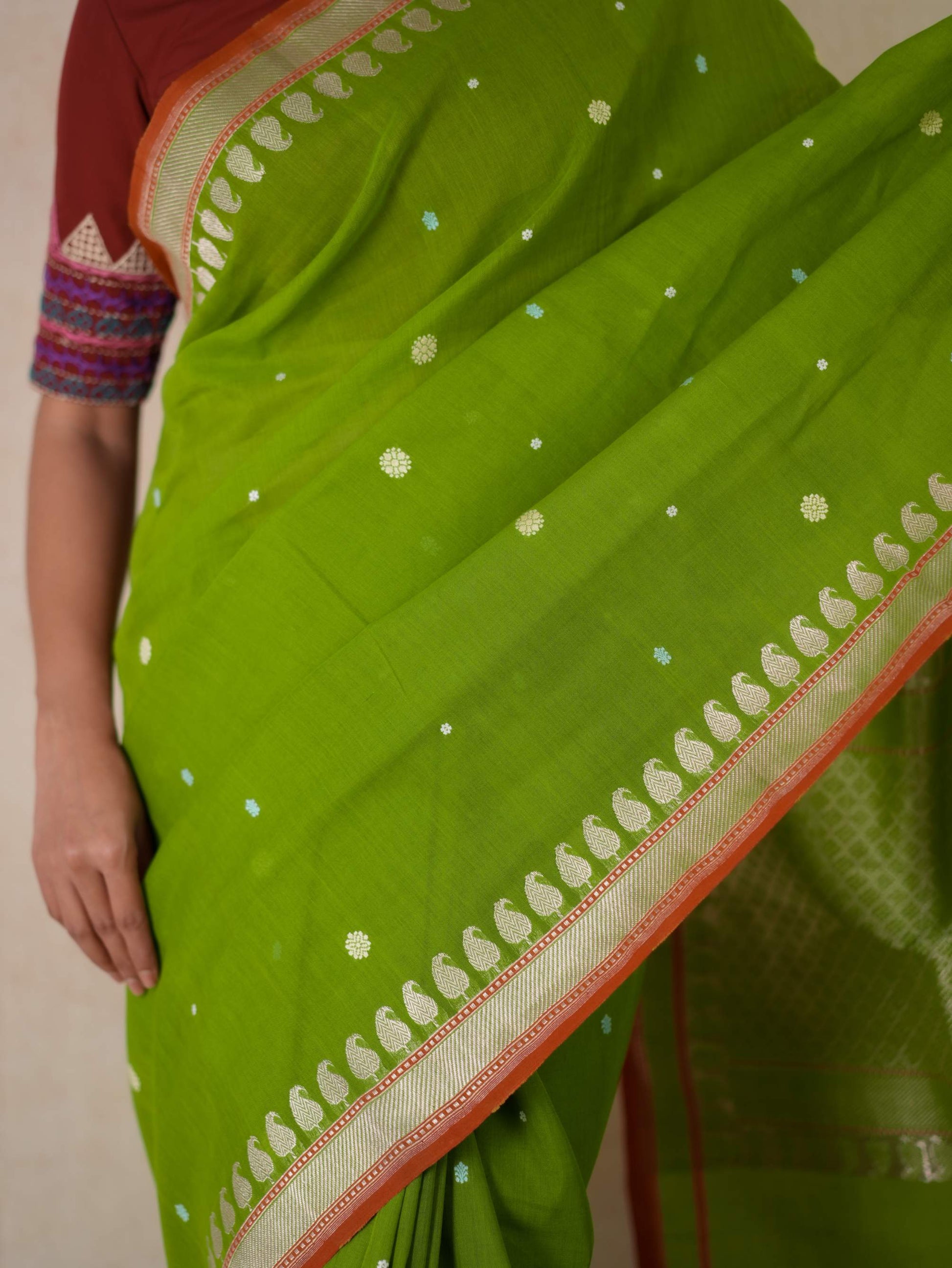 Discover the grace of light green cotton Banarasi sarees, where elegance meets comfort. The highlight of the saree is the intricate thread buties all across and the delicate silver colored zari work in the border and pallu. The red coloured selvedge gives a contrasting edge to the look the saree itself. The saree blended with the softness of cotton with the intricate craftsmanship of Banaras are perfect for both festive occasions and everyday elegance. Embrace timeless style with a touch of heritage in every drape.