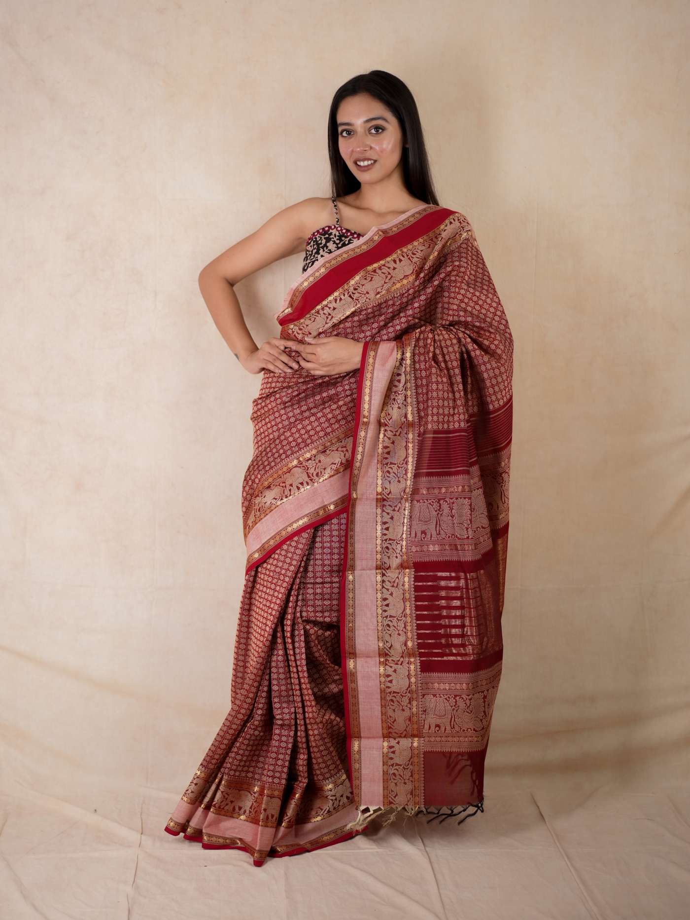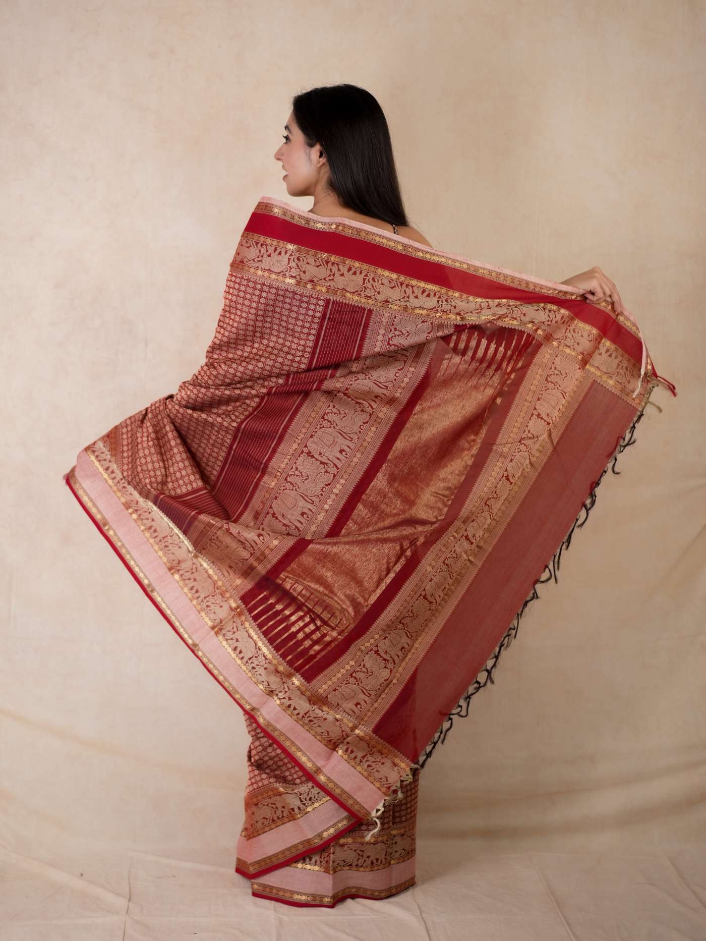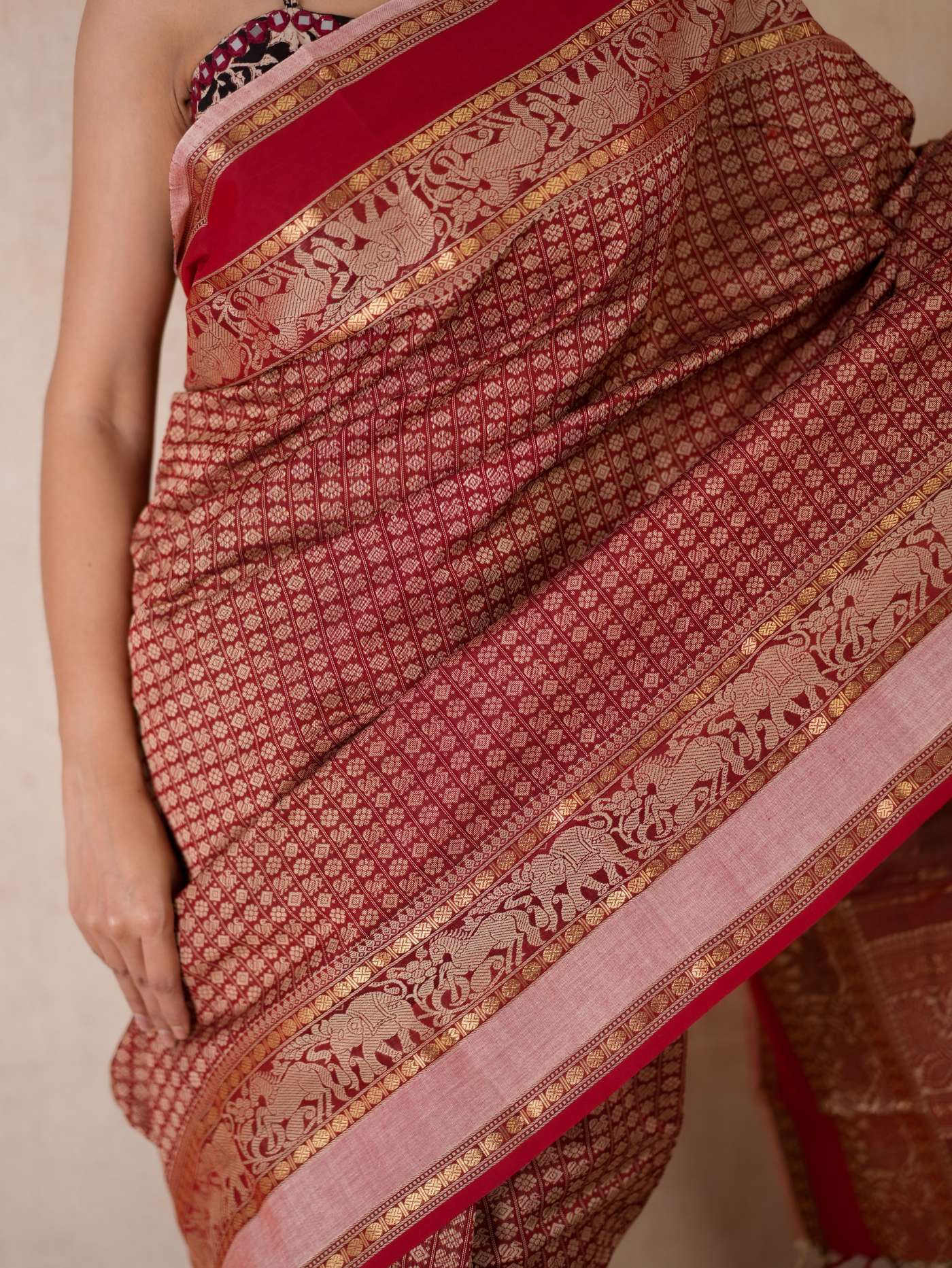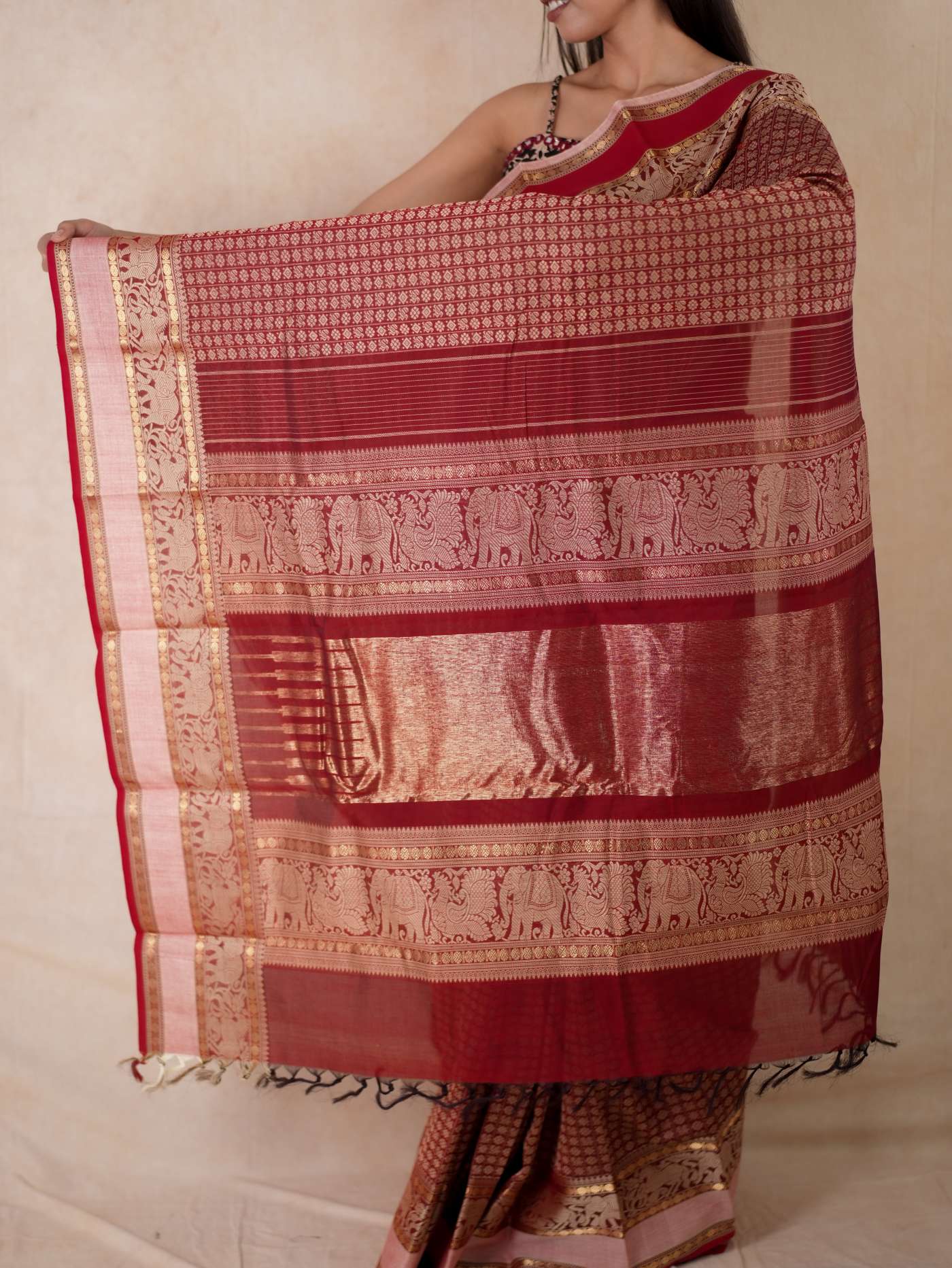 Enhance your ethnic ensemble with our red & dark brown dual tone Kanchipuram cotton saree, featuring intricate 20,000 butas all across with a vibrant red border. Perfect for any special occasion, this saree combines traditional artistry with modern elegance.