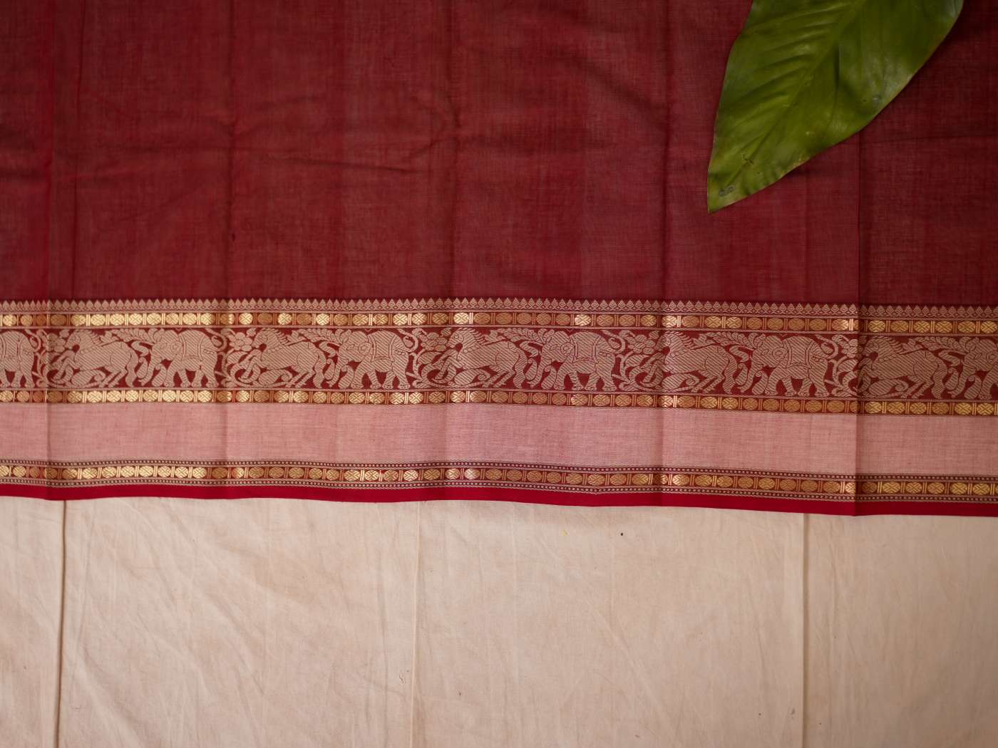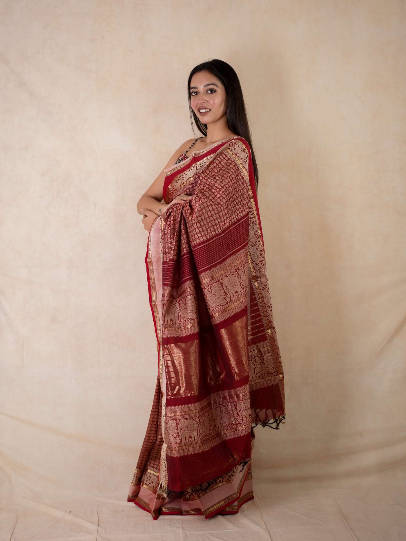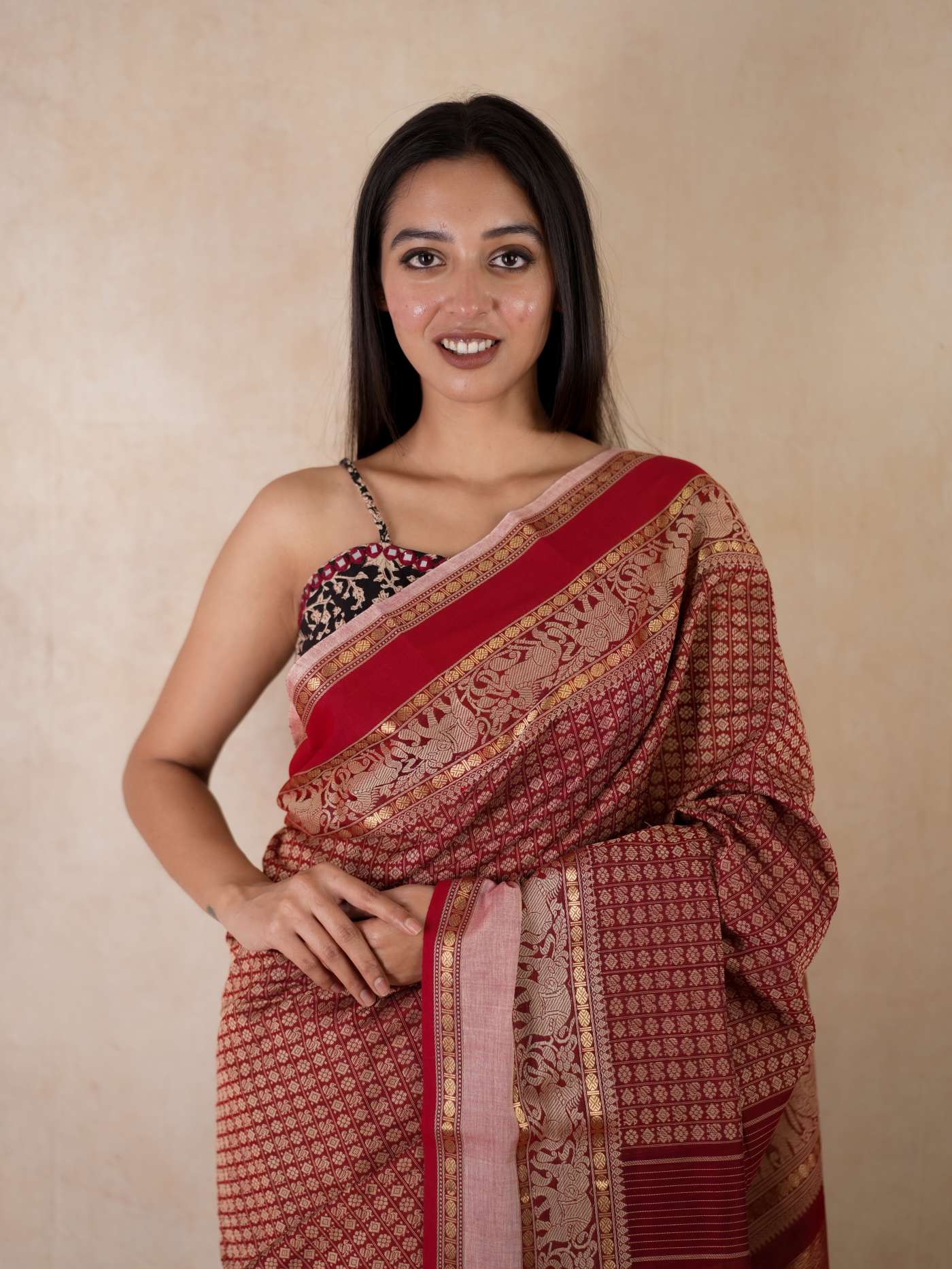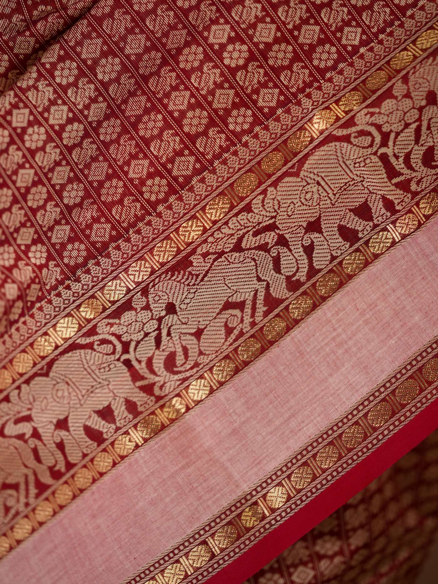 Enhance your ethnic ensemble with our red & dark brown dual tone Kanchipuram cotton saree, featuring intricate 20,000 butas all across with a vibrant red border. Perfect for any special occasion, this saree combines traditional artistry with modern elegance.