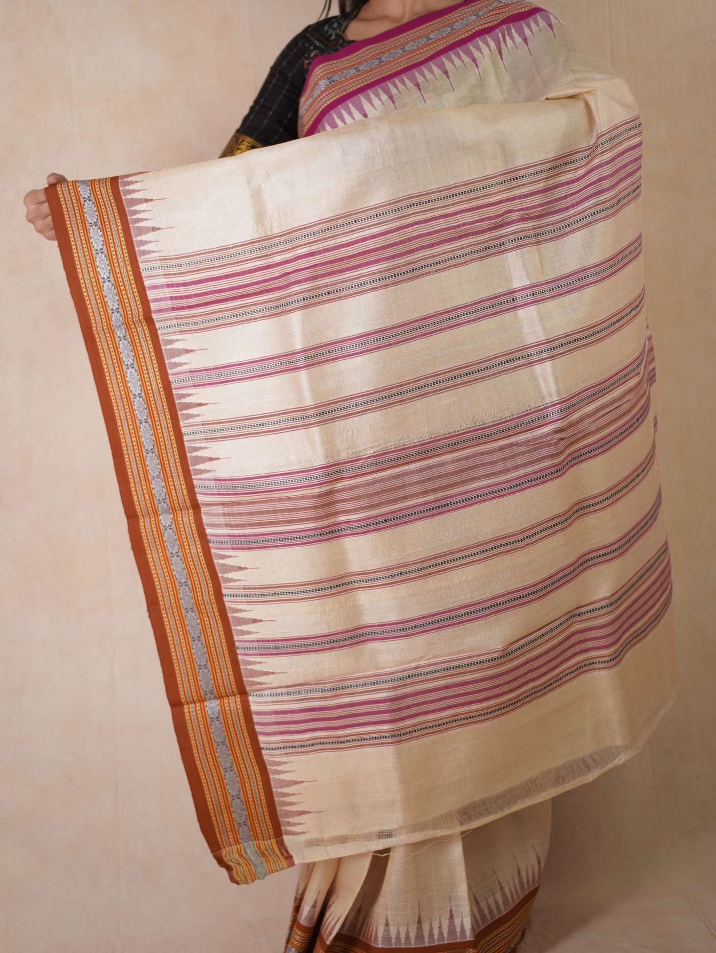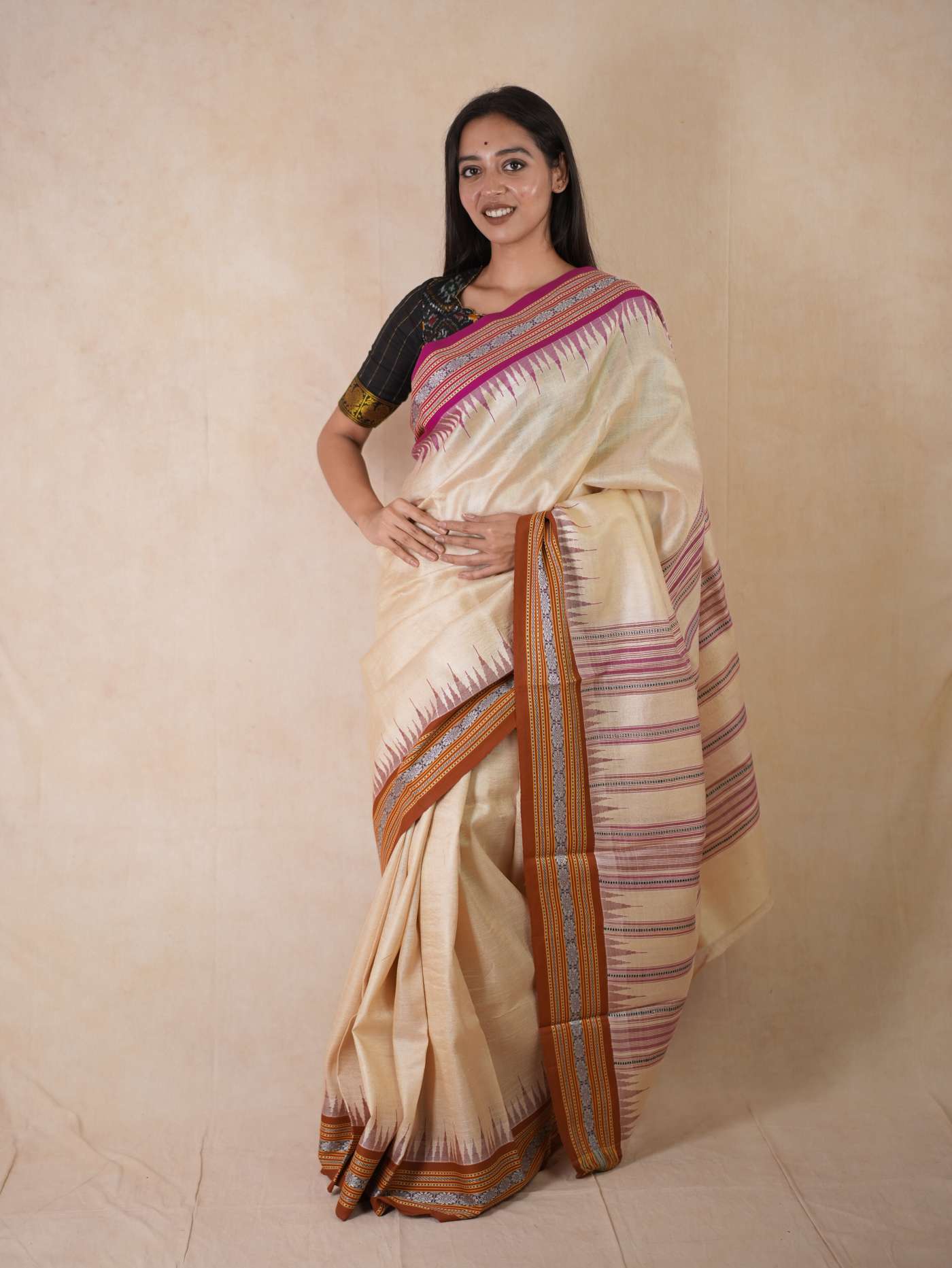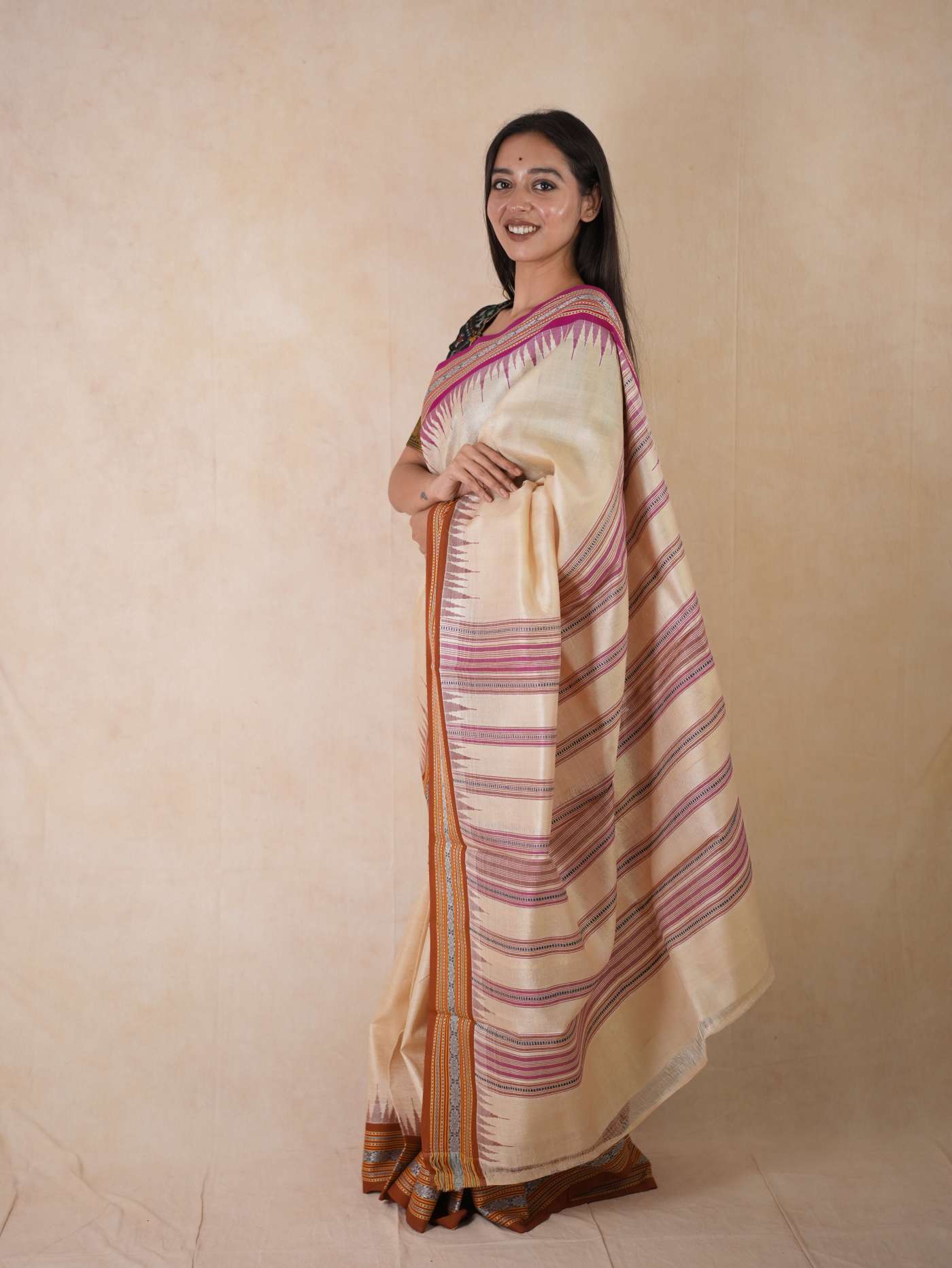 Indulge in the timeless beauty of our off-white Vidarbha tussar saree, this weave from Maharashtra is a fusion of tradition and artistry, woven from the finest tussar silk. Known for its natural sheen and rich texture, this weave carries an understated elegance, highlighted by the distinctive brown-pink Ganga Jamuna border in contrasting colors. A perfect choice for festive and formal occasions, it beautifully blends heritage with sophistication.