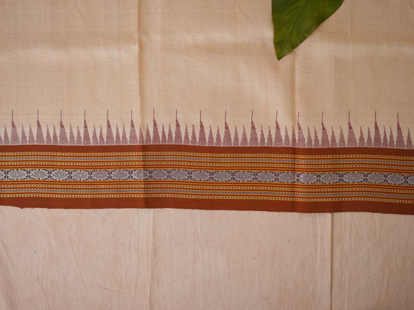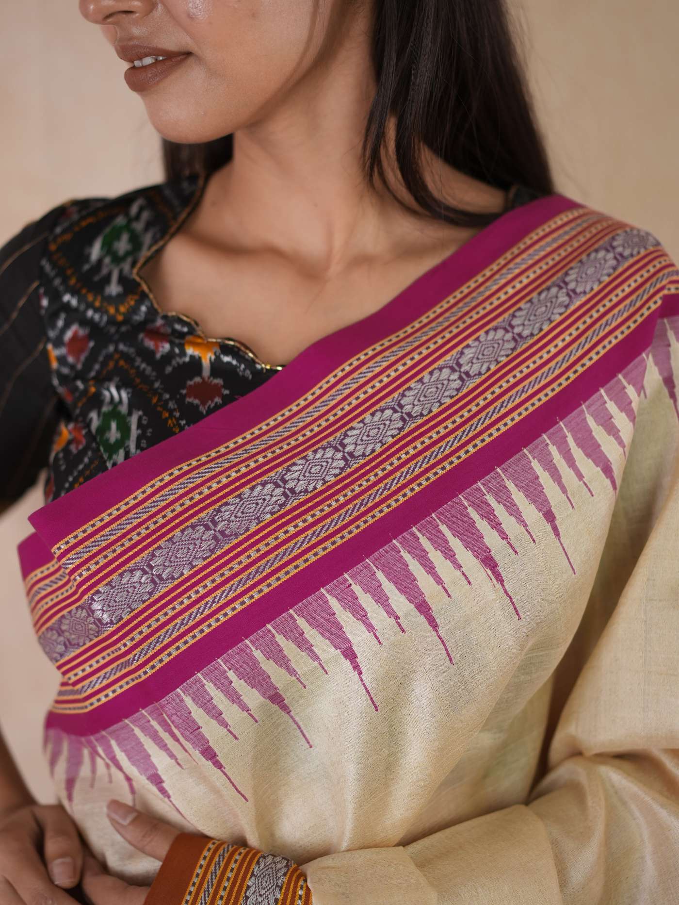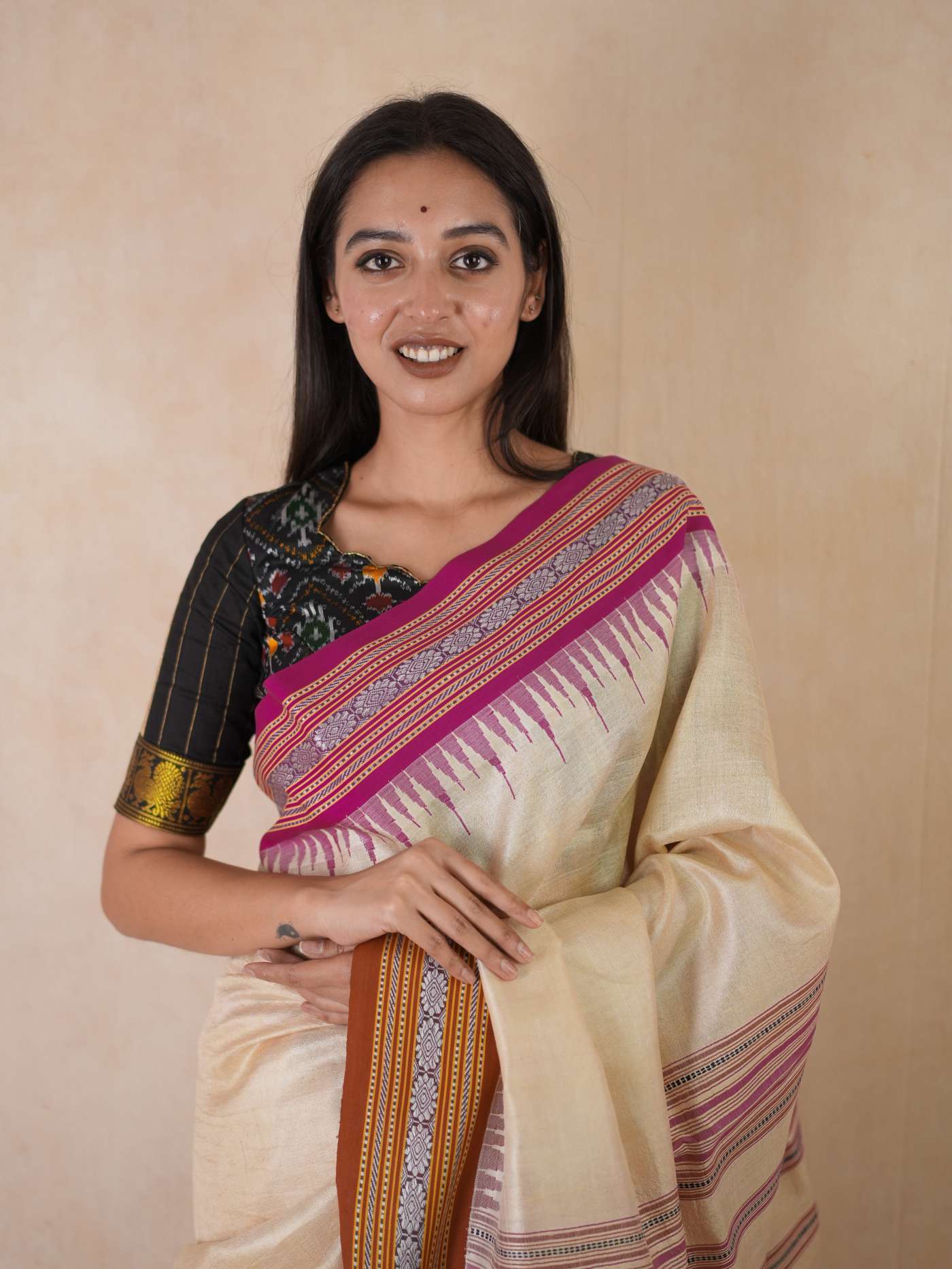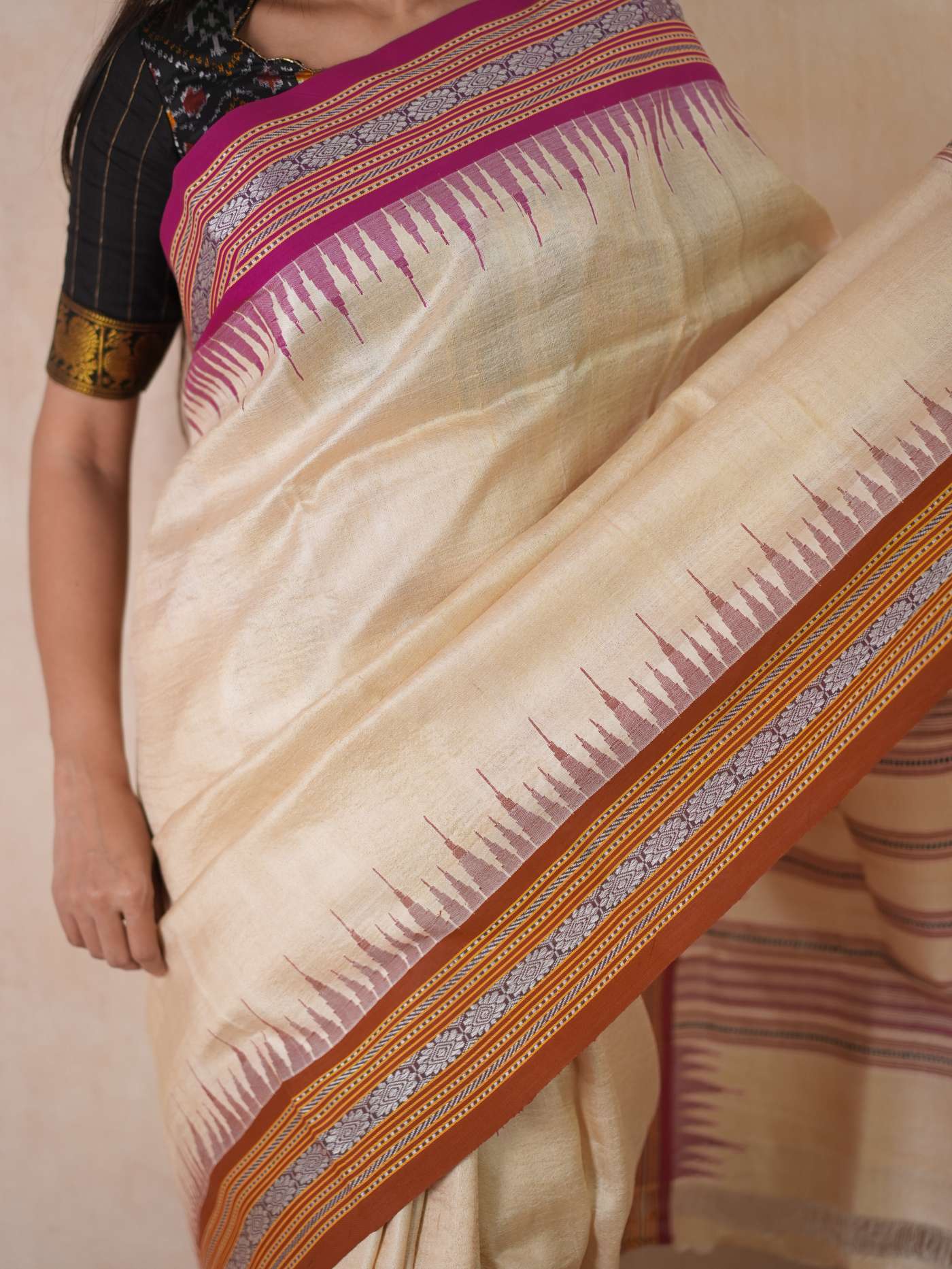 Indulge in the timeless beauty of our off-white Vidarbha tussar saree, this weave from Maharashtra is a fusion of tradition and artistry, woven from the finest tussar silk. Known for its natural sheen and rich texture, this weave carries an understated elegance, highlighted by the distinctive brown-pink Ganga Jamuna border in contrasting colors. A perfect choice for festive and formal occasions, it beautifully blends heritage with sophistication.