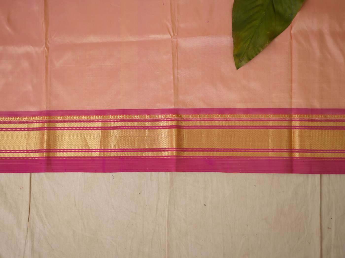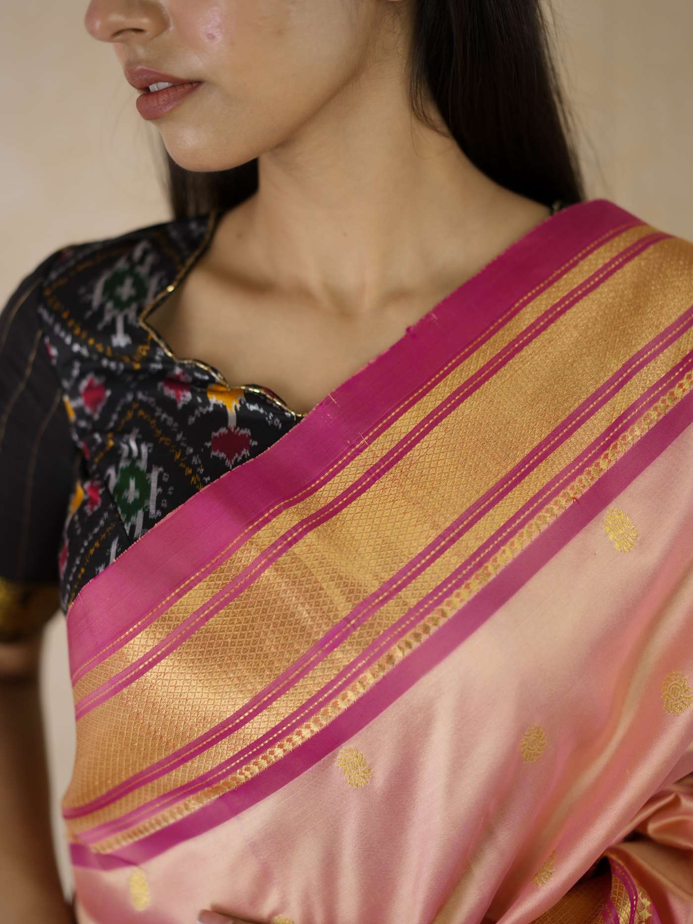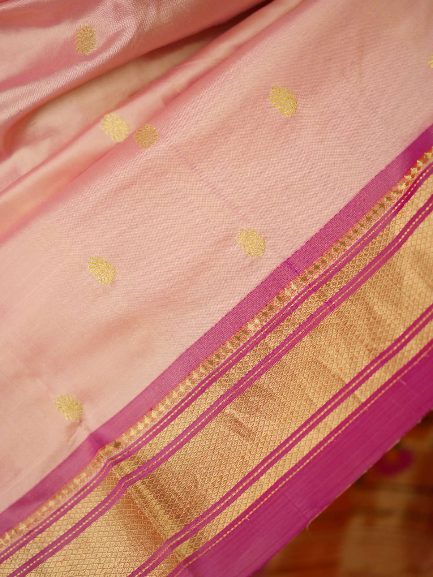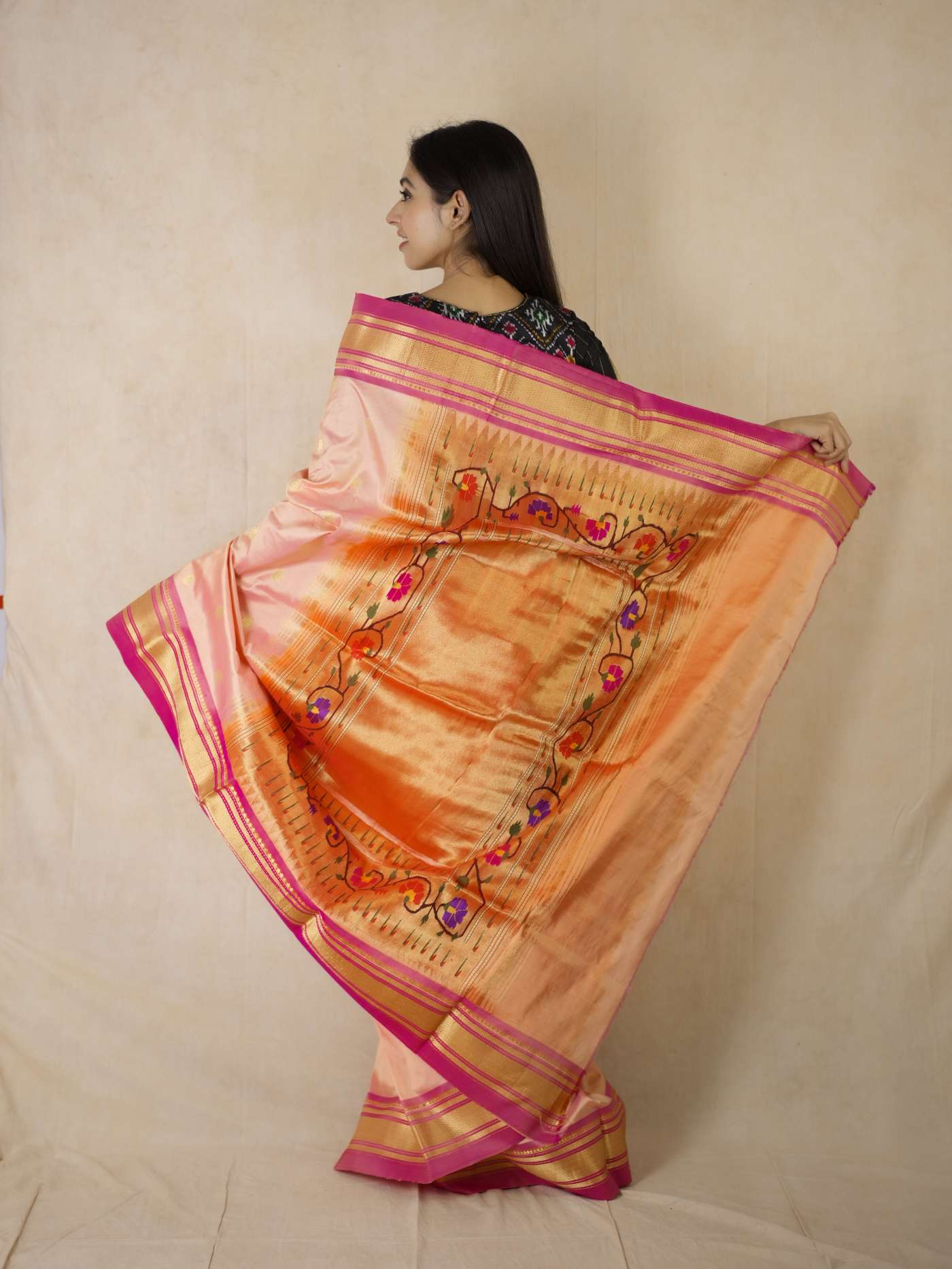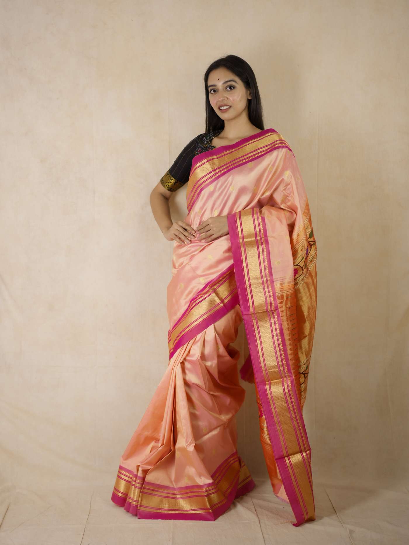 A timeless ode to Maratha heritage,this Paithani silk saree in the shade of peachish pink is a masterpiece of centuries-old craftsmanship, adorned with lustrous weaves and intricate motifs in golden zari inspired by nature and royalty. Originating from the royal dynasties of the Satavahana era, each drape carries the grandeur of tradition, the richness of colour, and an elegance passed down through generations.