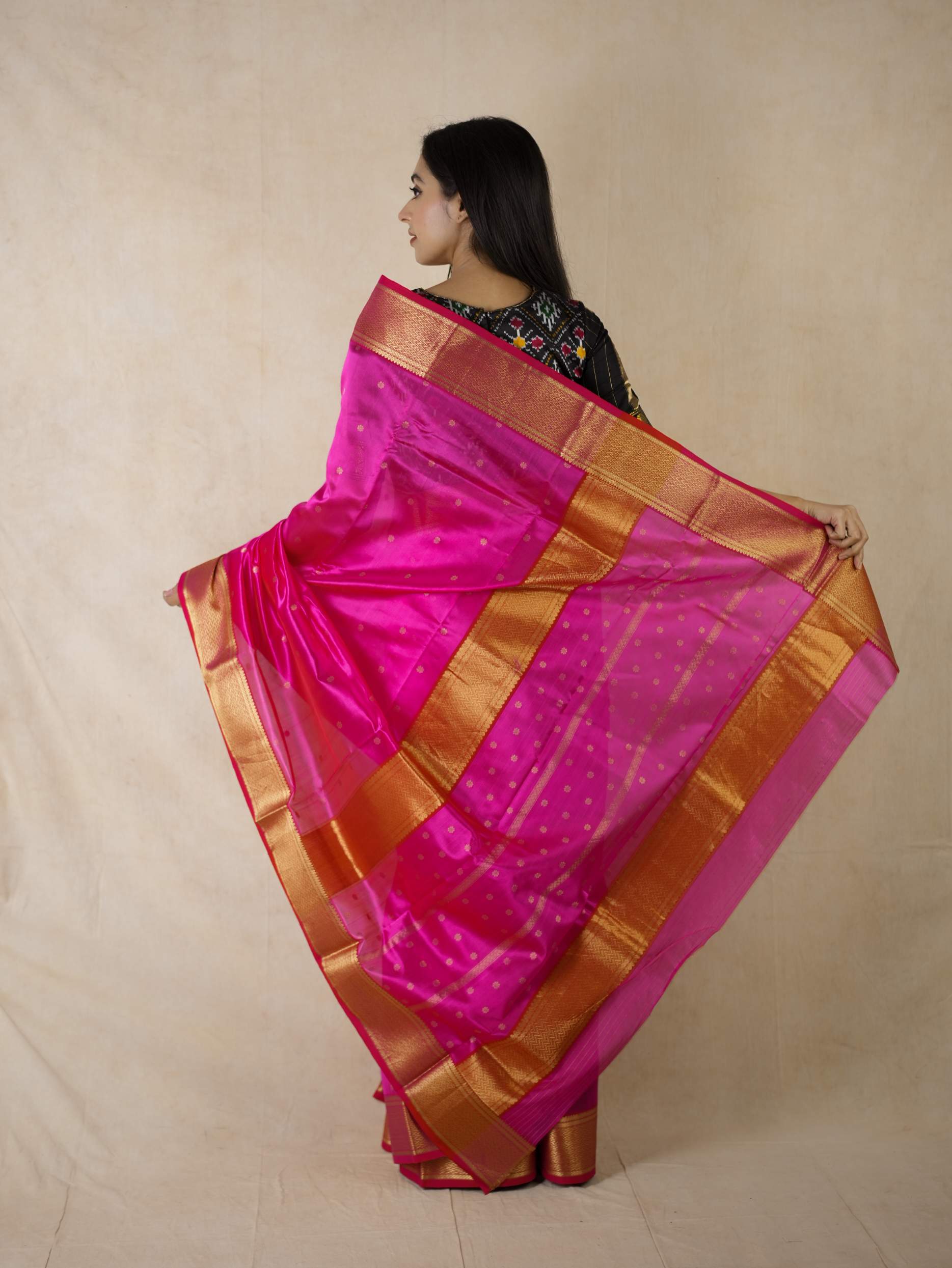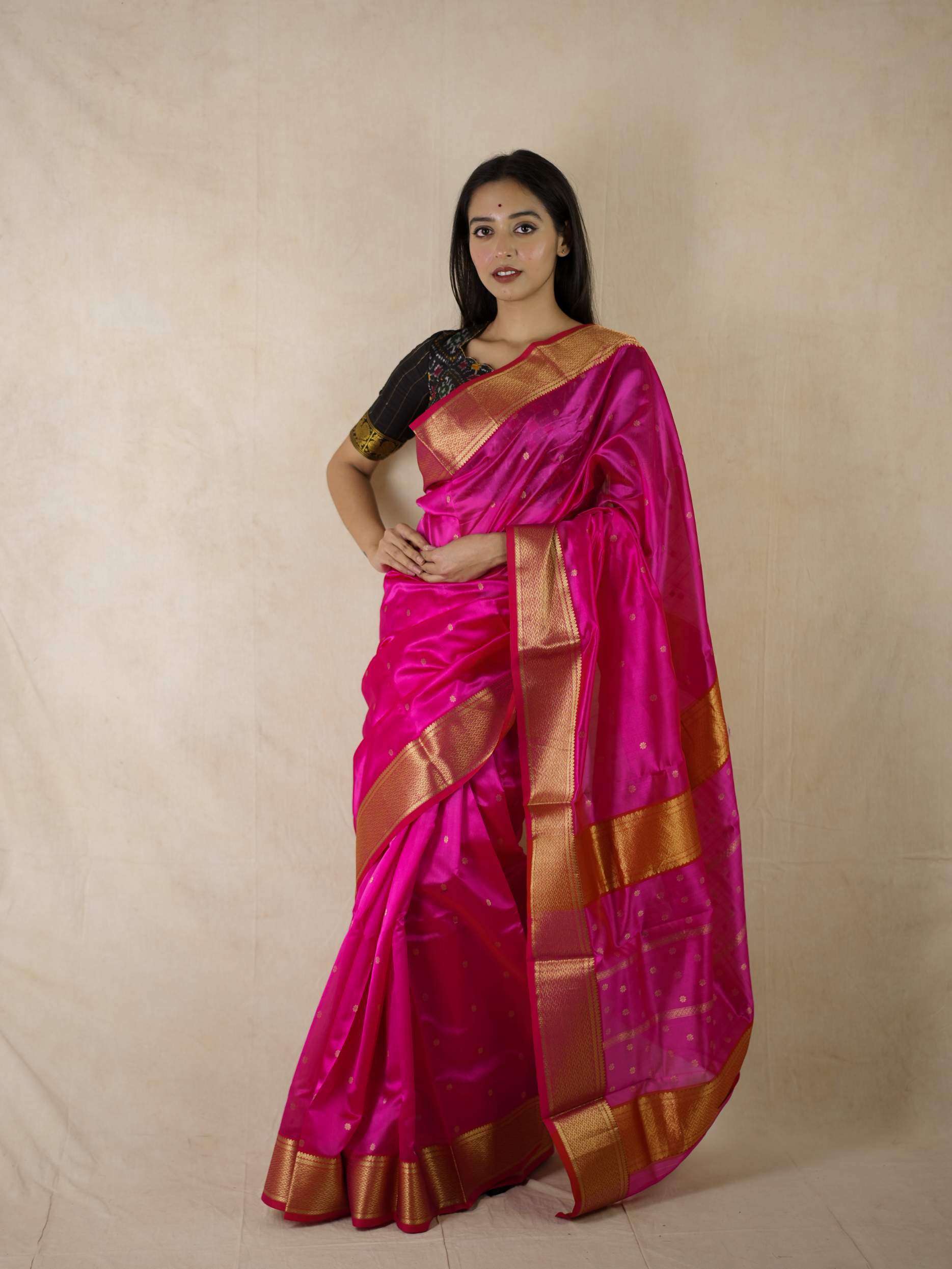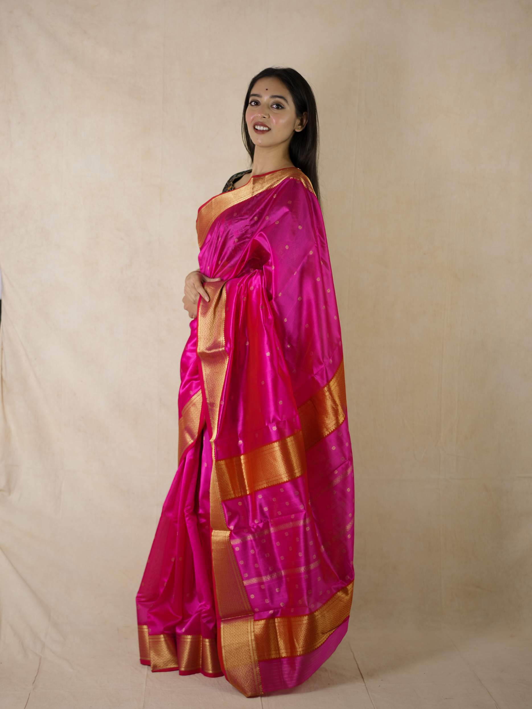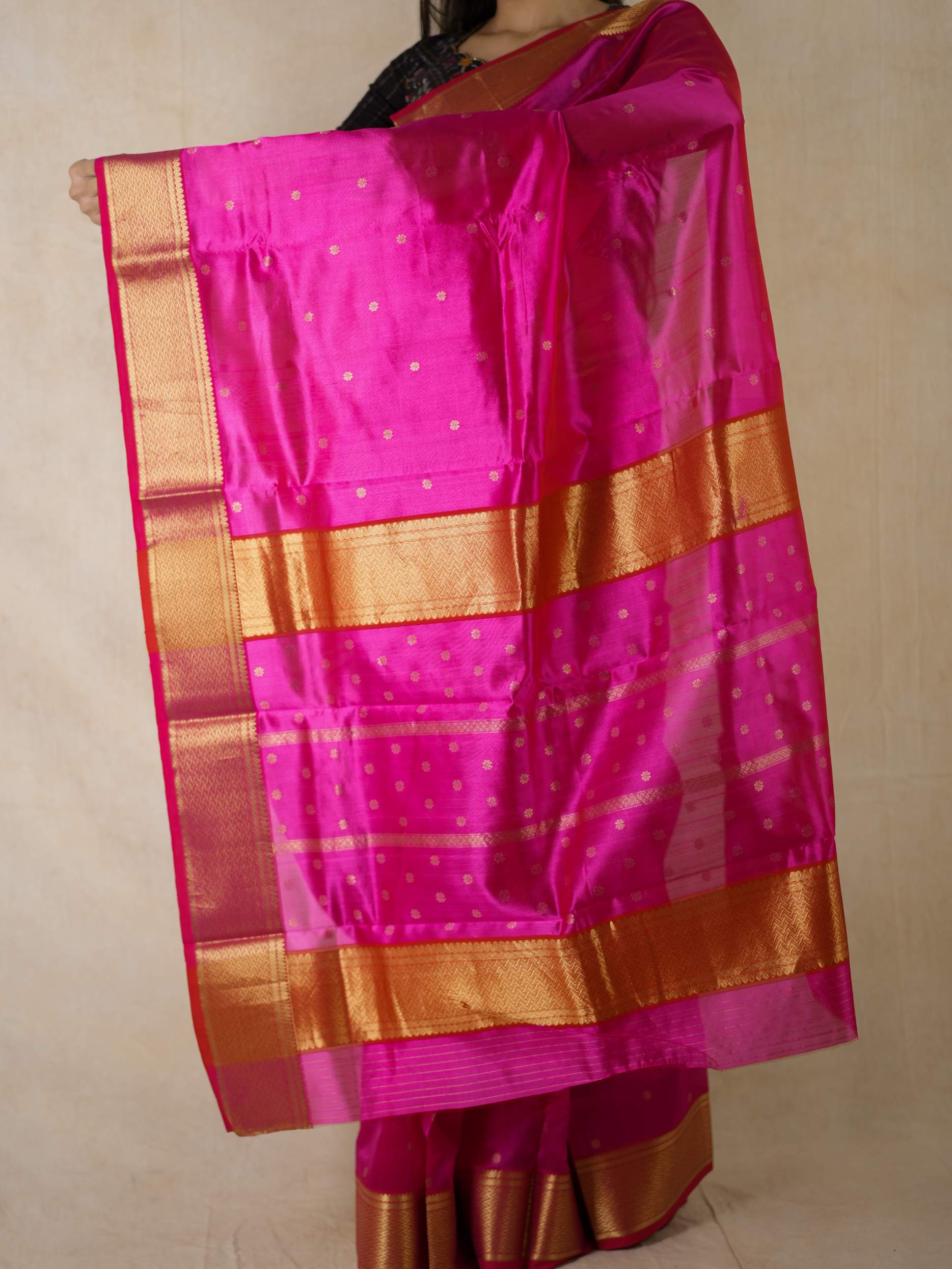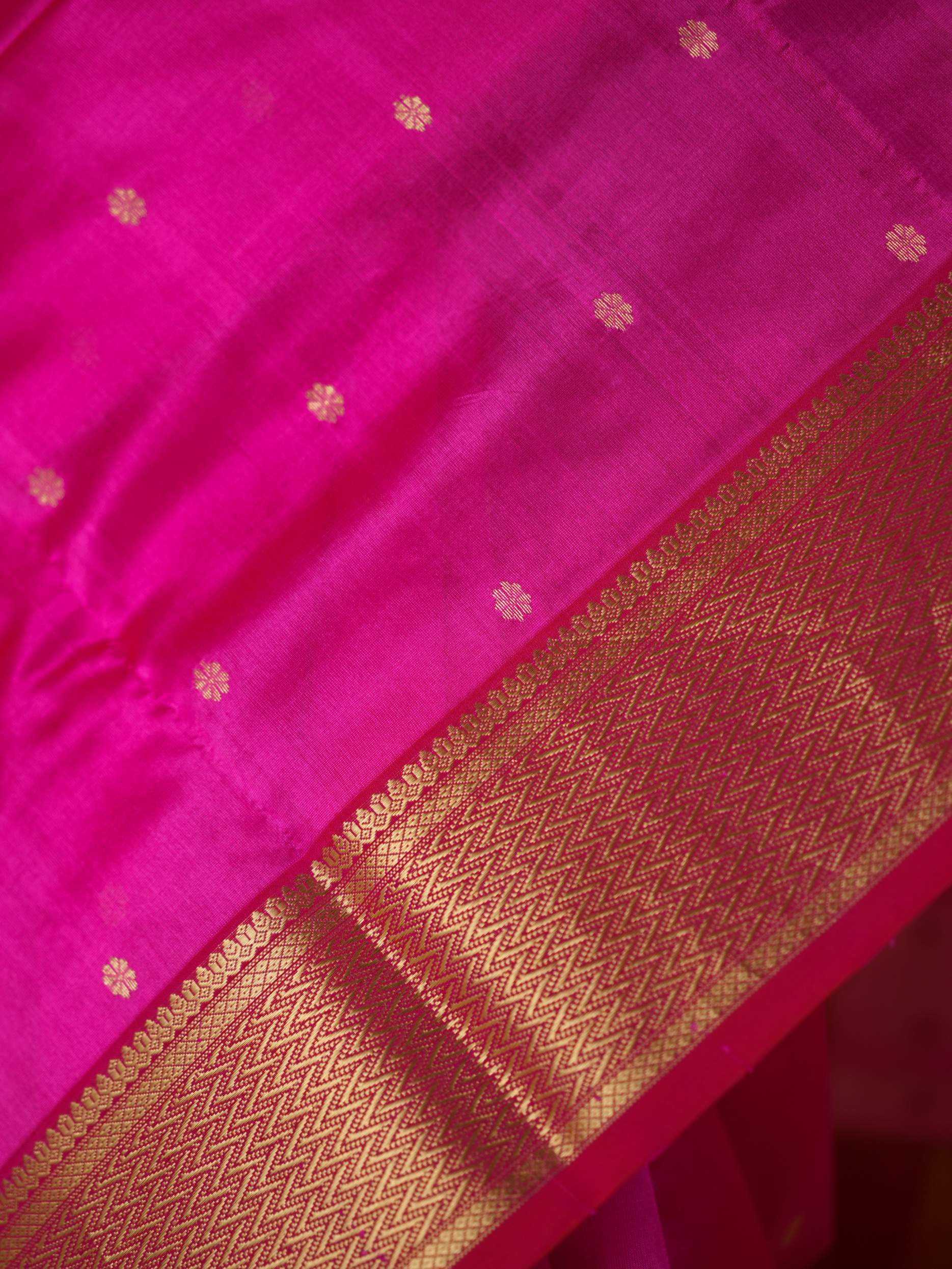 This Chanderi rani coloured silk saree embodies elegance and royalty, with delicate floral designs with stripes that shimmer with timeless beauty. Perfect for festive occasions or any event where you wish to shine with regal charm.