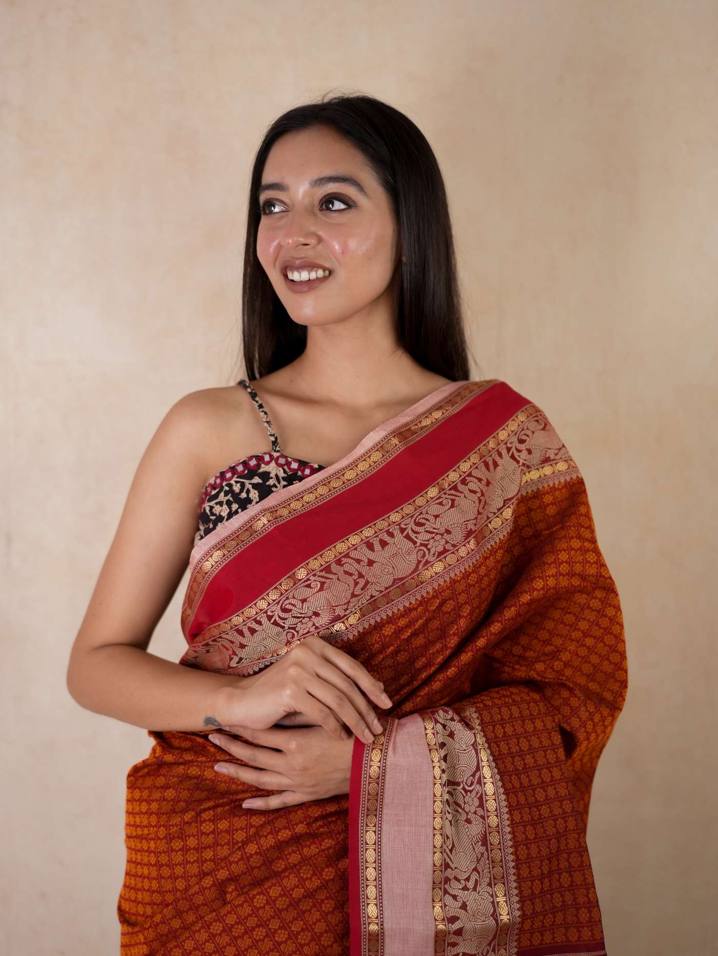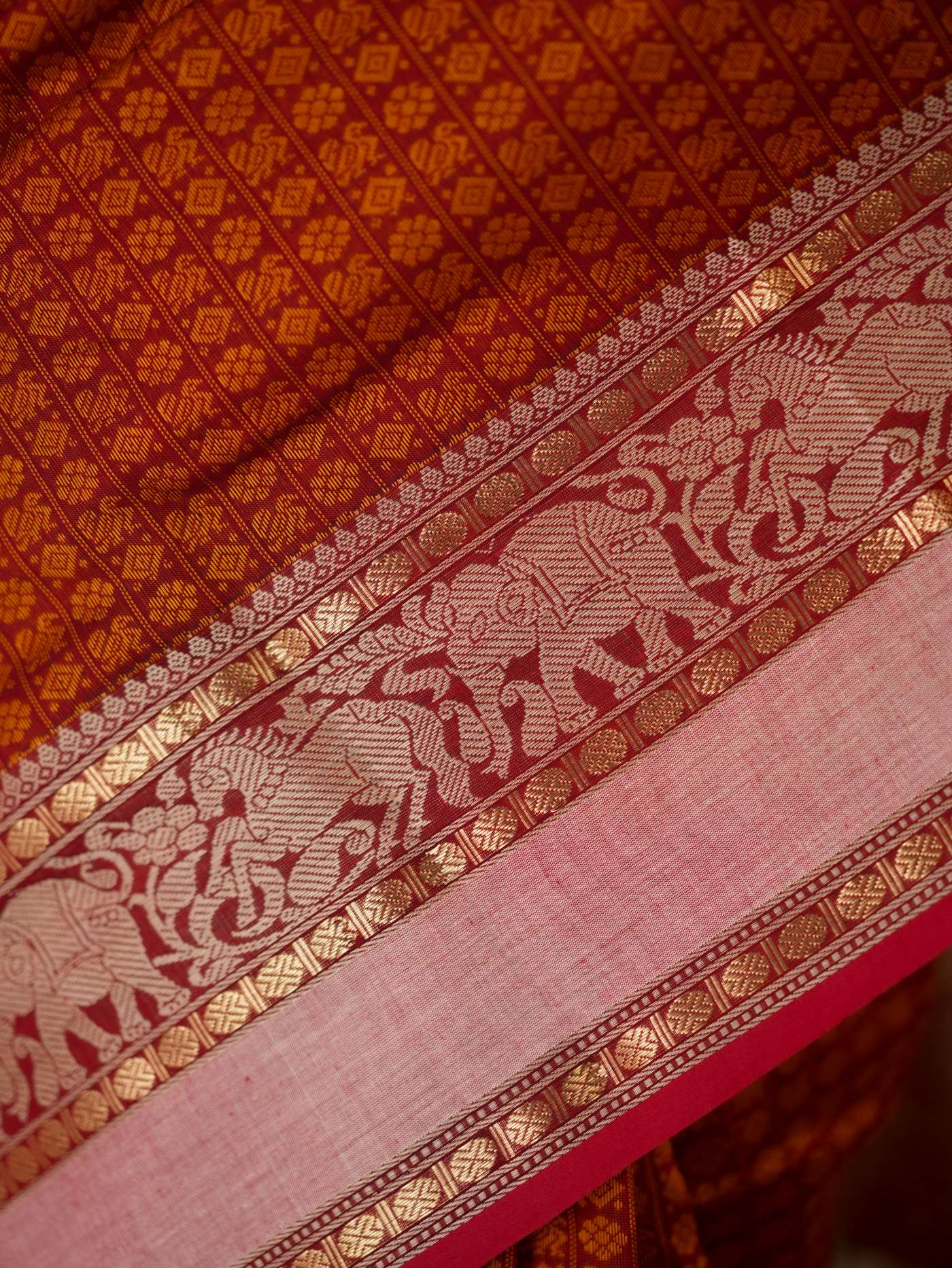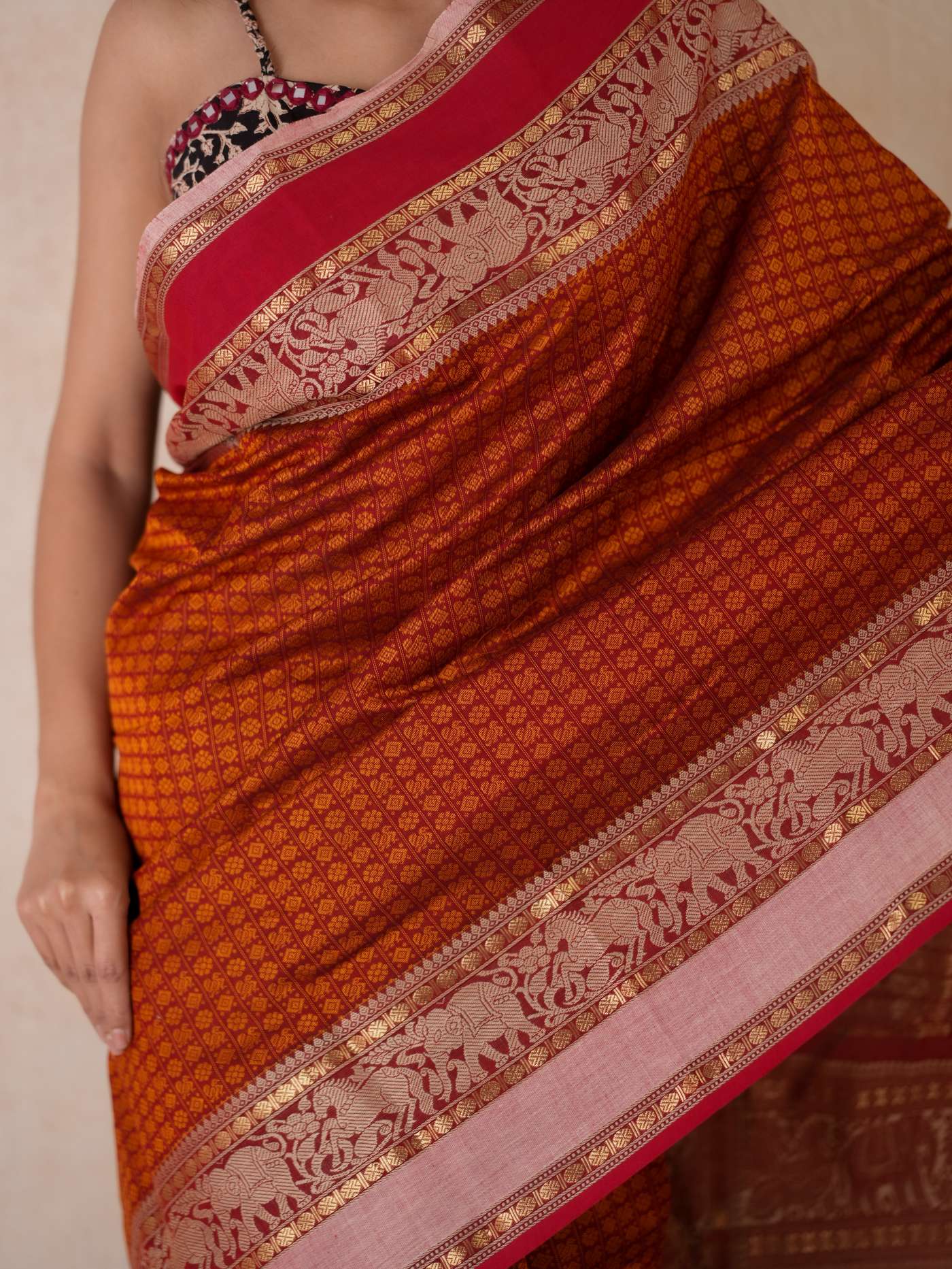 HANDWOVEN RUSTY ORANGE COLOUR KANCHI COTTON SAREE WITH 91 CM BLOUSE PIECE