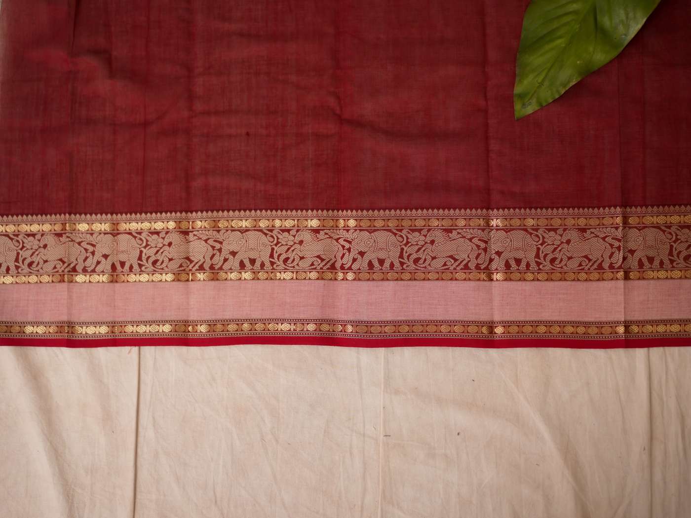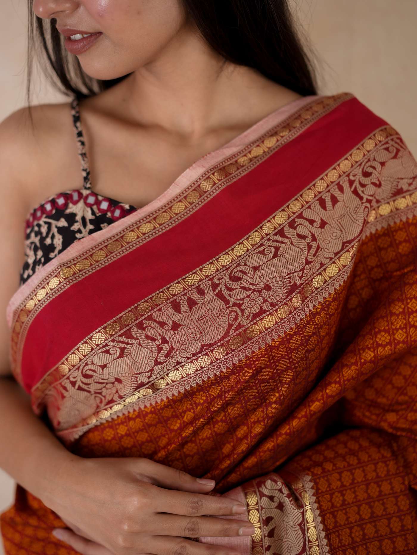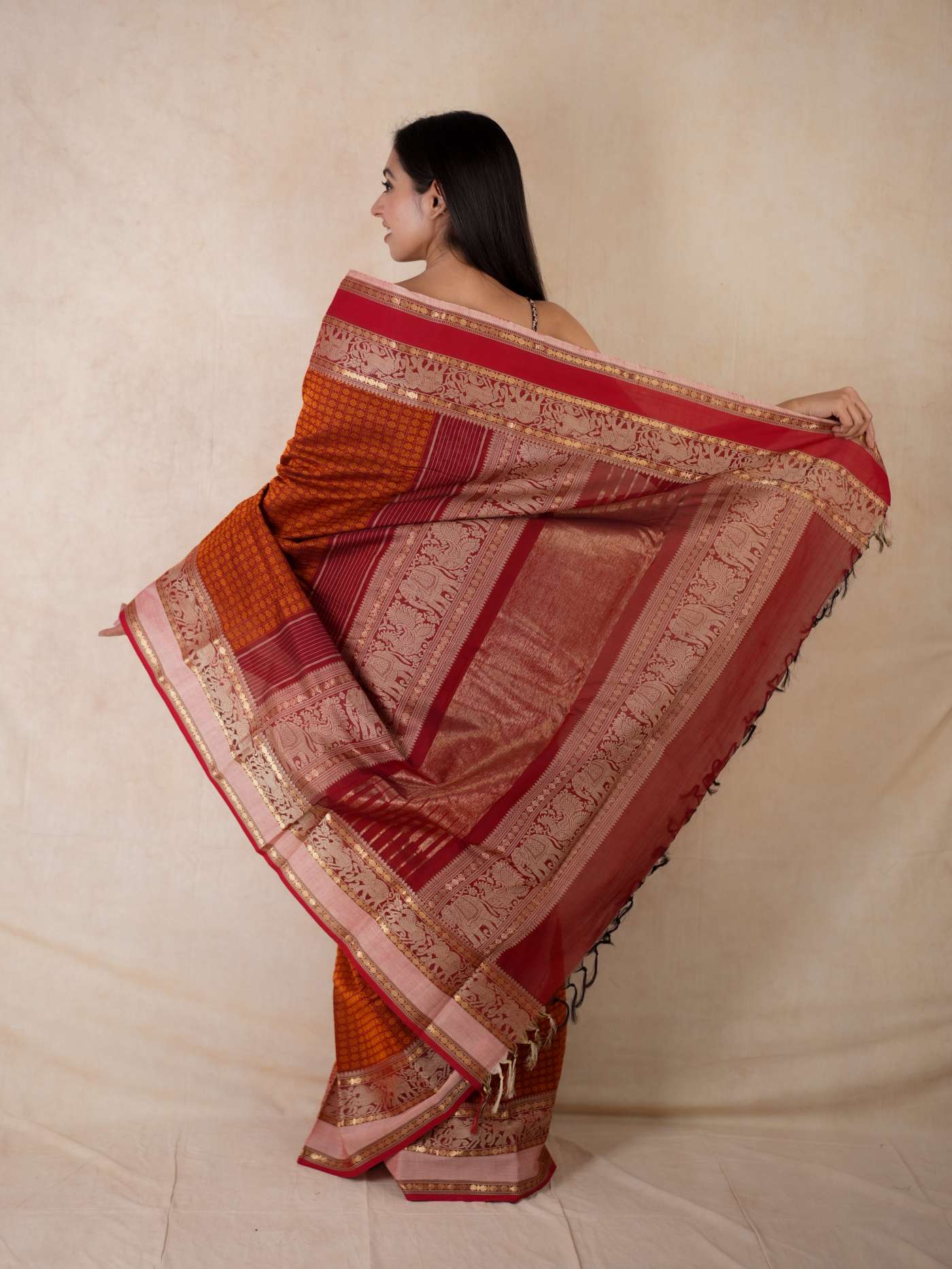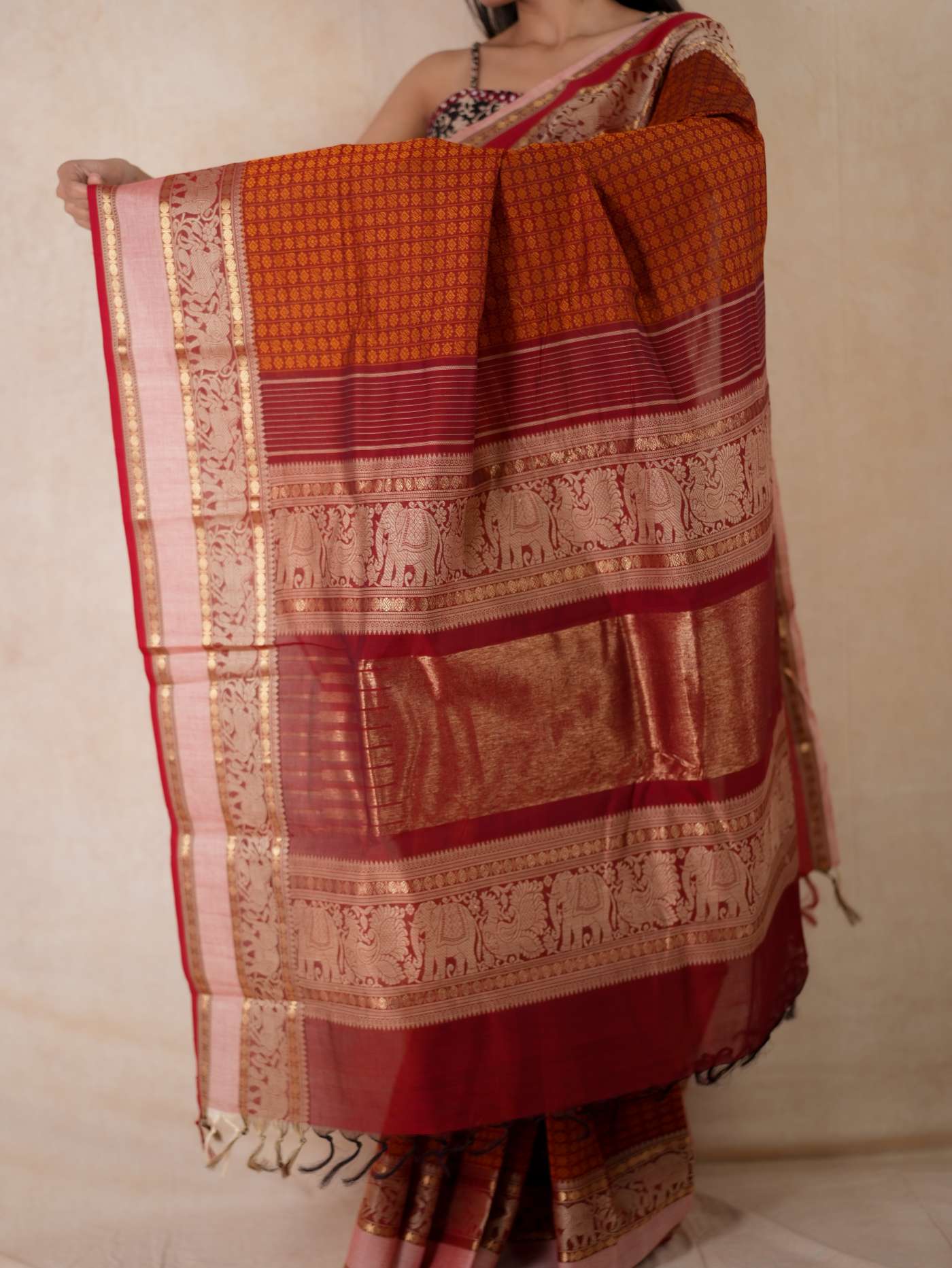 Enhance your ethnic ensemble with our red & dark brown dual tone Kanchipuram cotton saree, featuring intricate 20,000 butas all across with a striking red border. Perfect for any special occasion, this saree combines traditional artistry with modern elegance.