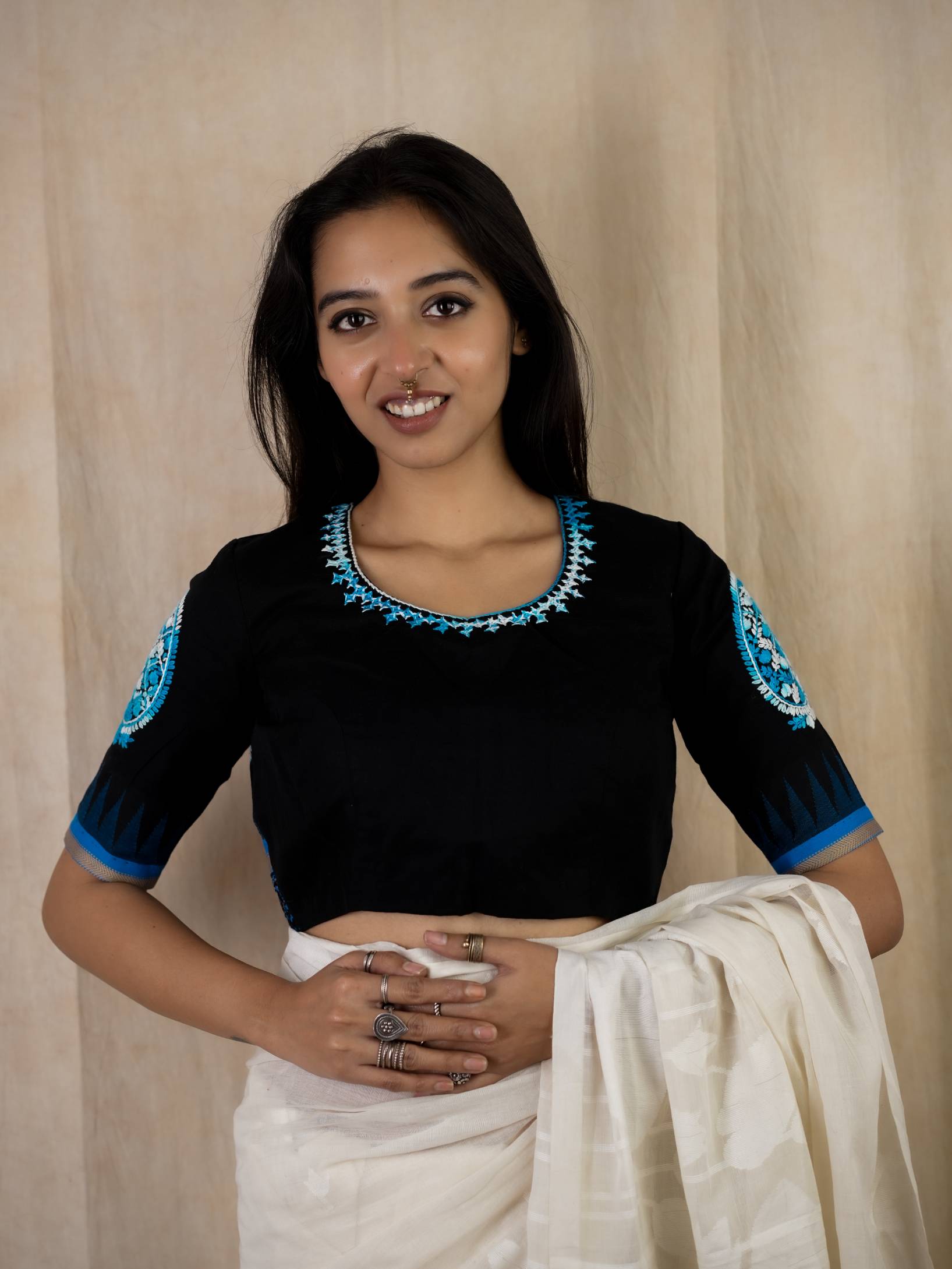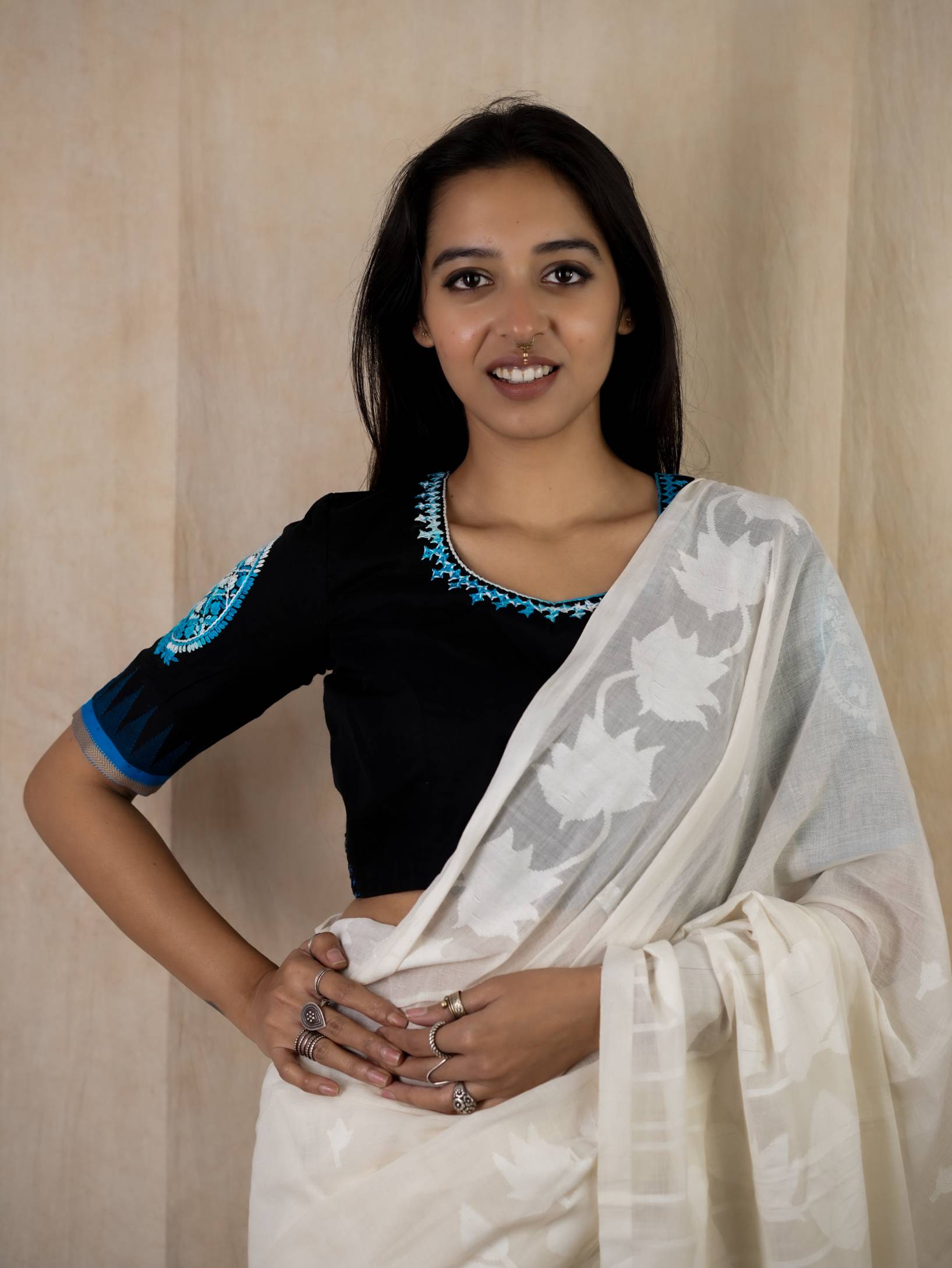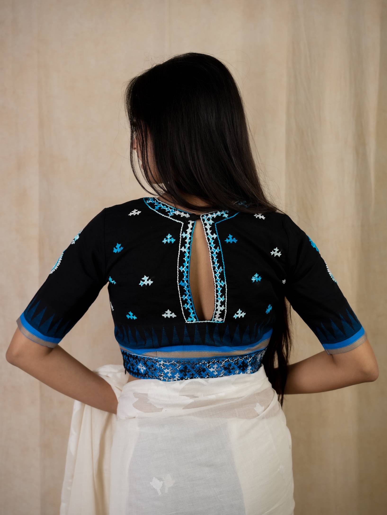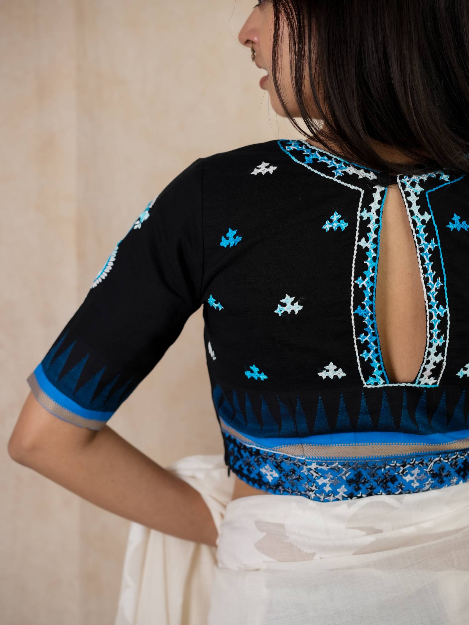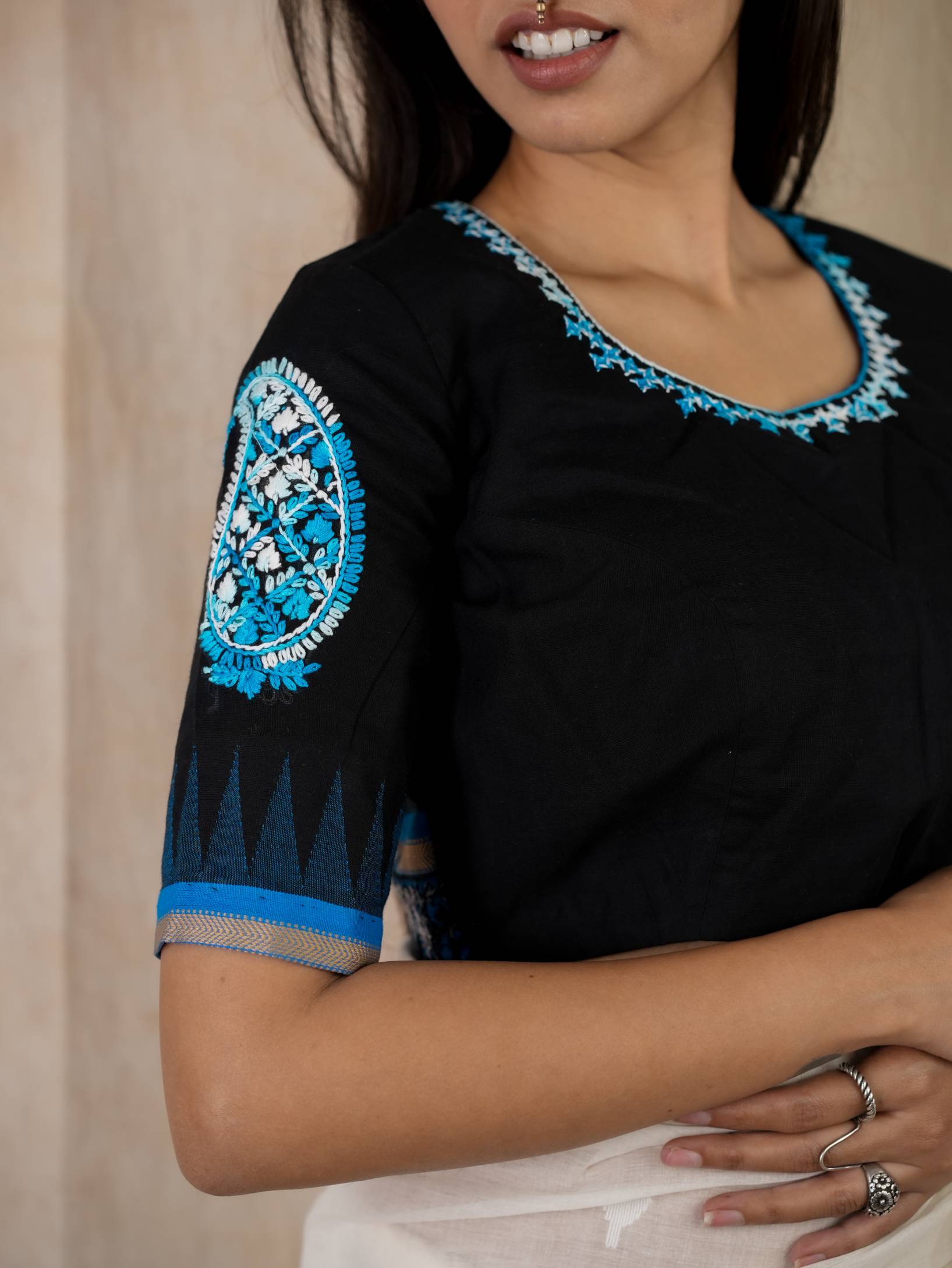 KANCHIPURAM COTTON WITH KORVAI TEMPLES AND KUTCH-EMBROIDERY. PAISLEY EMBROIDERY ON THE SLEEVES