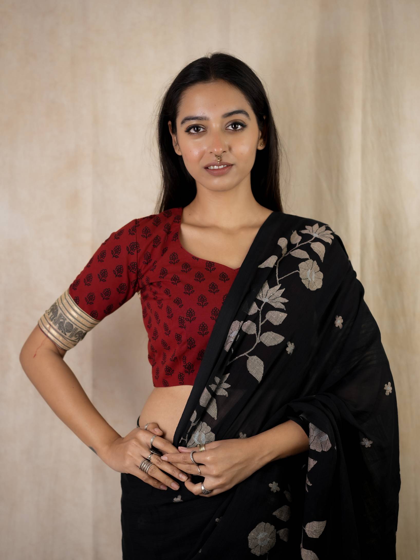 PURE COTTON BLOCK -PRINTS WITH KANCHI COTTON BORDER CONSISTING OF TRADITIONAL PEACOCK (MAYIL) AND ELEPHANT (YAMAI) MOTIFS