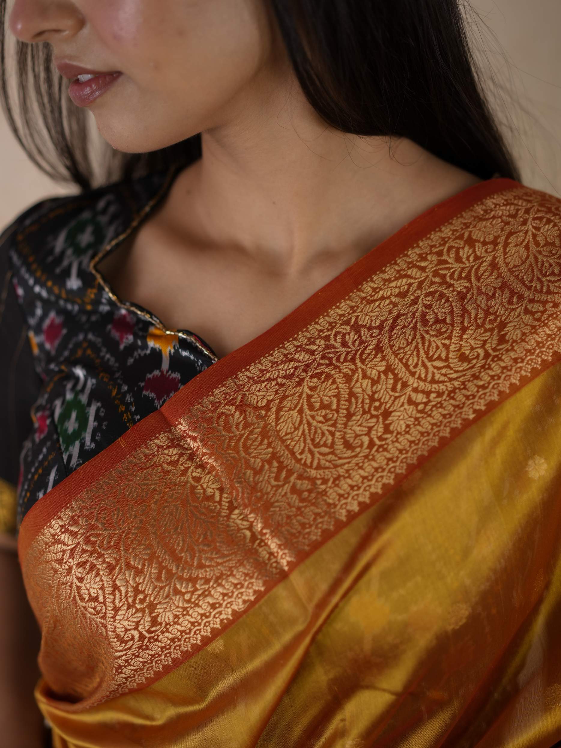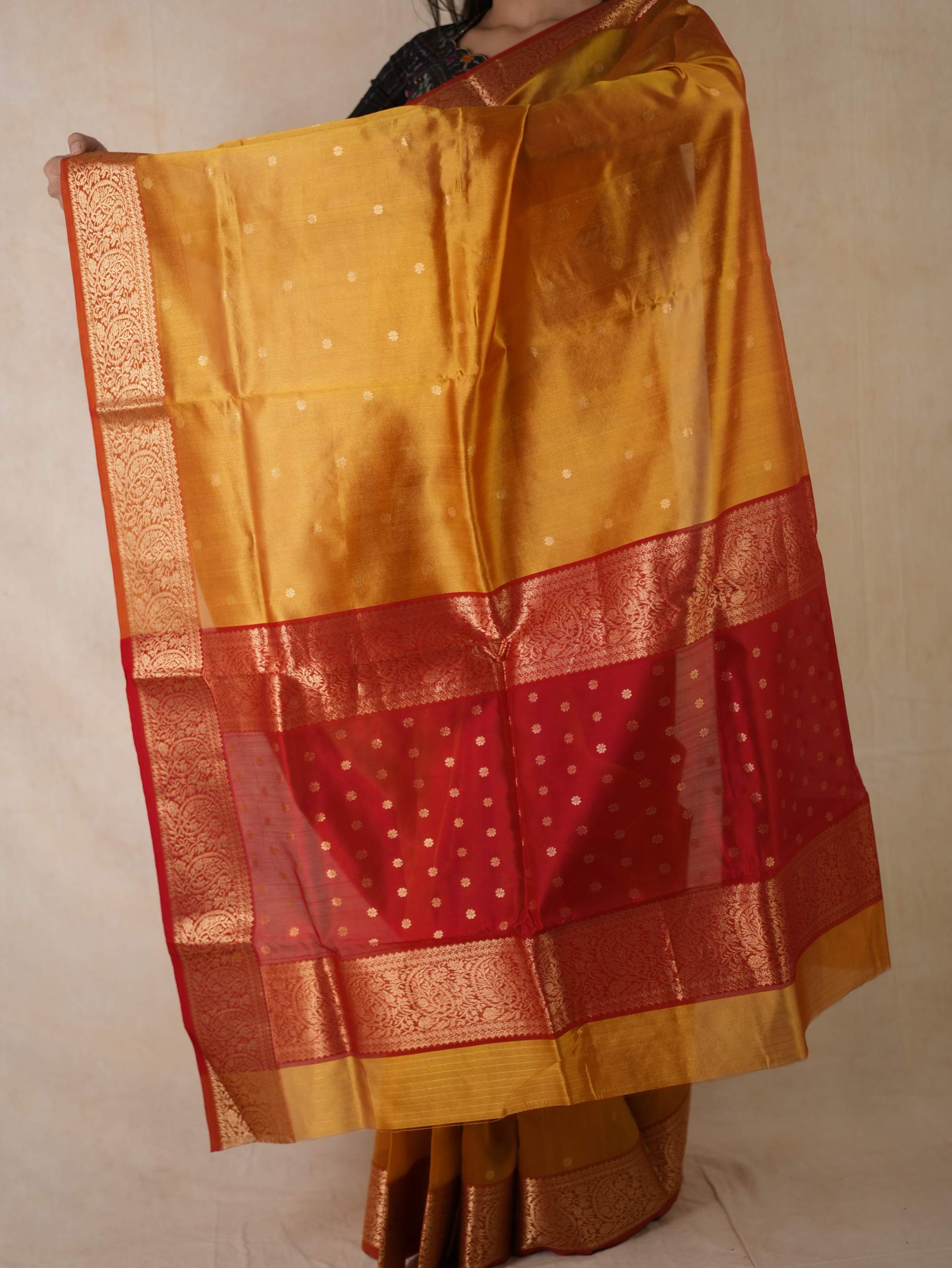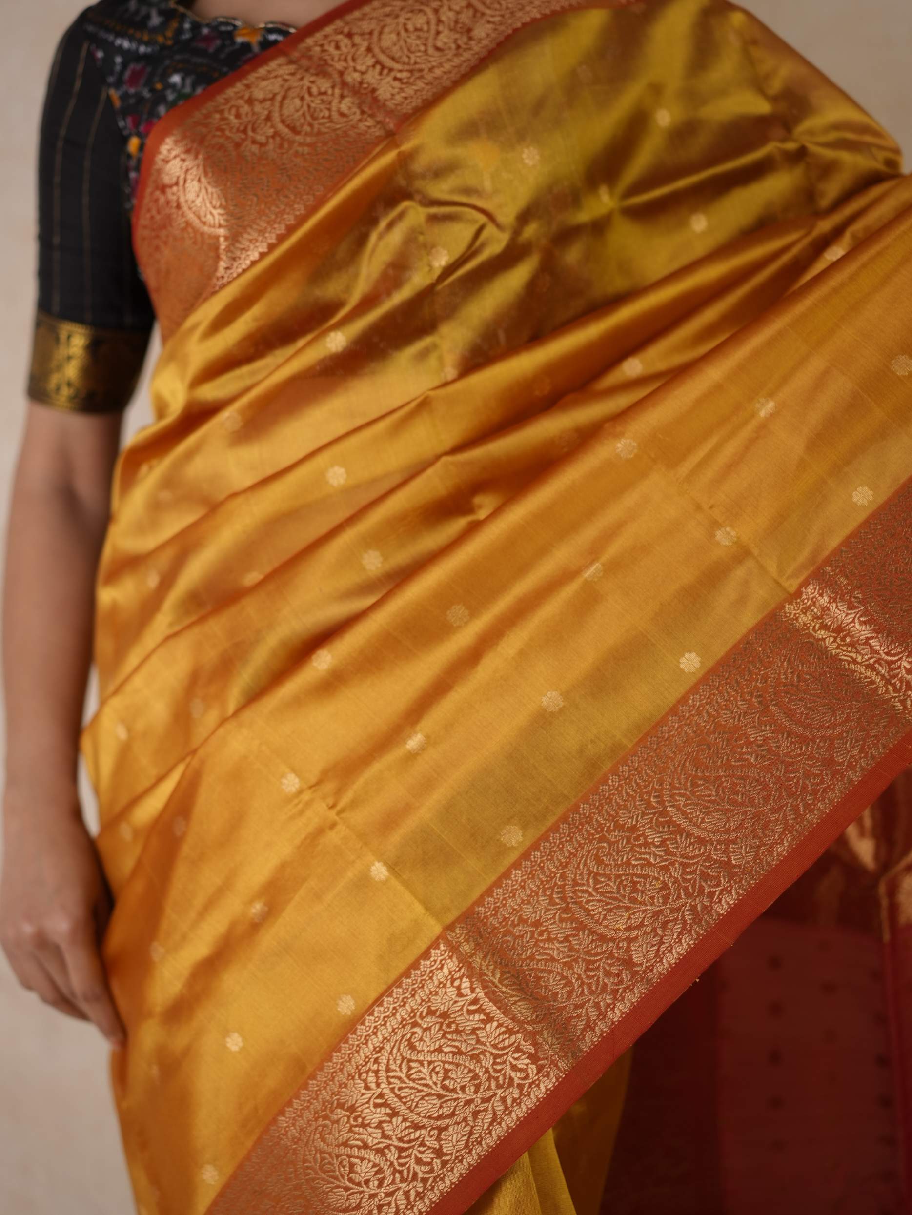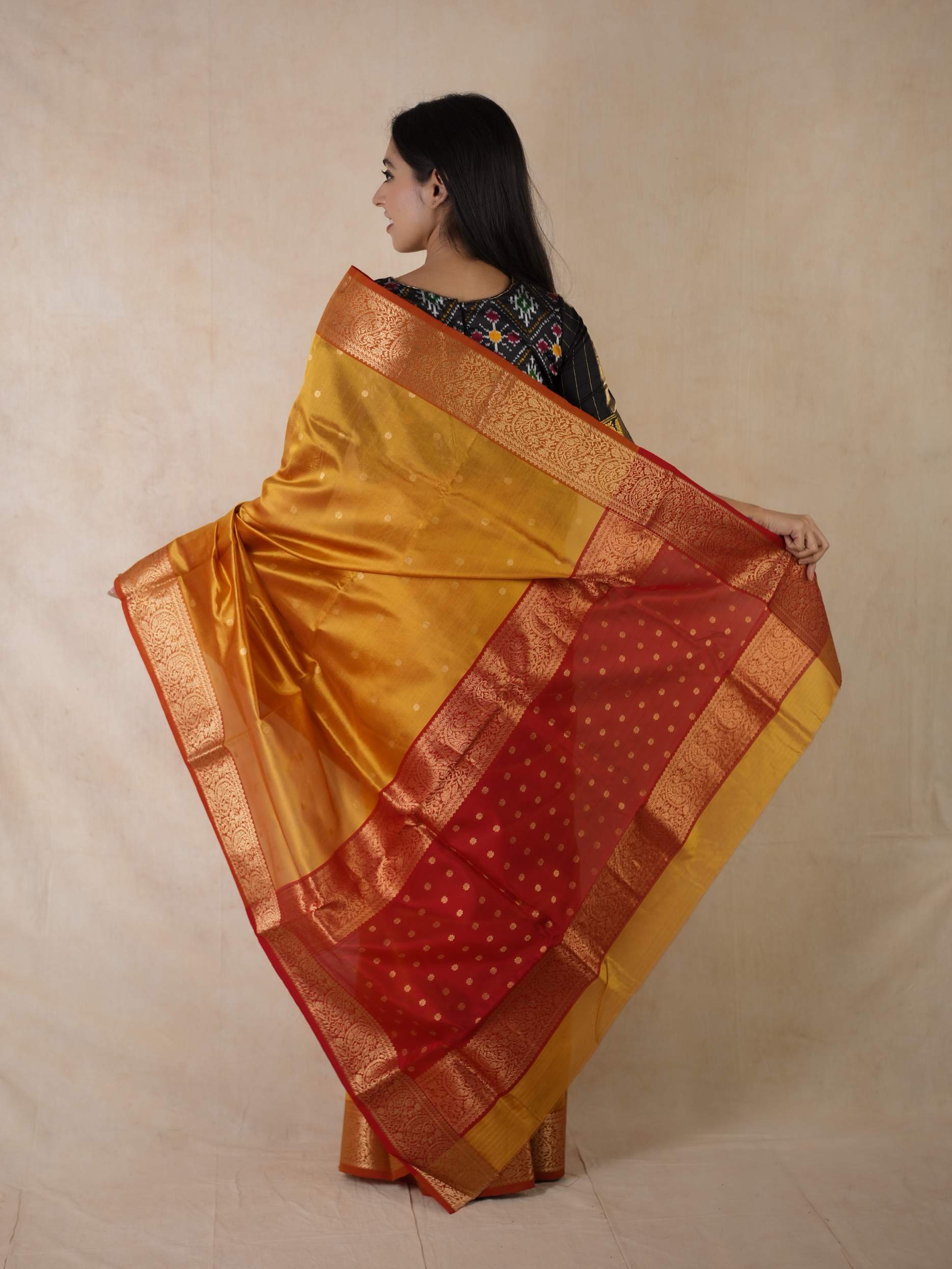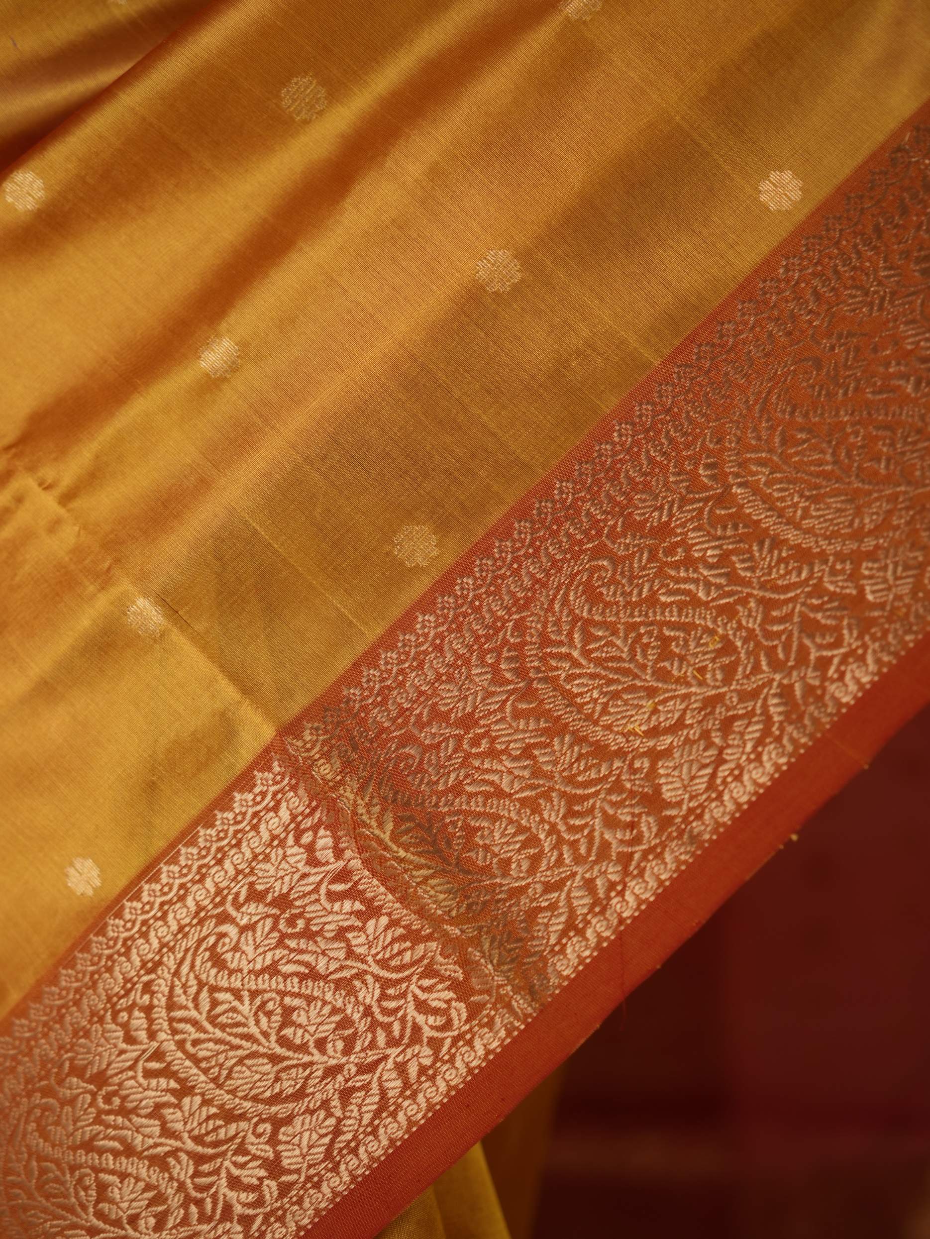 This Chanderi reddish yellow coloured silk saree embodies elegance and royalty, with delicate coin motifs that shimmer with timeless beauty. Perfect for festive occasions or any event where you wish to shine with regal charm.