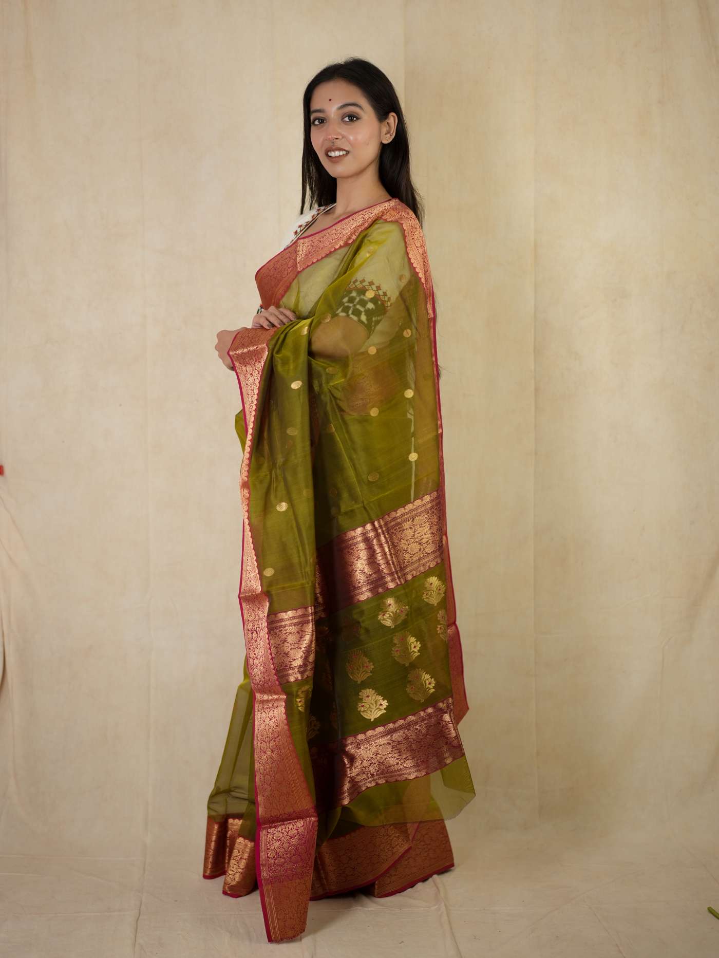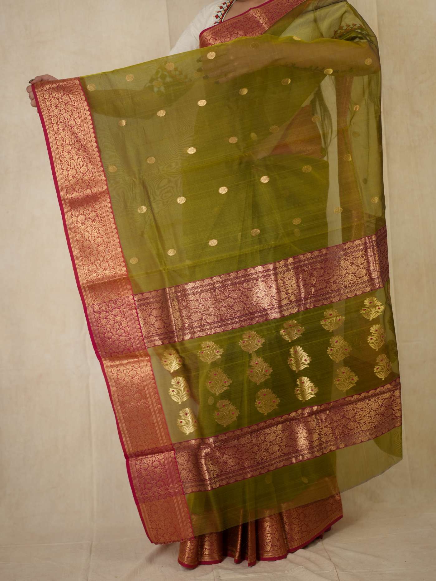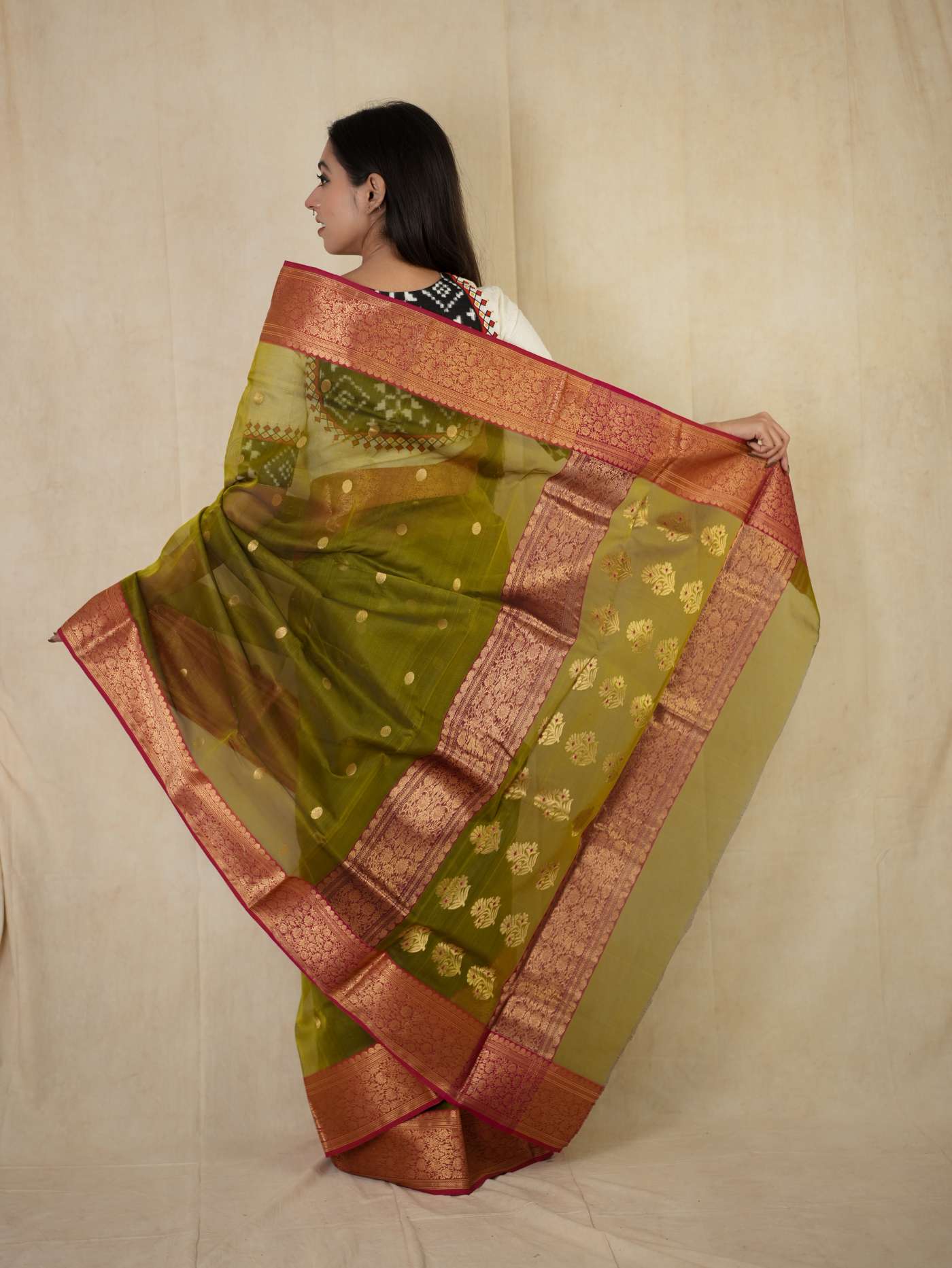 This Chanderi olive green silk saree embodies elegance and tradition, with golden butis and a rich contrasting pink border that exudes timeless beauty. Perfect for weddings, festivities, and grand celebrations, this saree radiates regal charm and grace, making you the center of attraction wherever you go.