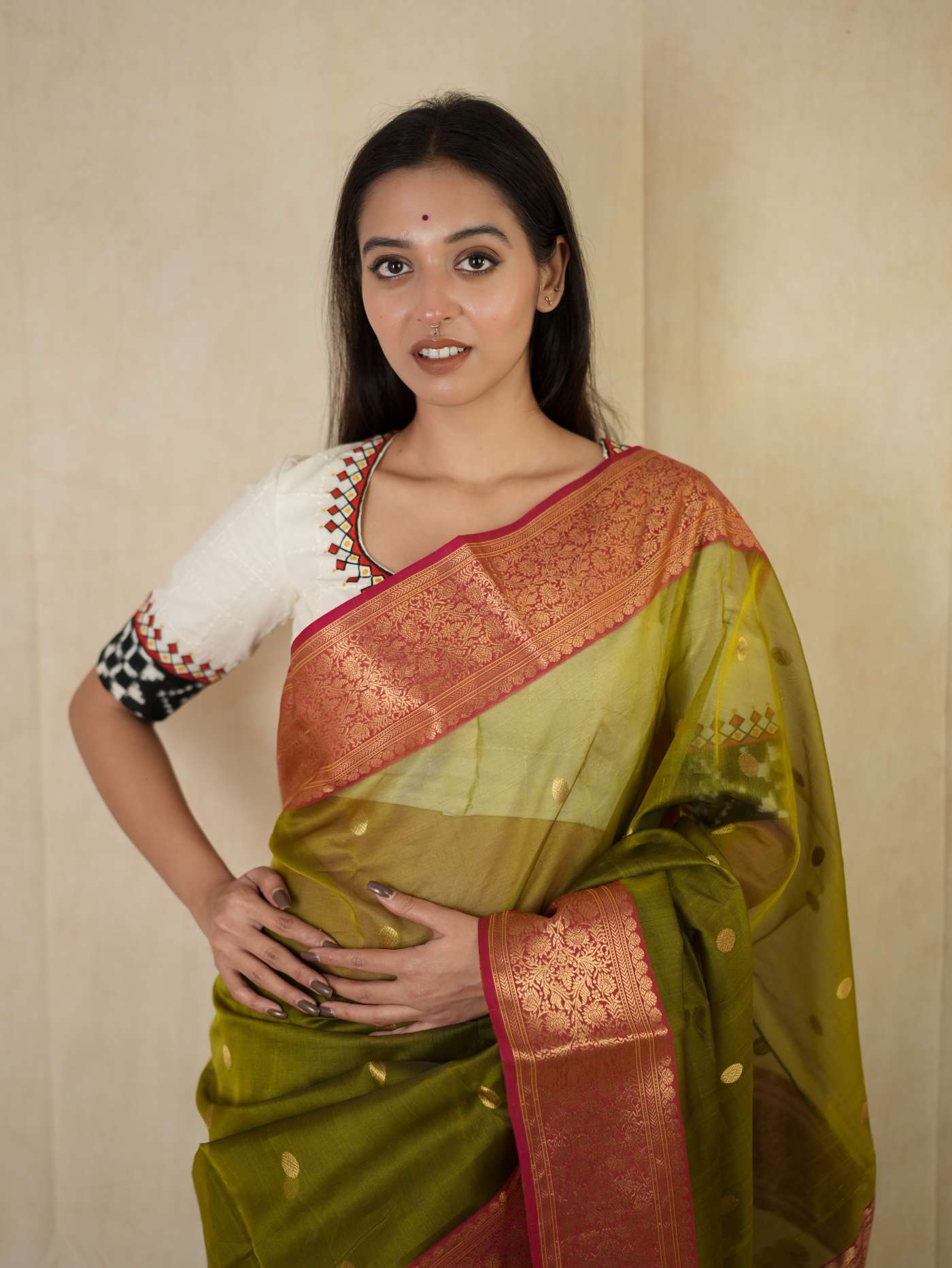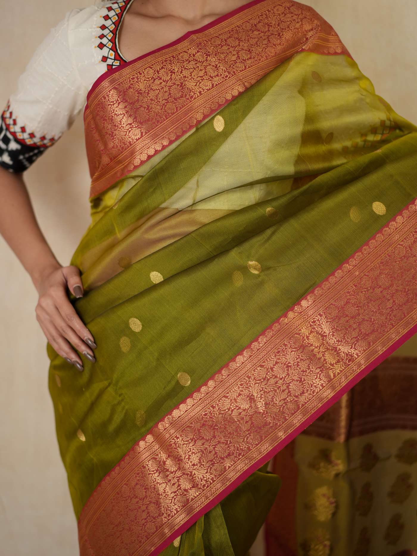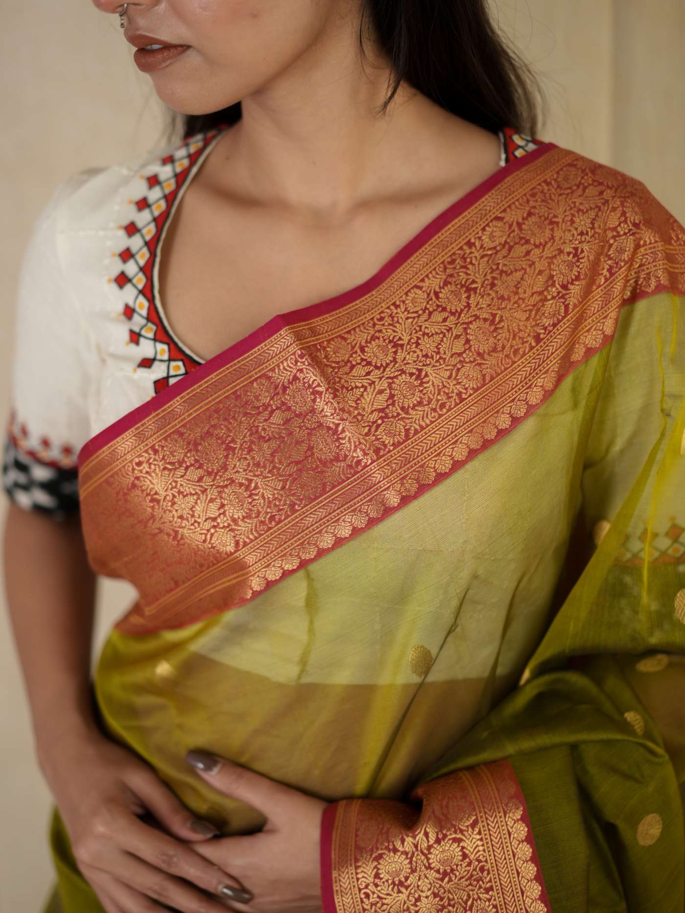 This Chanderi olive green silk saree embodies elegance and tradition, with golden butis and a rich contrasting pink border that exudes timeless beauty. Perfect for weddings, festivities, and grand celebrations, this saree radiates regal charm and grace, making you the center of attraction wherever you go.