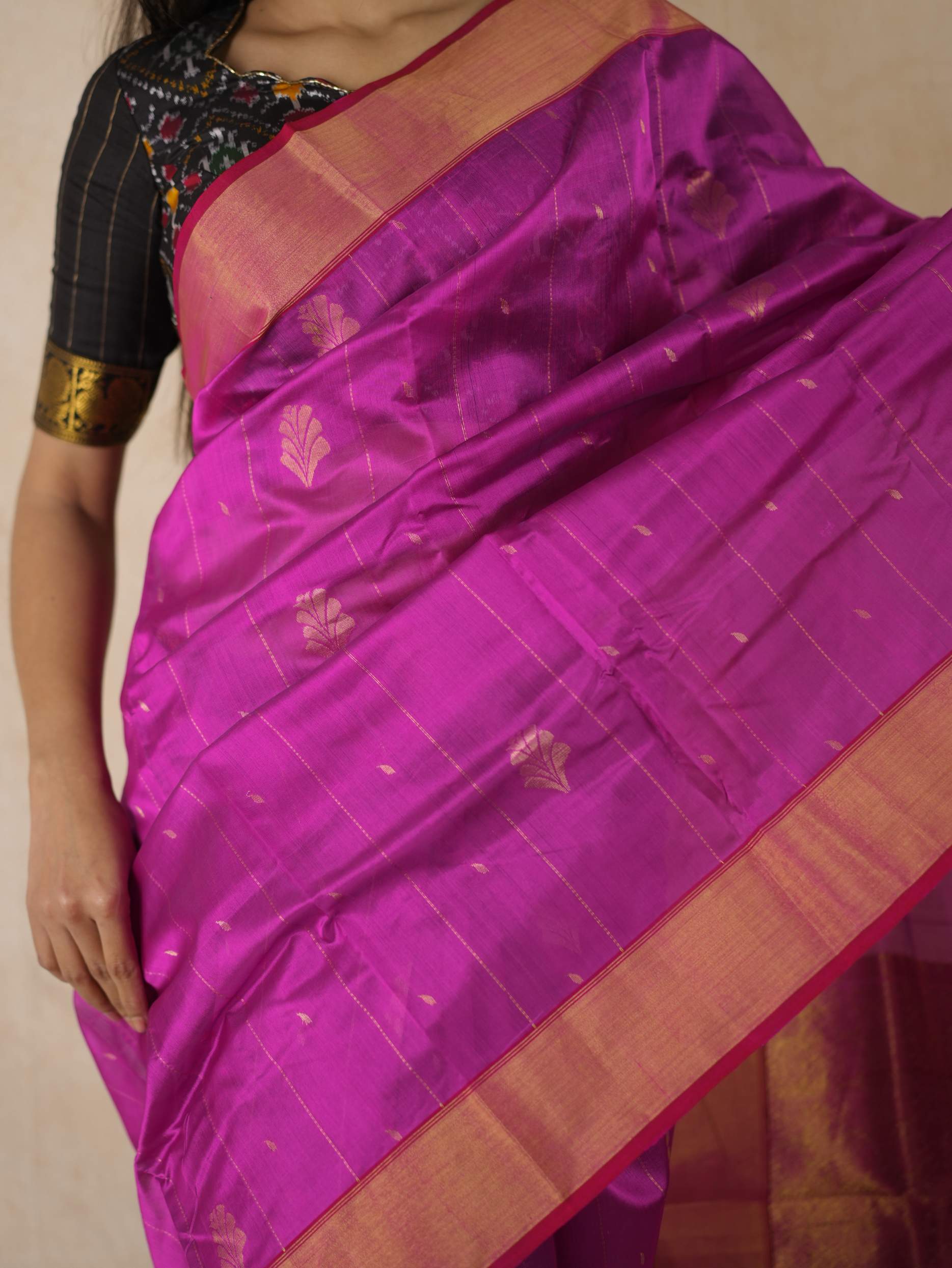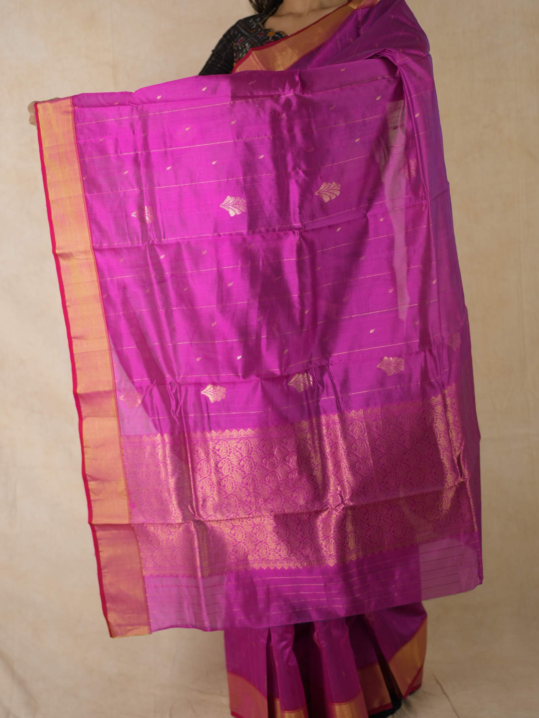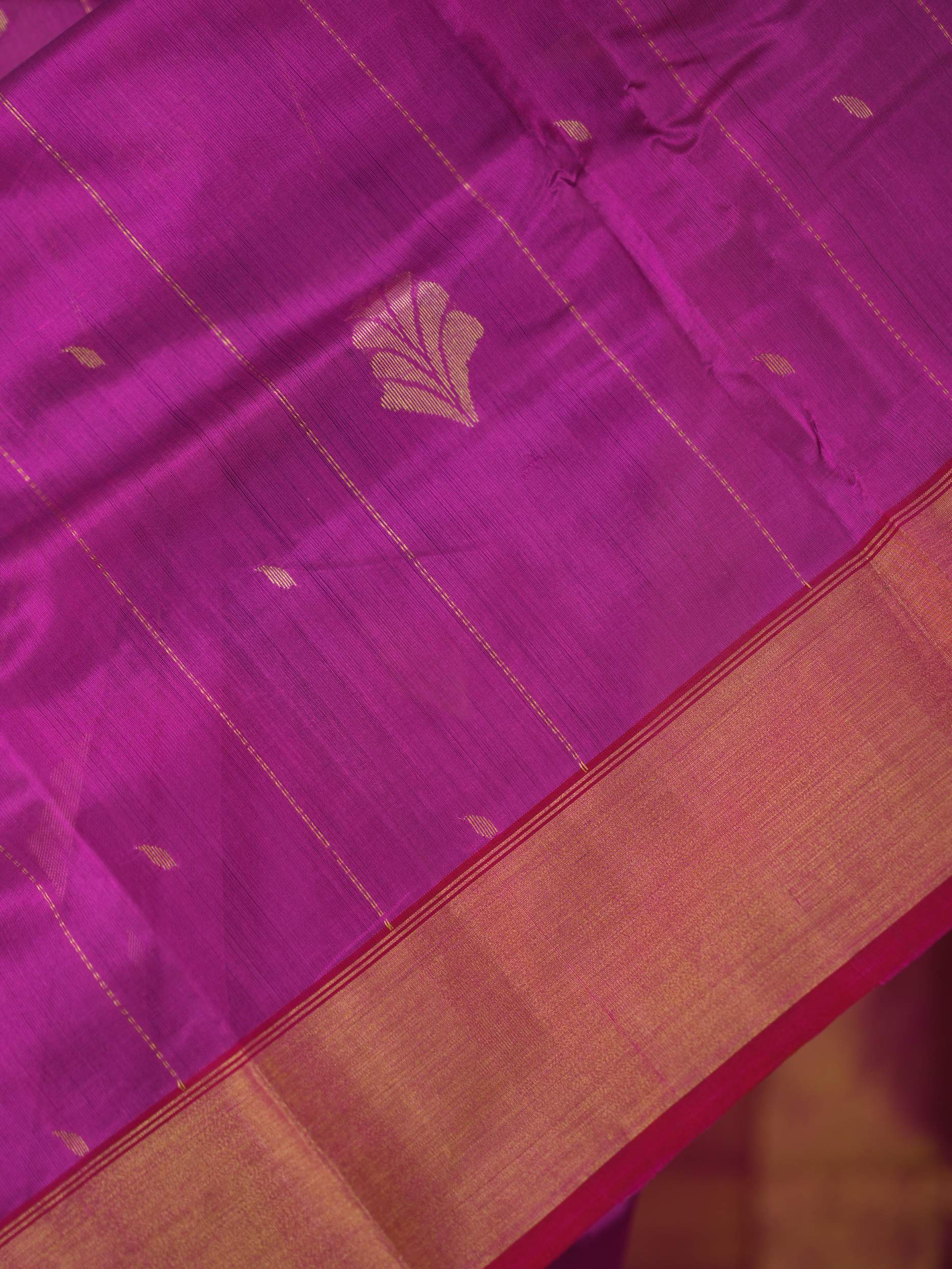 This Chanderi rani silk saree embodies elegance and royalty, with delicate small butis all across that shimmer with timeless beauty. Perfect for festive occasions or any event where you wish to shine with regal charm.