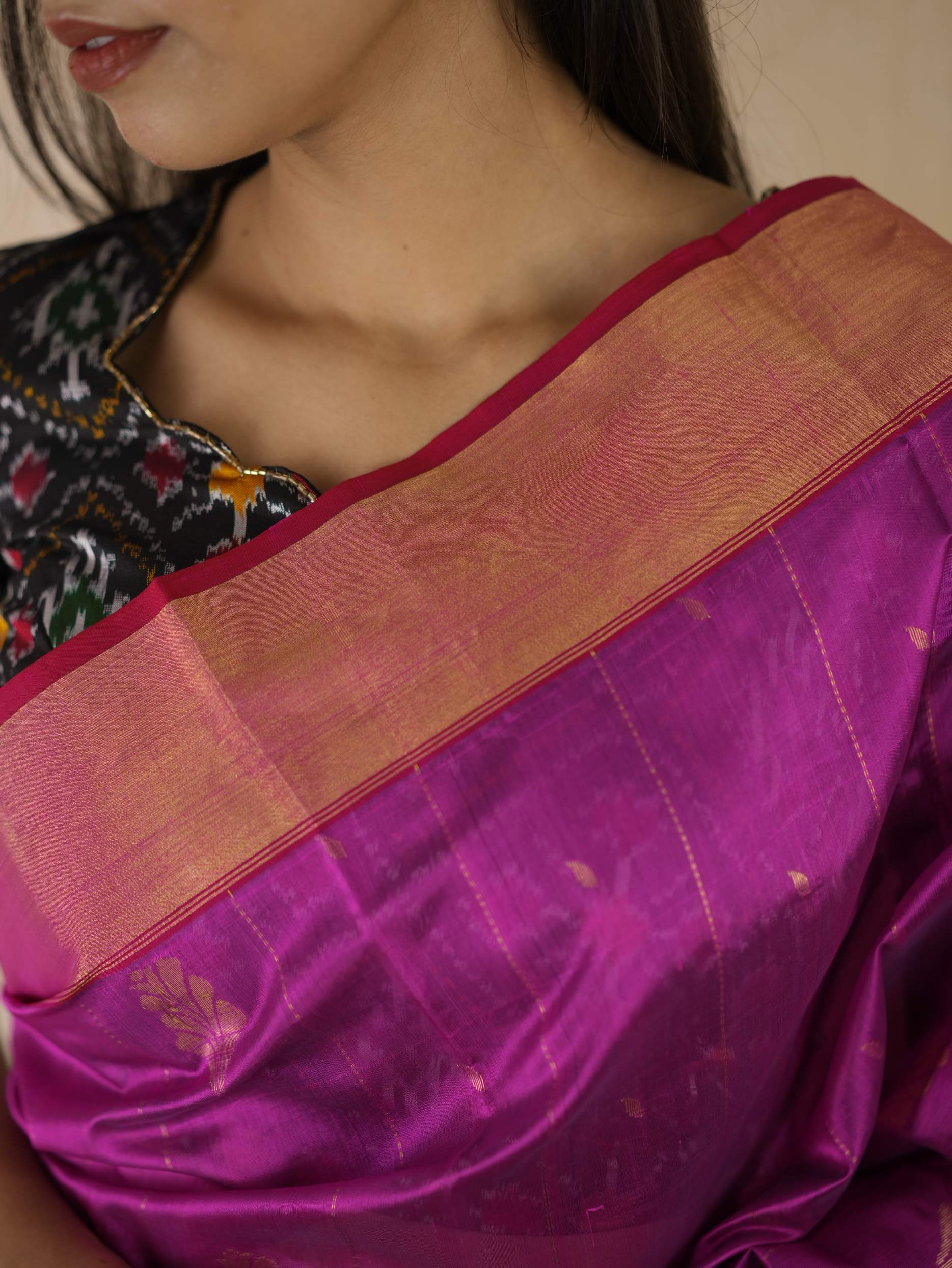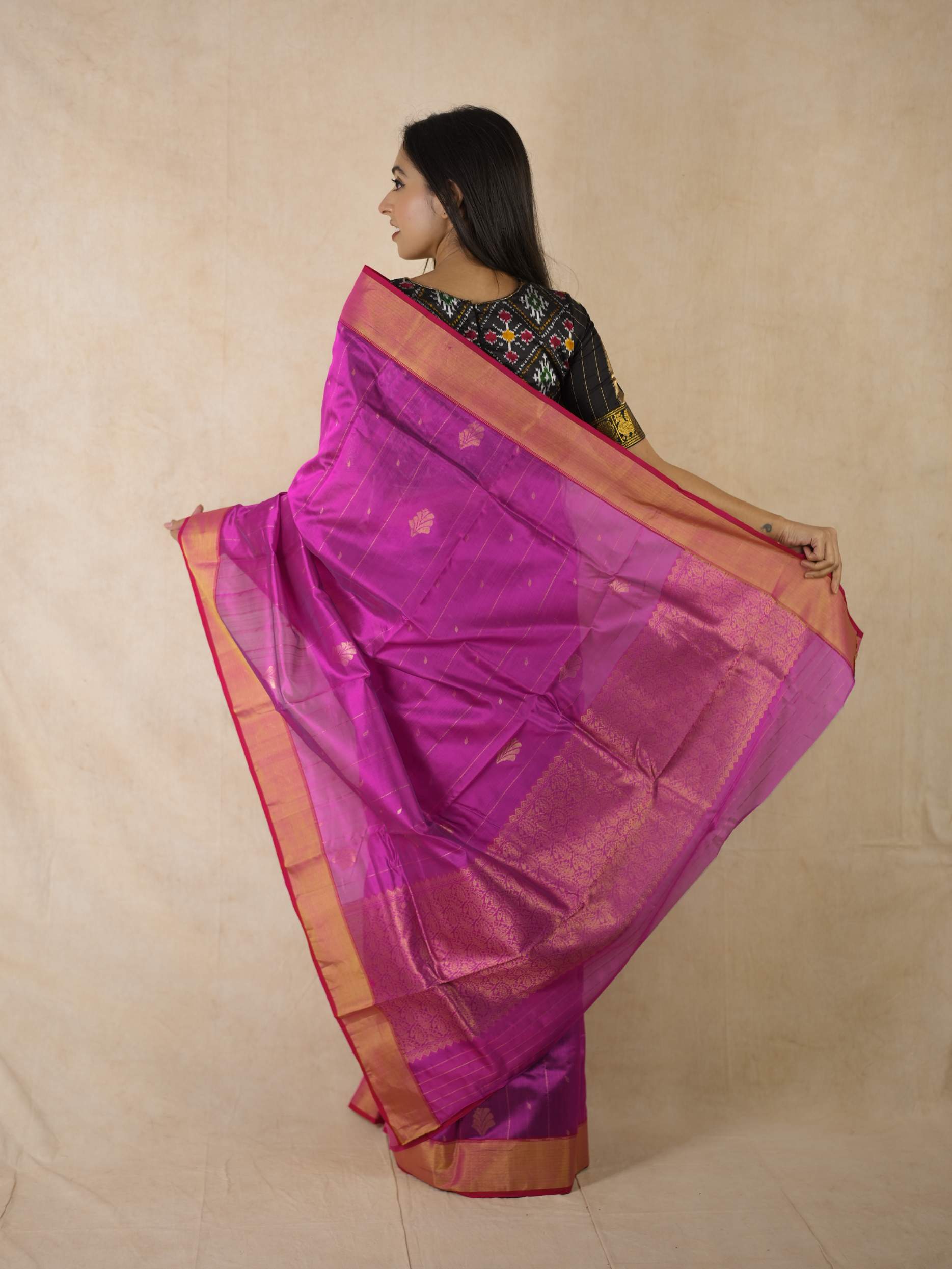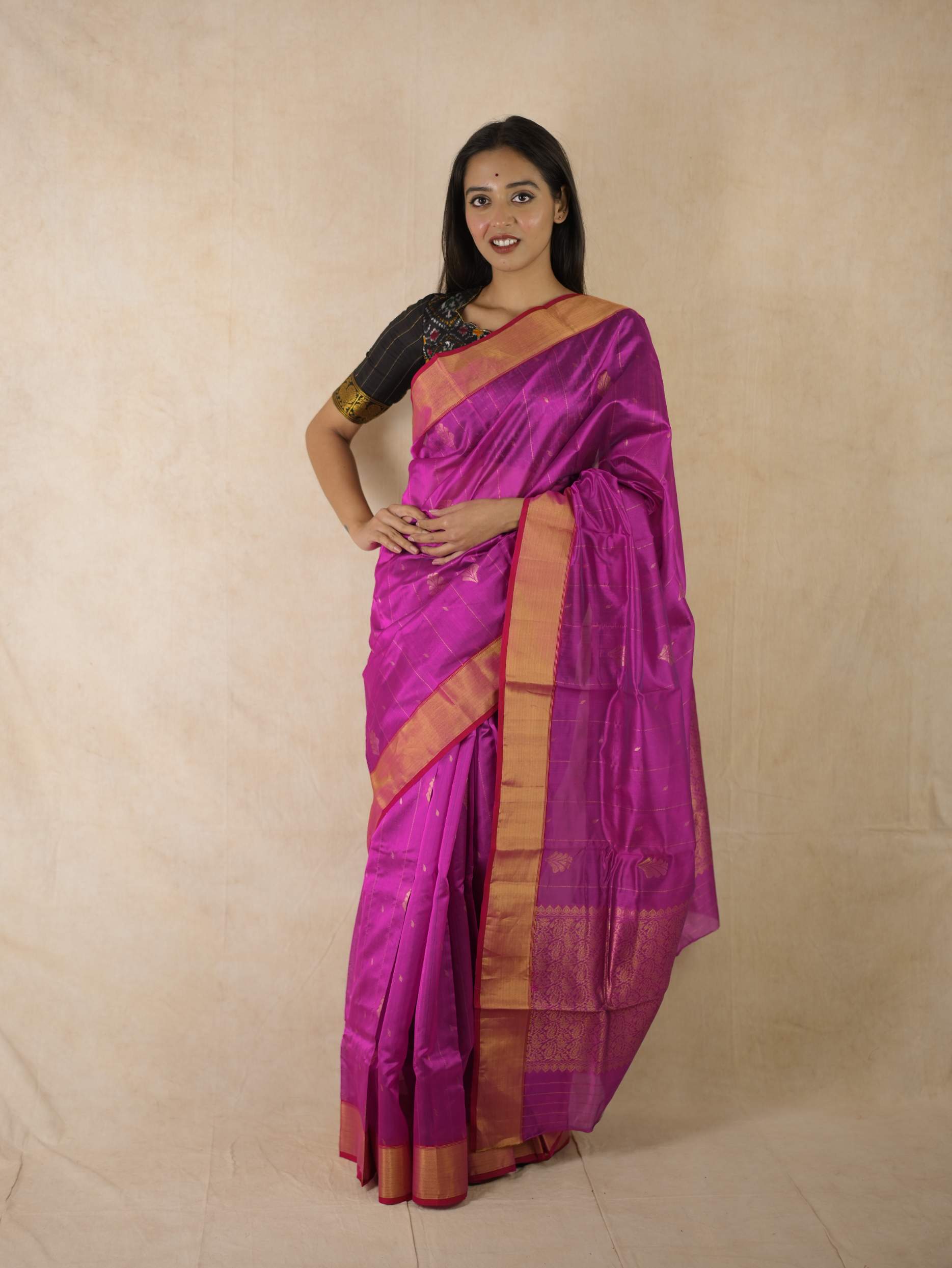 This Chanderi rani silk saree embodies elegance and royalty, with delicate small butis all across that shimmer with timeless beauty. Perfect for festive occasions or any event where you wish to shine with regal charm.