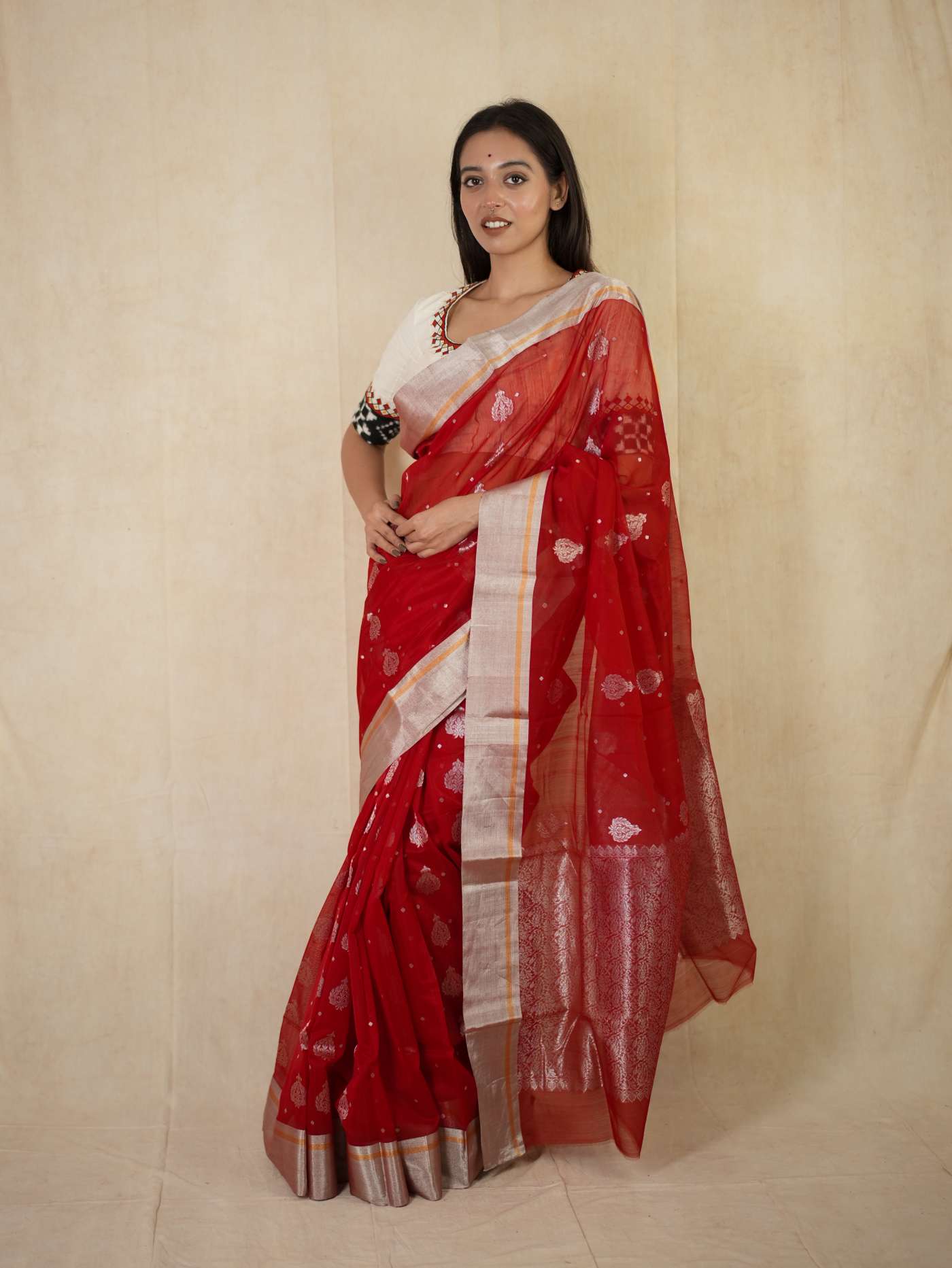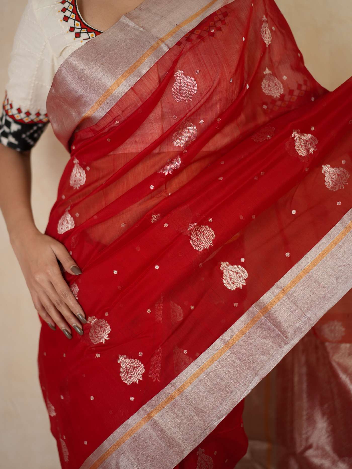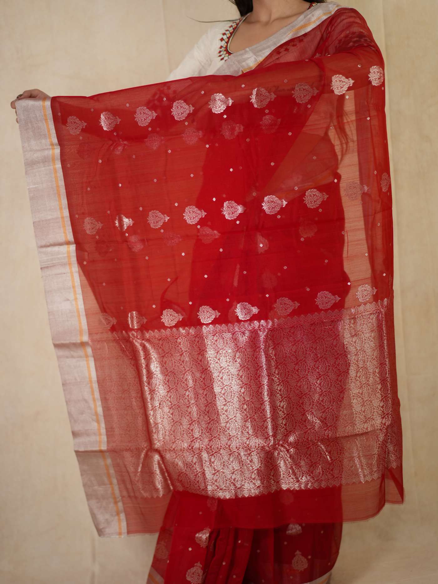 This Chanderi red silk cotton saree embodies elegance and royalty, with delicate floral designs that shimmer with timeless beauty. Perfect for festive occasions or any event where you wish to shine with regal charm.