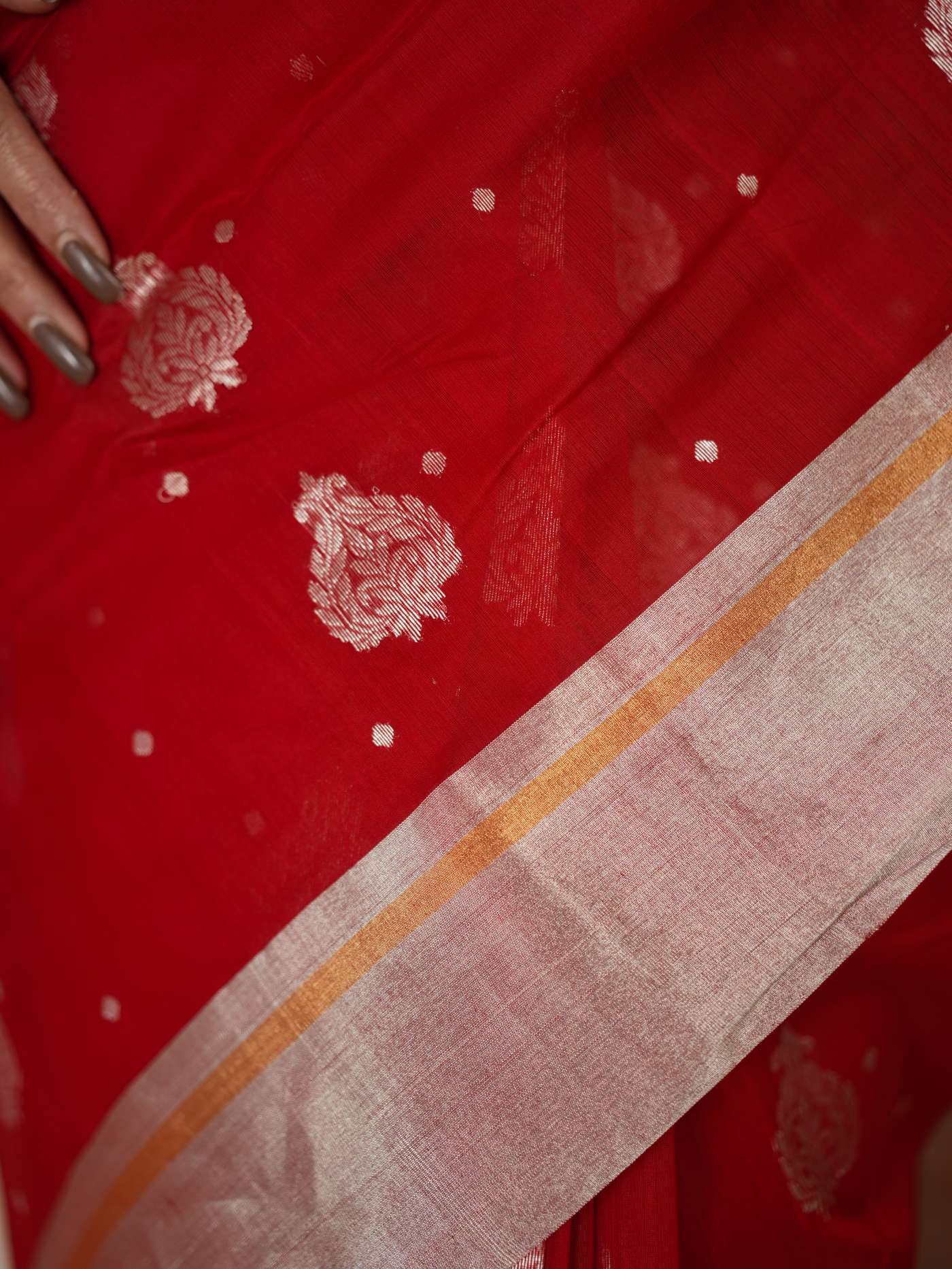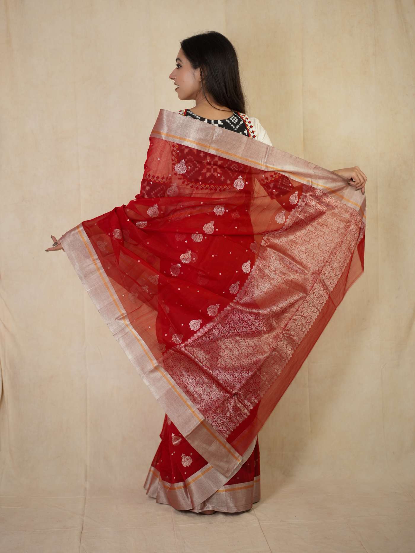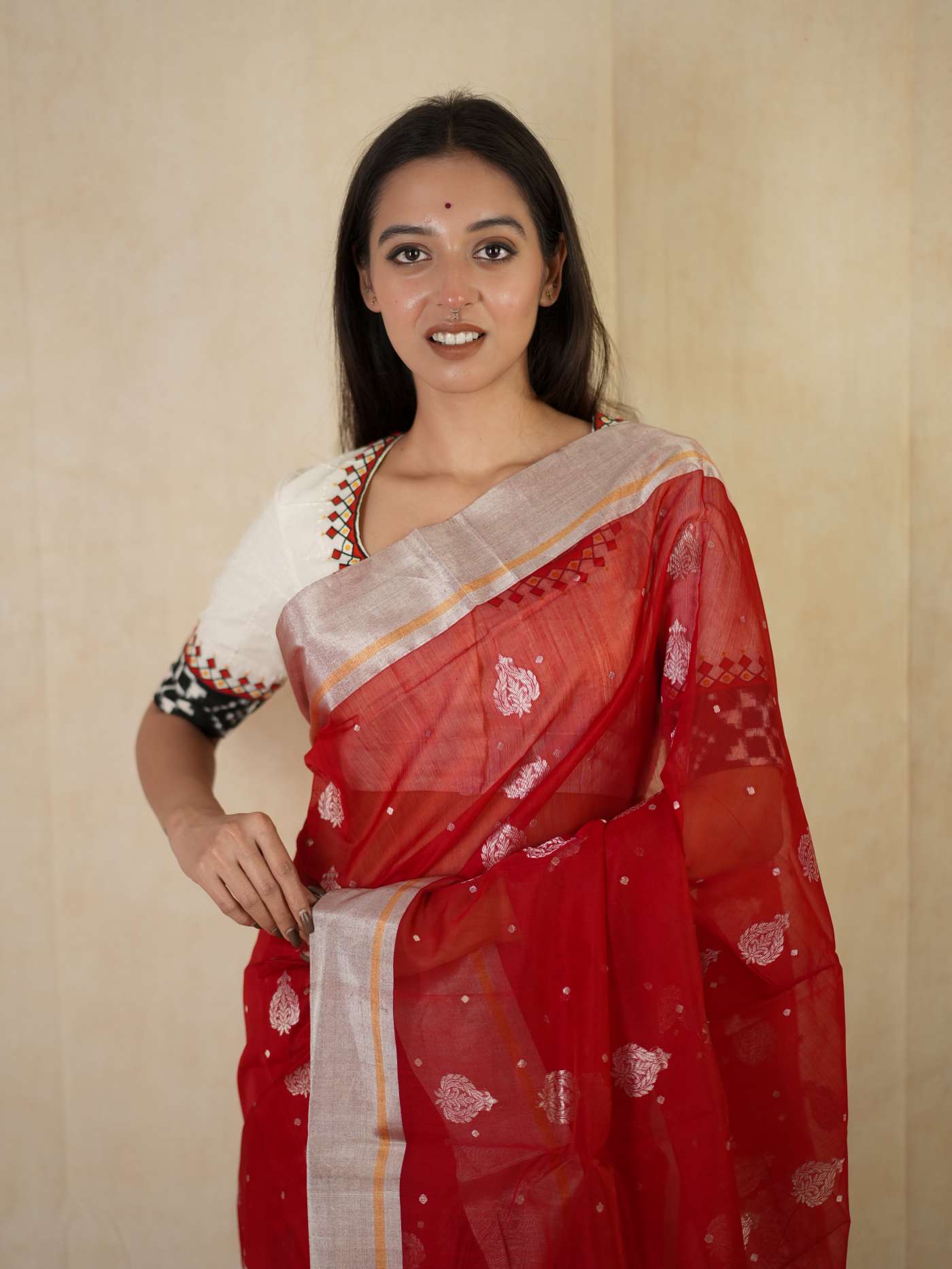This Chanderi red silk cotton saree embodies elegance and royalty, with delicate floral designs that shimmer with timeless beauty. Perfect for festive occasions or any event where you wish to shine with regal charm.