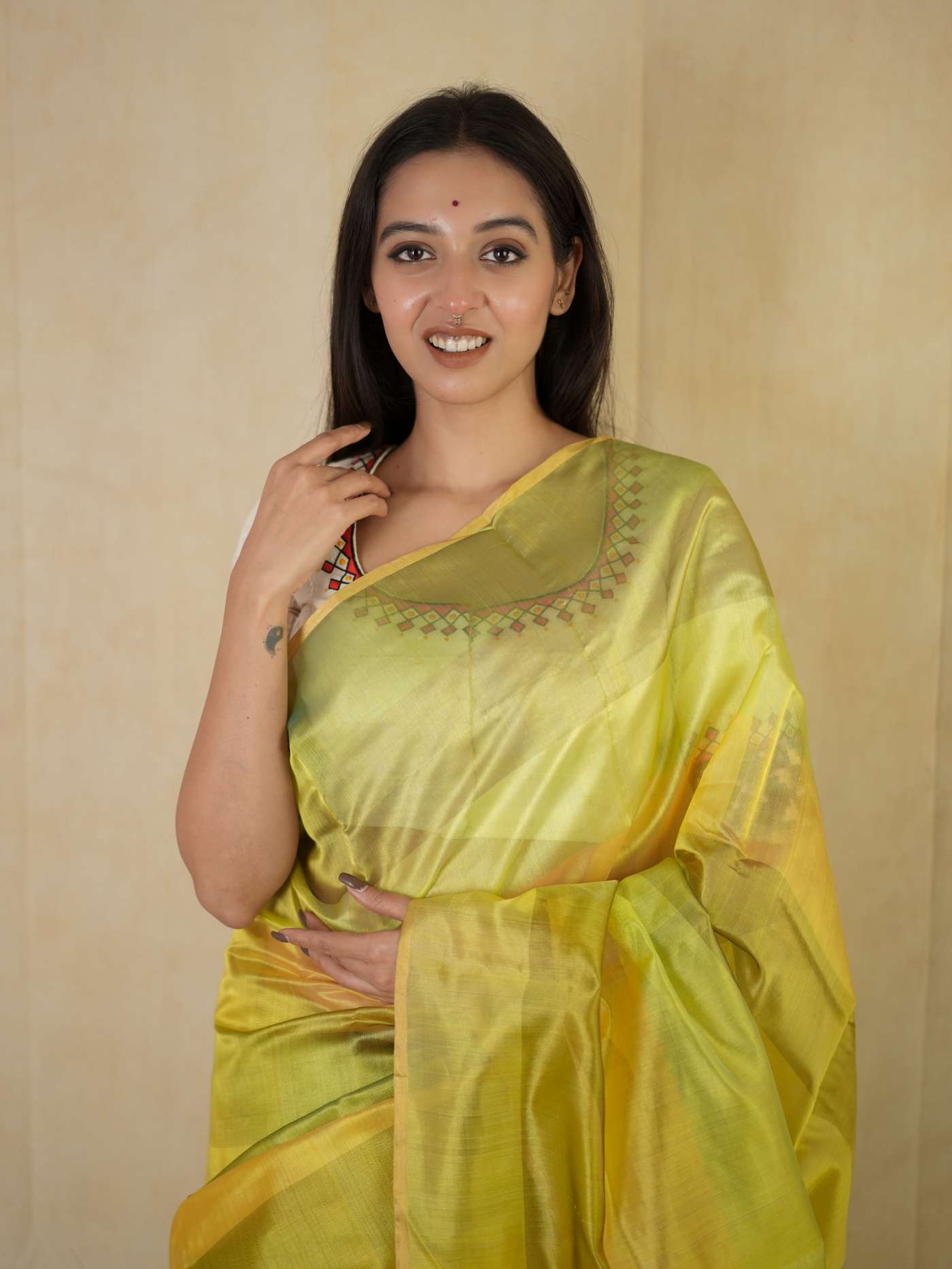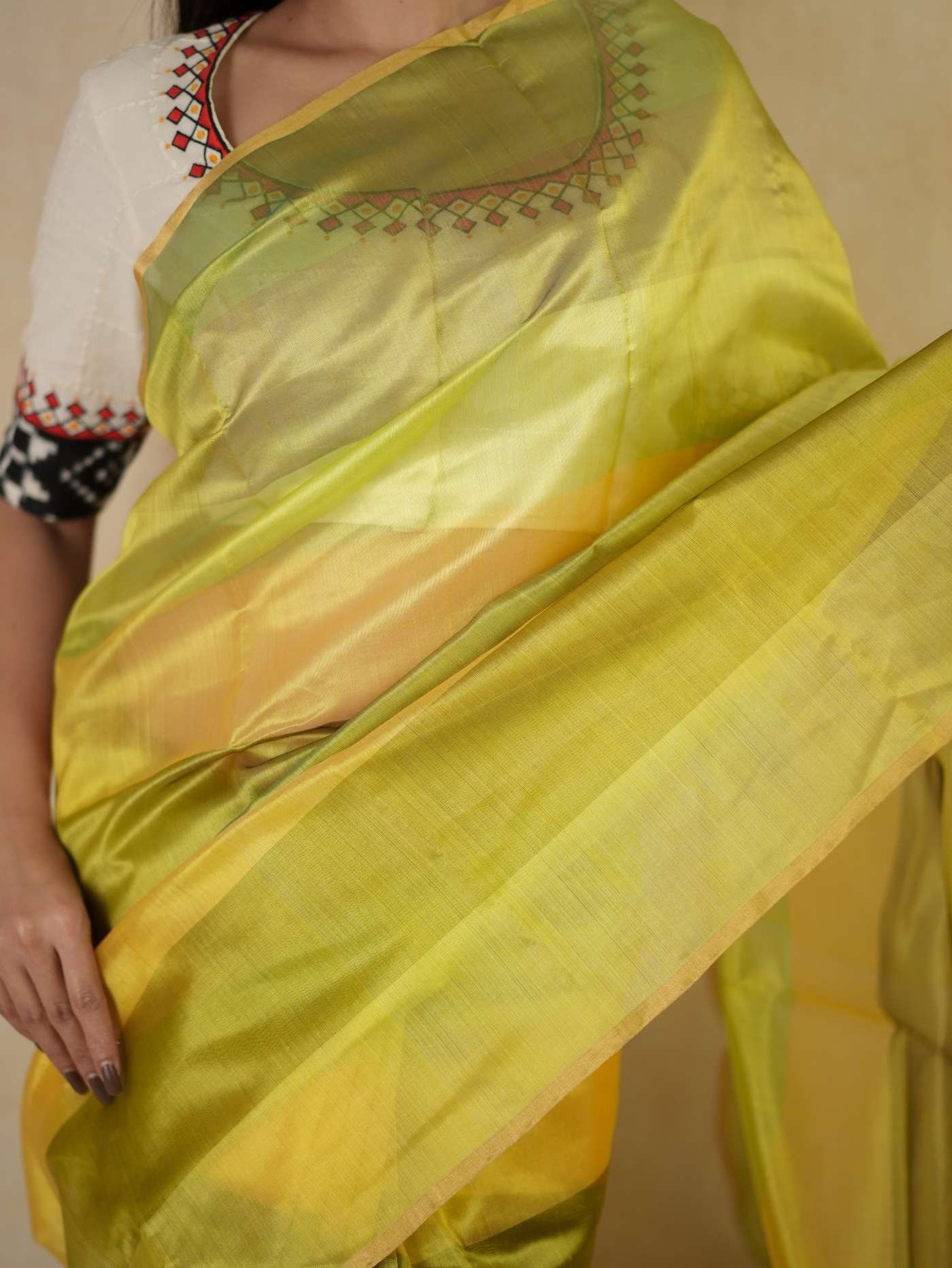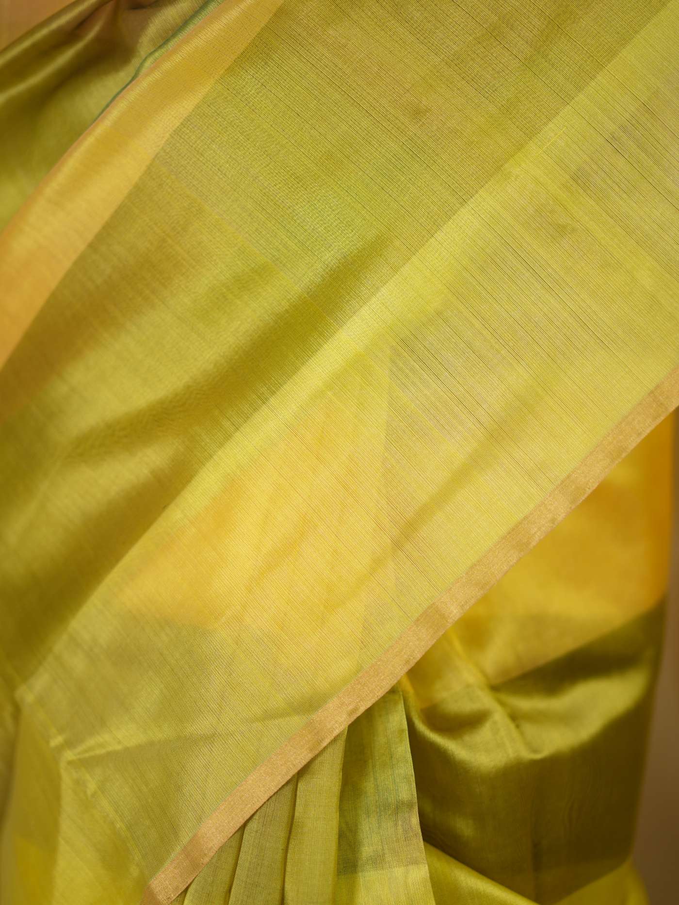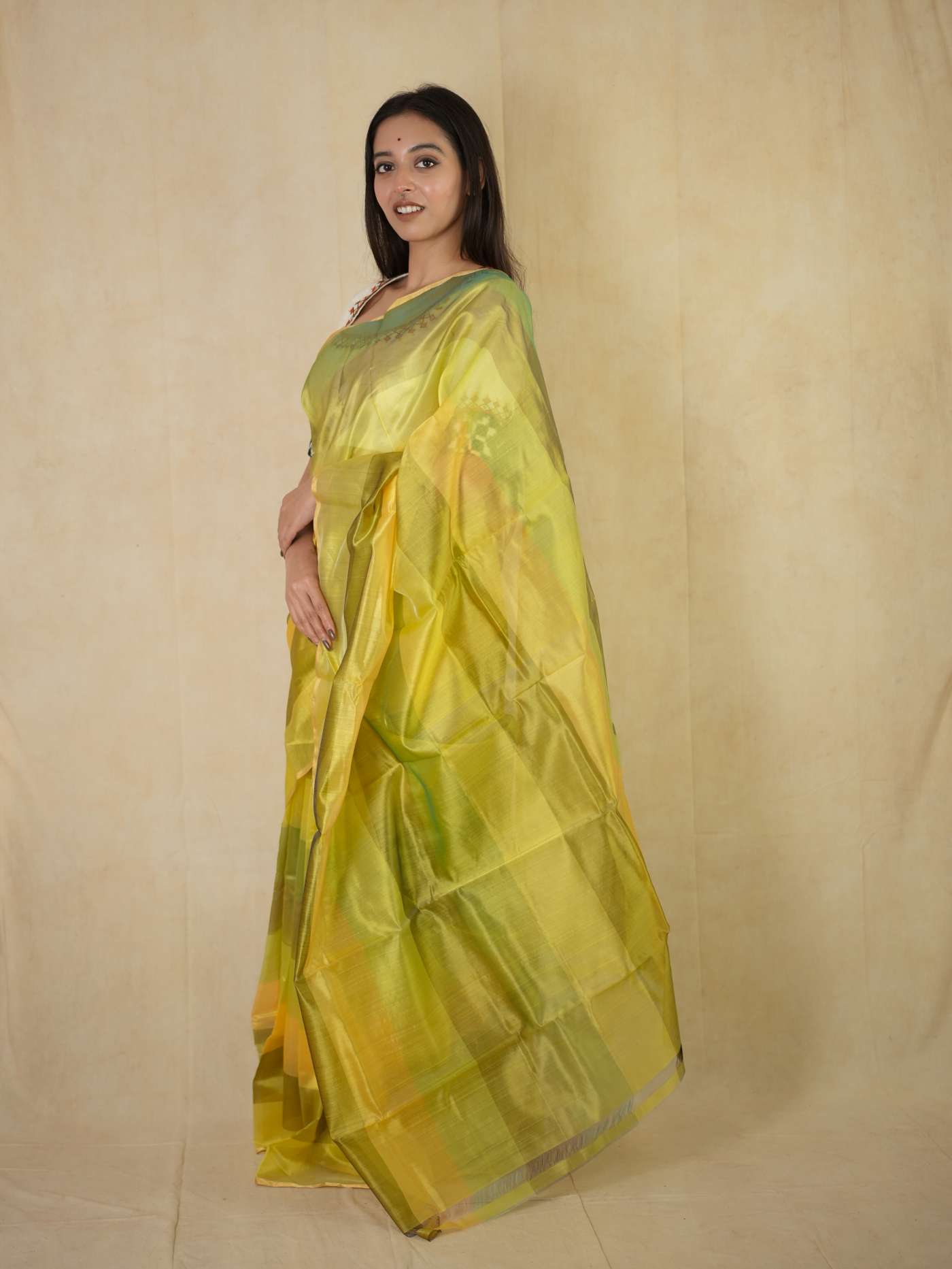 This Chanderi green-yellow silk saree embodies freshness and grace, with subtle golden selvedge that exude timeless beauty. Perfect for festive occasions, celebrations, or daytime events, it reflects sophistication and charm, making you stand out with radiant elegance and effortless style.