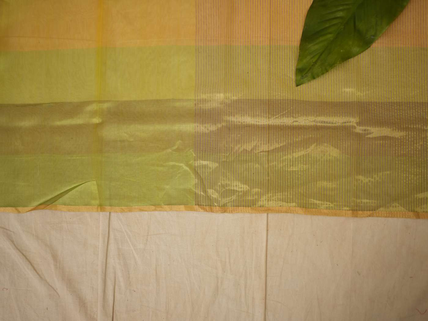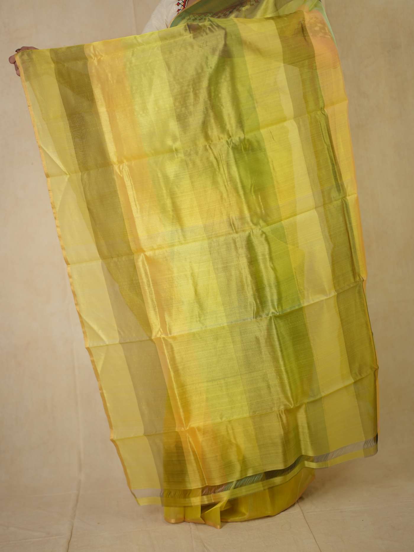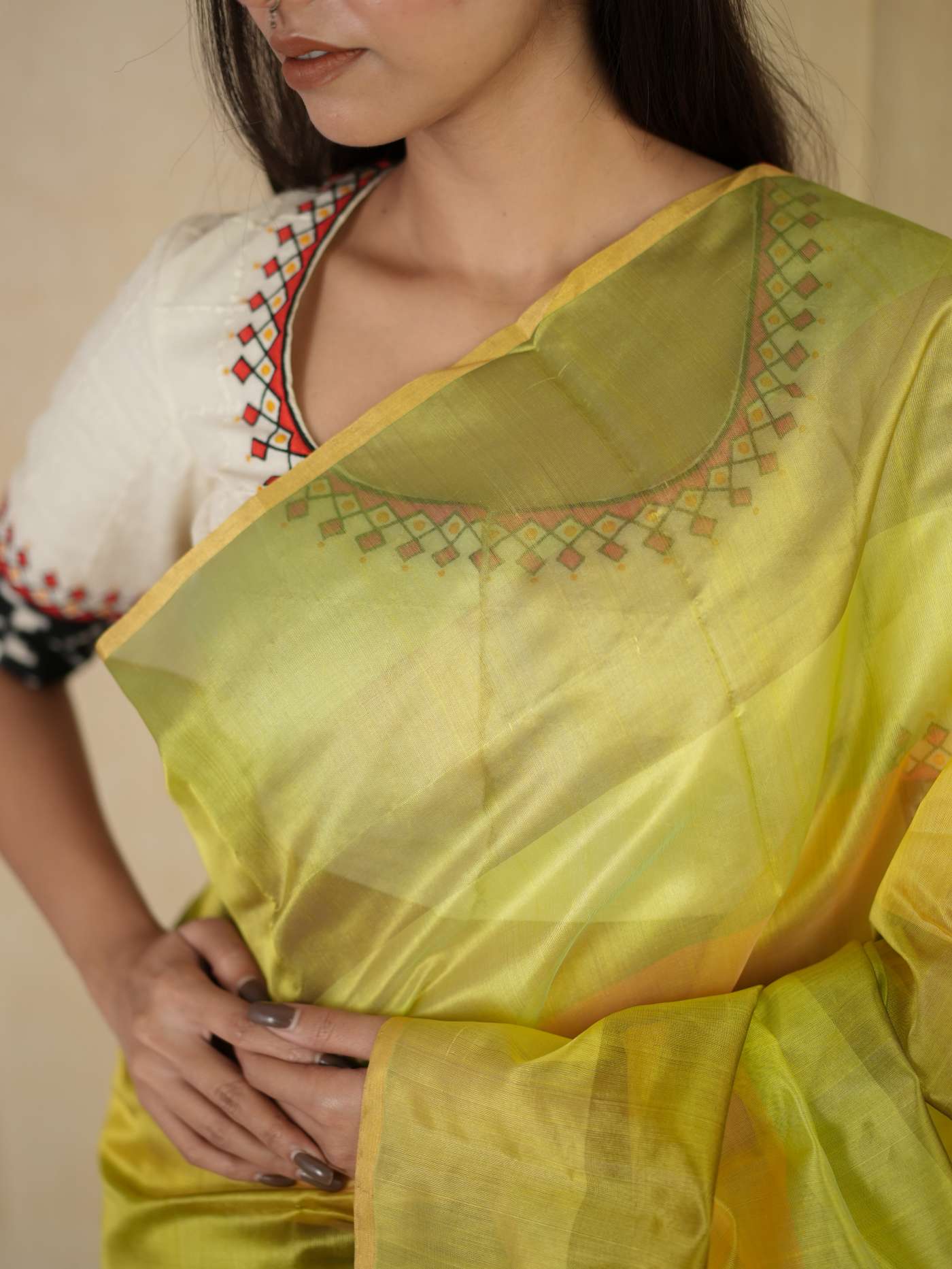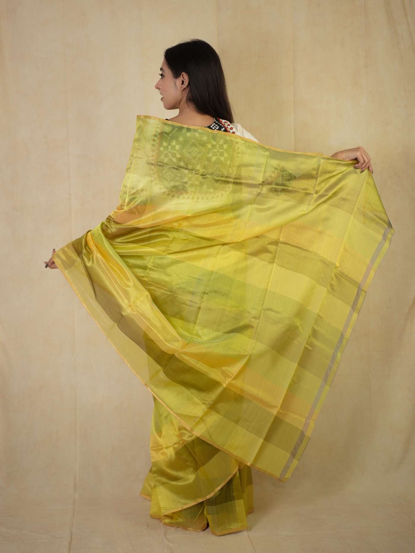 This Chanderi green-yellow silk saree embodies freshness and grace, with subtle golden selvedge that exude timeless beauty. Perfect for festive occasions, celebrations, or daytime events, it reflects sophistication and charm, making you stand out with radiant elegance and effortless style.