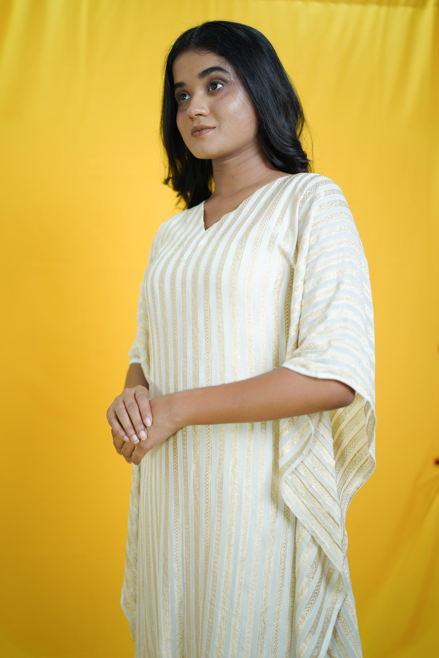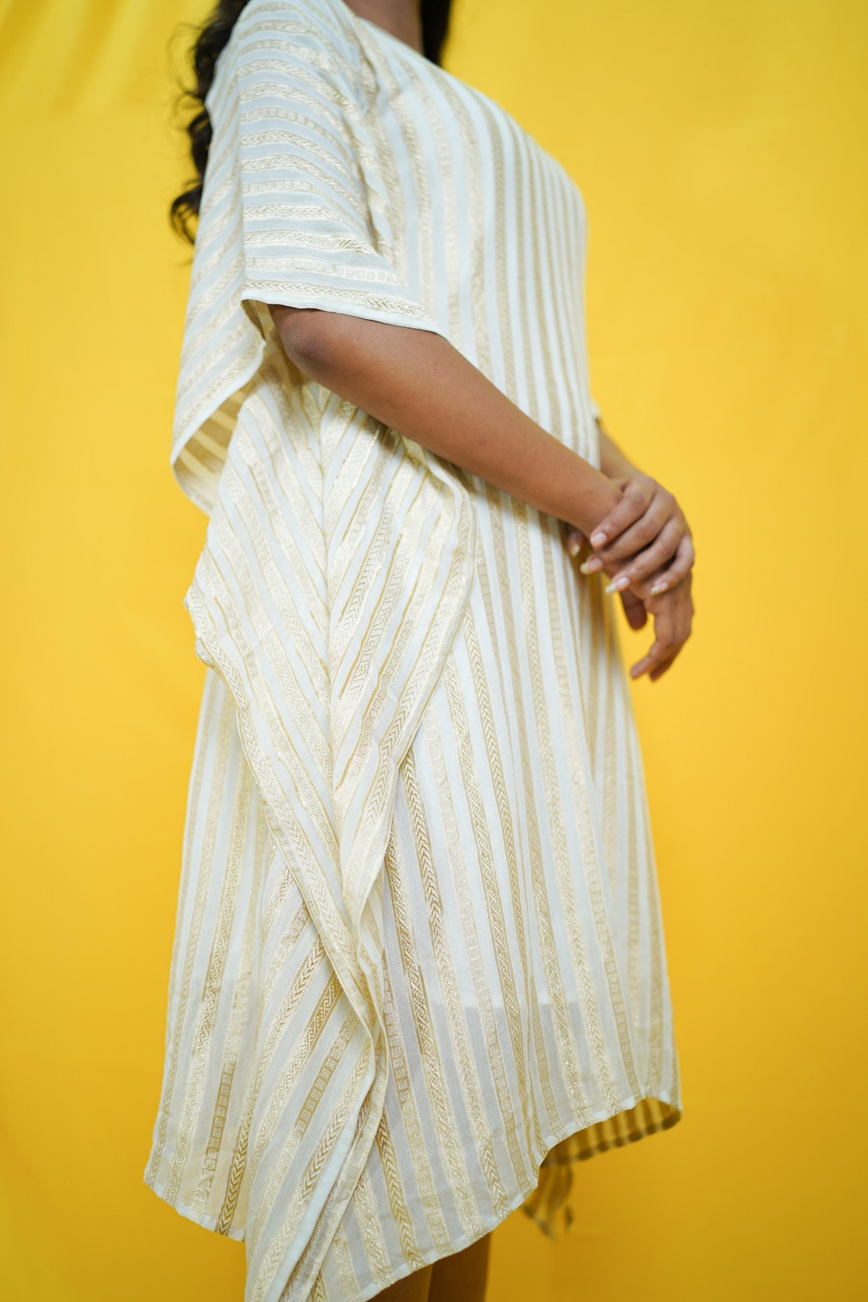 Embrace effortless luxury with this Banarasi georgette kaftan, where comfort meets couture. The flowy silhouette and vertical stripes offer a flattering, elongated look. Pair it with gold or white strappy heels and minimal gold jewelry for a refined touch. Comes with the slip of the same colour.