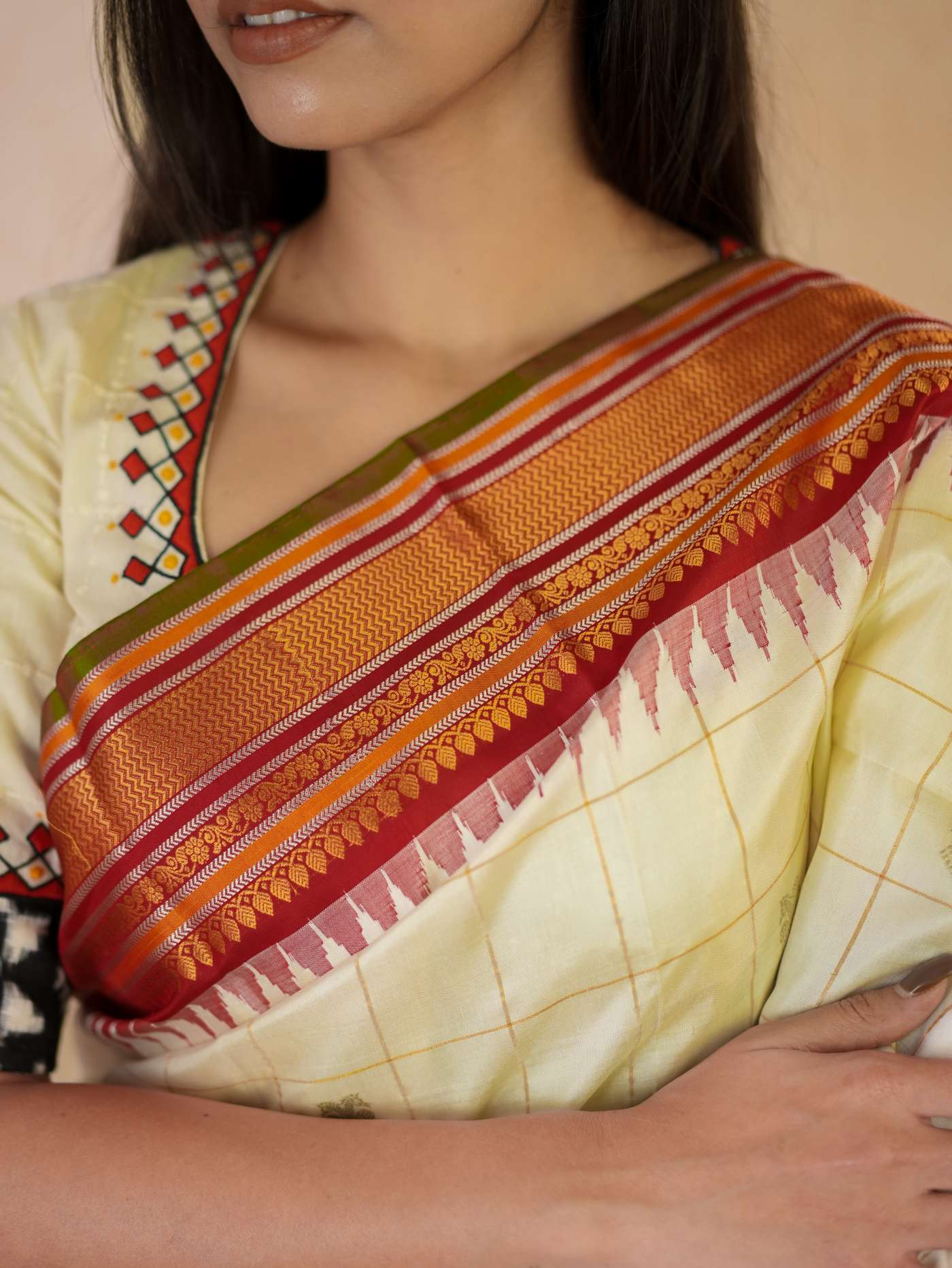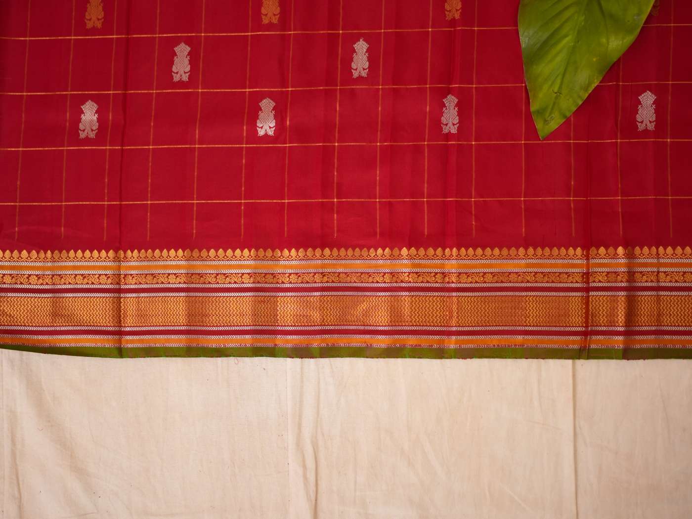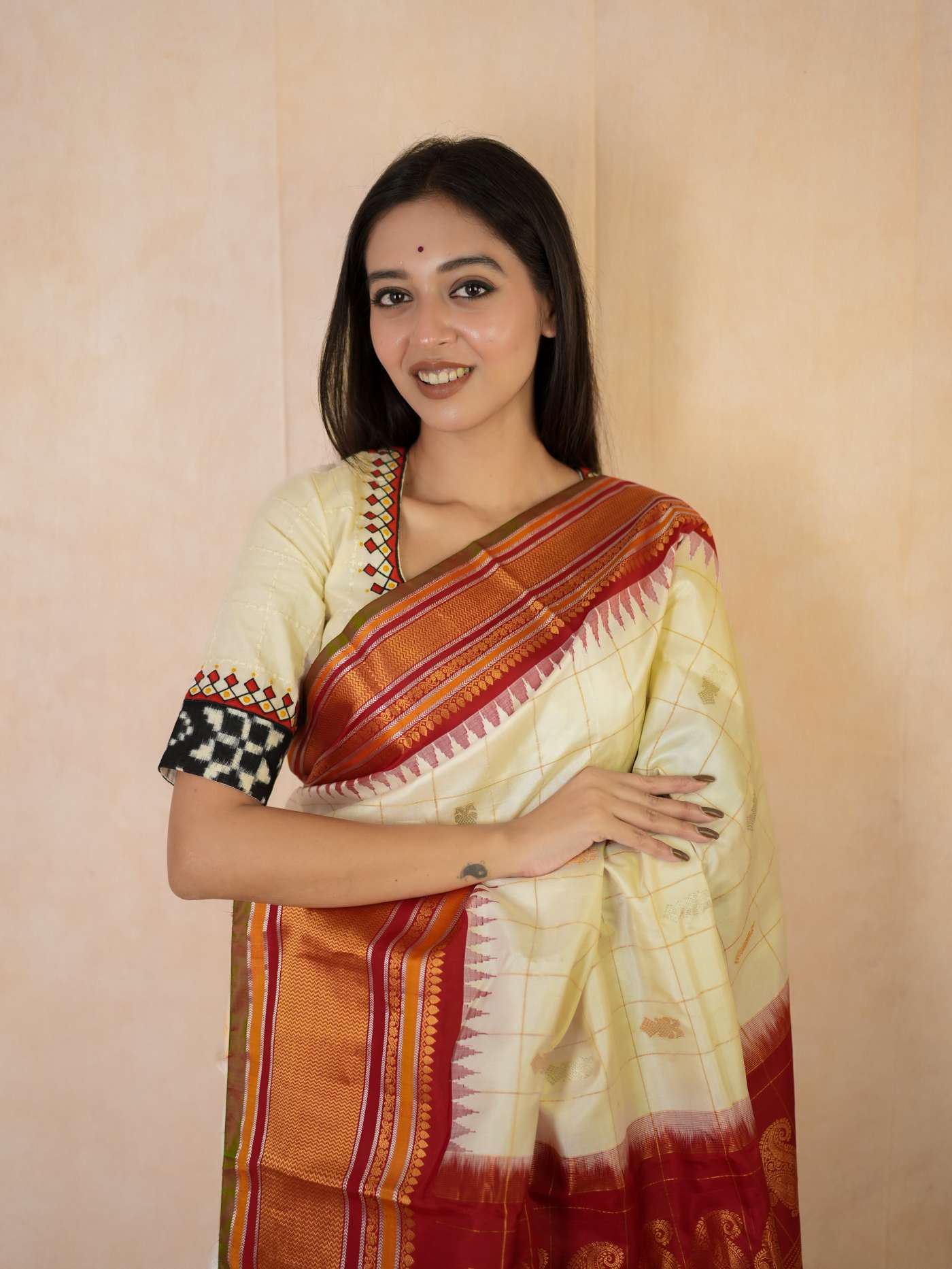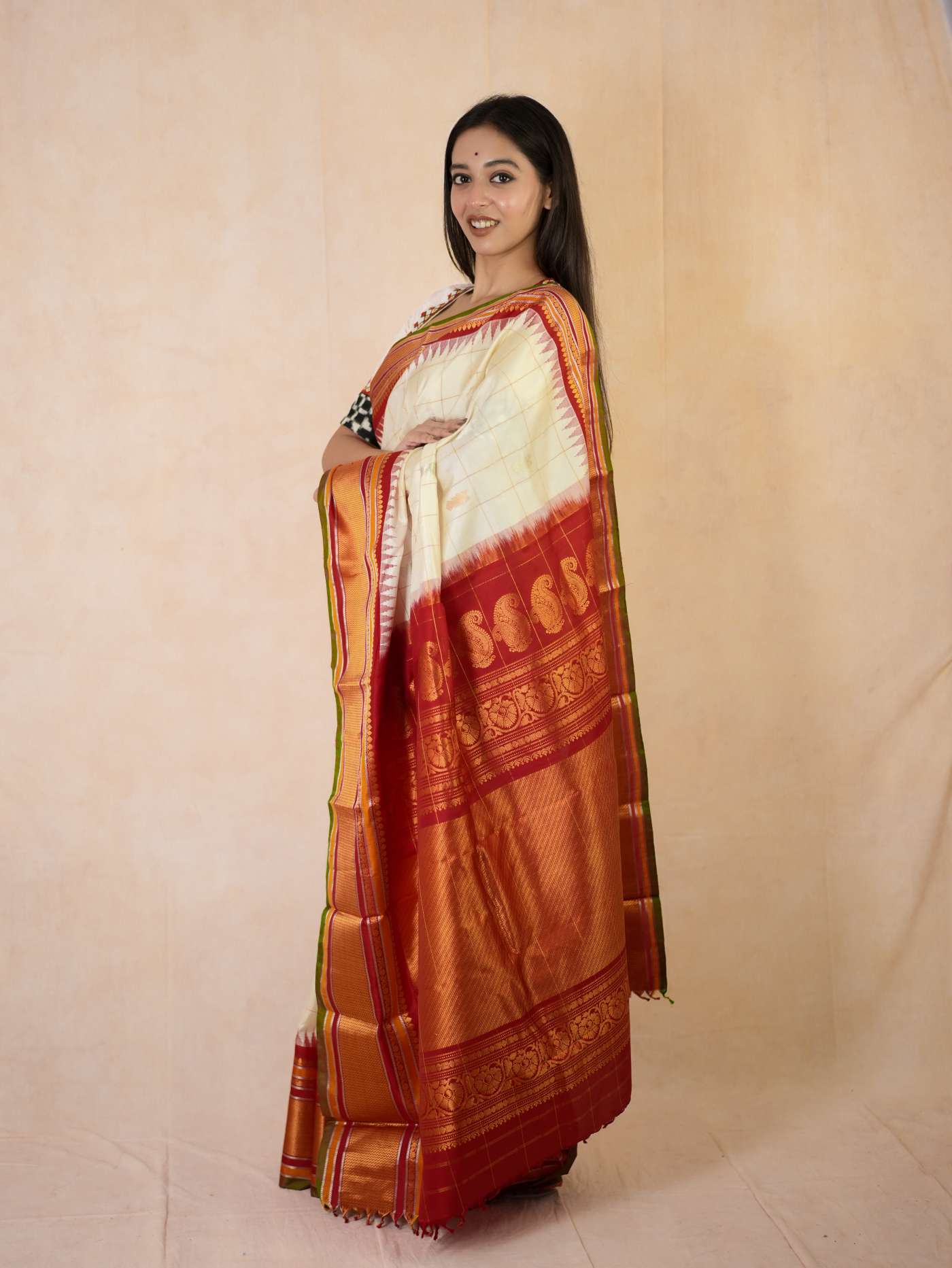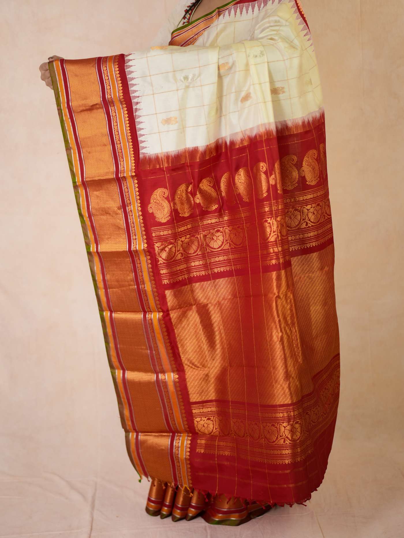 Indulge in the timeless beauty of an Cream and Red Silk Gadwal Saree, a graceful blend of heritage and elegance. Handwoven with pure mulberry silk, it features refined golden and silver zari buttas on the checked body, enhanced by golden and silver zari borders and a golden zari pallu. Perfect for weddings, festive occasions, and cultural celebrations.