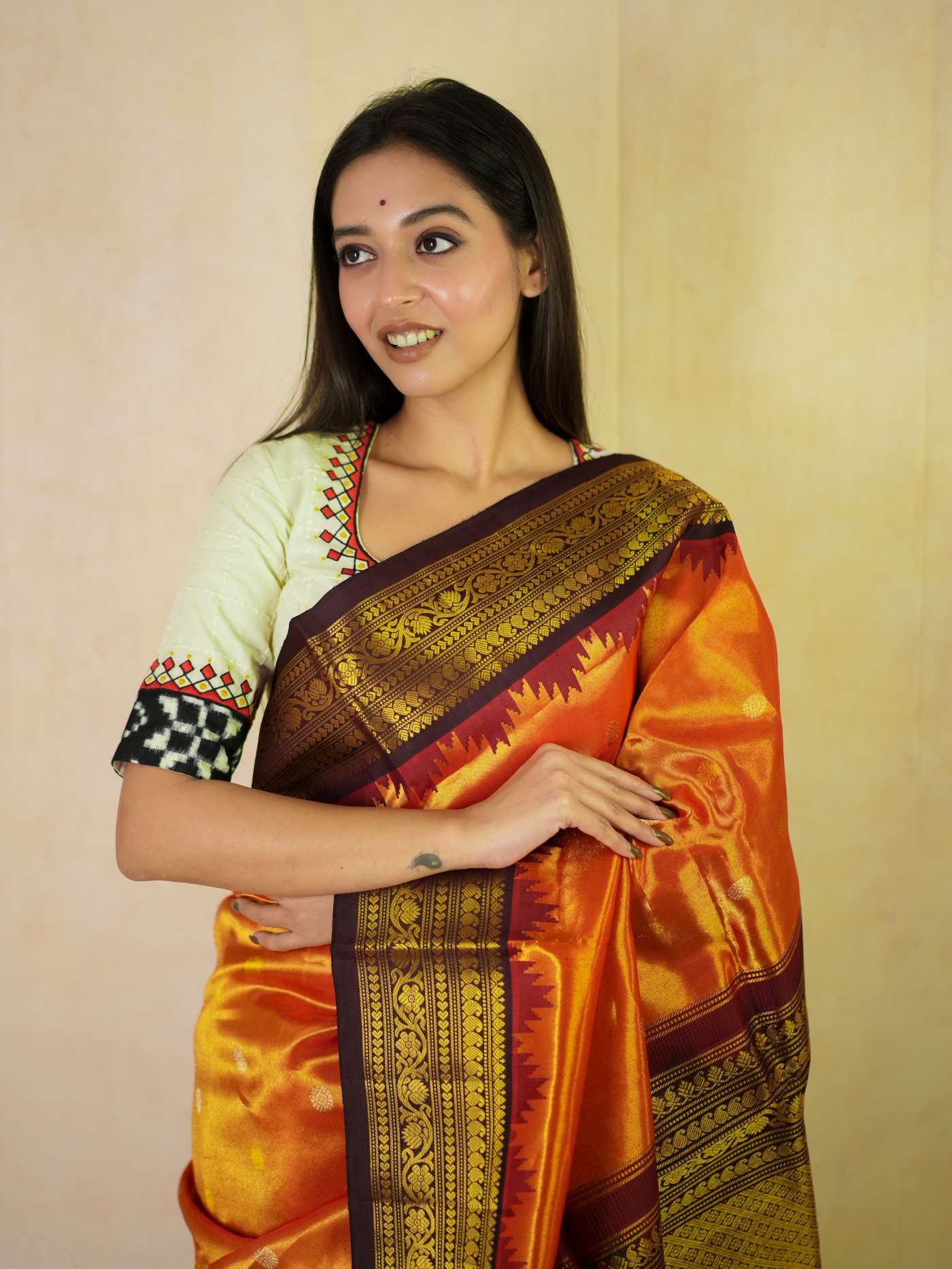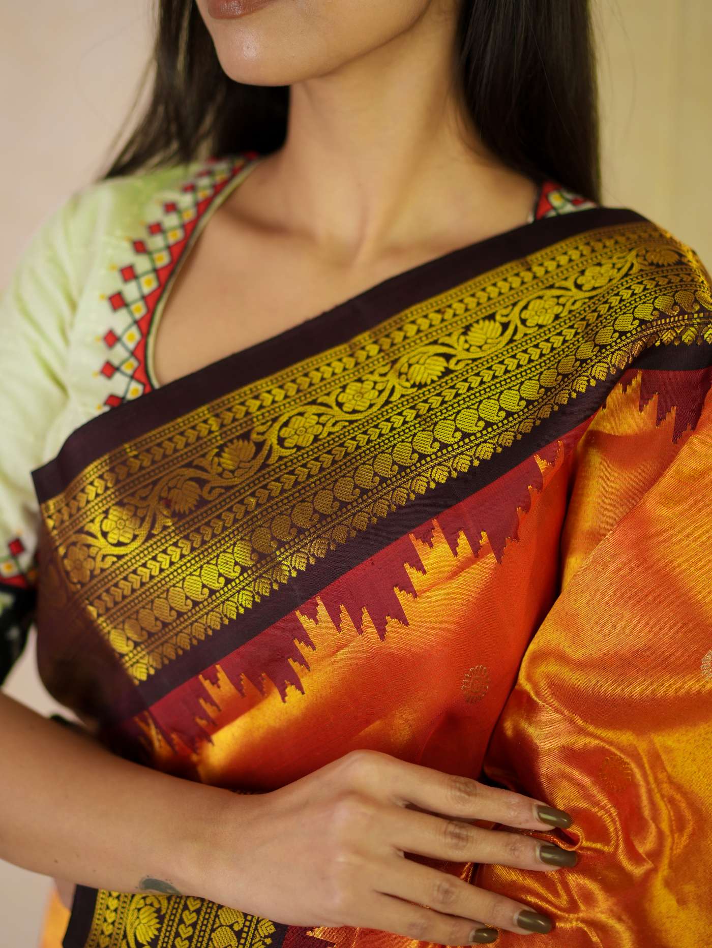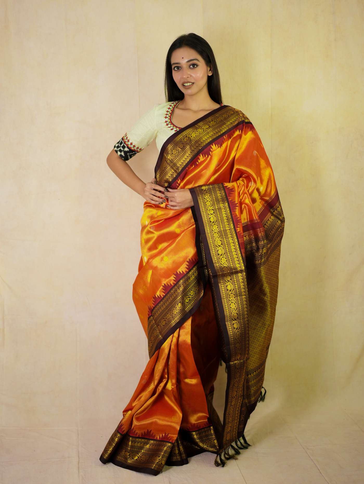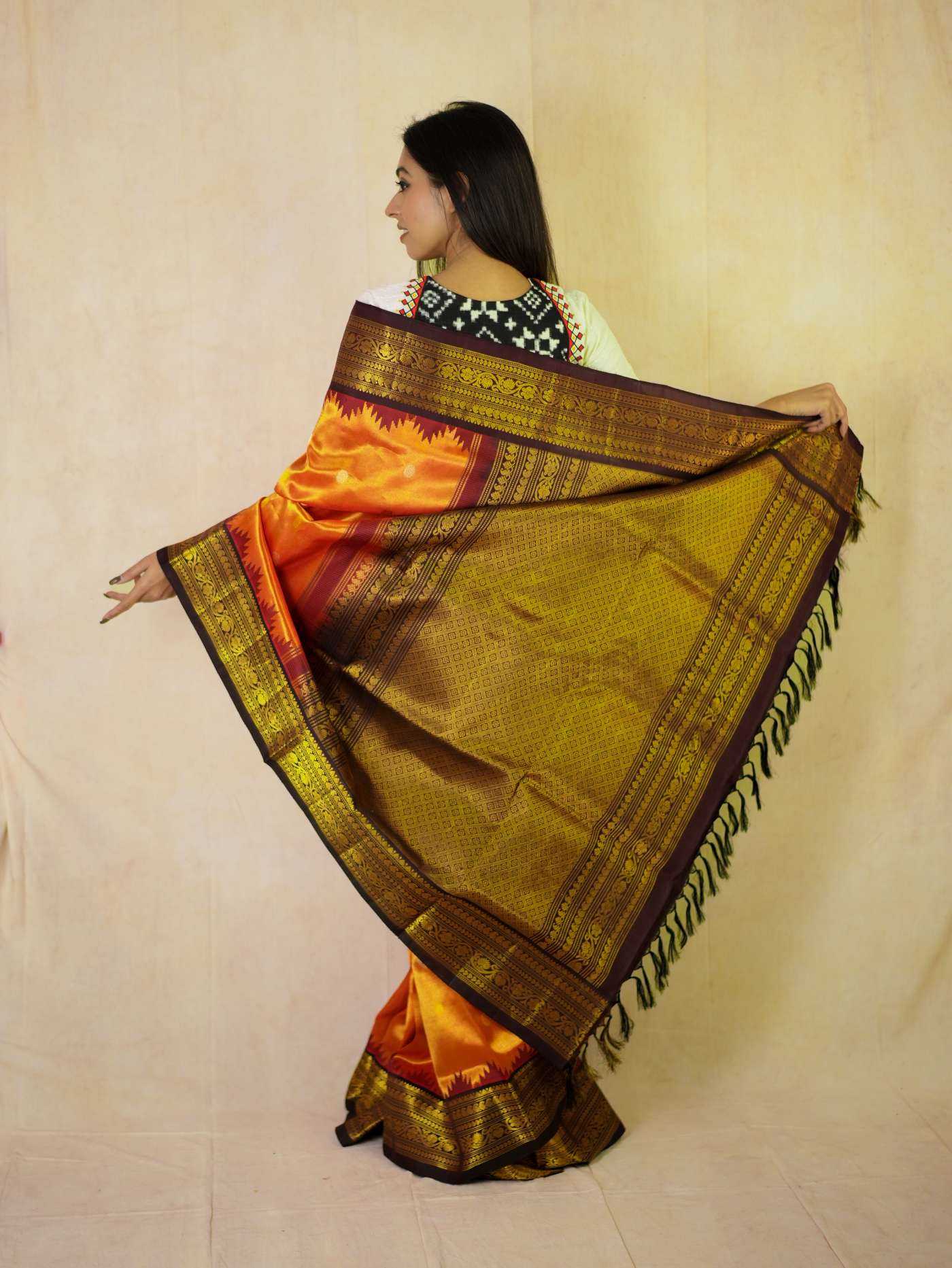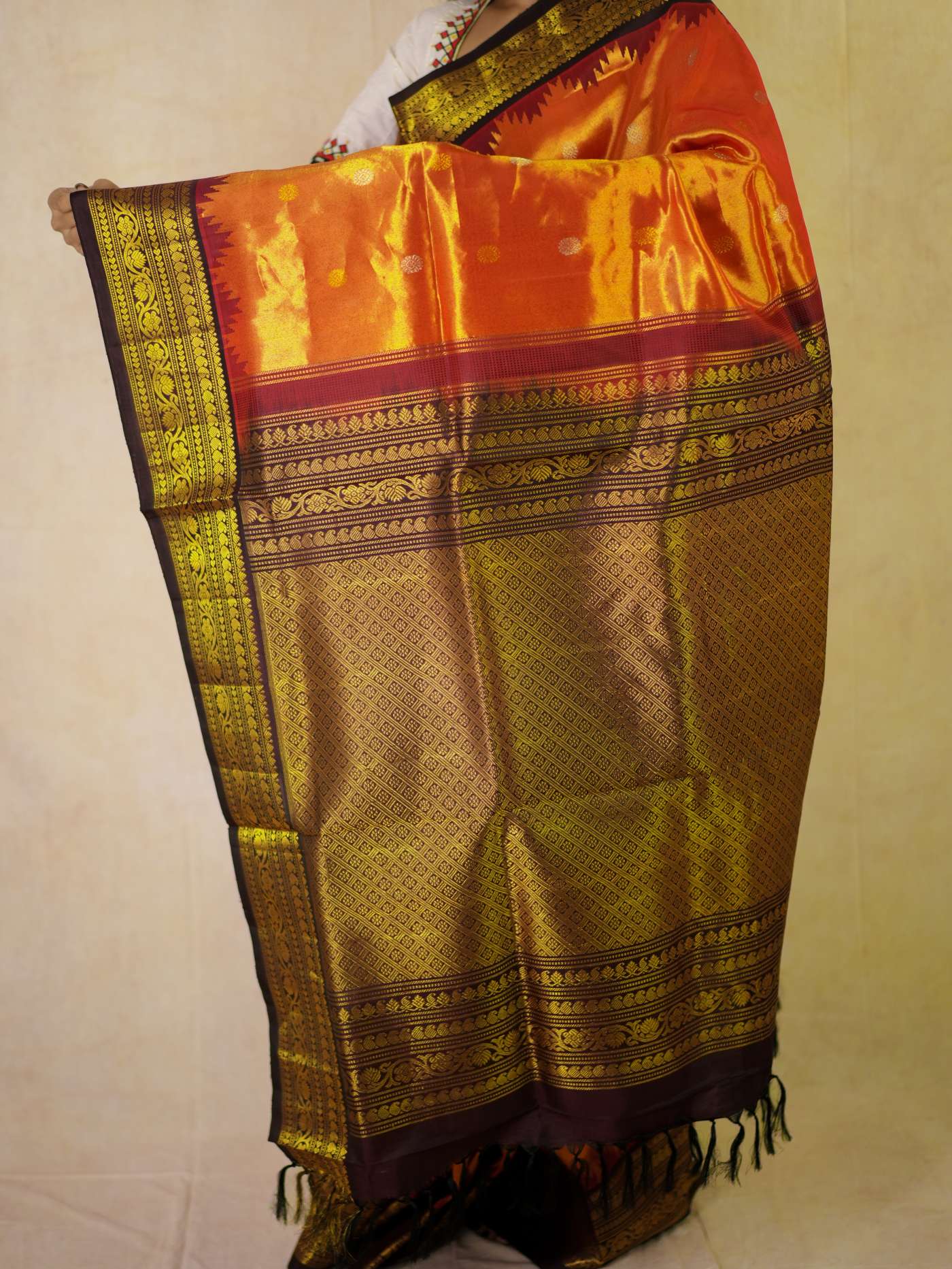 Indulge in the timeless beauty of an Reddish Orange Silk Gadwal Tissus Saree, a splendid blend of tradition and elegance. Handwoven with pure mulberry silk, it showcases delicate golden and silver zari buttas on the lustrous body, complemented by a rich maroon border and intricately detailed golden zari work on the pallu—ideal for weddings, festive occasions, and cultural celebrations.
