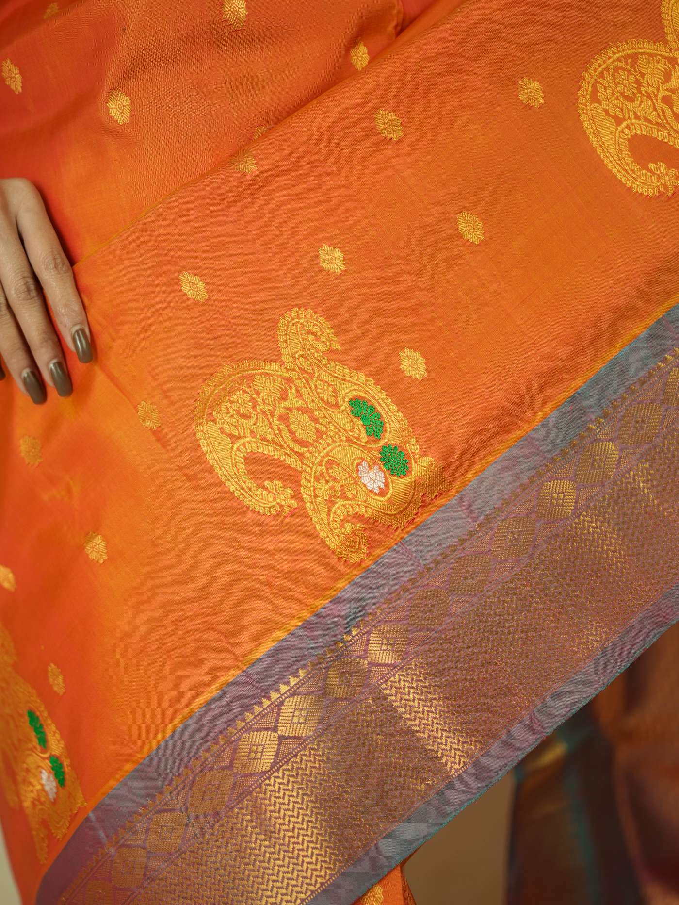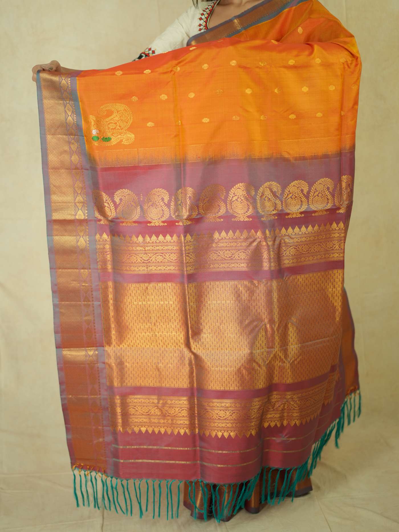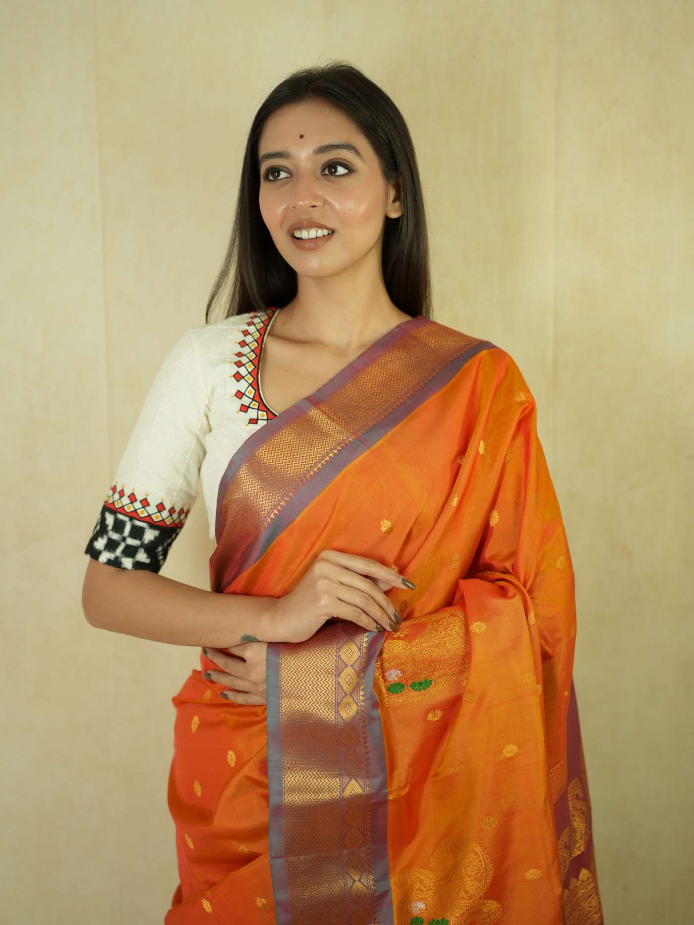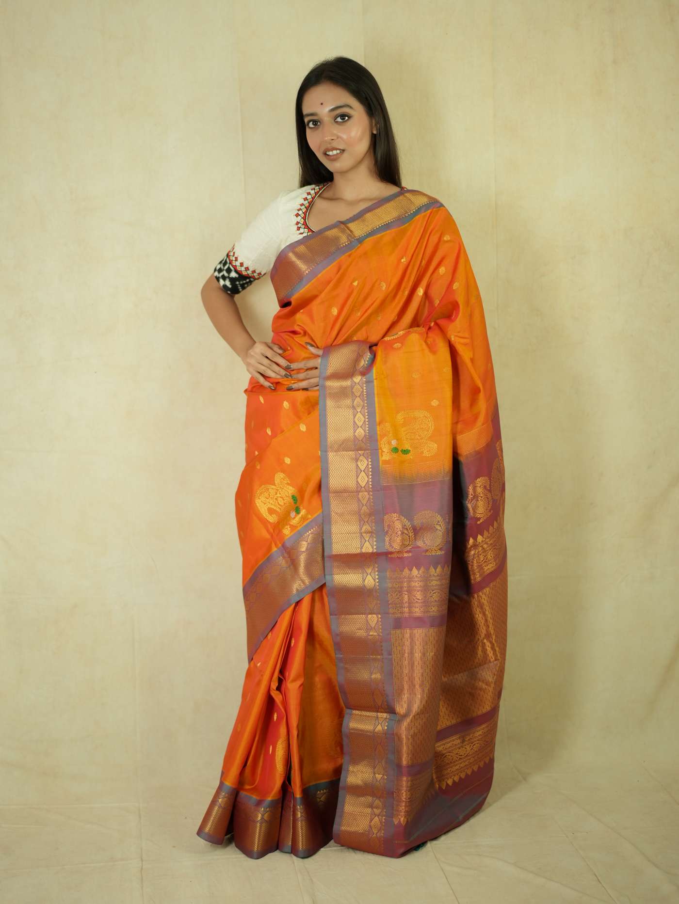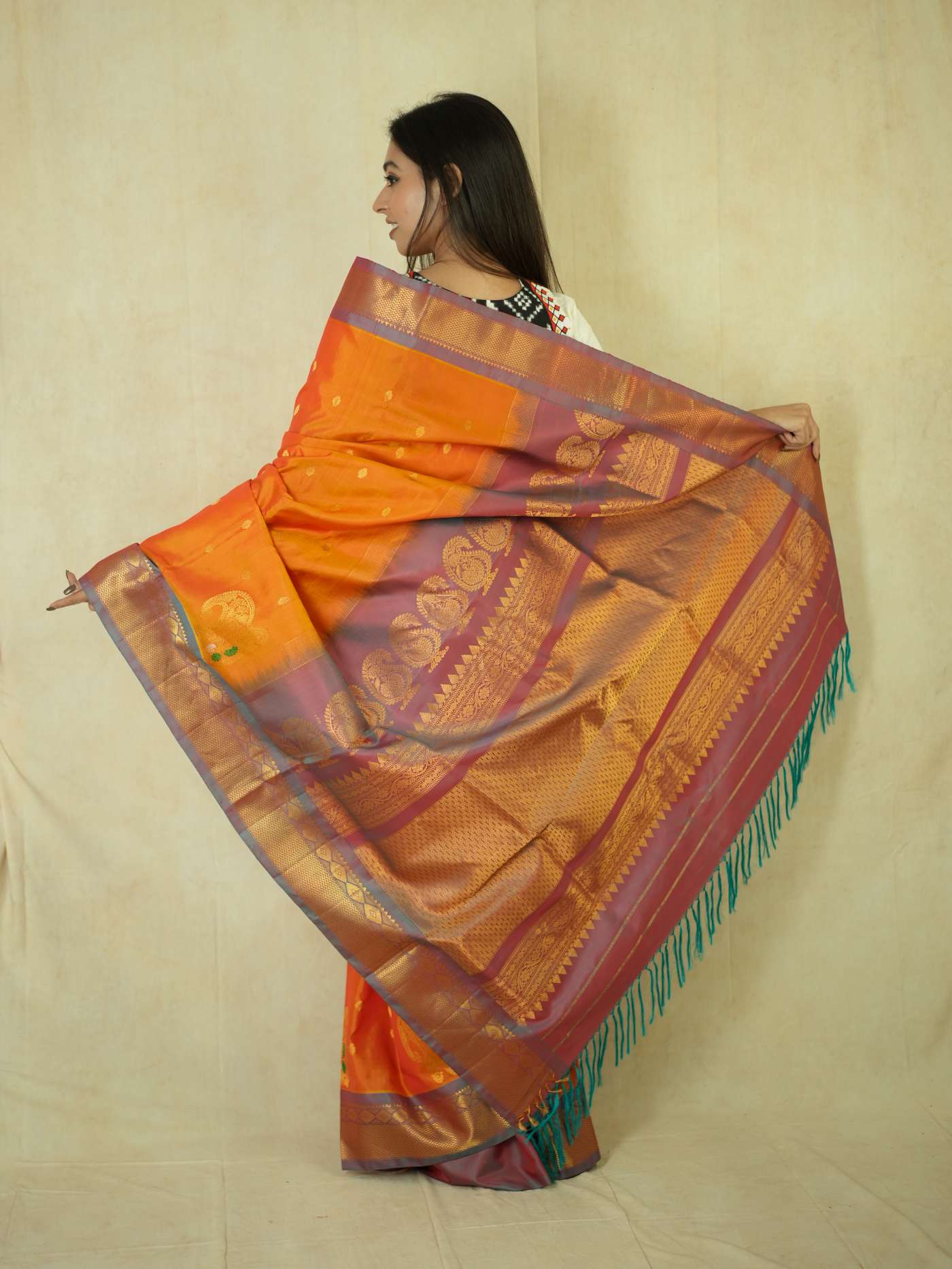 Indulge in the radiant beauty of an Orange Gadwal Silk Saree, a striking blend of heritage and elegance. Handwoven with pure mulberry silk, it showcases delicate golden zari buttas on the vibrant orange body, complemented by a rich purple border and exquisitely detailed golden zari work on the pallu—ideal for weddings, festive occasions, and grand cultural celebrations.