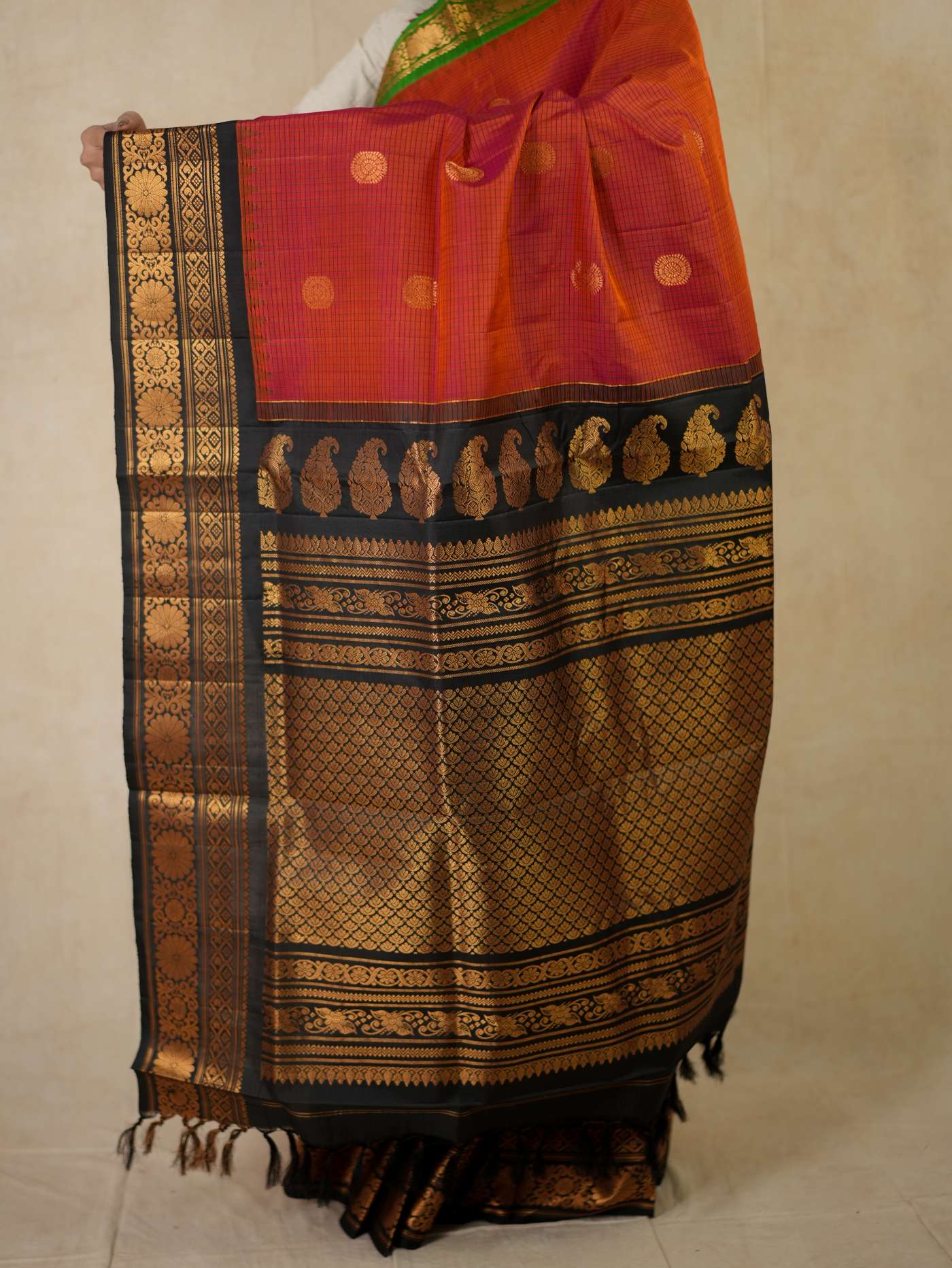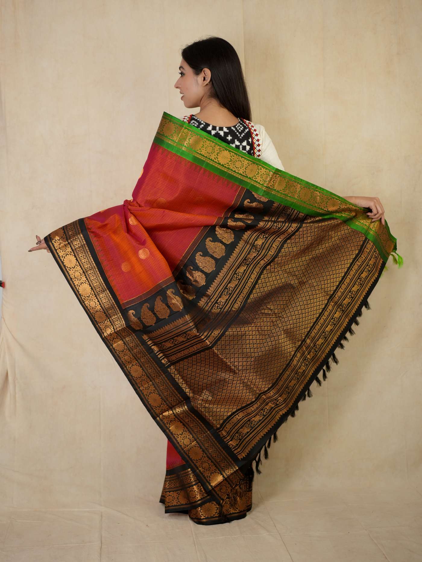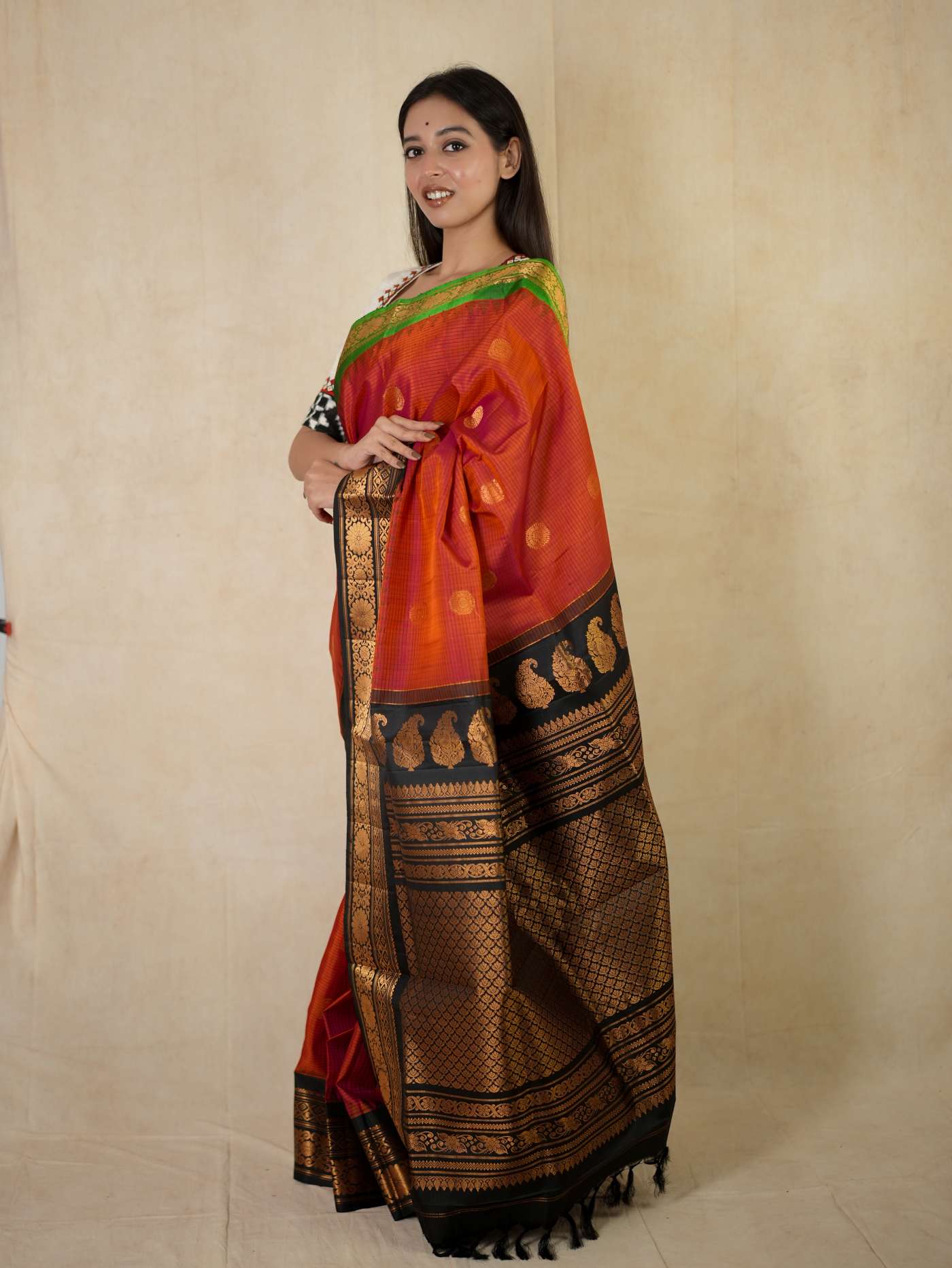 Indulge in the timeless beauty of a Raddish Orange and Black Gadwal Silk Saree, a refined blend of tradition and elegance. Handwoven with pure mulberry silk, it features delicate golden zari buttas on the vibrant checked body, complemented by a rich black border and intricately woven golden zari work on the pallu—perfect for weddings, festive occasions, and cultural celebrations.
