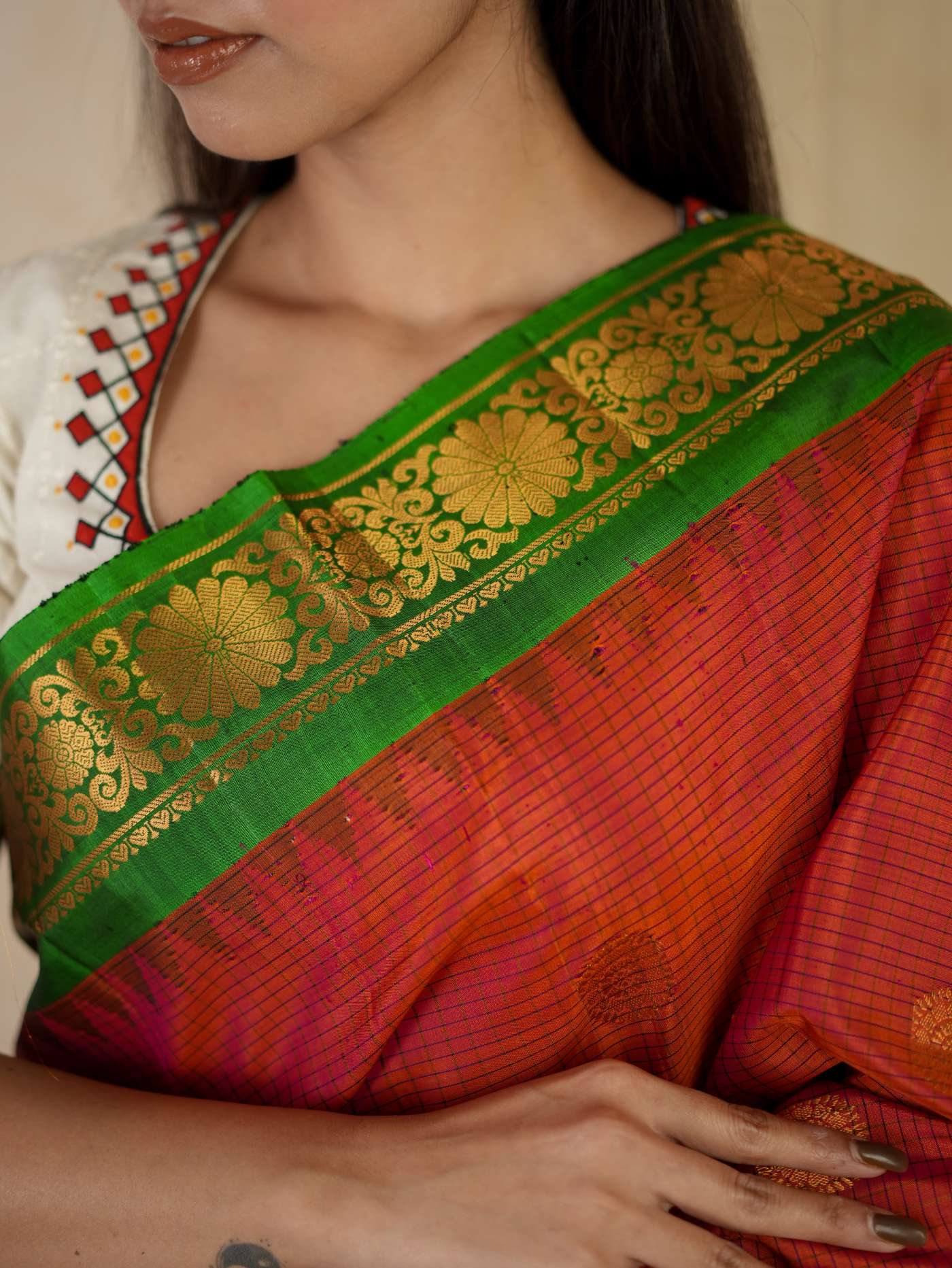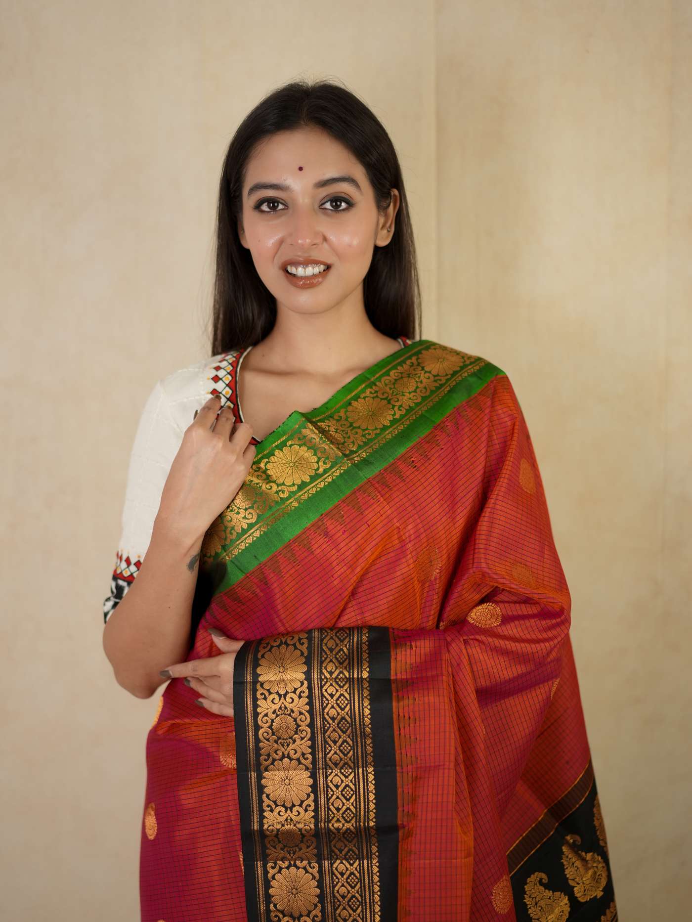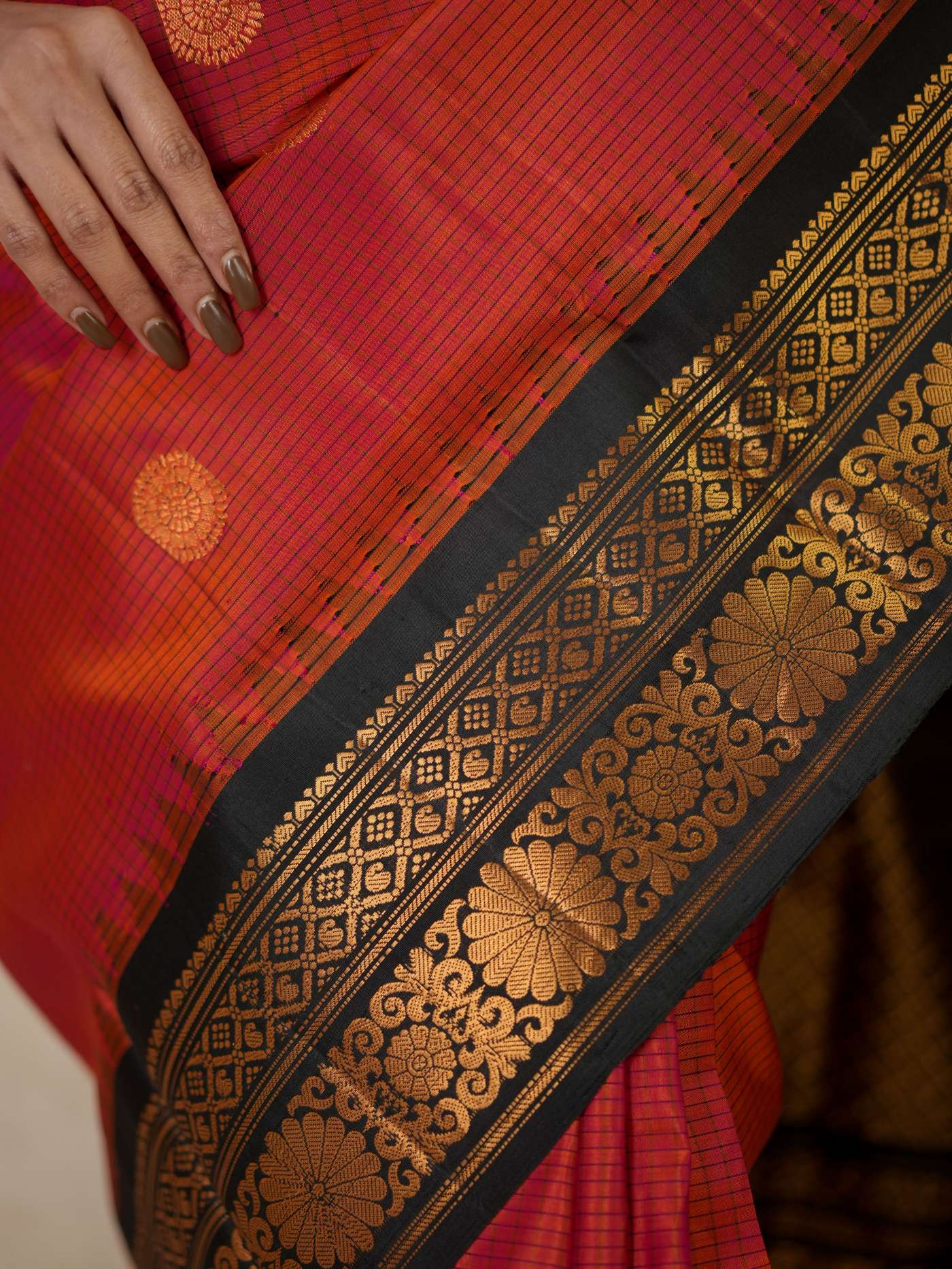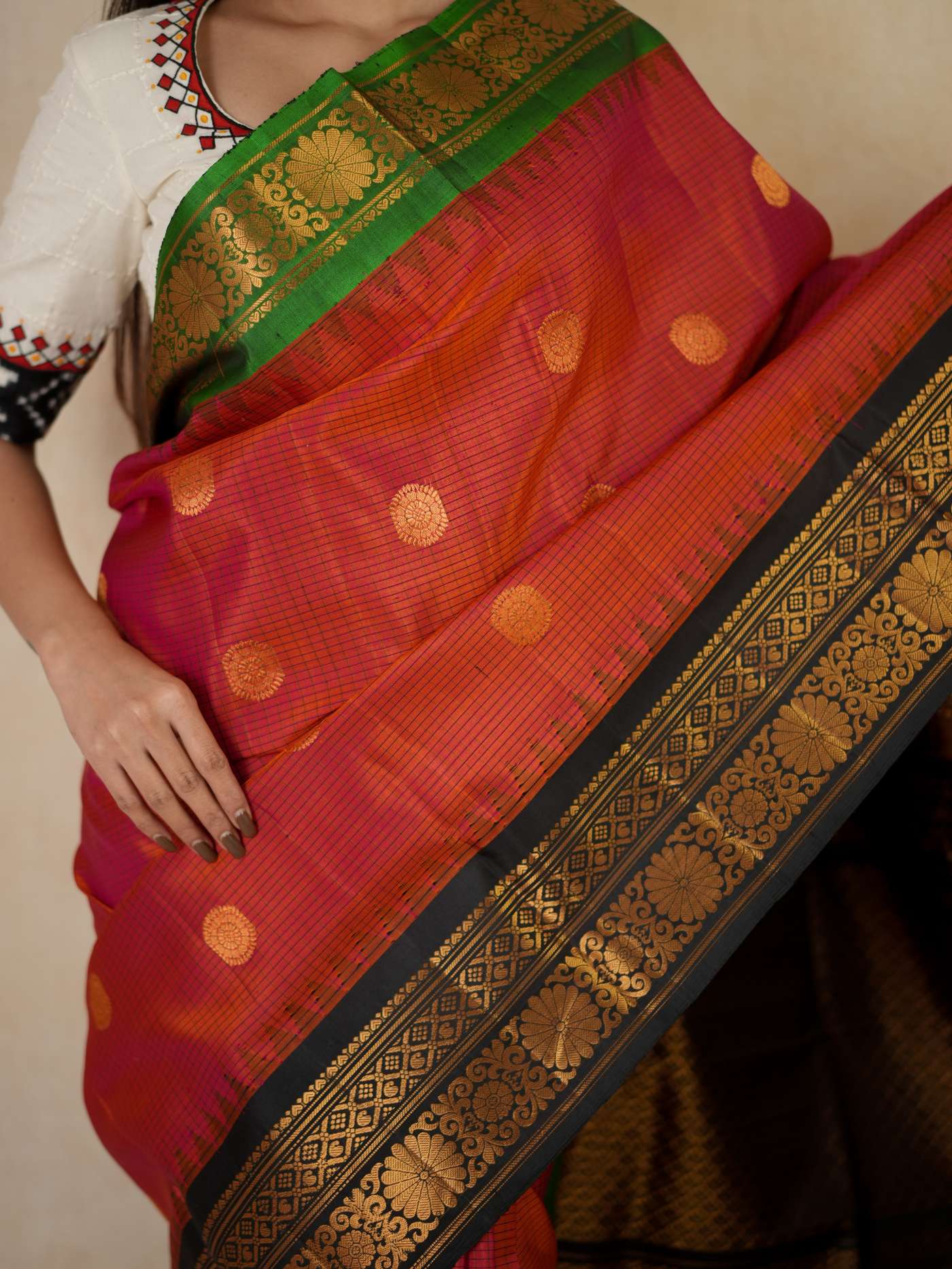 Indulge in the timeless beauty of a Raddish Orange and Black Gadwal Silk Saree, a refined blend of tradition and elegance. Handwoven with pure mulberry silk, it features delicate golden zari buttas on the vibrant checked body, complemented by a rich black border and intricately woven golden zari work on the pallu—perfect for weddings, festive occasions, and cultural celebrations.