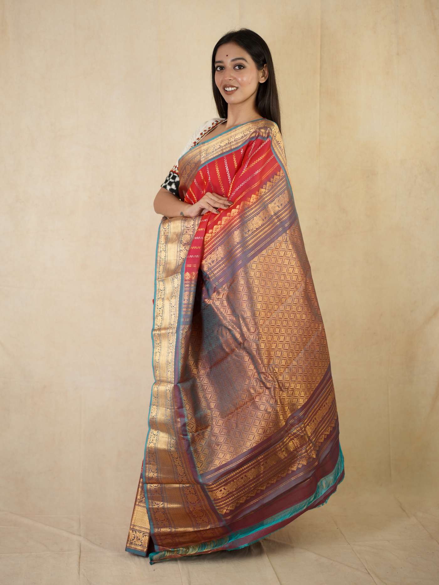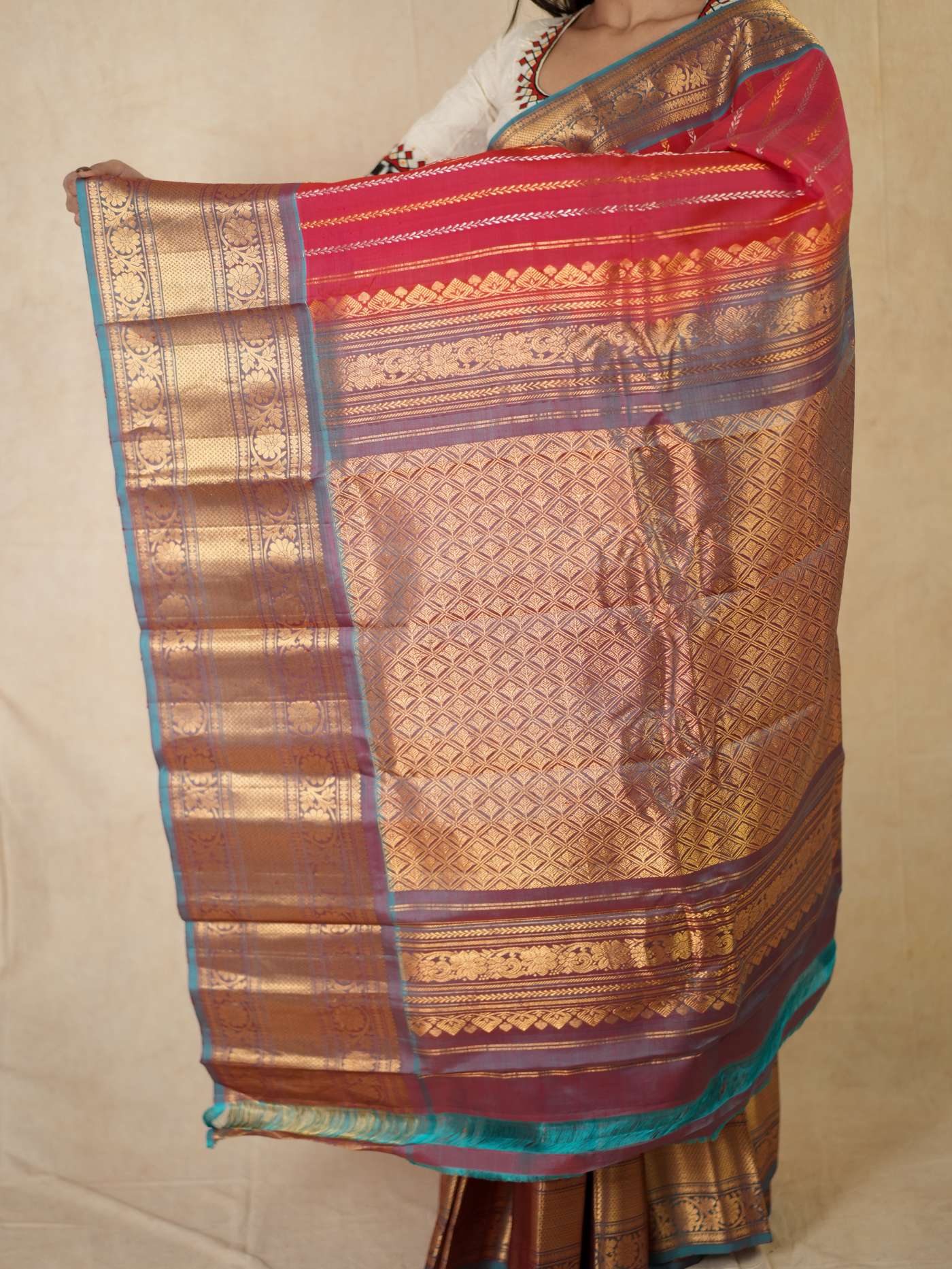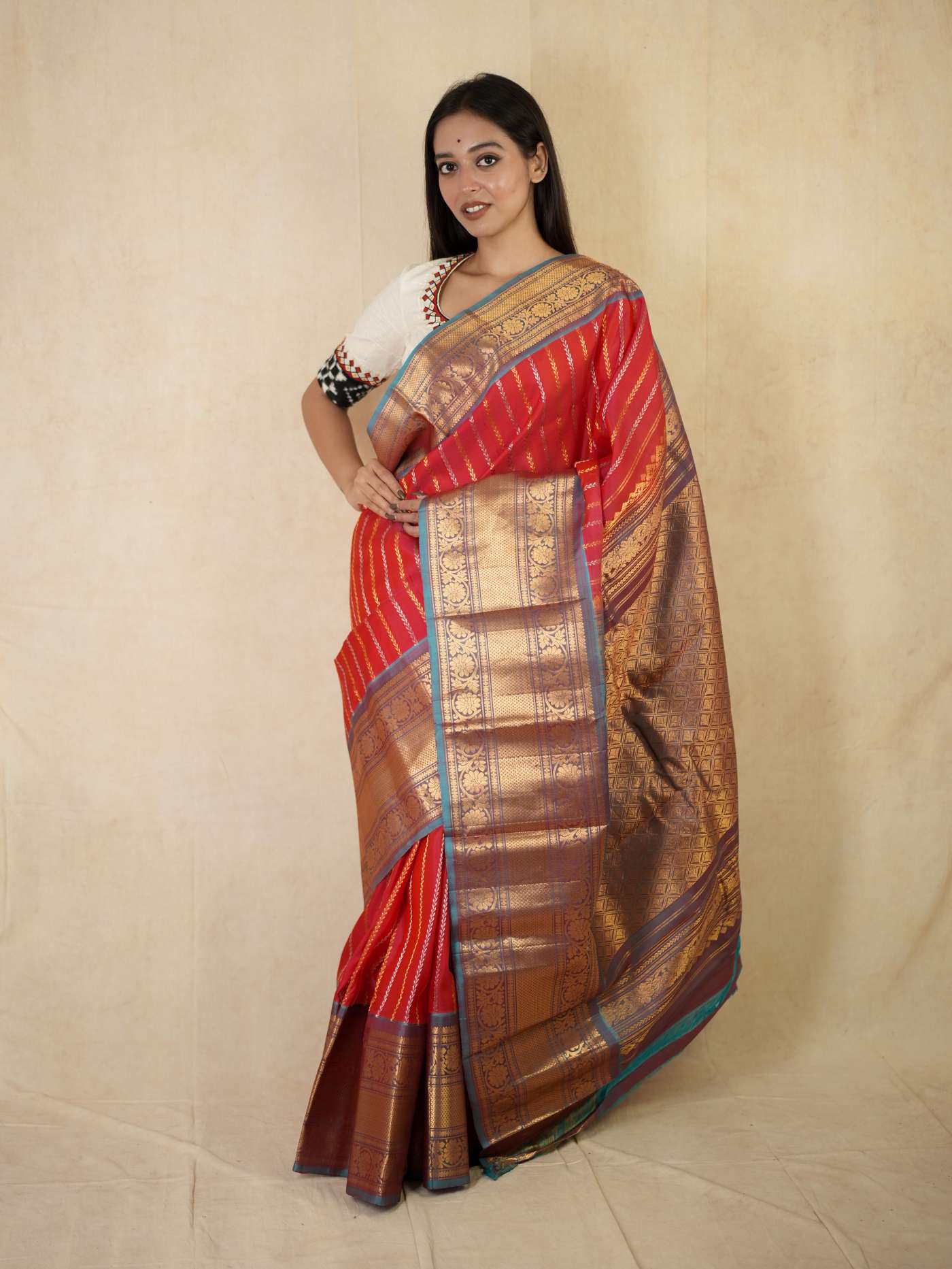 Indulge in the timeless beauty of this Reddish Pink and Antique Gold Silk Gadwal Saree, a graceful blend of tradition and elegance. Handwoven in classic Gadwal craftsmanship, it features refined golden and silver striped patterns across the body, beautifully complemented by a rich contrasting border and intricate golden zari work on the border and pallu. Perfect for weddings, festive occasions, and cultural celebrations.