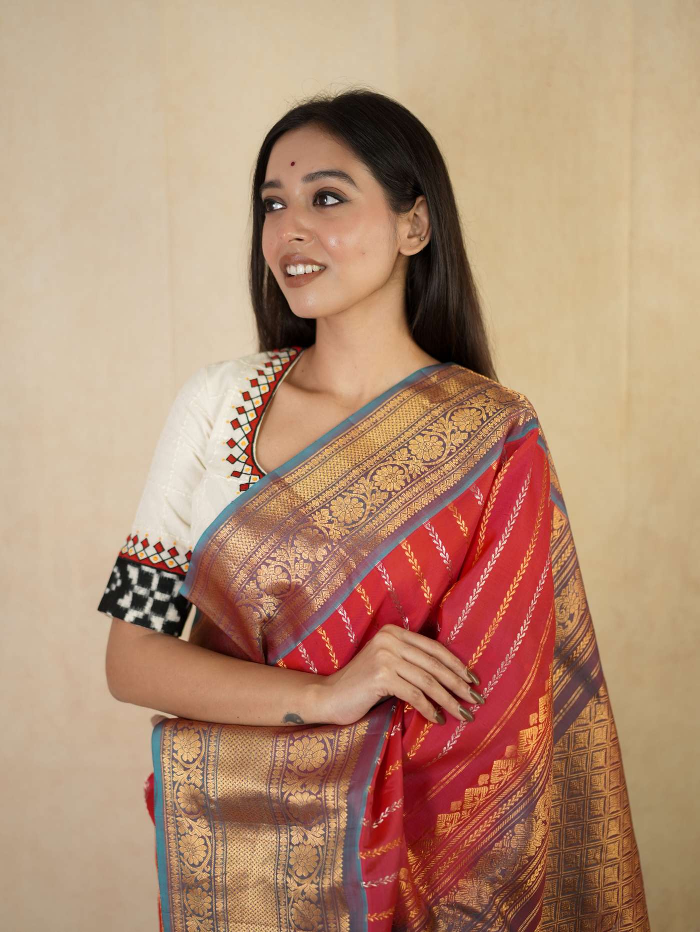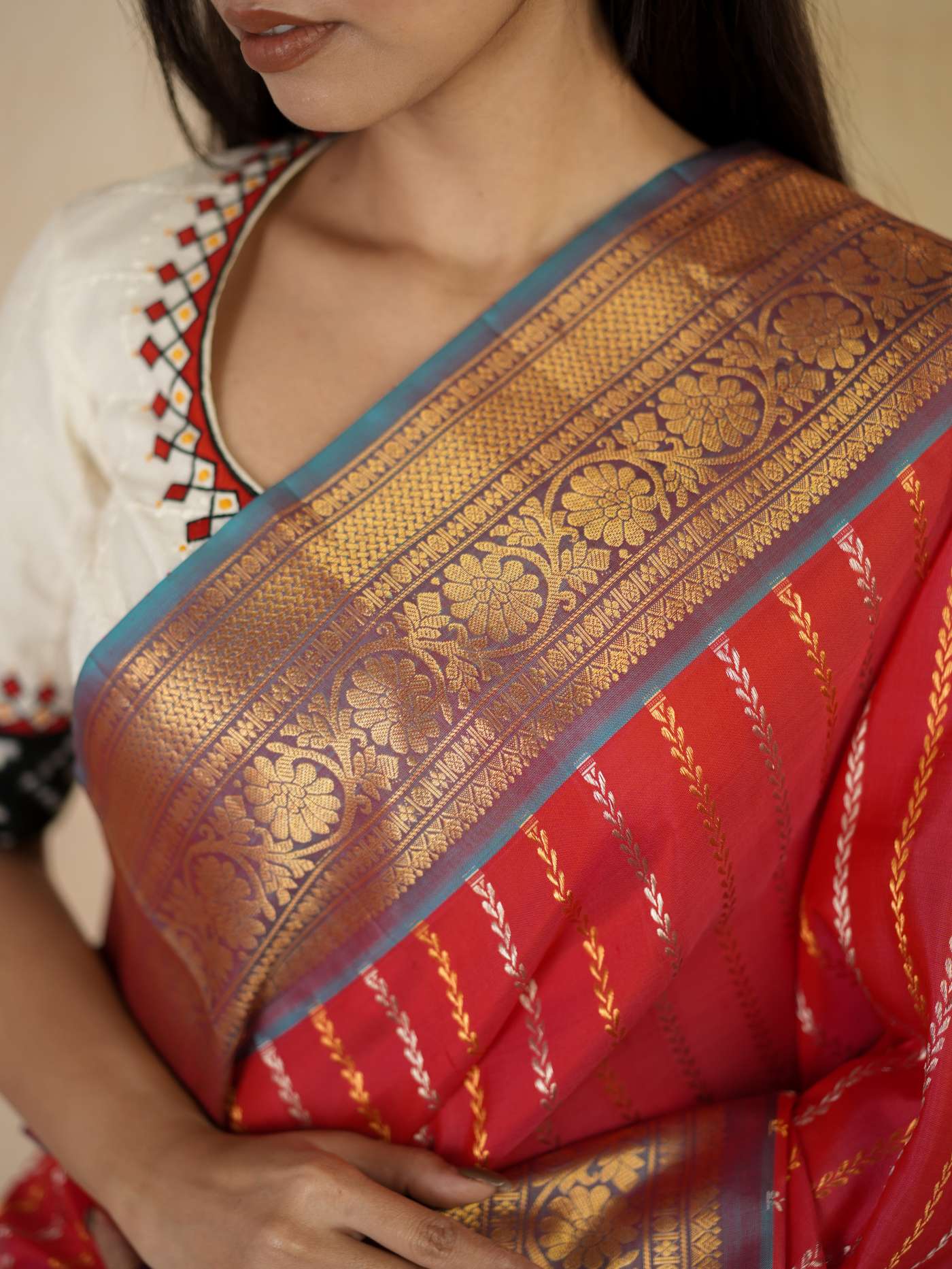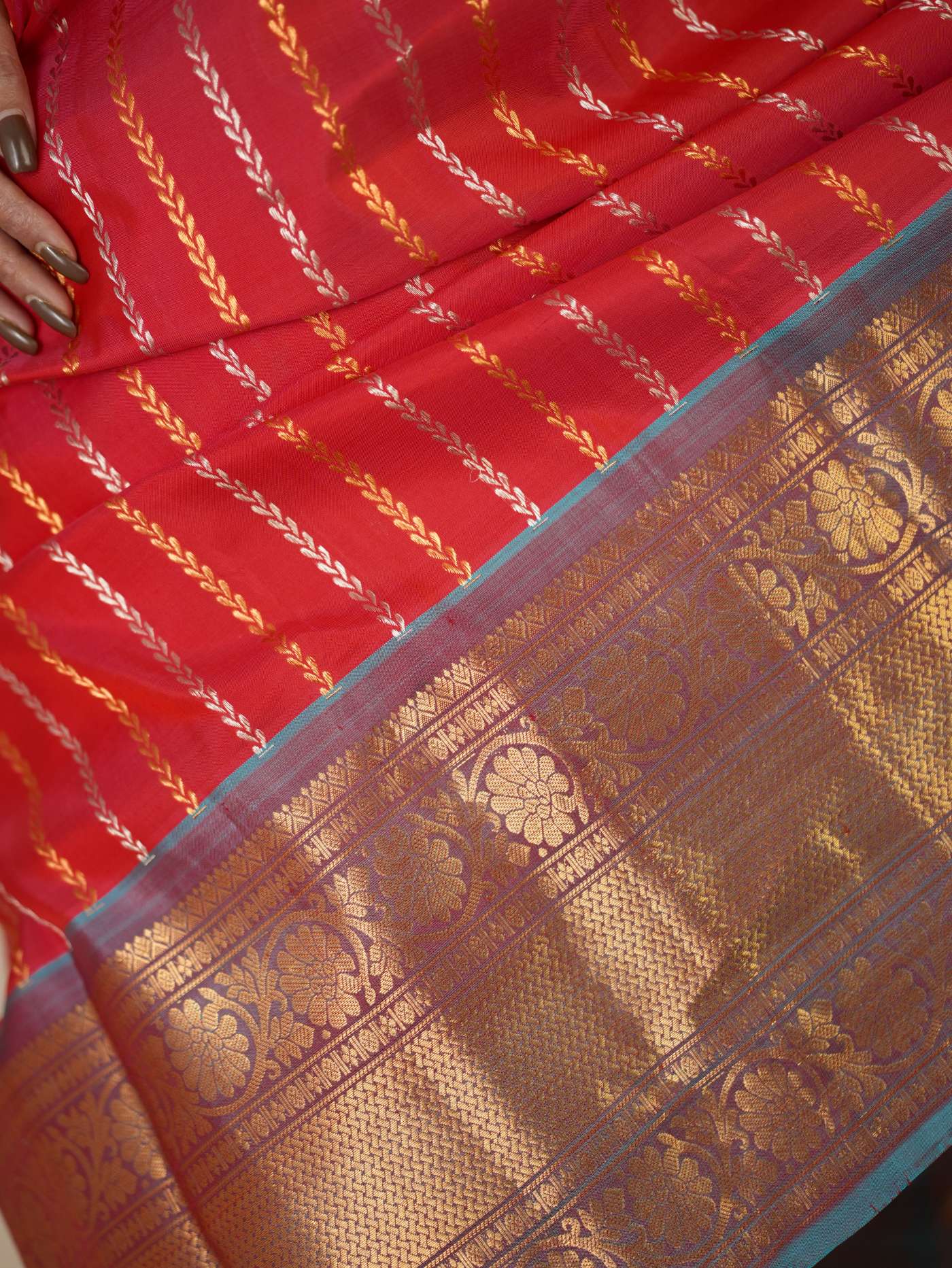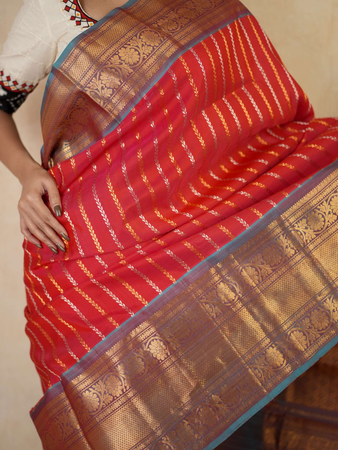 Indulge in the timeless beauty of this Reddish Pink and Antique Gold Silk Gadwal Saree, a graceful blend of tradition and elegance. Handwoven in classic Gadwal craftsmanship, it features refined golden and silver striped patterns across the body, beautifully complemented by a rich contrasting border and intricate golden zari work on the border and pallu. Perfect for weddings, festive occasions, and cultural celebrations.