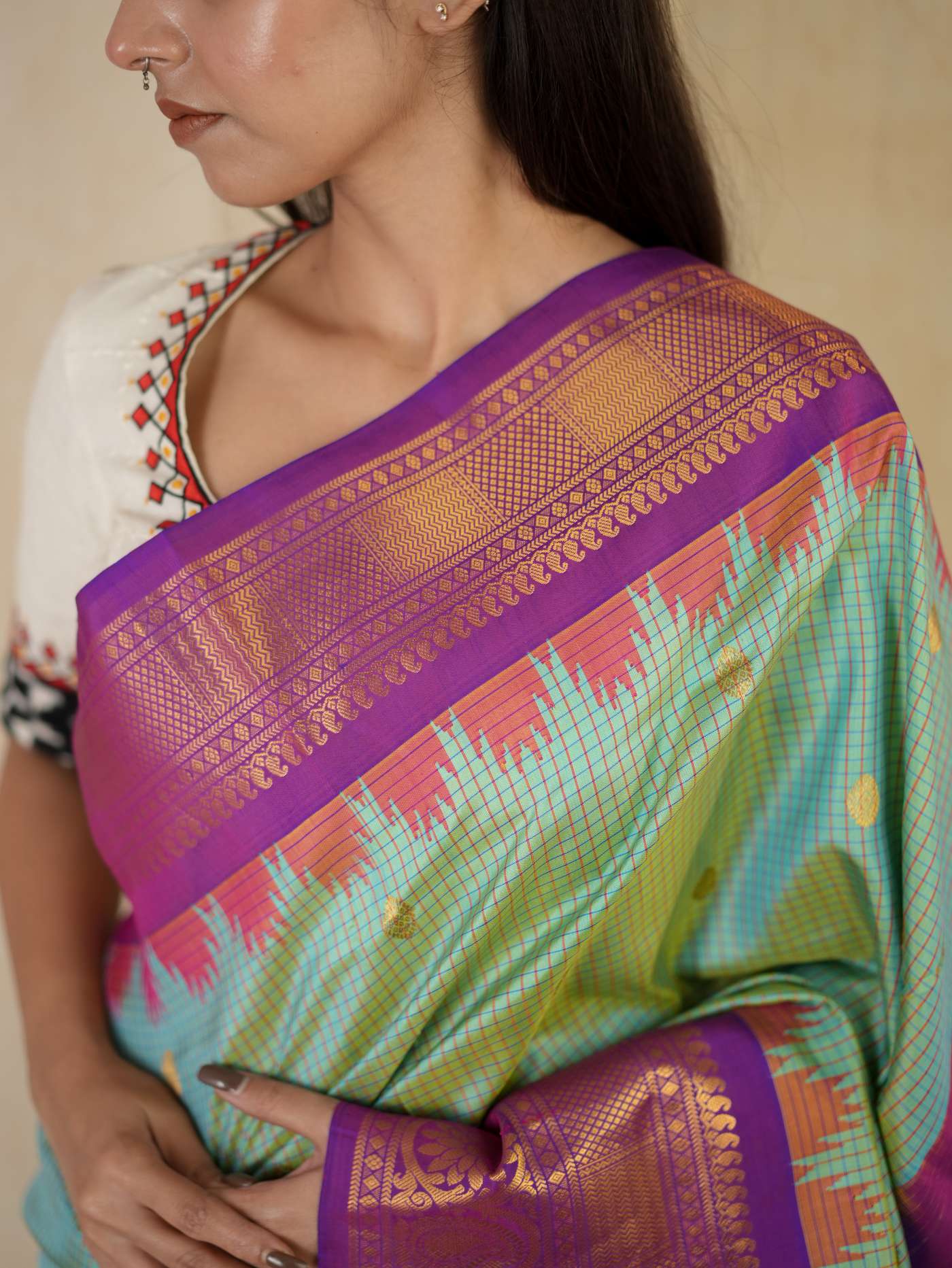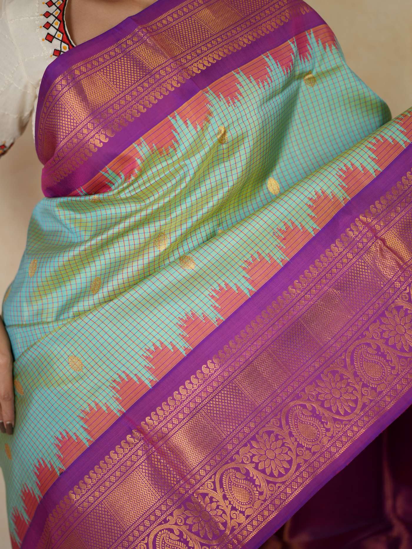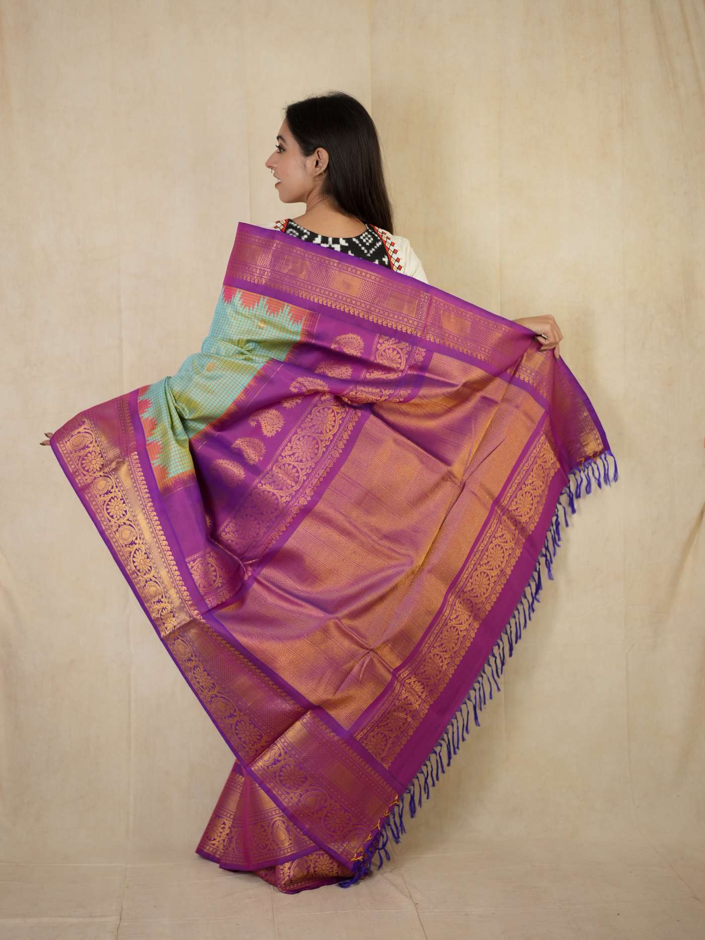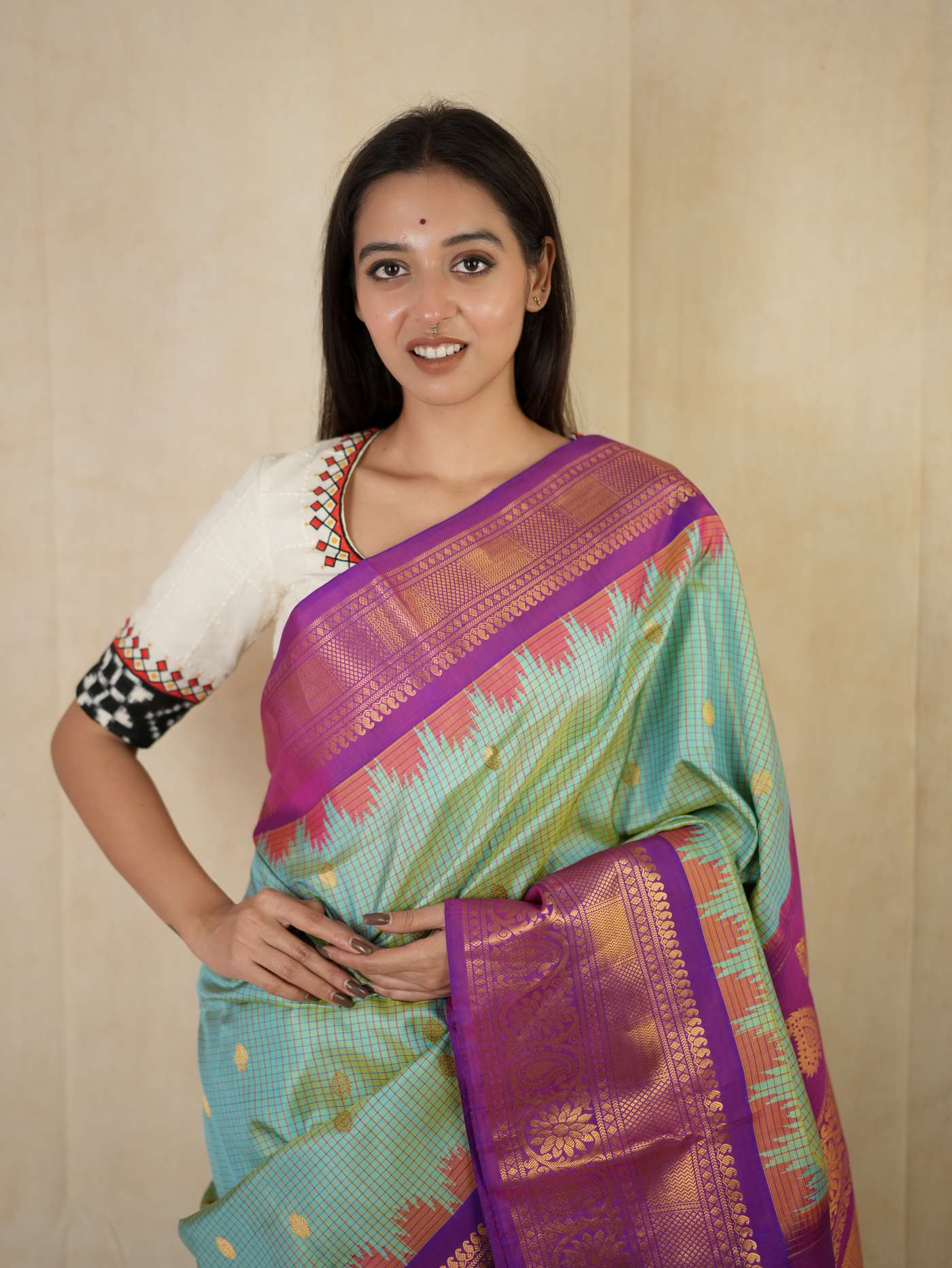 Indulge in the timeless beauty of sky blue-yellow dual tone silk Gadwal saree, a graceful blend of tradition and elegance. Handwoven with pure mulberry silk, it features delicate buttas all across the body,enhanced by a vibrant purple border. Perfect for weddings, festive occasions, and cultural celebrations.