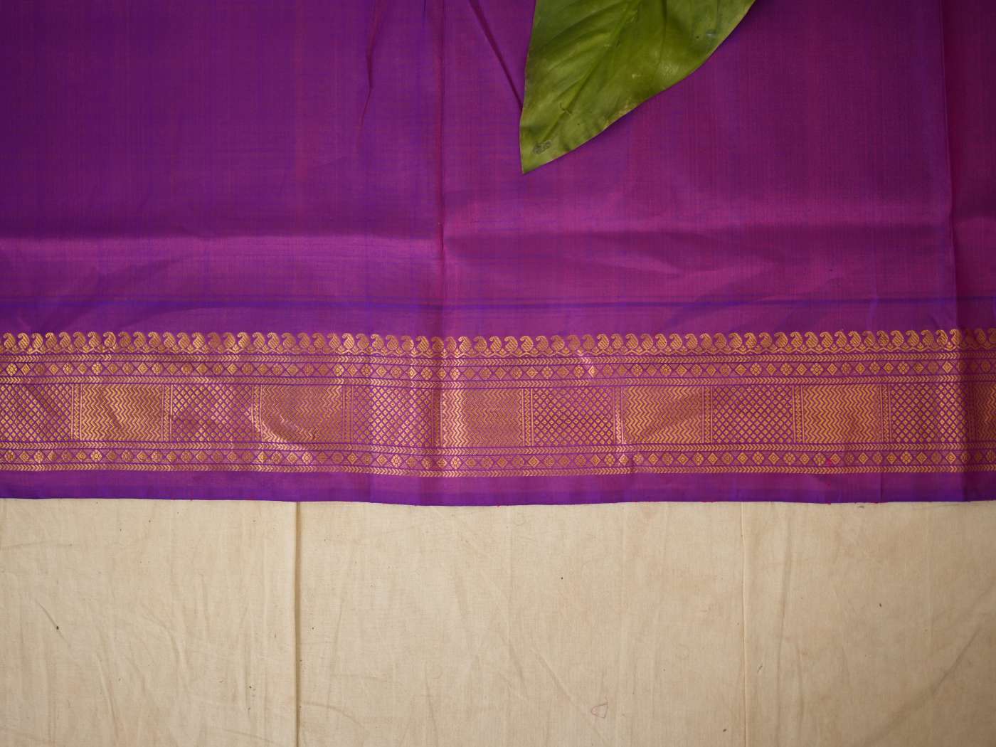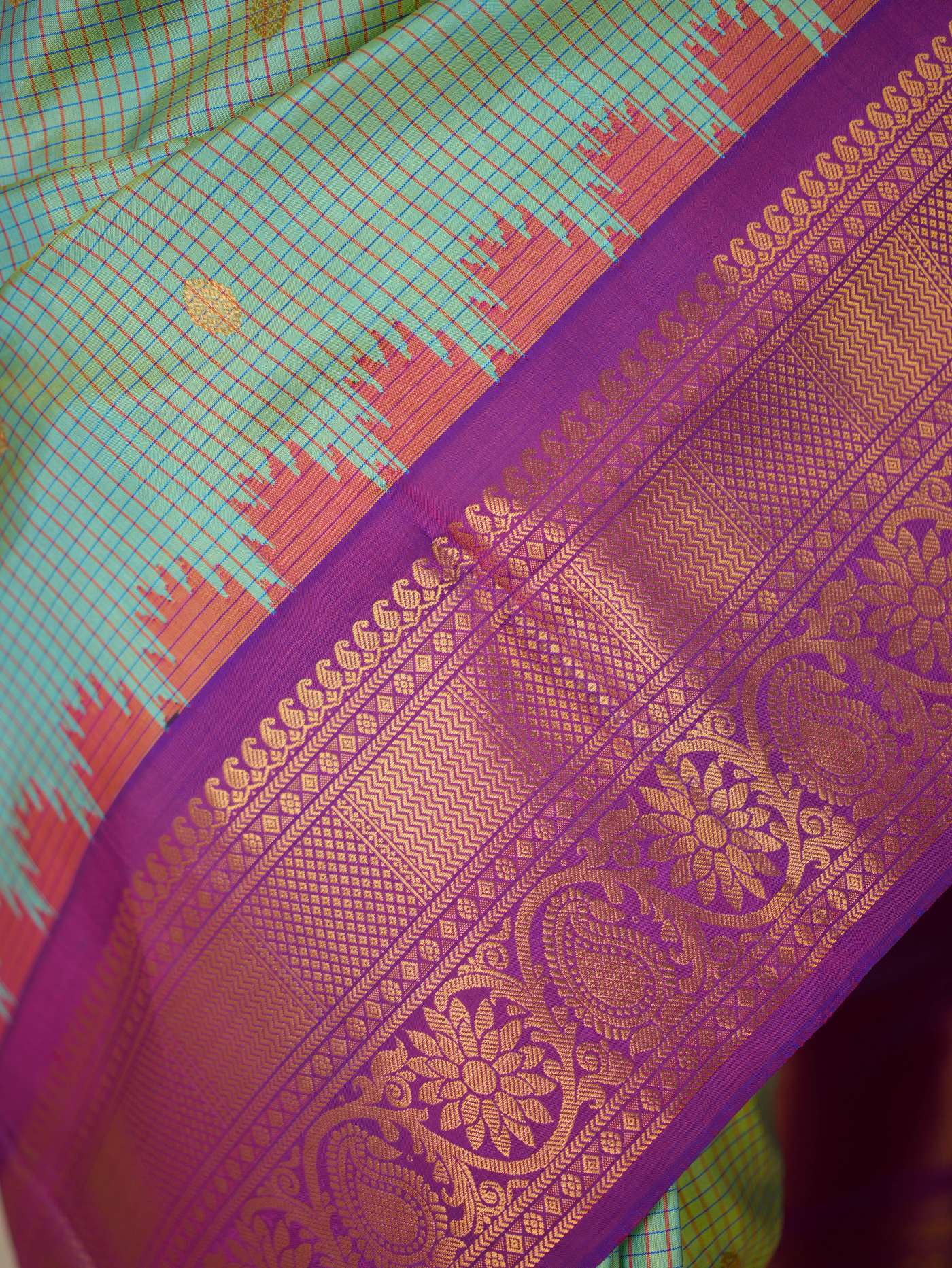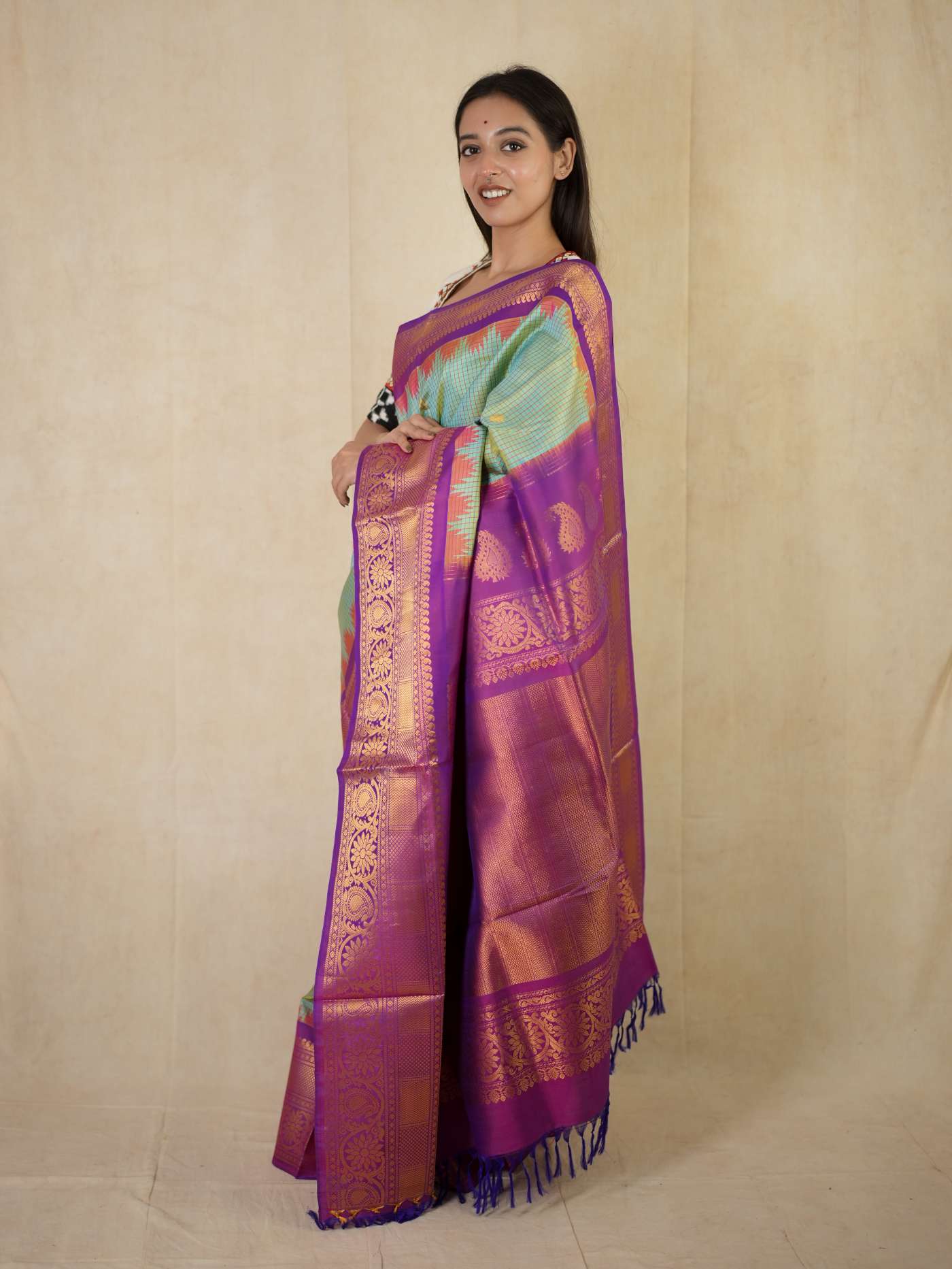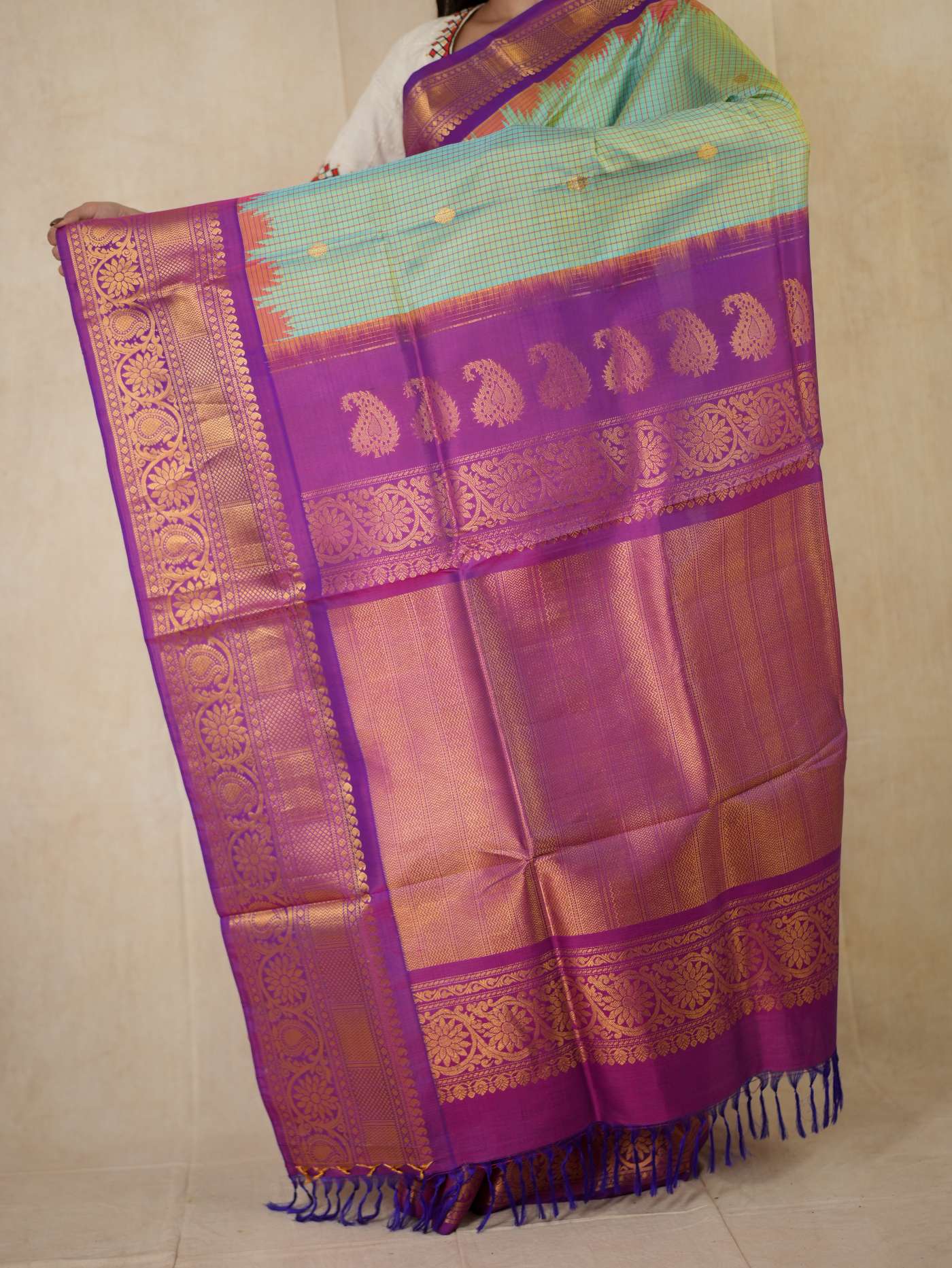 Indulge in the timeless beauty of sky blue-yellow dual tone silk Gadwal saree, a graceful blend of tradition and elegance. Handwoven with pure mulberry silk, it features delicate buttas all across the body,enhanced by a vibrant purple border. Perfect for weddings, festive occasions, and cultural celebrations.