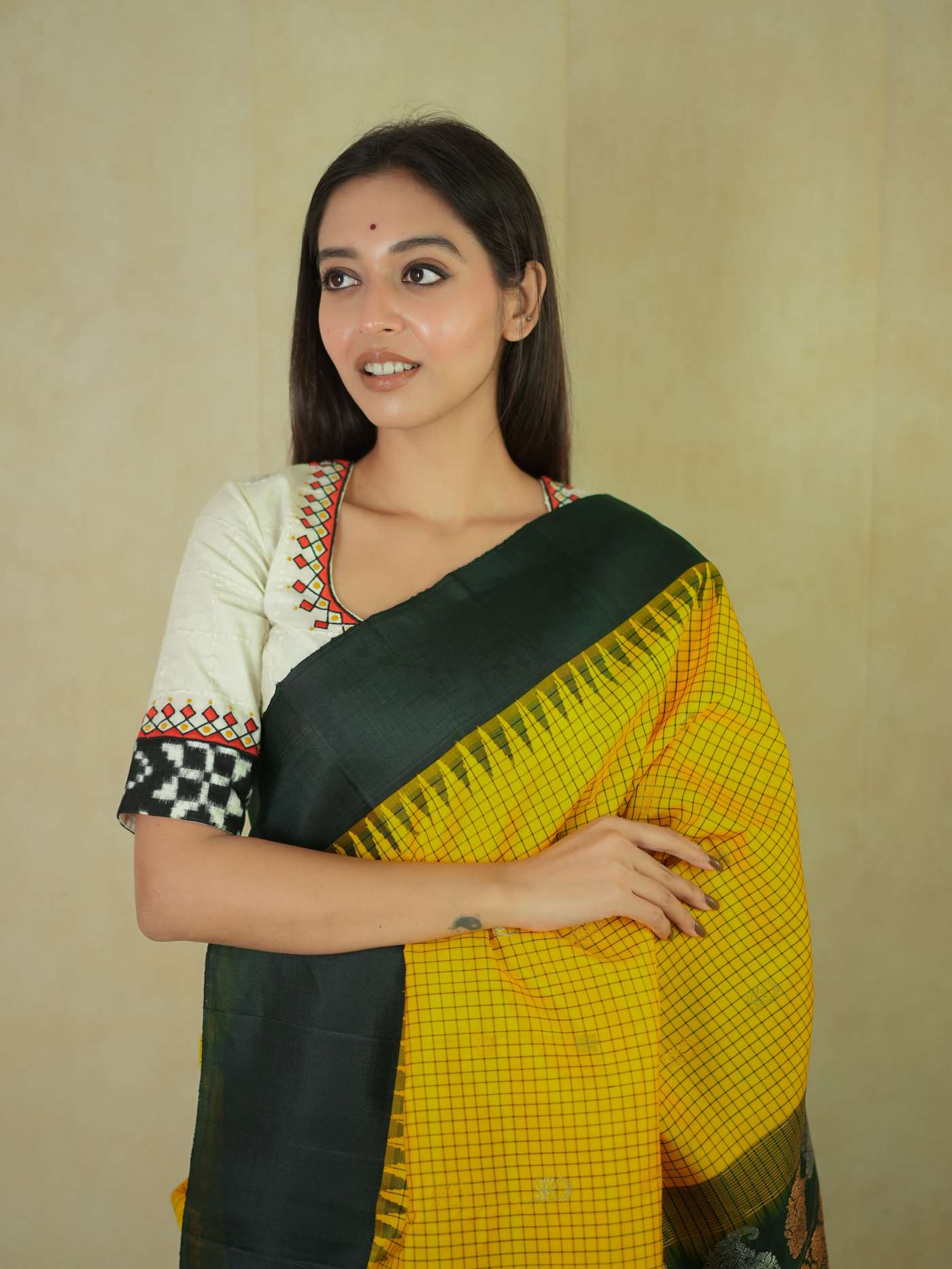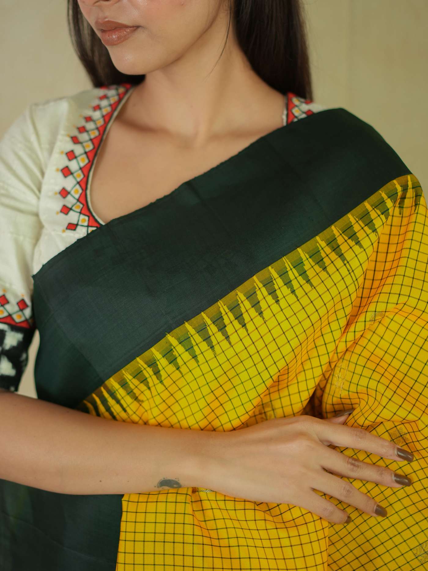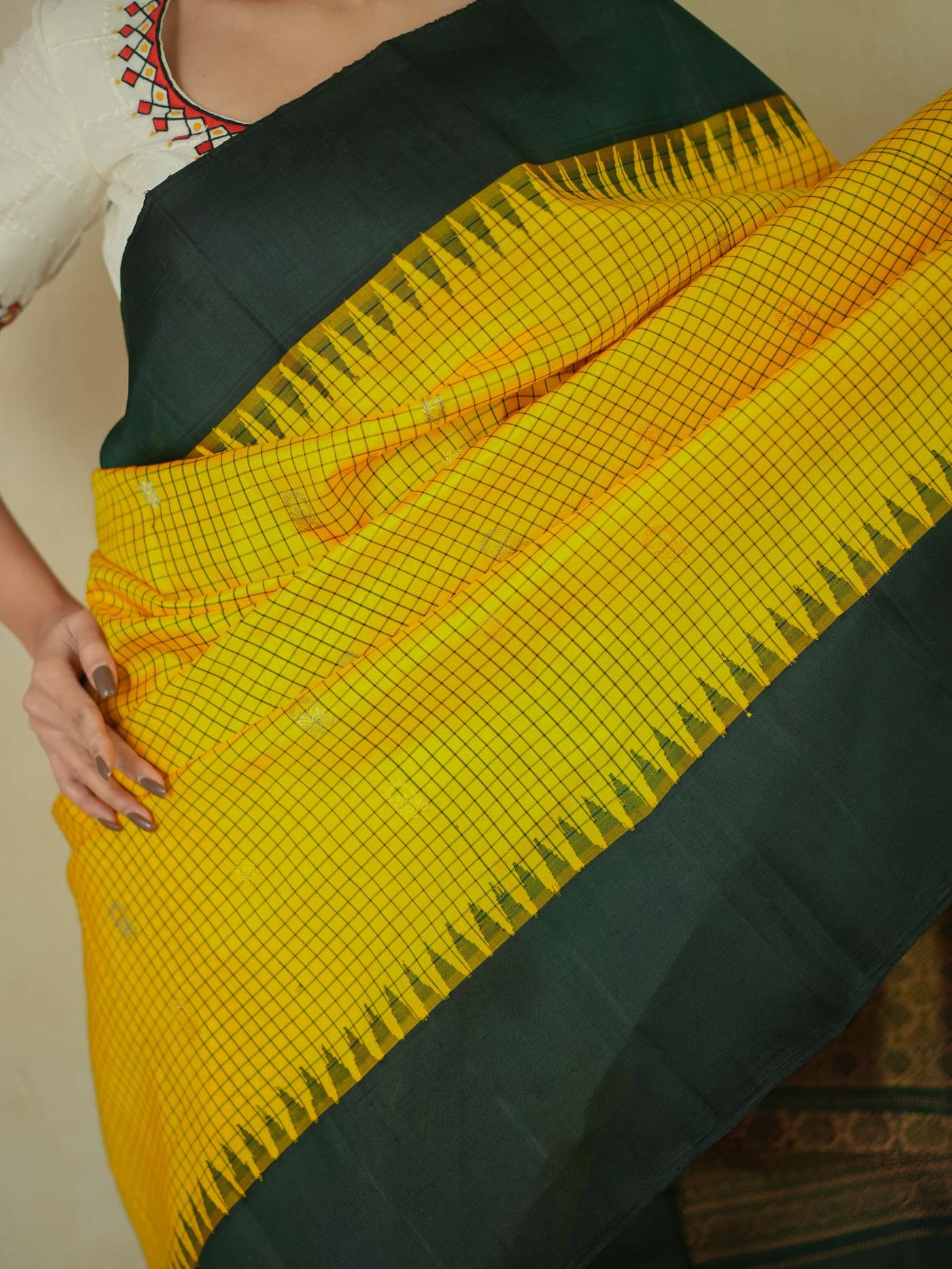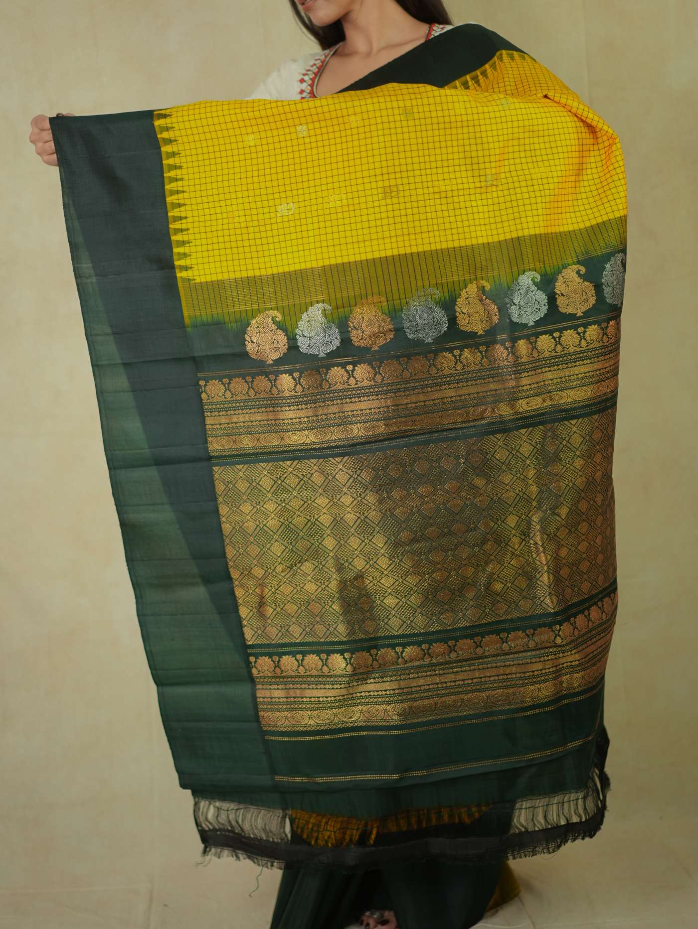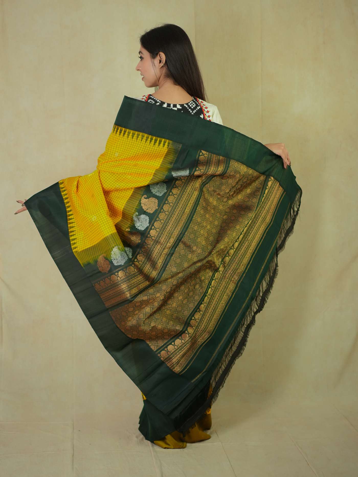 Indulge in the timeless beauty of this Yellow and Green Silk Gadwal Saree, a graceful blend of tradition and elegance. Handwoven pure mulberry silk, it features delicate golden and silver bota motifs on the yellow checked body. The saree is beautifully enhanced by a deep green border and pallu adorned with intricate golden zari work. Perfect for weddings, festive occasions, and cultural celebrations.