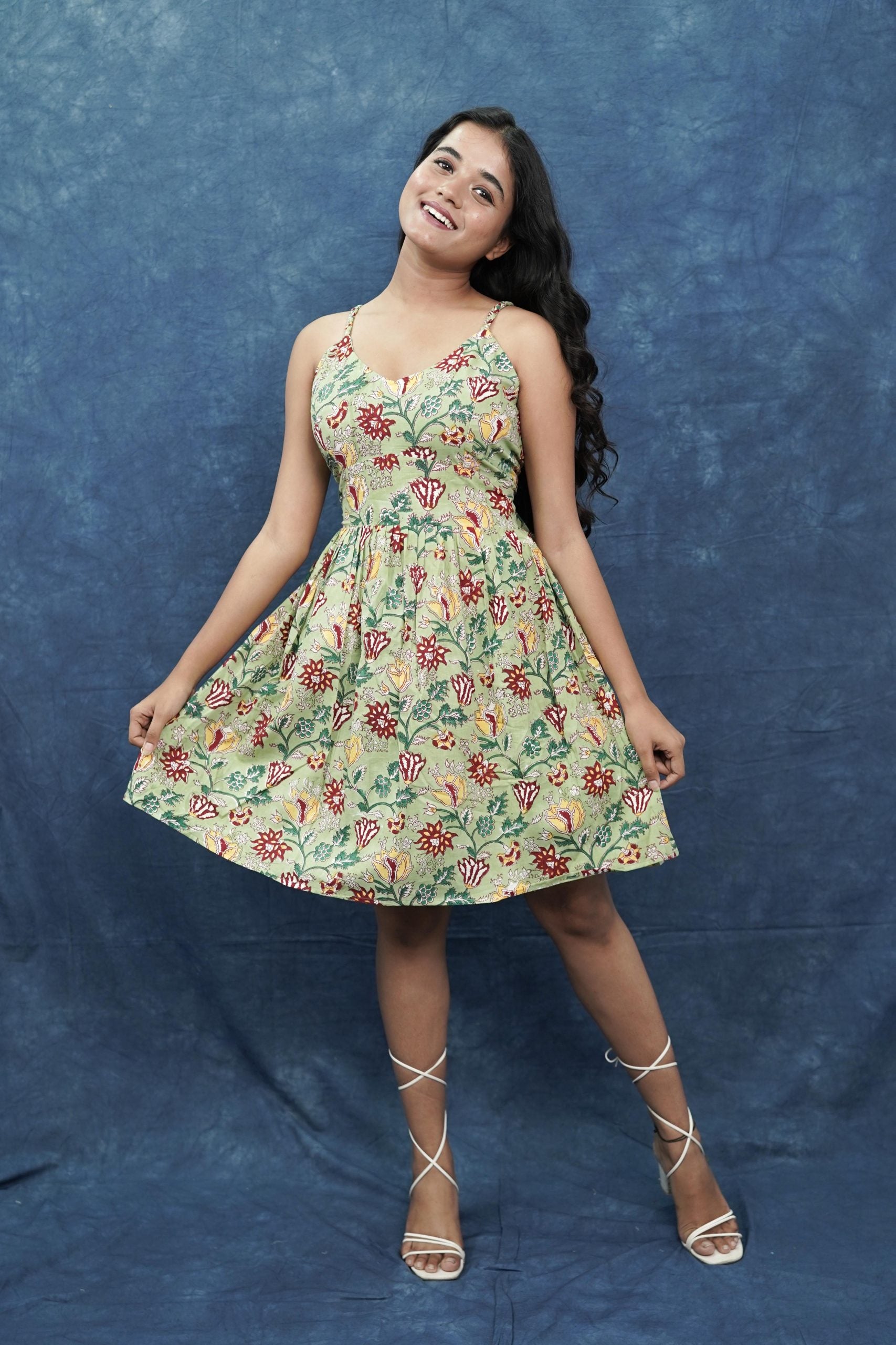 This tie-back dress, adorned with floral motifs, is crafted from Bagru hand-block printed pure cotton for a breezy, comfortable feel. Perfect for vacations yet versatile enough for casual outings, it features plaited strappy sleeves. Style it with minimalist sandals, dainty hoops, and effortless beach waves for a chic, laid-back look.