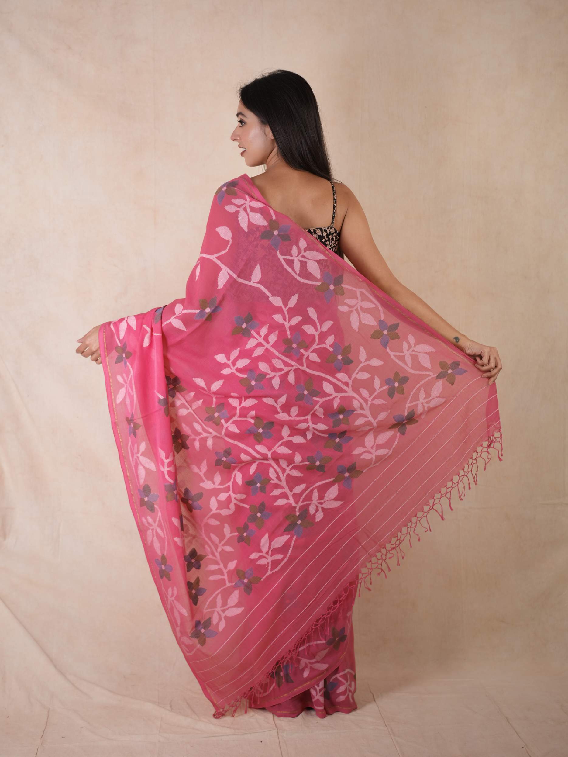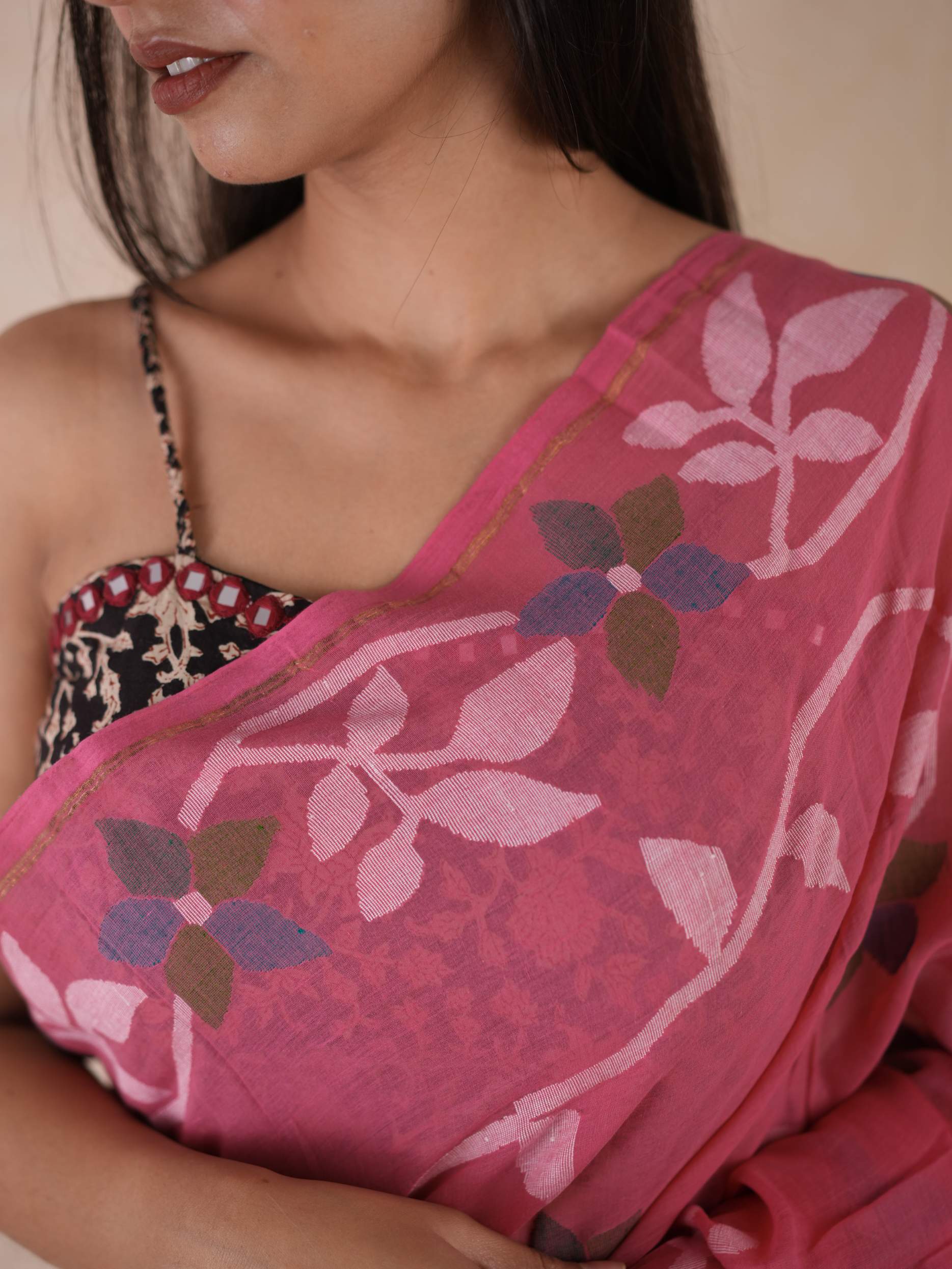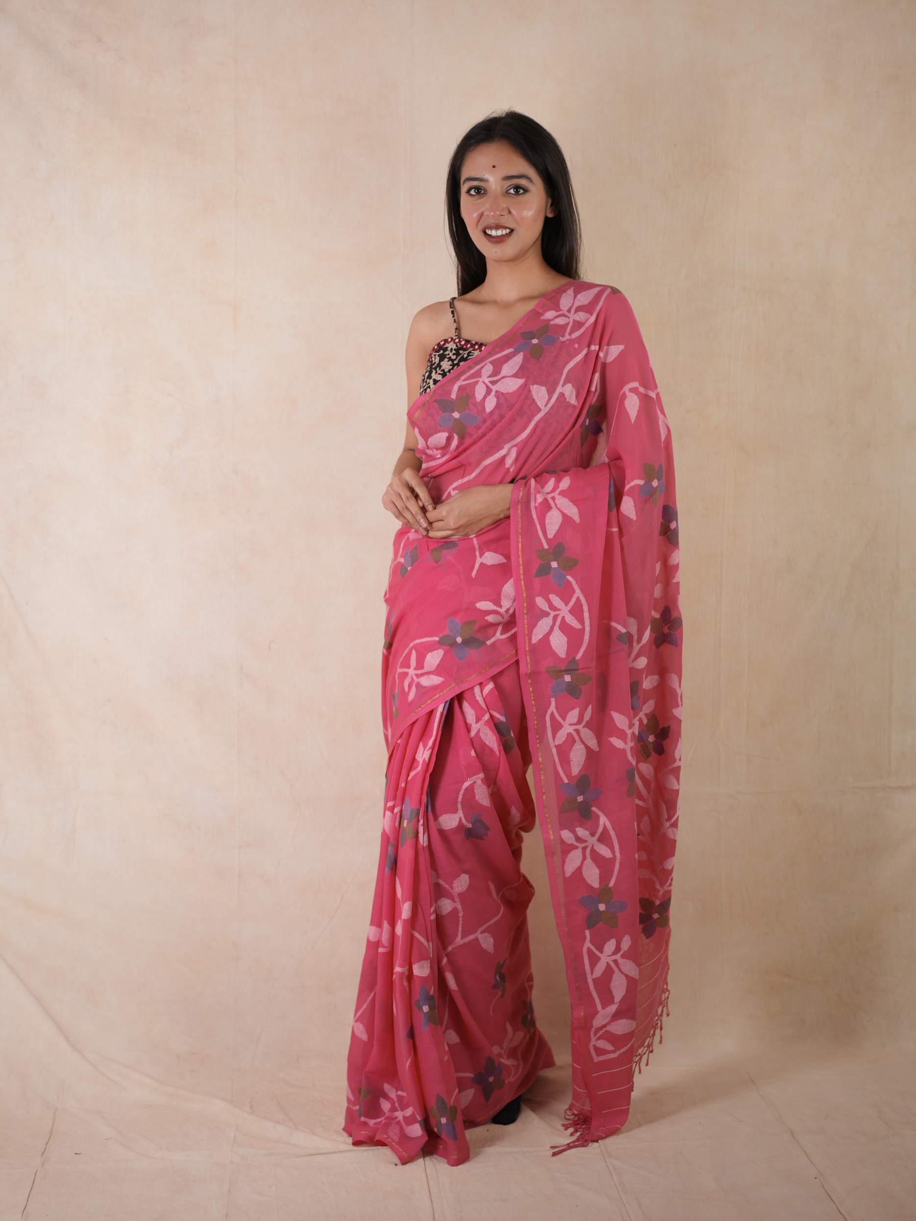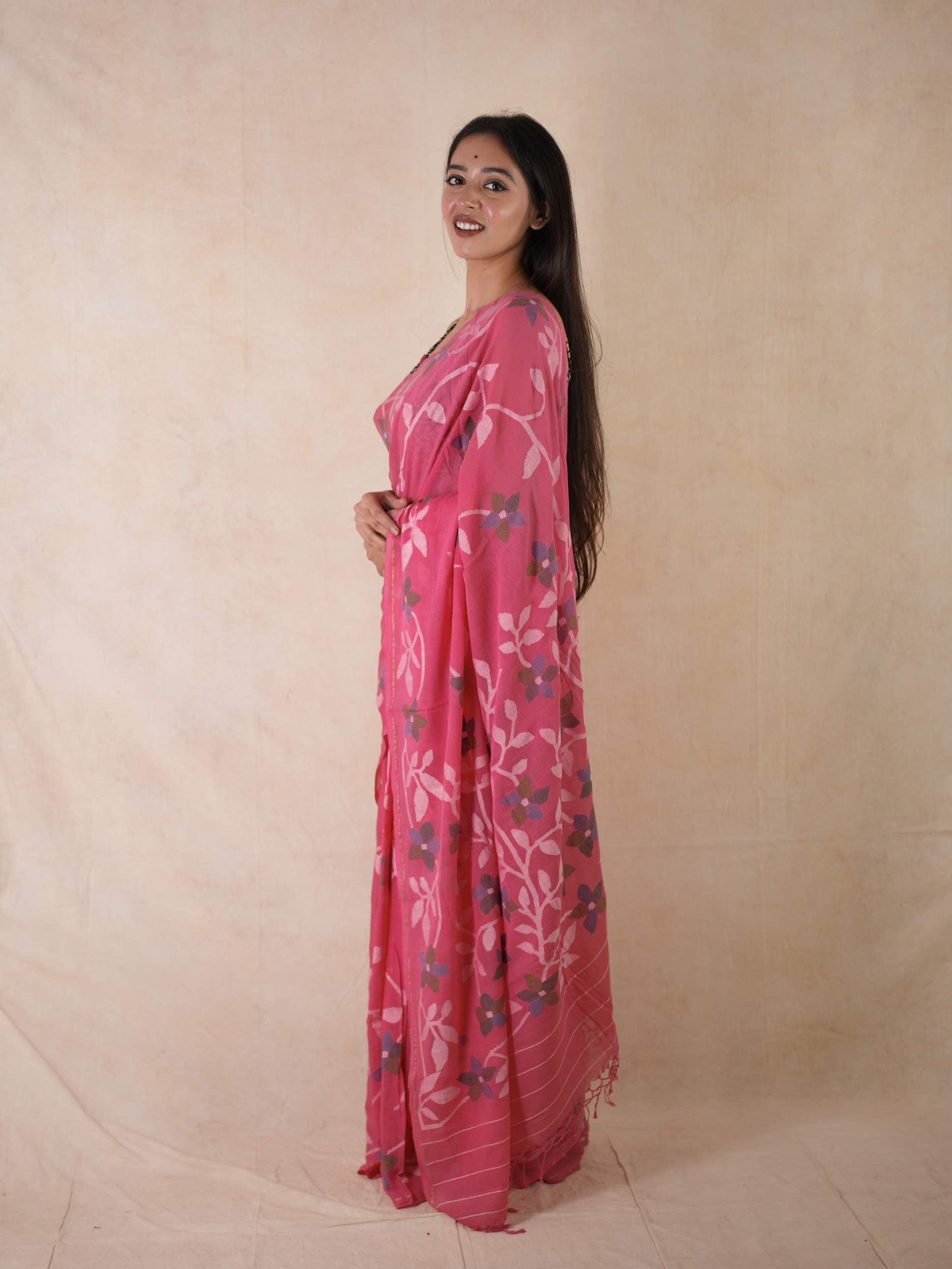 Embrace the pride of Bengal with our pink handwoven cotton Jamdani saree. Woven with care and adorned with intricate floral patterns, this saree is a true testament to Bengal’s rich weaving heritage. Soft, breathable, and gracefully elegant, it blends timeless craftsmanship with the region’s cultural pride. Perfect for cherished moments, from tranquil mornings to grand celebrations.