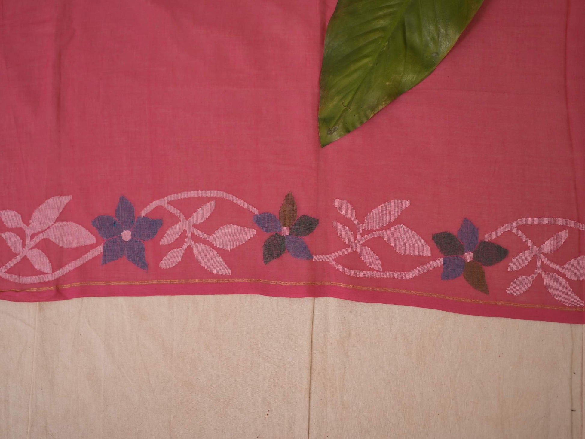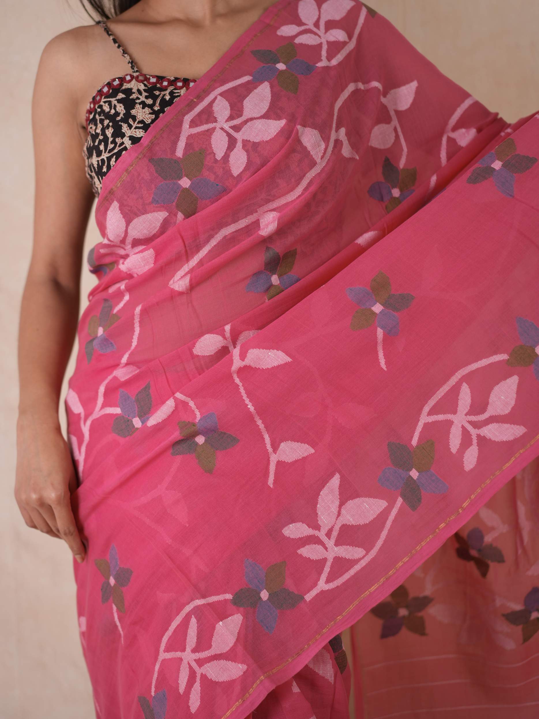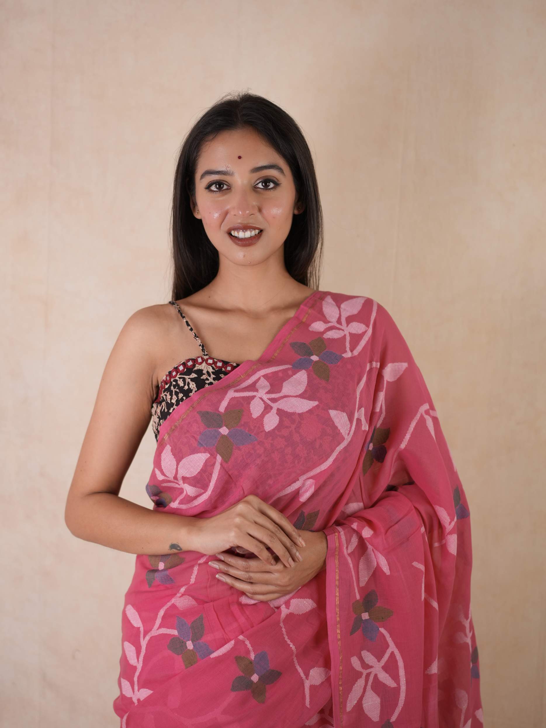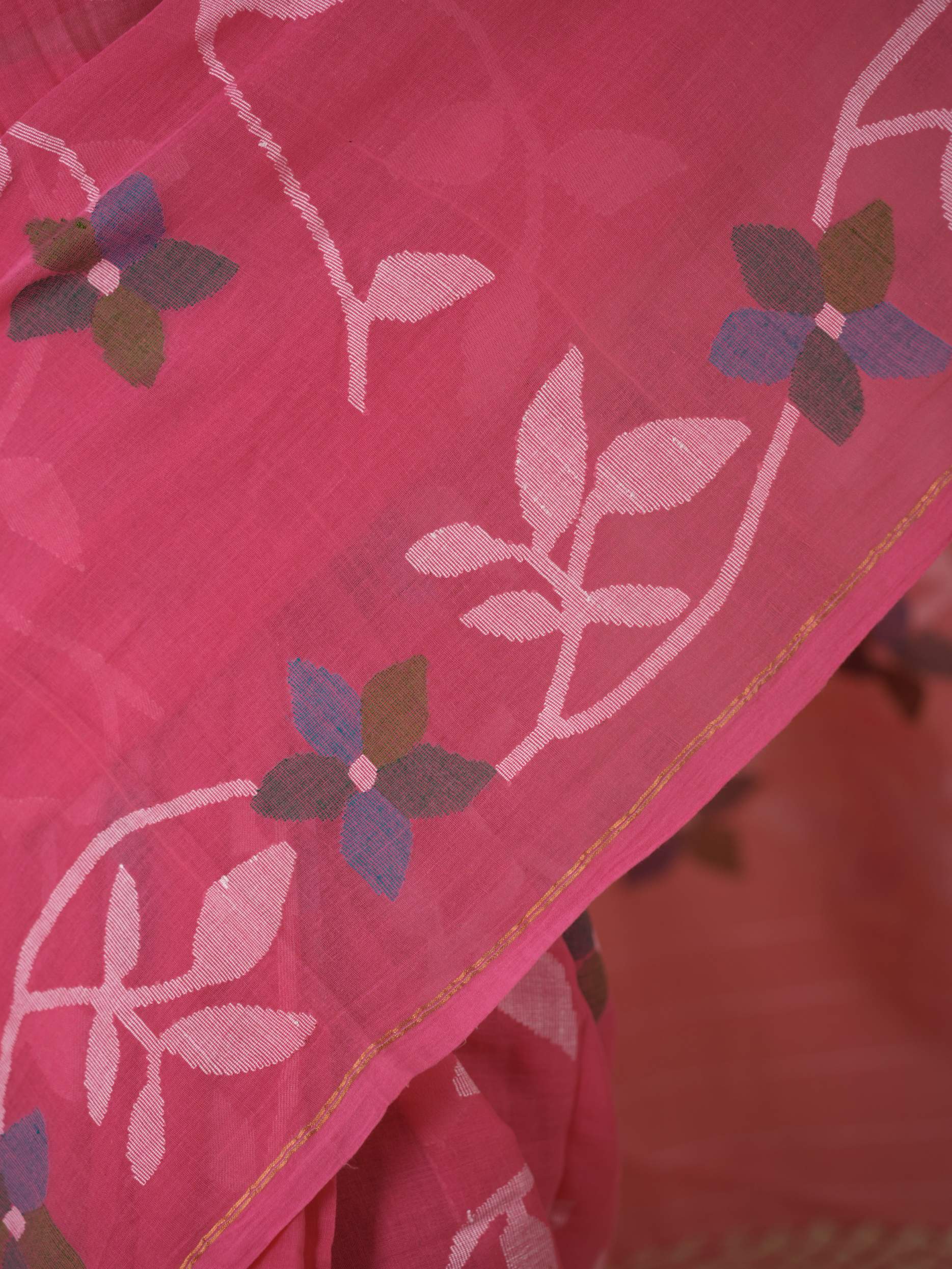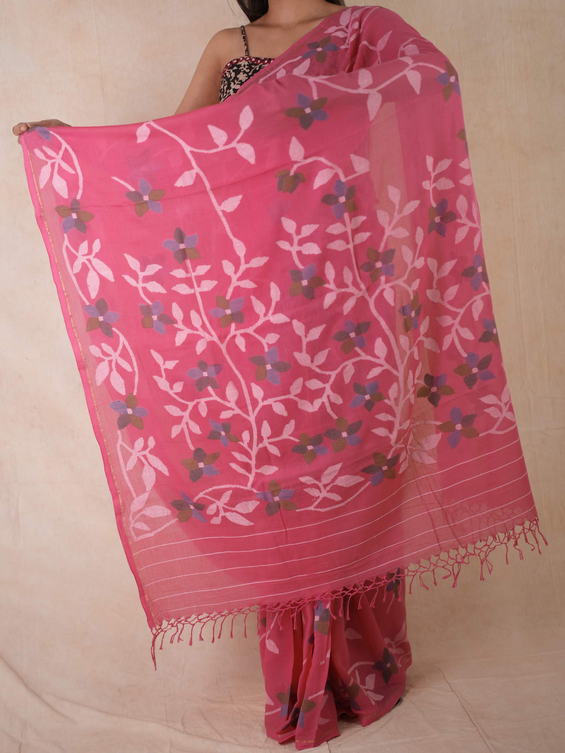Embrace the pride of Bengal with our pink handwoven cotton Jamdani saree. Woven with care and adorned with intricate floral patterns, this saree is a true testament to Bengal’s rich weaving heritage. Soft, breathable, and gracefully elegant, it blends timeless craftsmanship with the region’s cultural pride. Perfect for cherished moments, from tranquil mornings to grand celebrations.