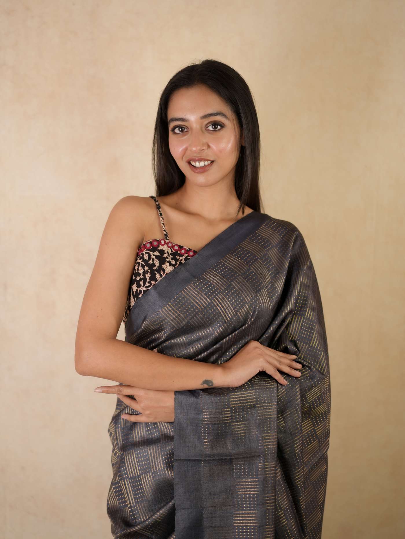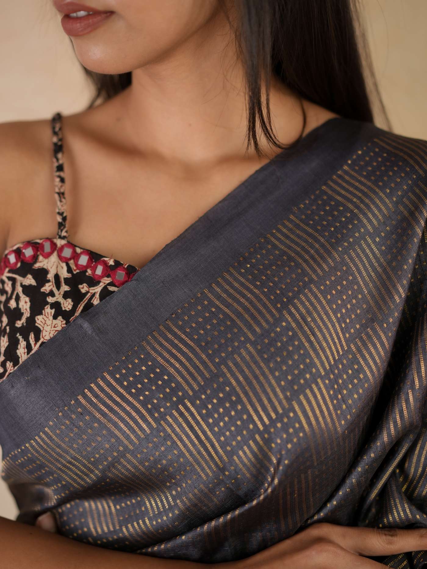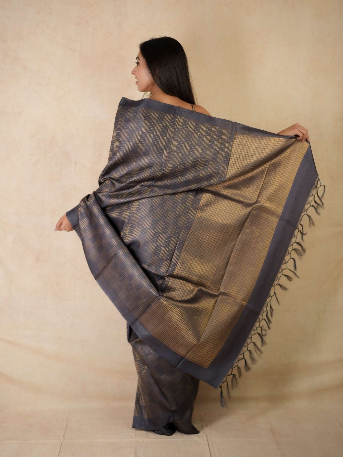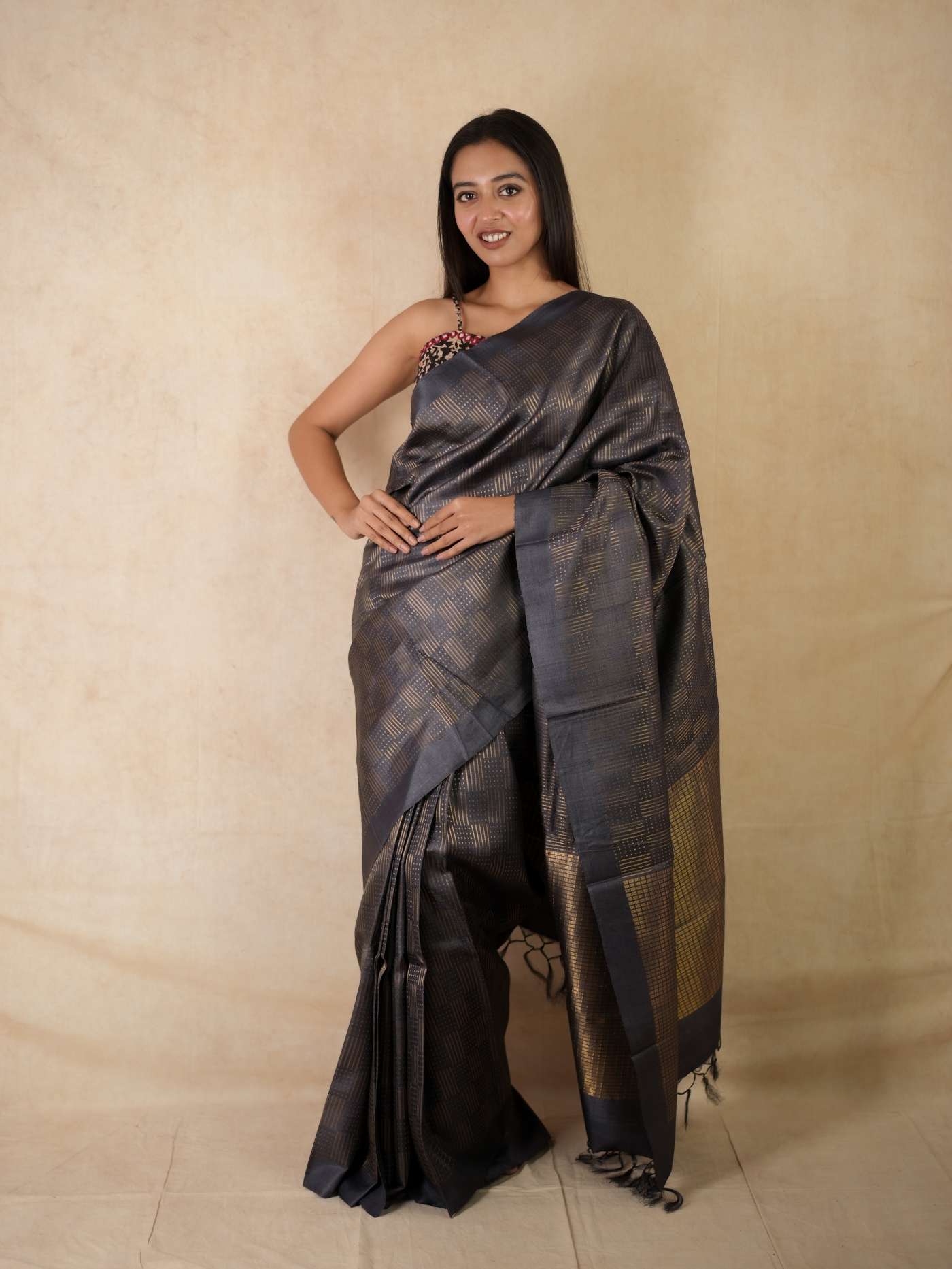 Immerse yourself in the regal charm of our dark grey handwoven Kosa silk saree from Chhattisgarh, adorned with a shimmering golden zari work across the body. Renowned for its natural sheen and refined elegance, this saree is a true reflection of Chhattisgarh’s rich weaving heritage. Perfect for special occasions, it embodies timeless sophistication and the unmatched artistry of traditional craftsmanship.
