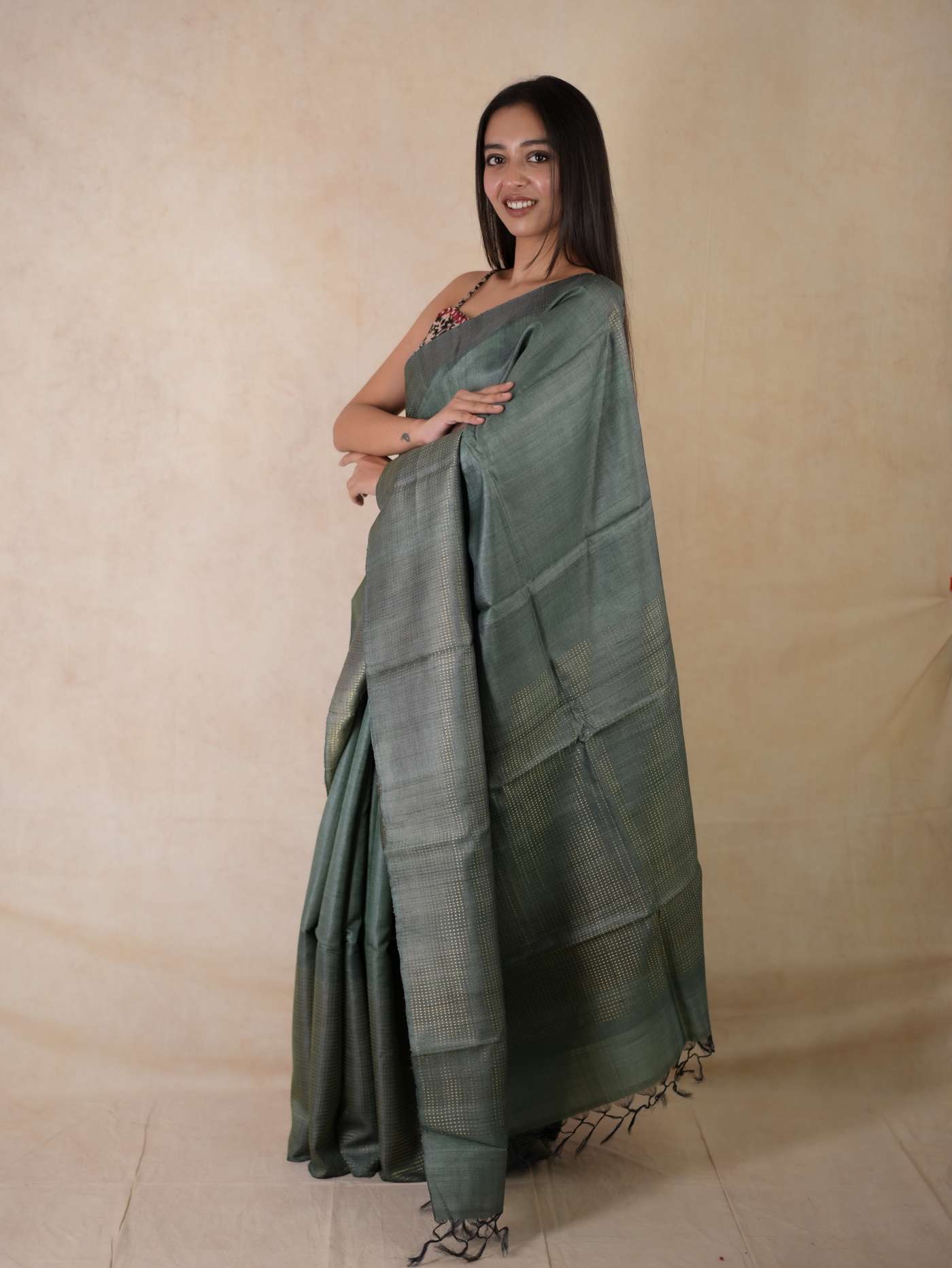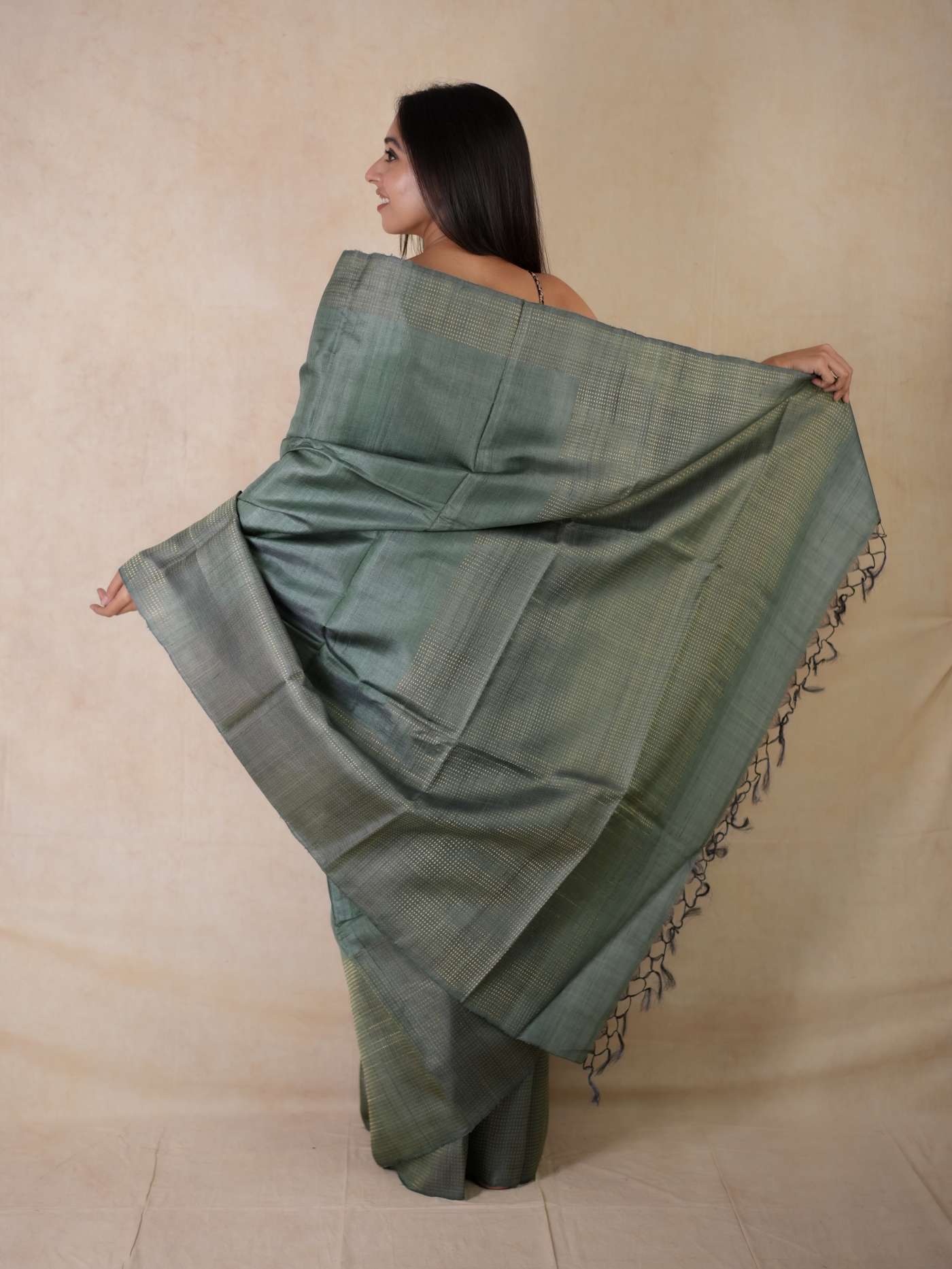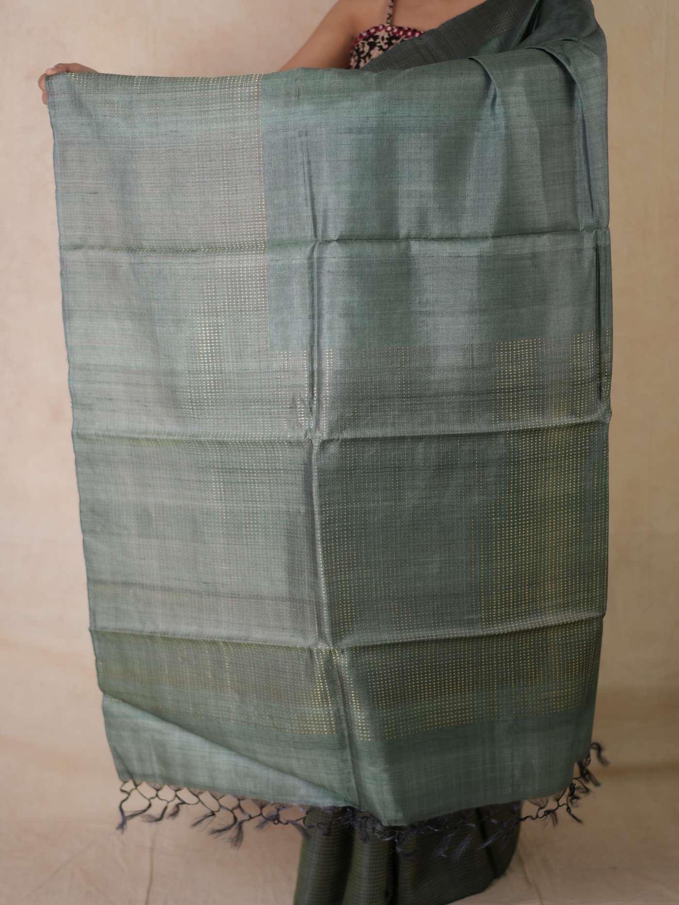 Immerse yourself in the regal charm of our grey-green dual tone handwoven Kosa silk saree from Chhattisgarh, adorned with a shimmering golden zari work across the body. Renowned for its natural sheen and refined elegance, this saree is a true reflection of Chhattisgarh’s rich weaving heritage. Perfect for special occasions, it embodies timeless sophistication and the unmatched artistry of traditional craftsmanship.