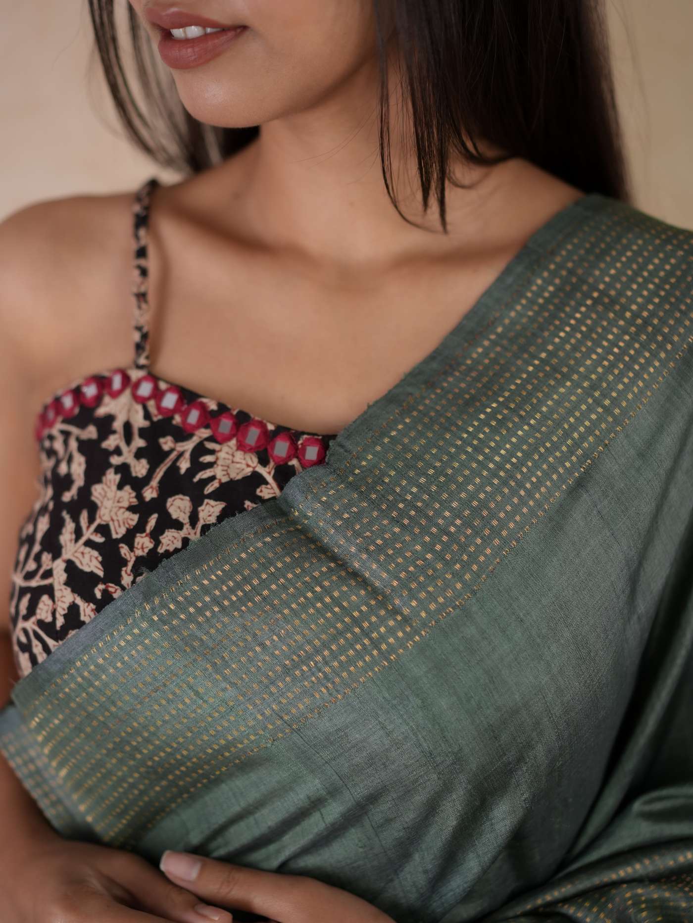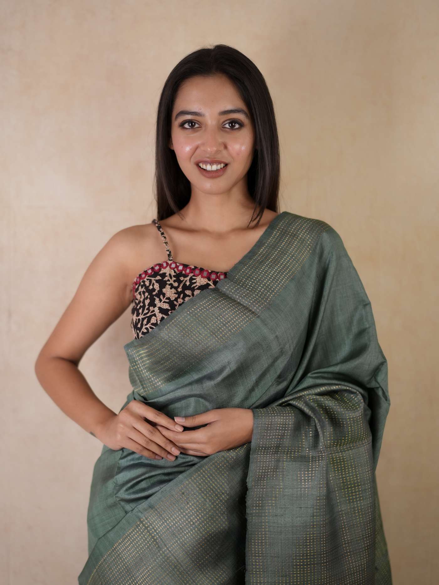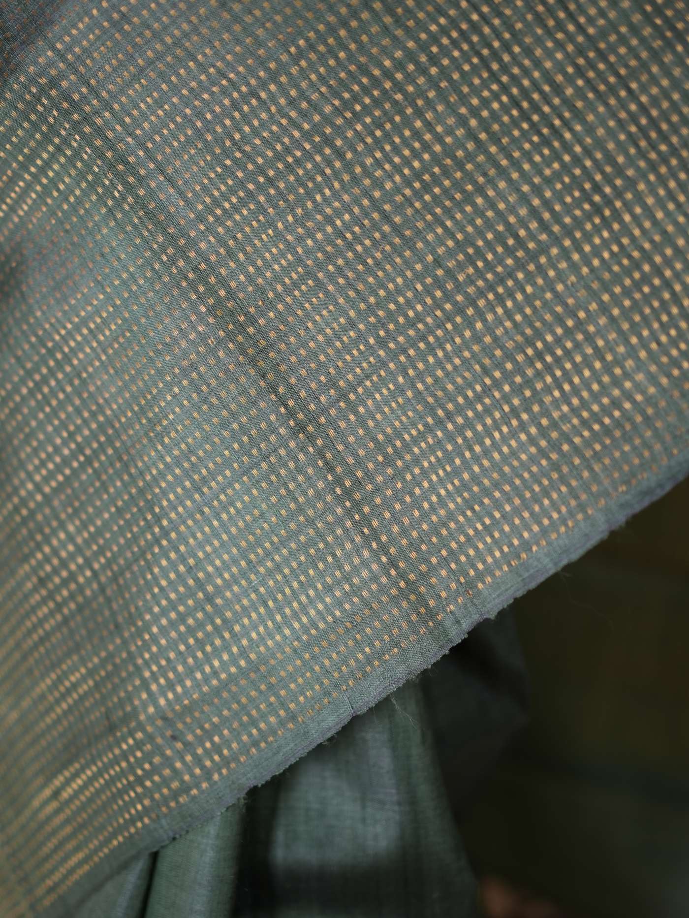 Immerse yourself in the regal charm of our grey-green dual tone handwoven Kosa silk saree from Chhattisgarh, adorned with a shimmering golden zari work across the body. Renowned for its natural sheen and refined elegance, this saree is a true reflection of Chhattisgarh’s rich weaving heritage. Perfect for special occasions, it embodies timeless sophistication and the unmatched artistry of traditional craftsmanship.