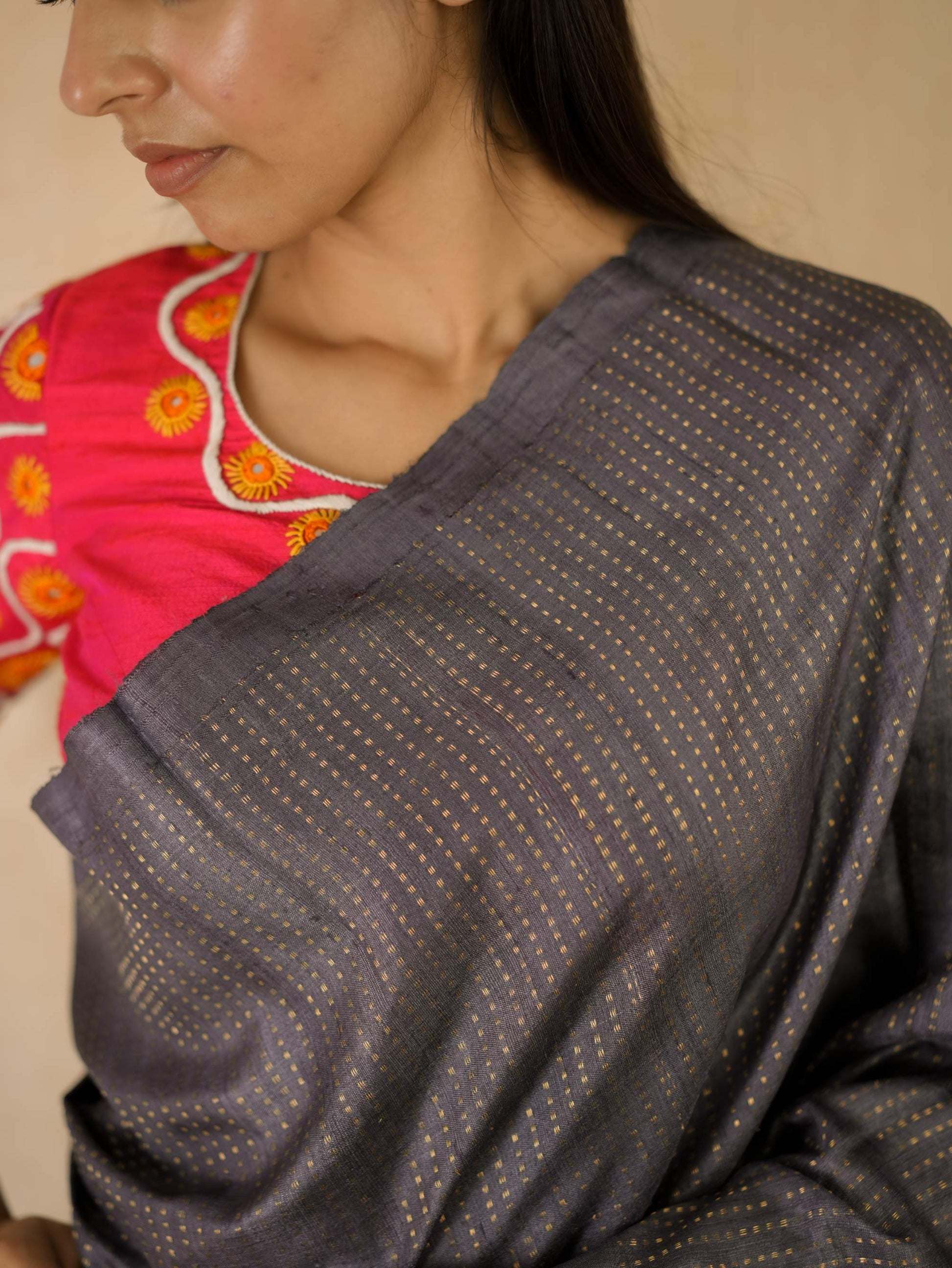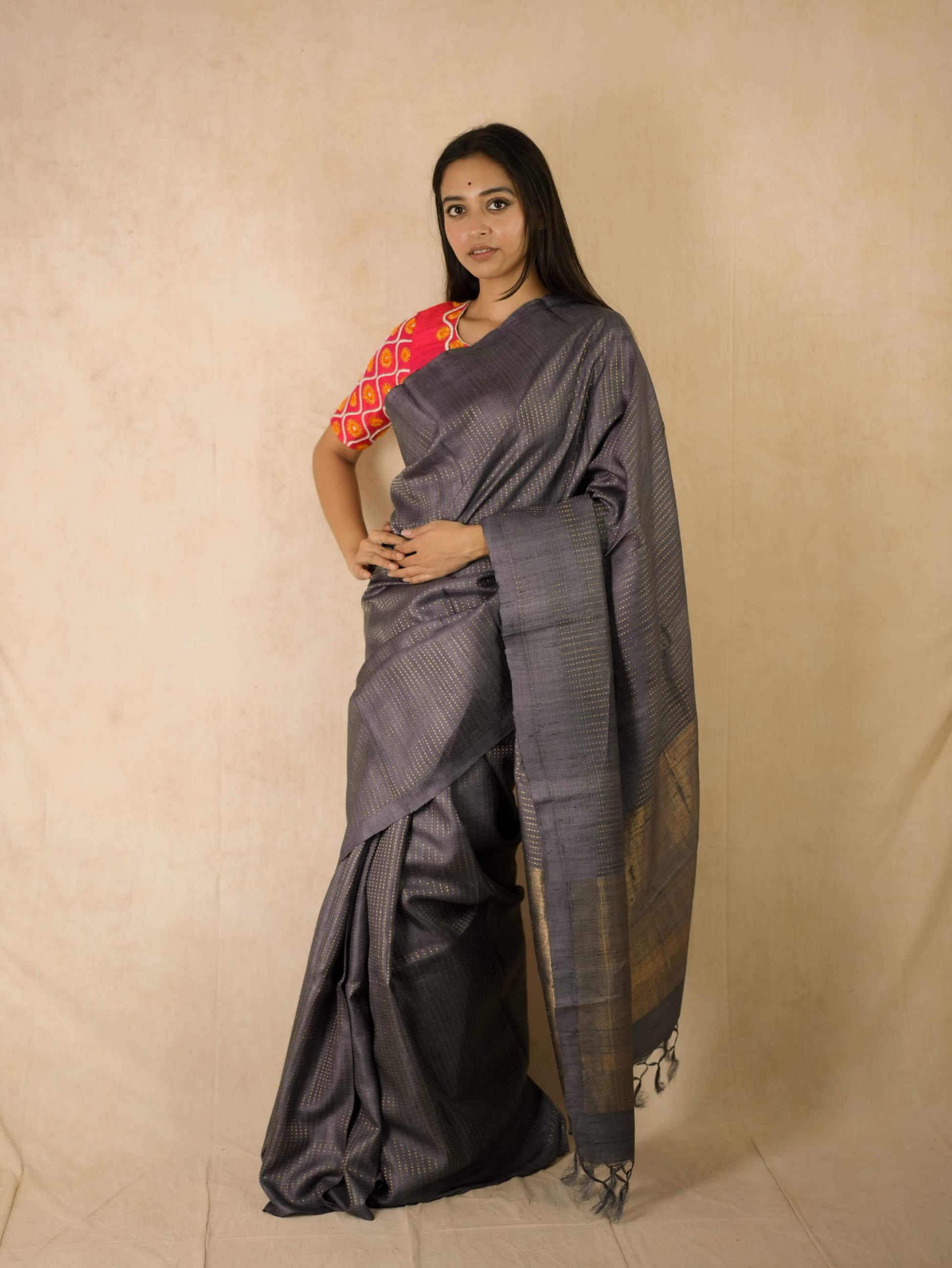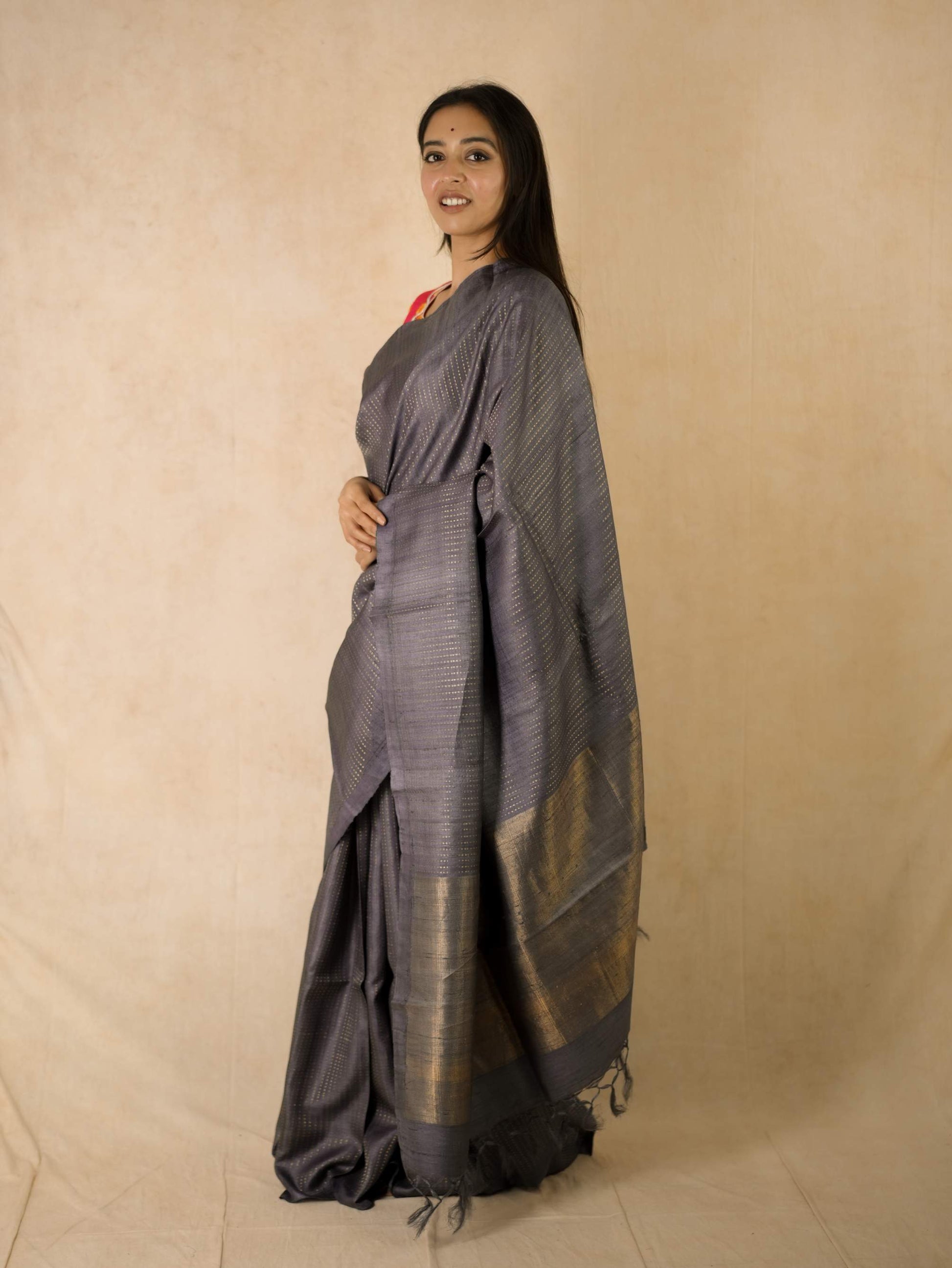 Immerse yourself in the regal charm of our olive grey handwoven Kosa Silk saree from Chhattisgarh, adorned with a shimmering golden zari work across the body. Renowned for its natural sheen and refined elegance, this saree is a true reflection of Chhattisgarh’s rich weaving heritage. Perfect for special occasions, it embodies timeless sophistication and the unmatched artistry of traditional craftsmanship.