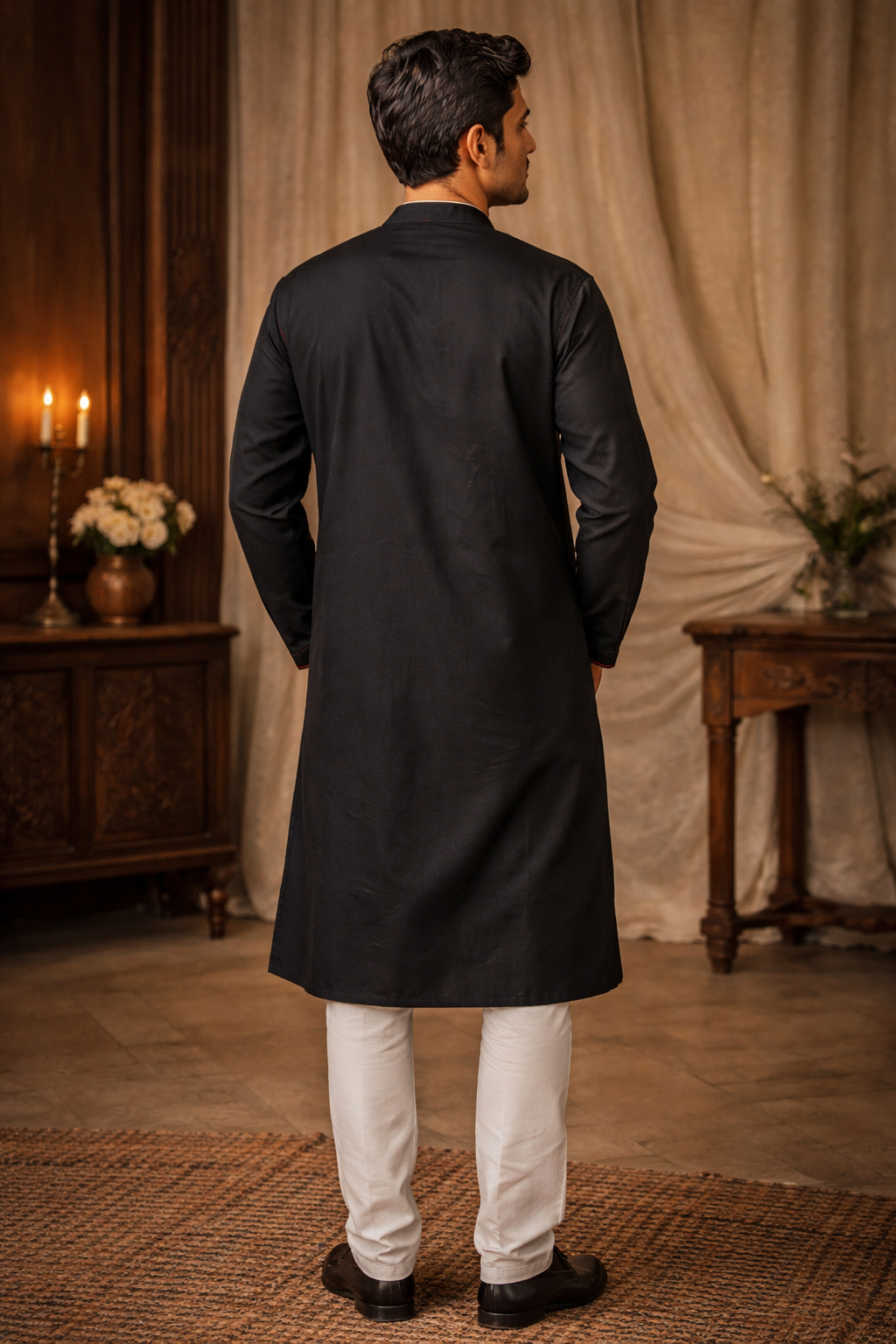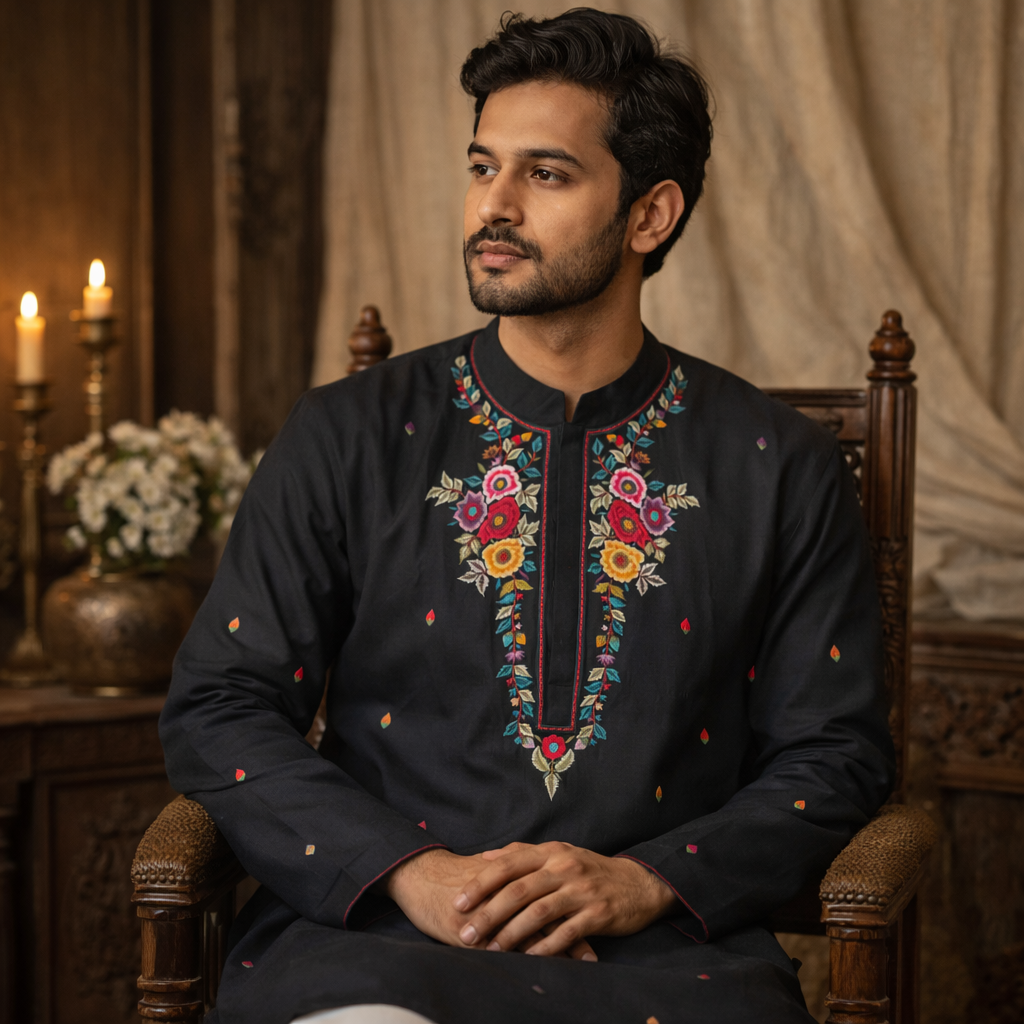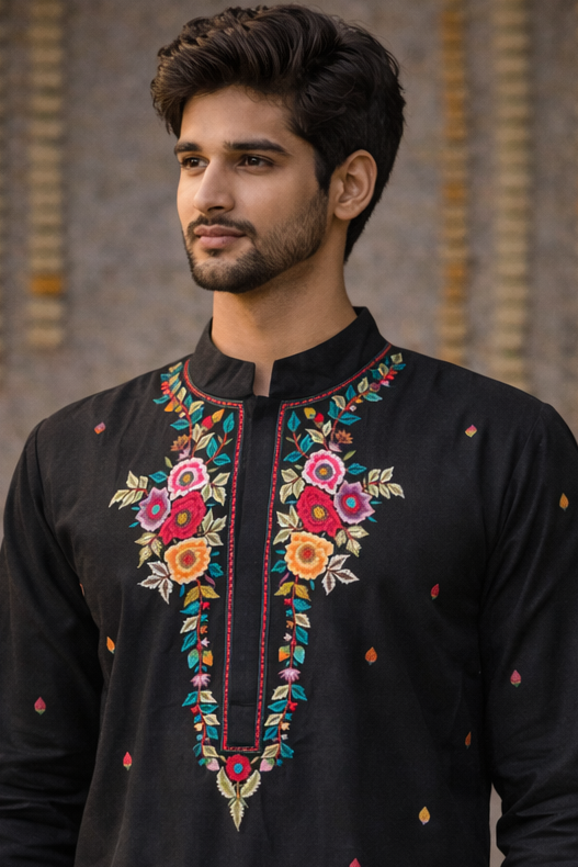 Step up your ethnic style with this classic black silk blend kurta for men. The rich dark base is beautifully highlighted with vibrant multicolour floral embroidery along the neckline and placket, adding bold festive charm. Pair it with churidar or straight pants and classic mojaris for a polished, elegant look.