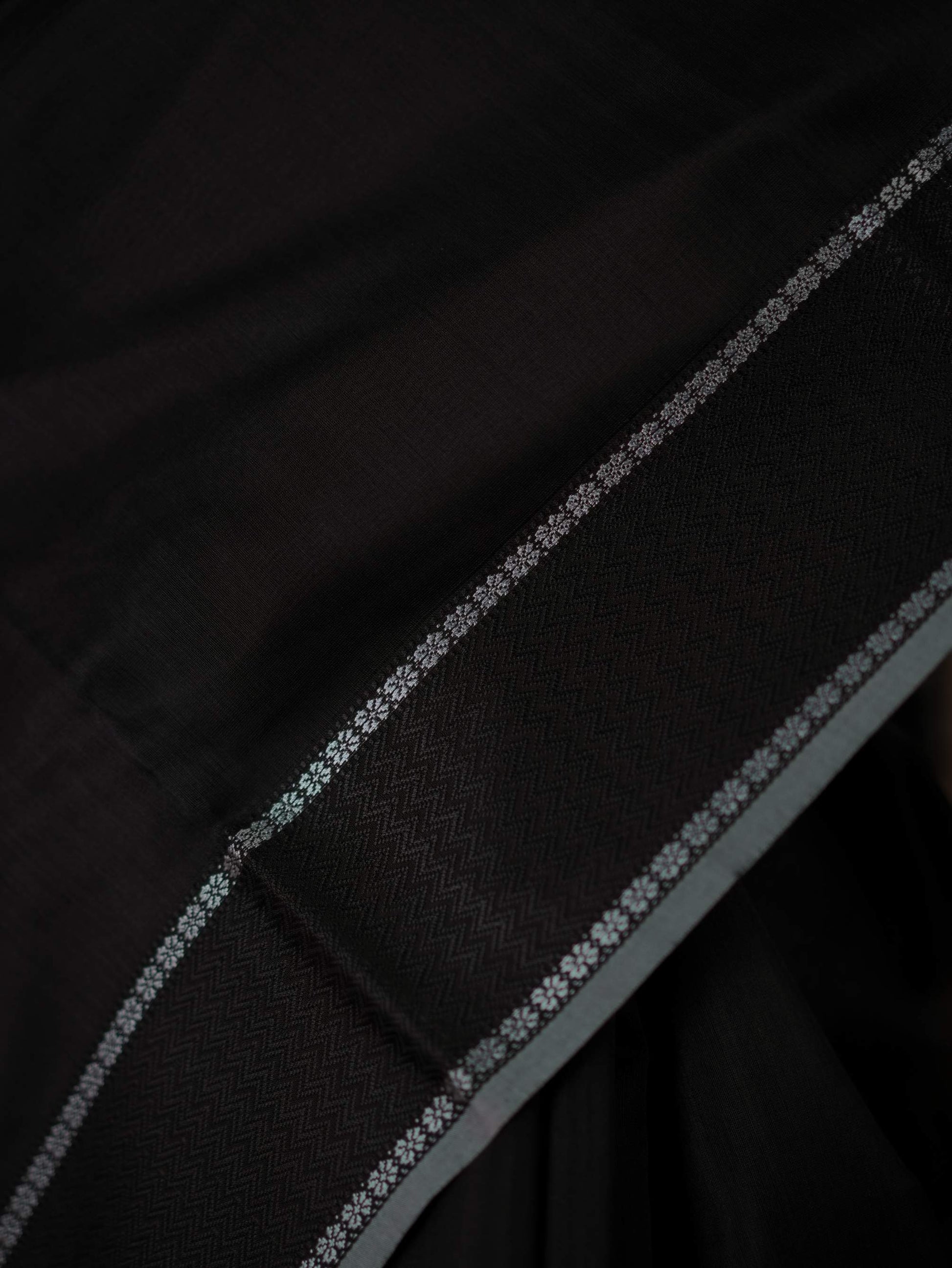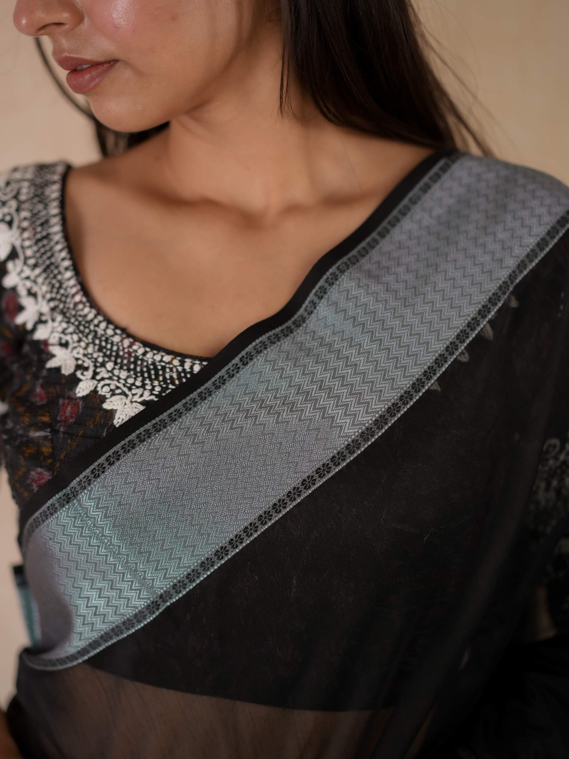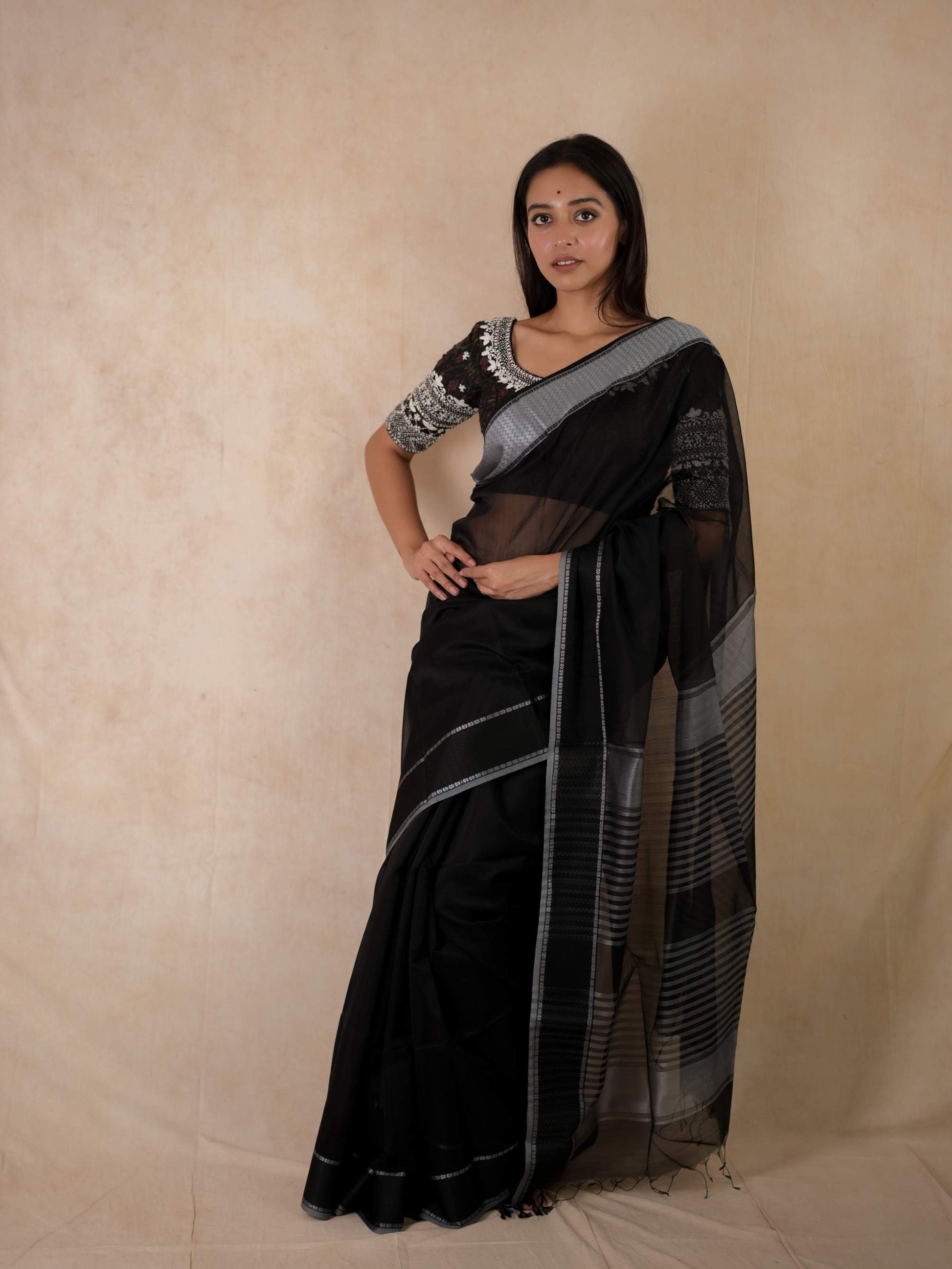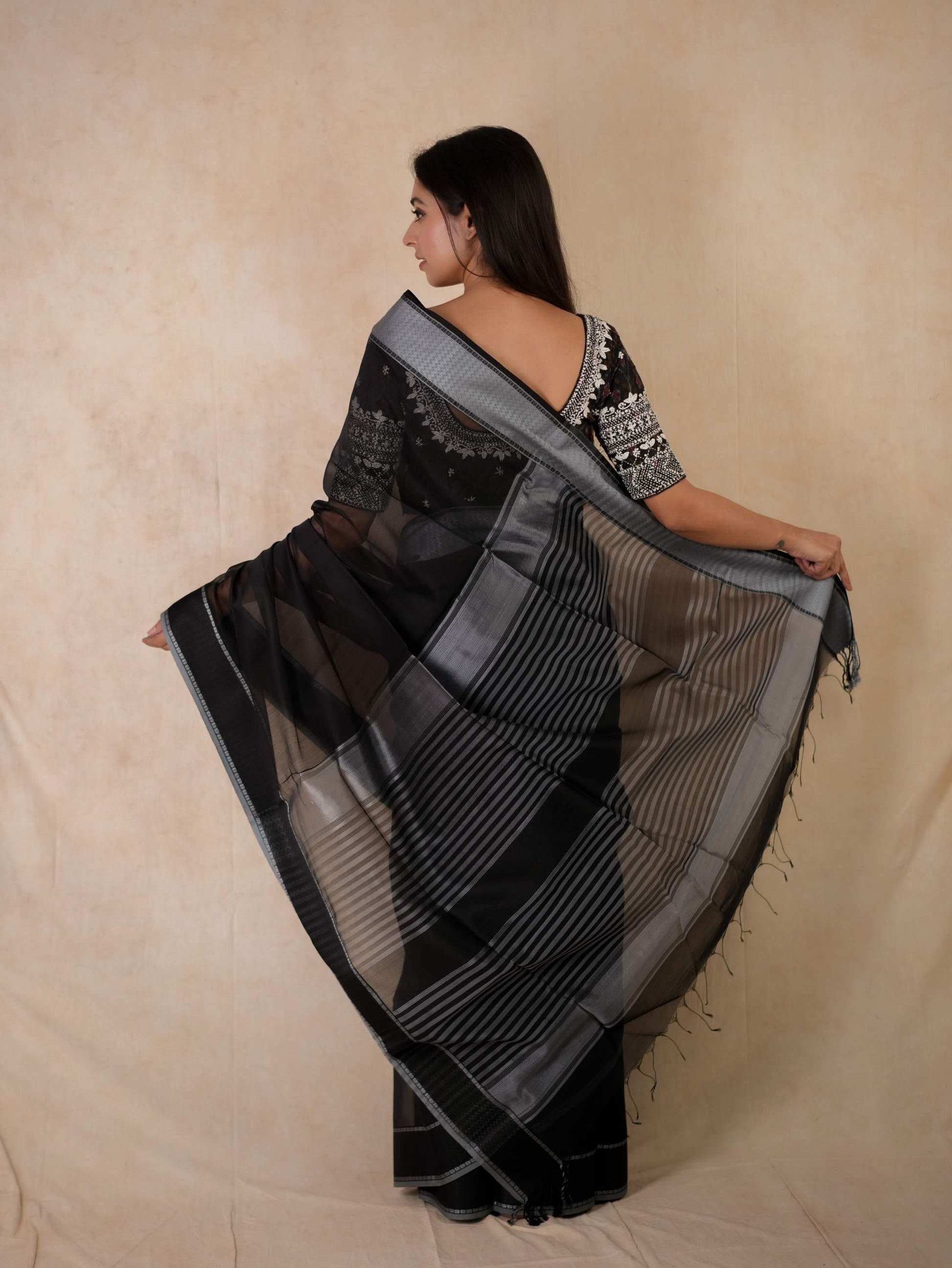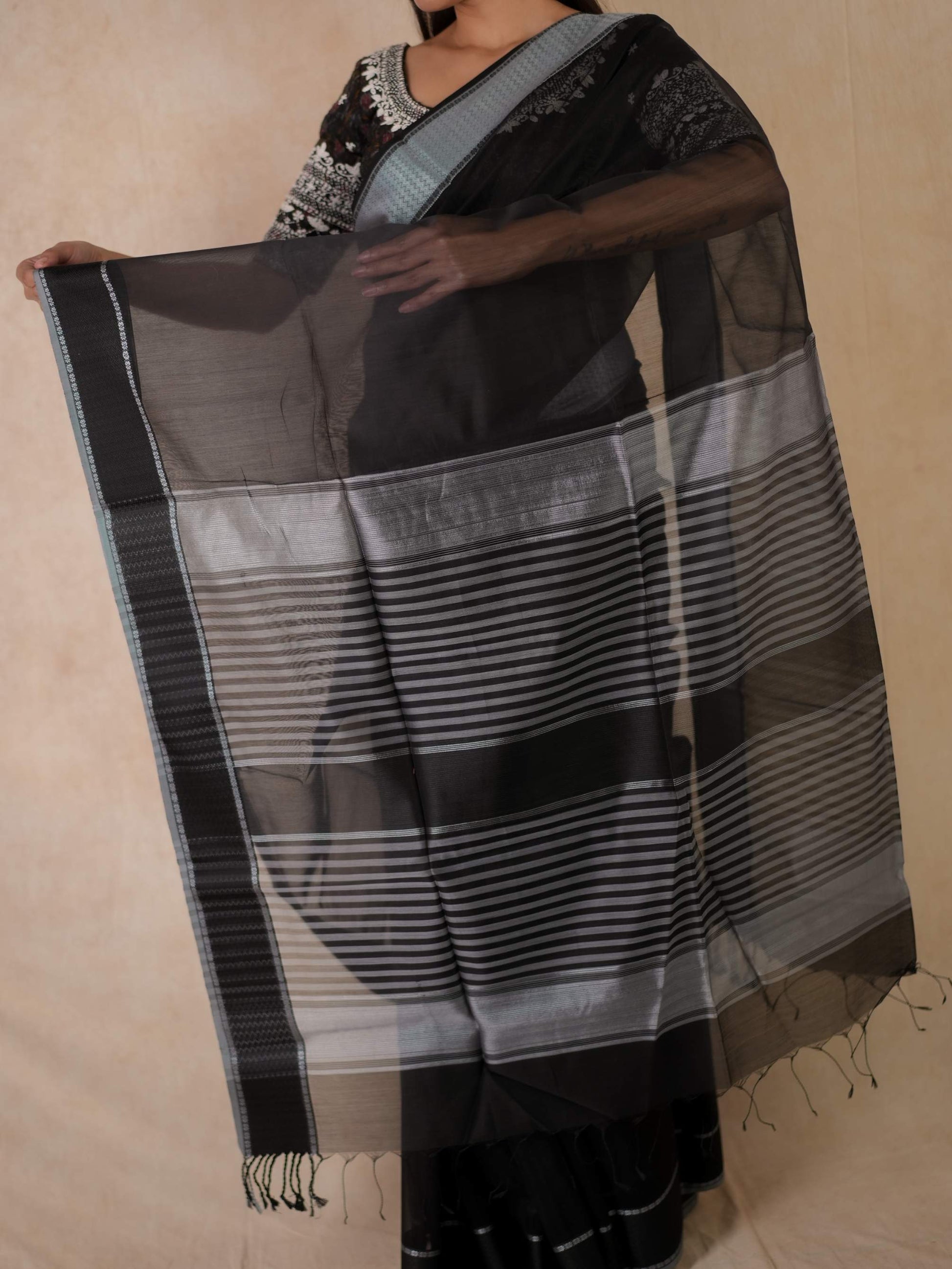 Elevate your ethnic wardrobe with our vibrant black Maheshwari sico saree, featuring a classic Narmada border in black thread , and a striking stripped palla in contrasting grey colour. The contrasting grey colour selvedge gives a unique edge to the very look of the saree. This saree blends traditional artistry with modern elegance, perfect for any special occasion