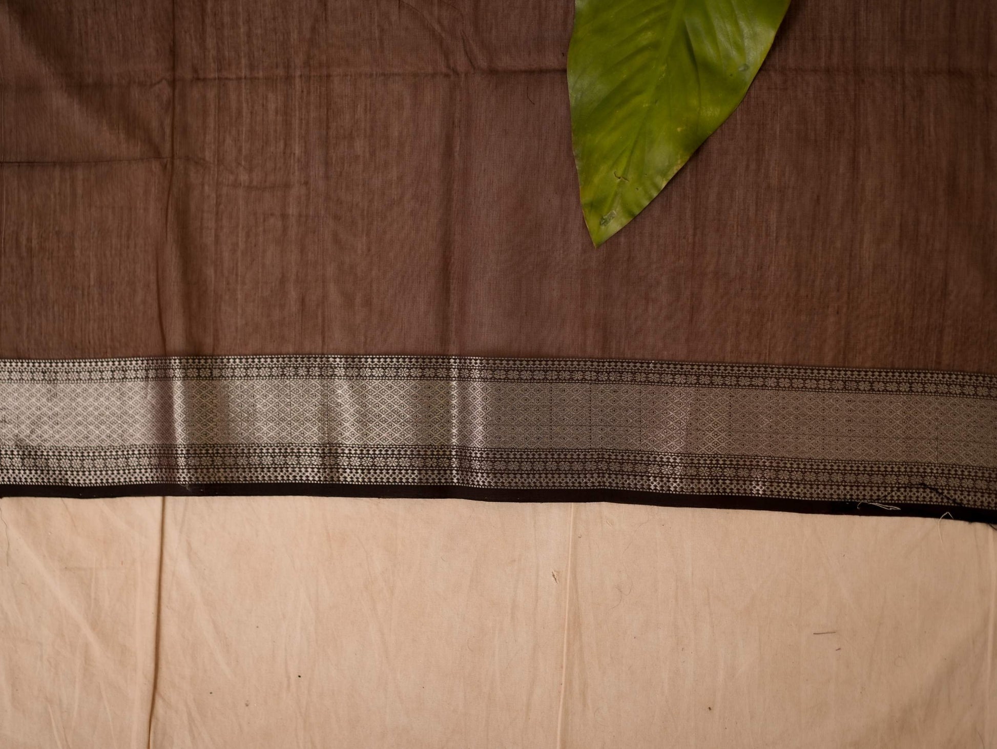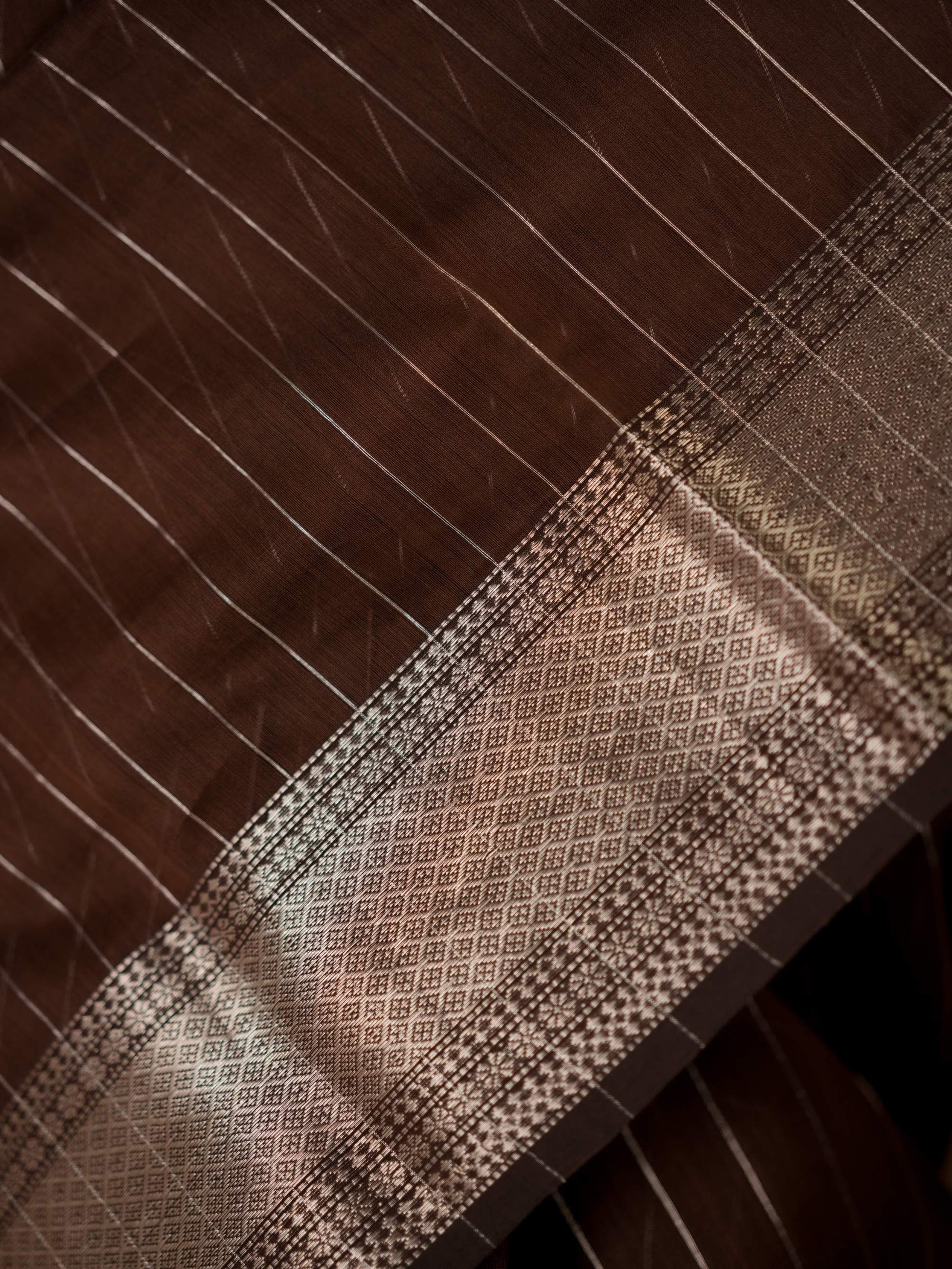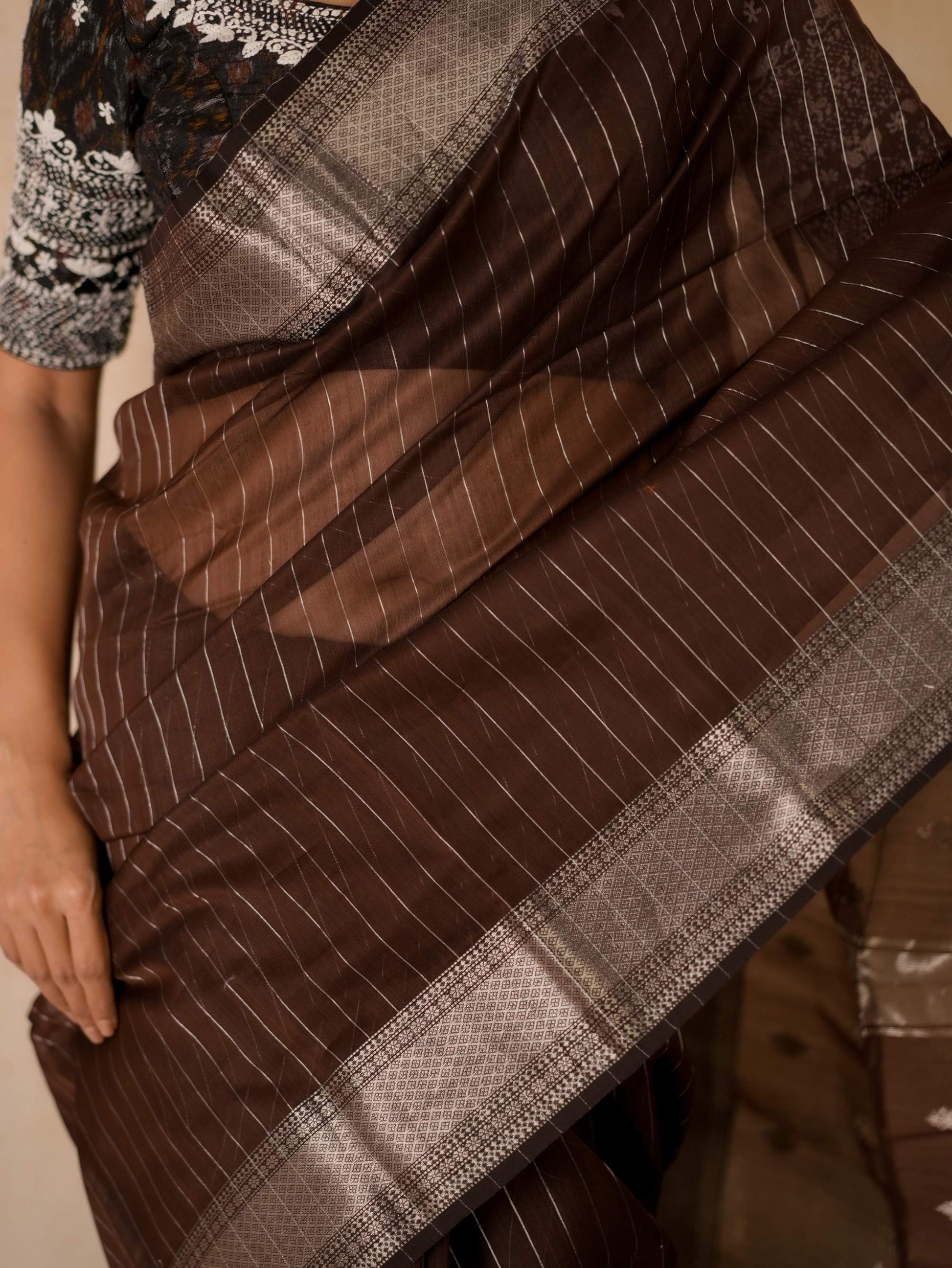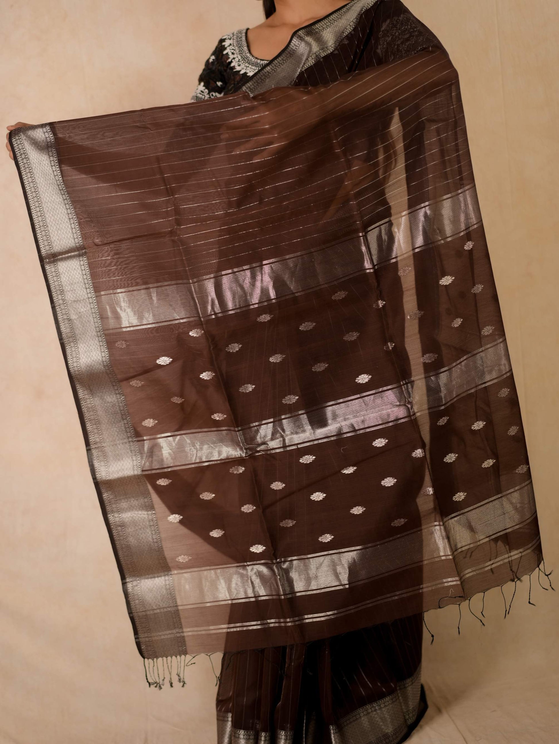 Elevate your ethnic wardrobe with our coco brown Maheshwari sico saree, featuring intricate silver stripes, a classic border in silver zari, and a striking floral motif palla in silver zari. This saree blends traditional artistry with modern elegance, perfect for any special occasion.