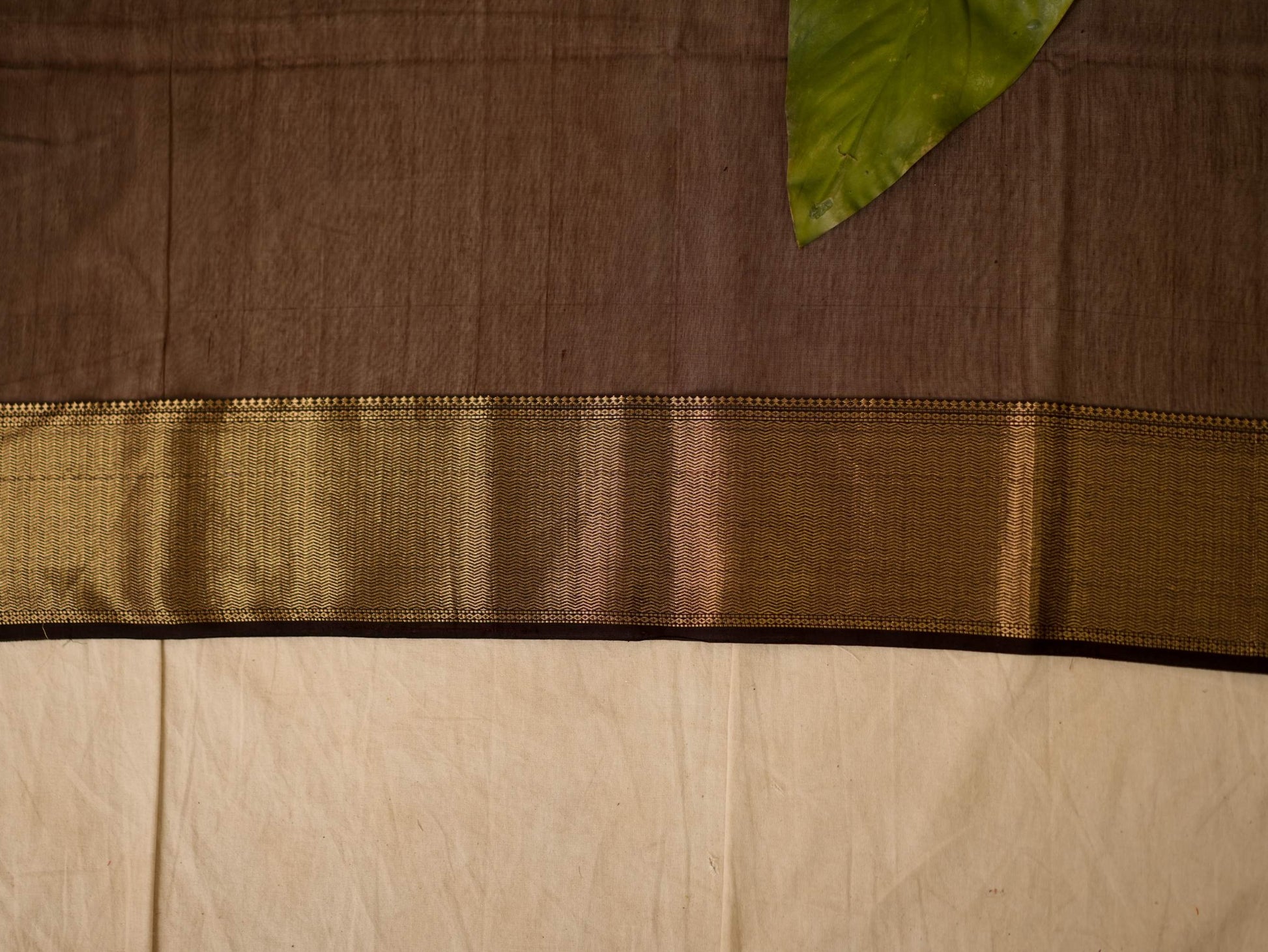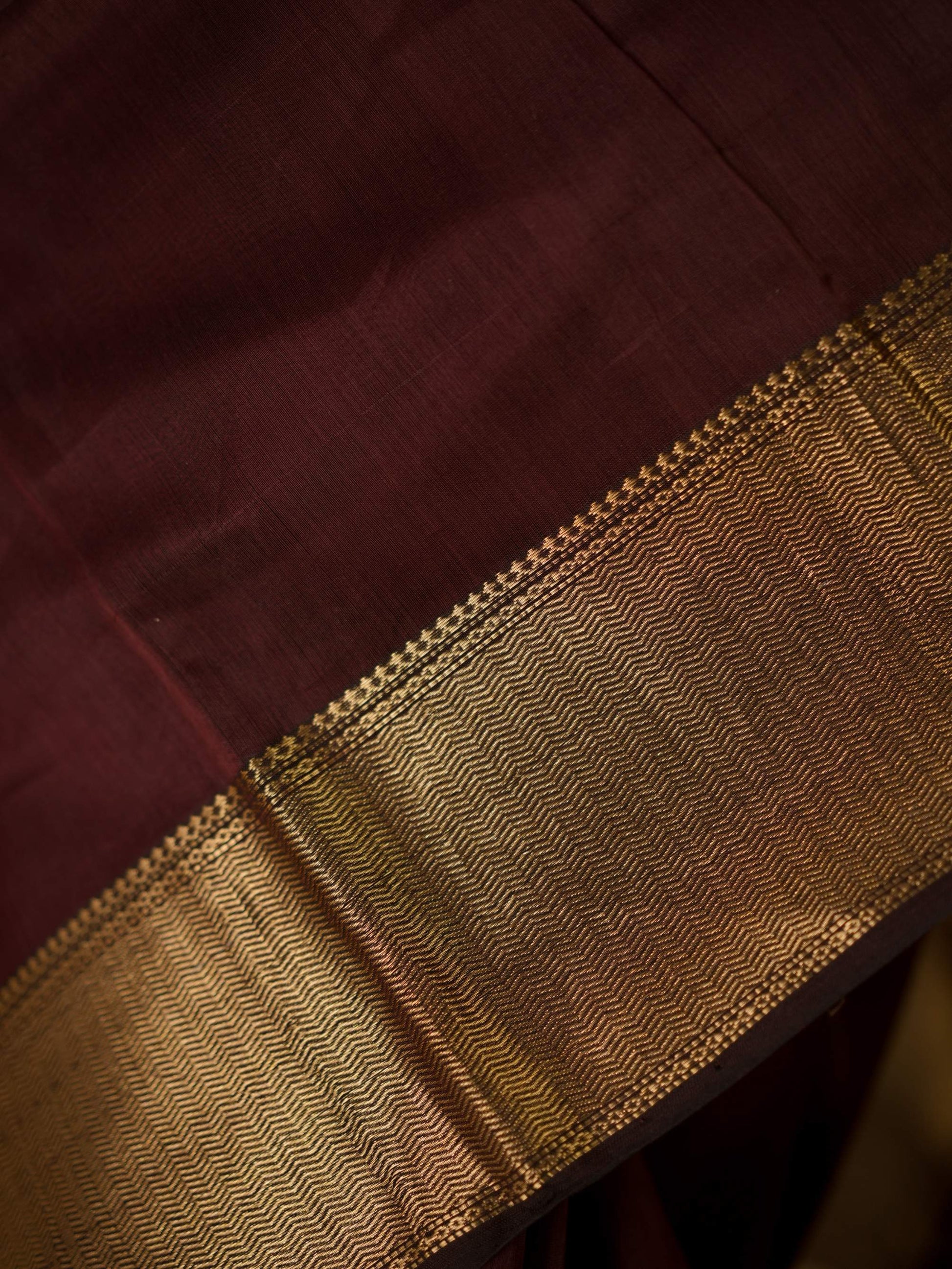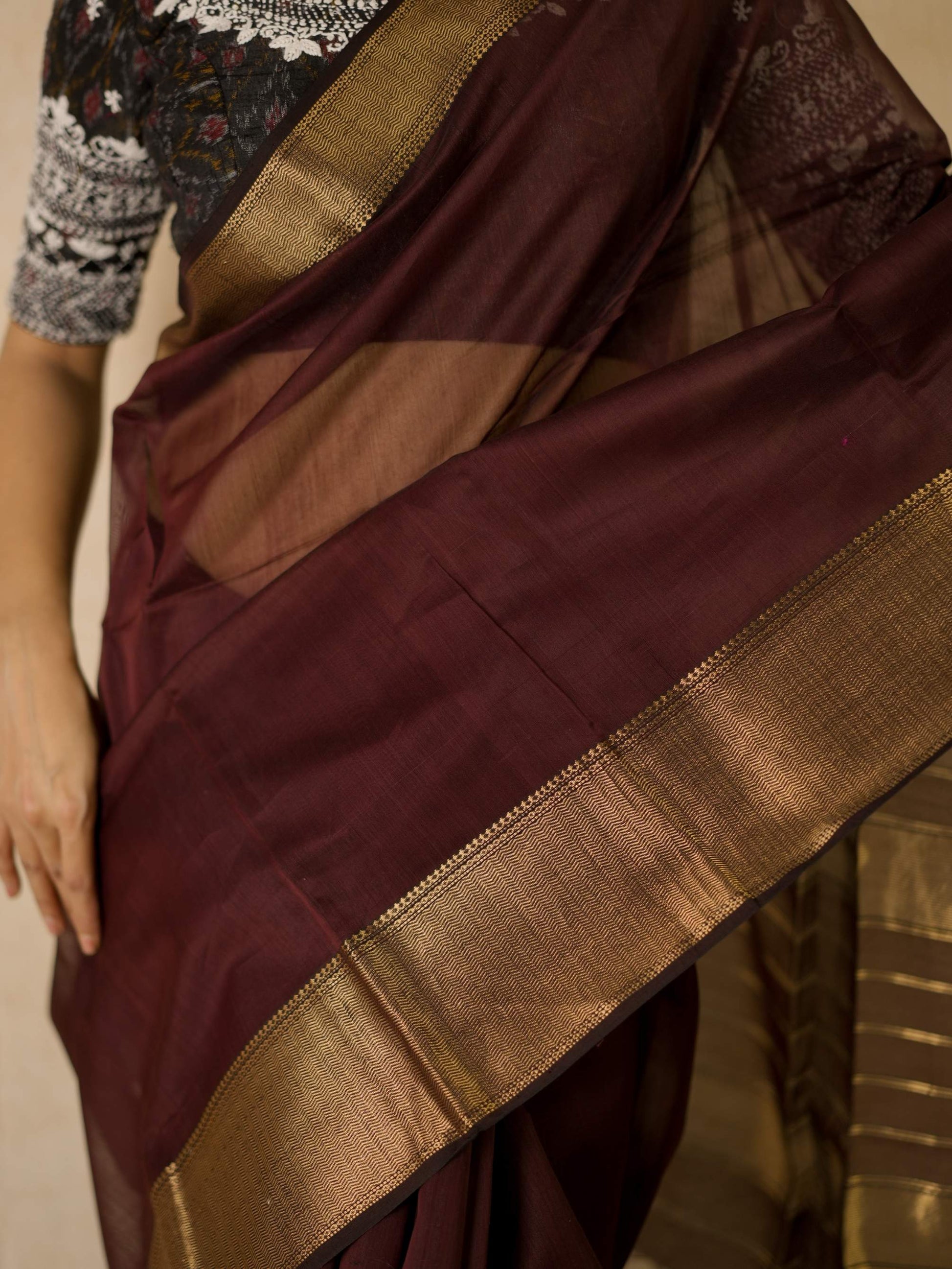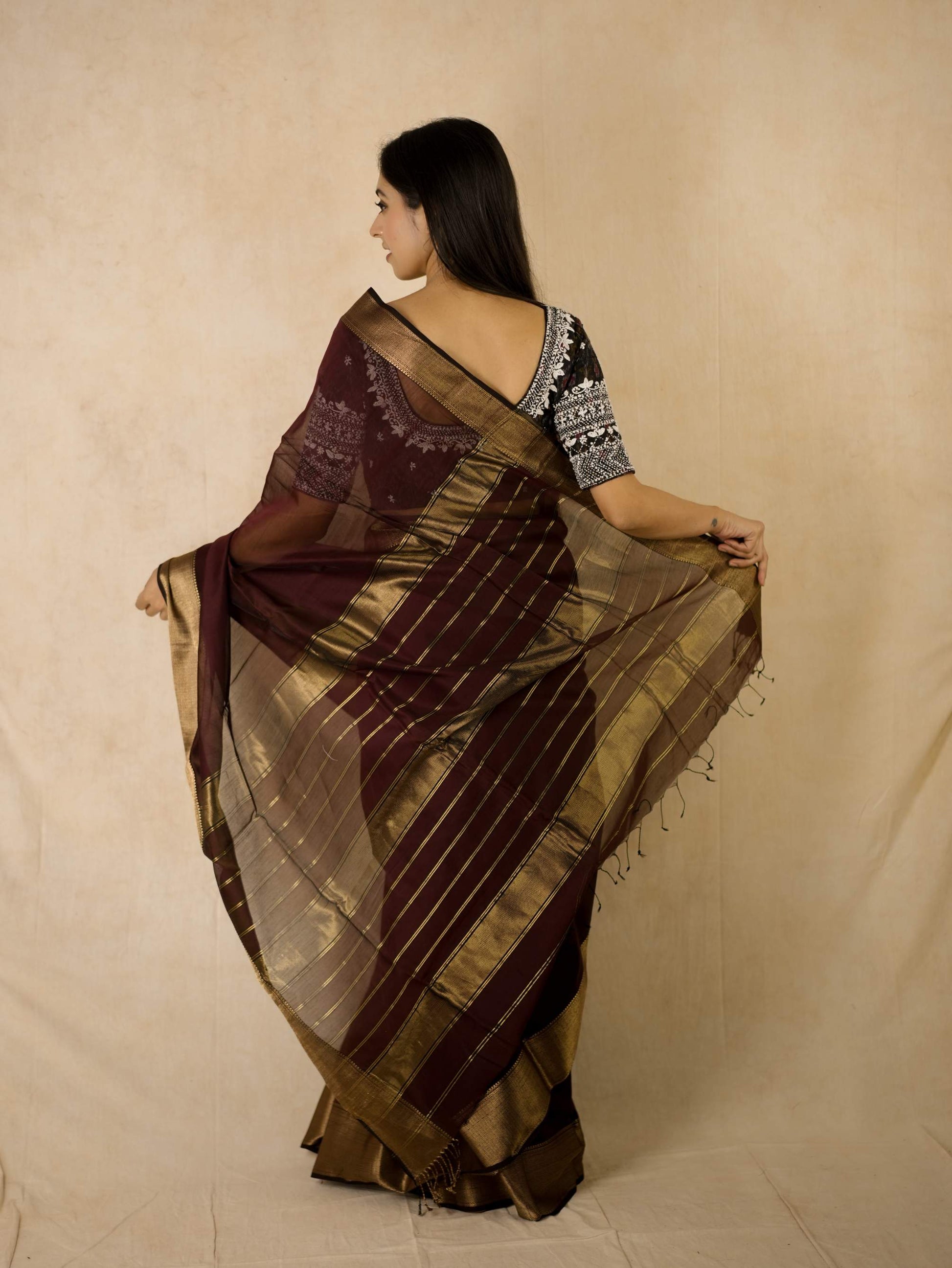 Elevate your ethnic wardrobe with our dark brown Maheshwari sico saree, featuring intricate, a classic Narmada border in golden zari, and a striking stripped palla in contrasting golden zari. This saree blends traditional artistry with modern elegance, perfect for any special occasion