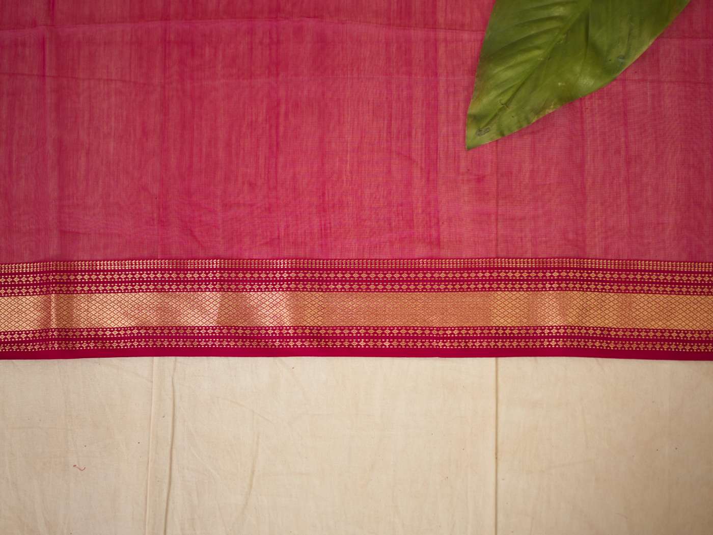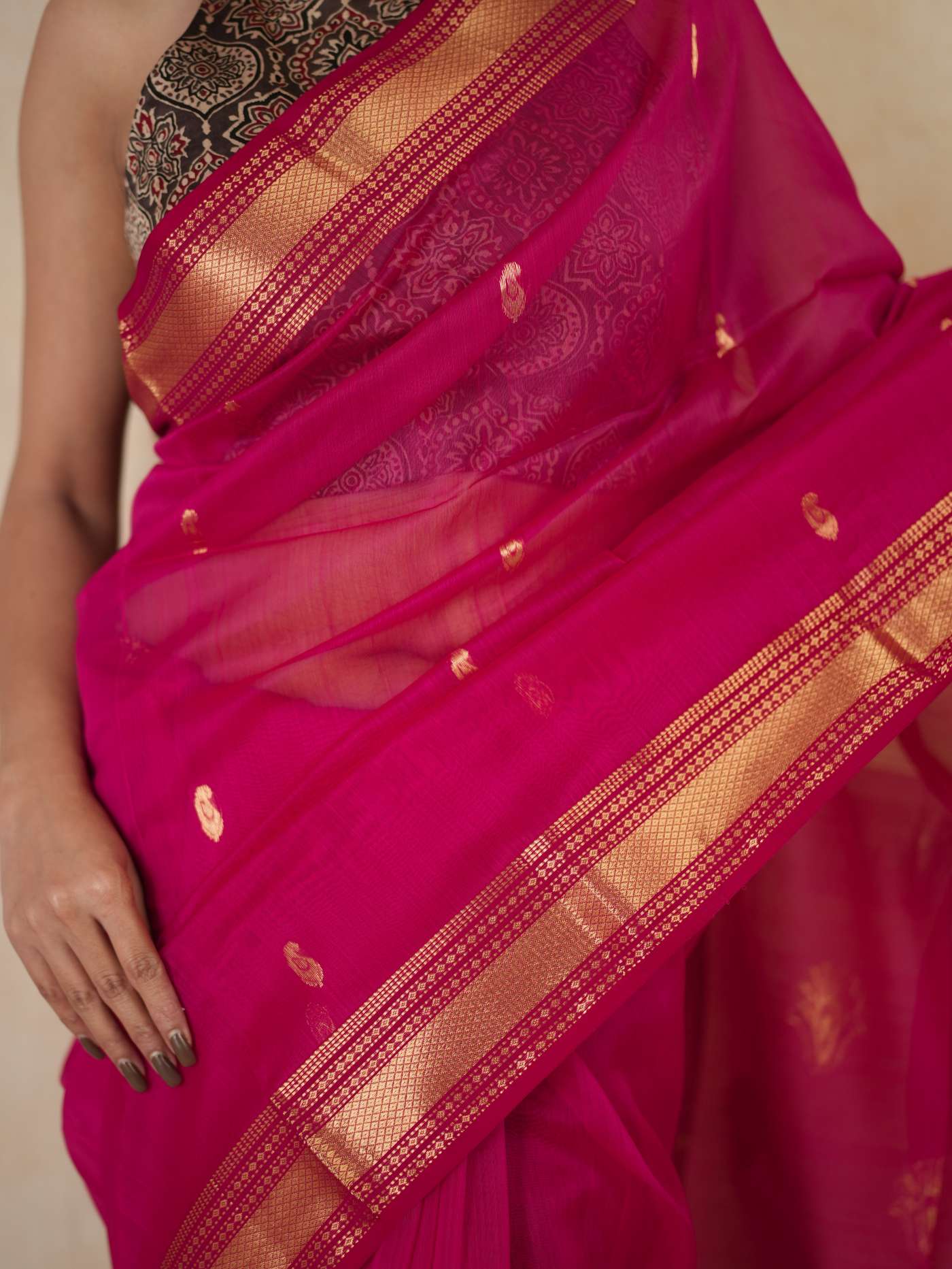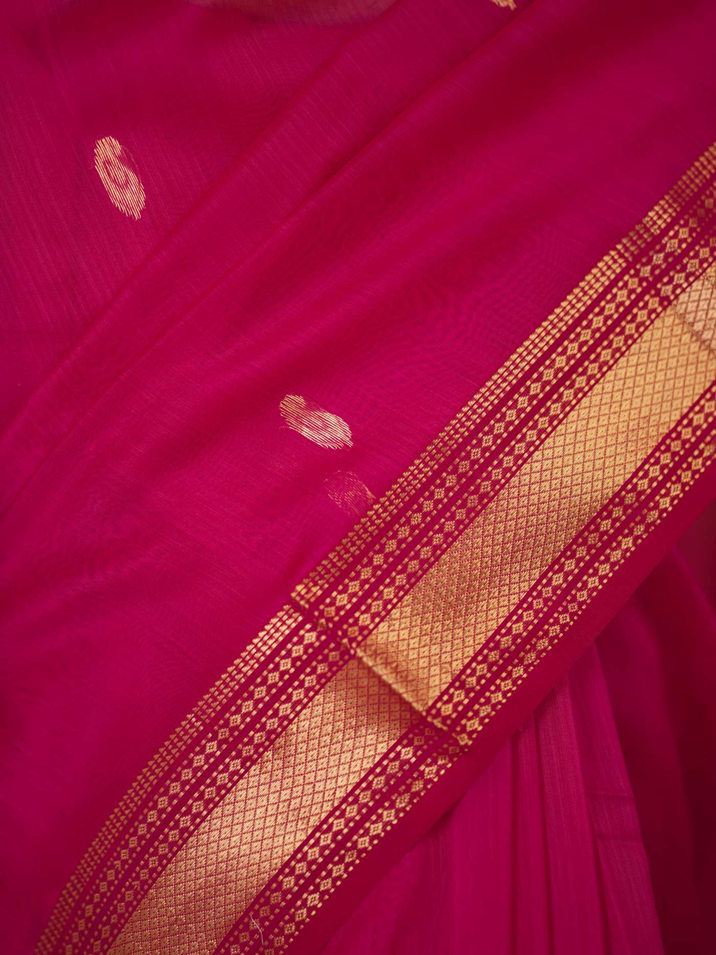 Elevate your ethnic wardrobe with our rani pink Maheshwari Sico Saree, featuring intricate small butas, a classic in golden zari, and a striking golden zari palla. This saree blends traditional artistry with modern elegance, perfect for any special occasion.