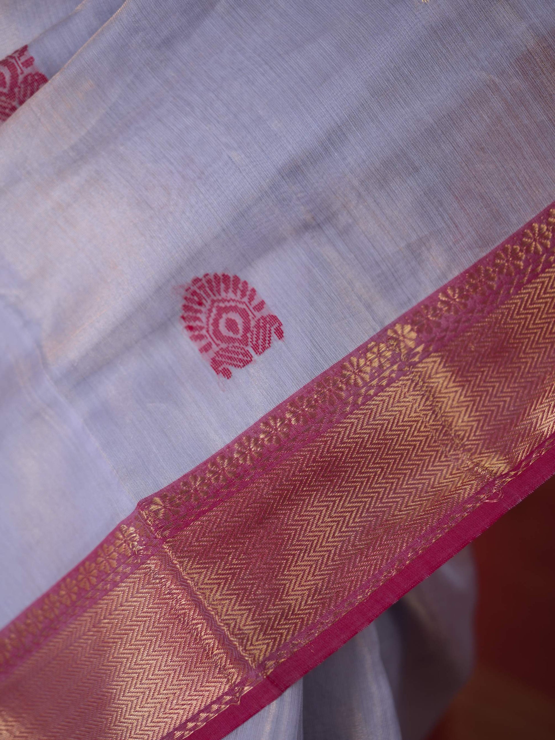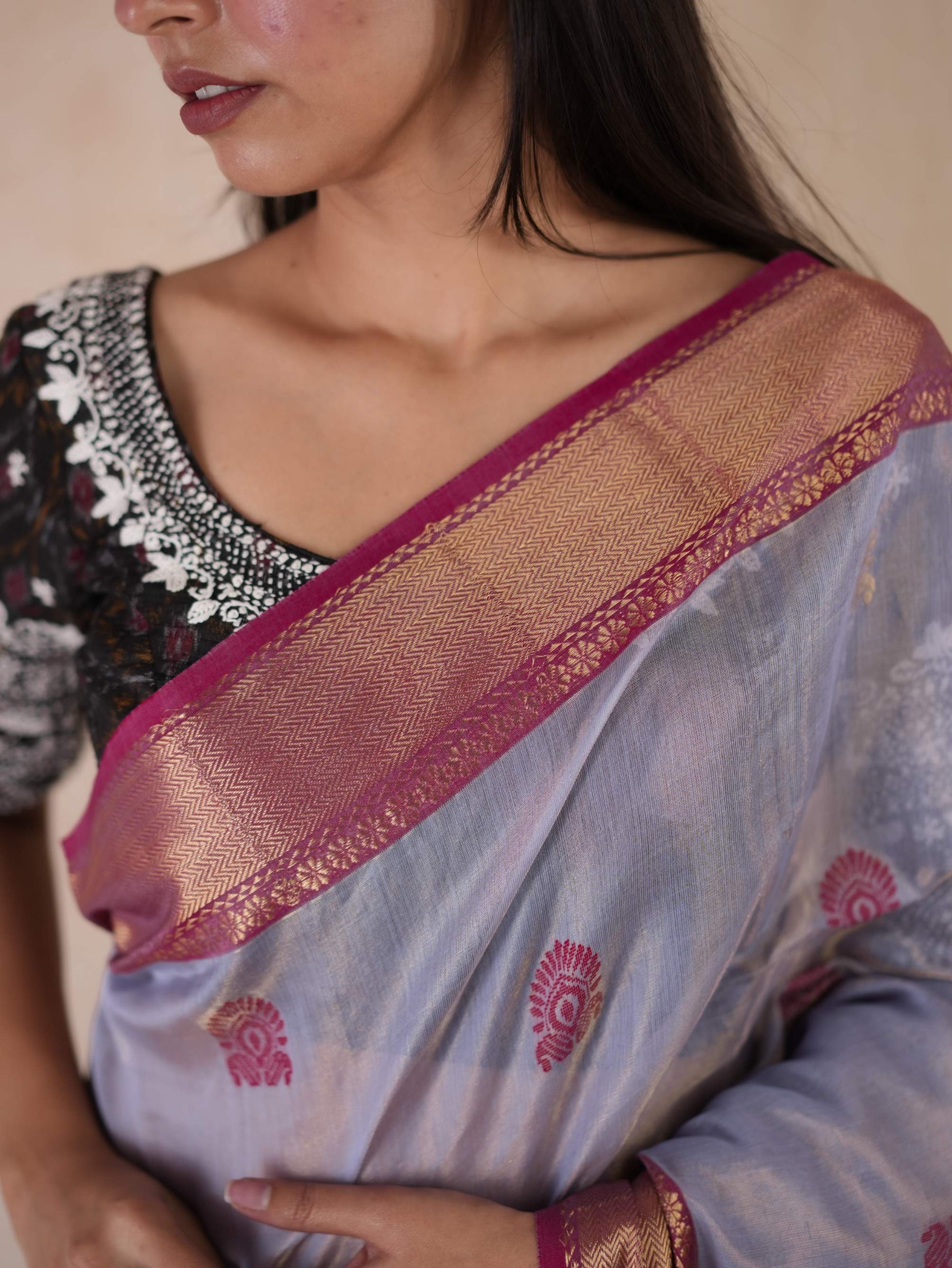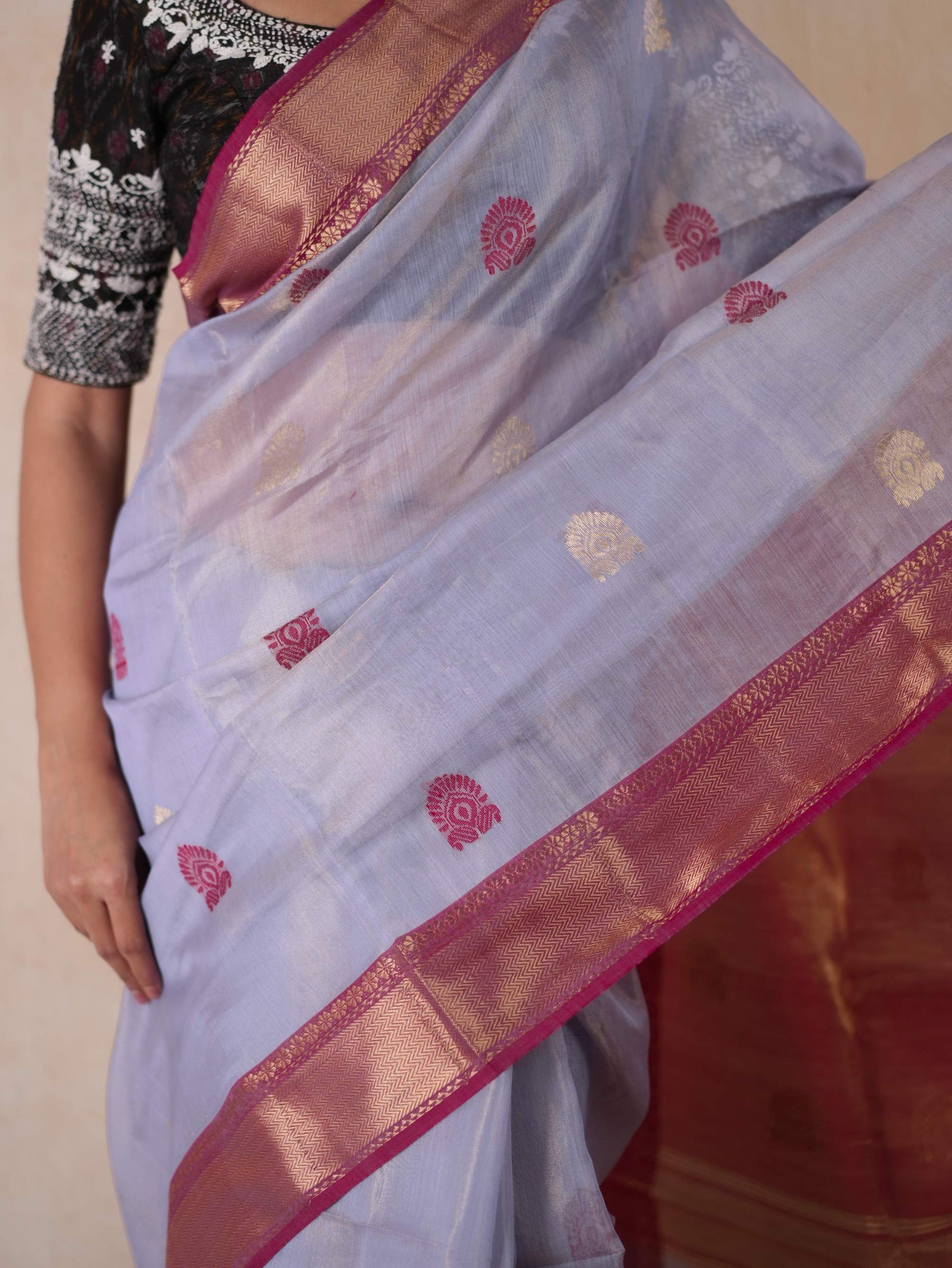 Elevate your ethnic wardrobe with our lavender Maheshwari sico saree, featuring , a classic Khatiya border with silver zari, and a striking stripped palla with floral motifs in silver zari. This saree blends traditional artistry with modern elegance, perfect for any special occasion