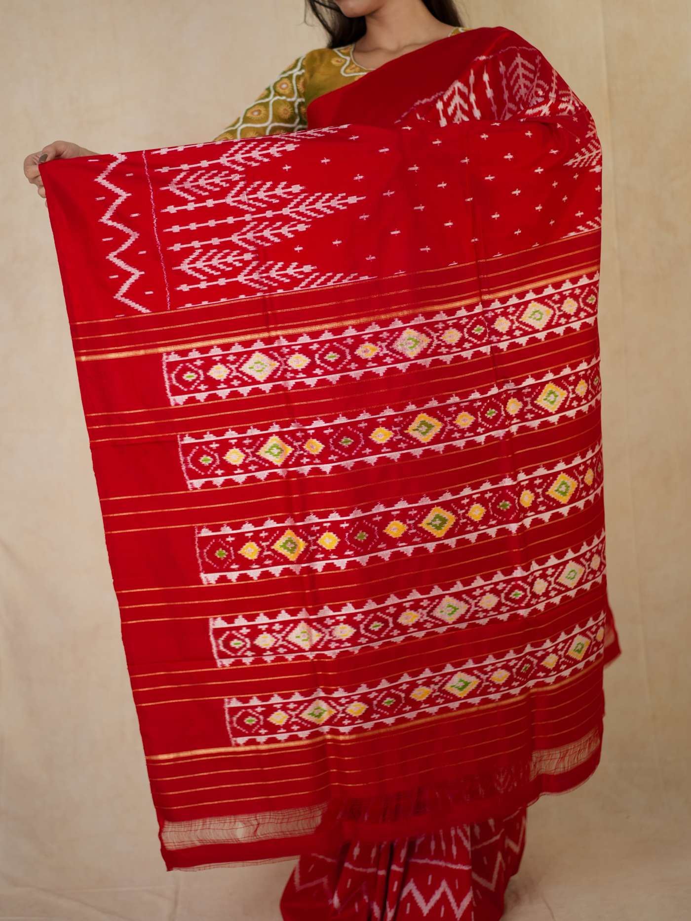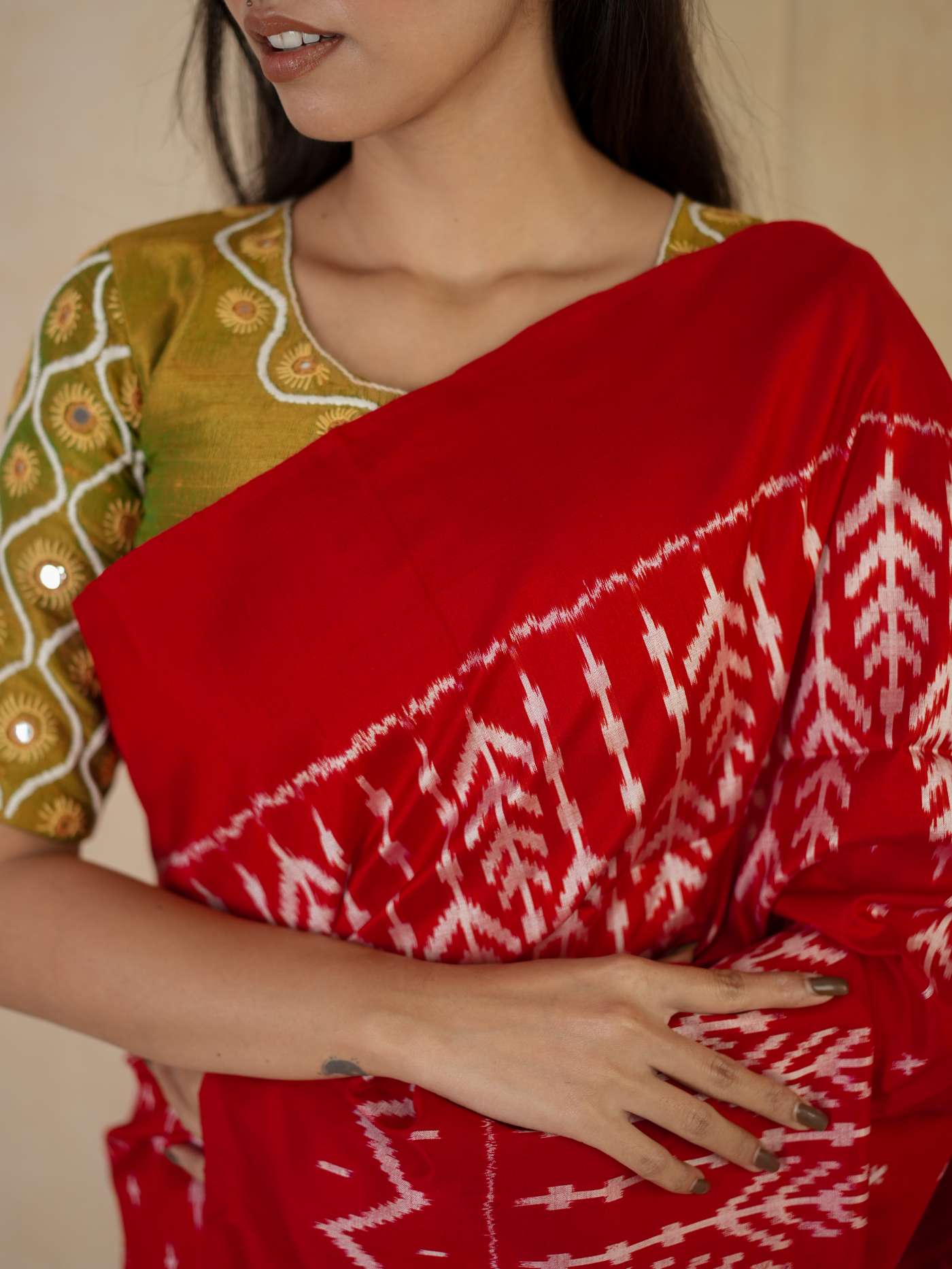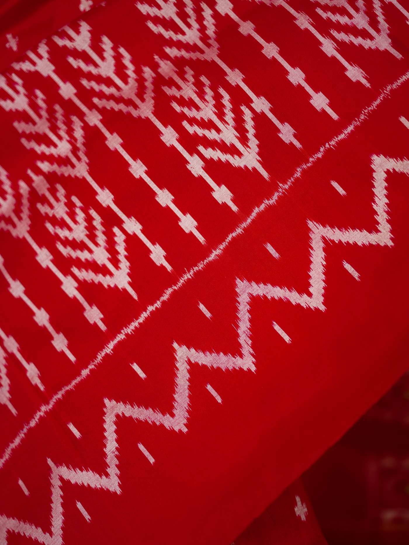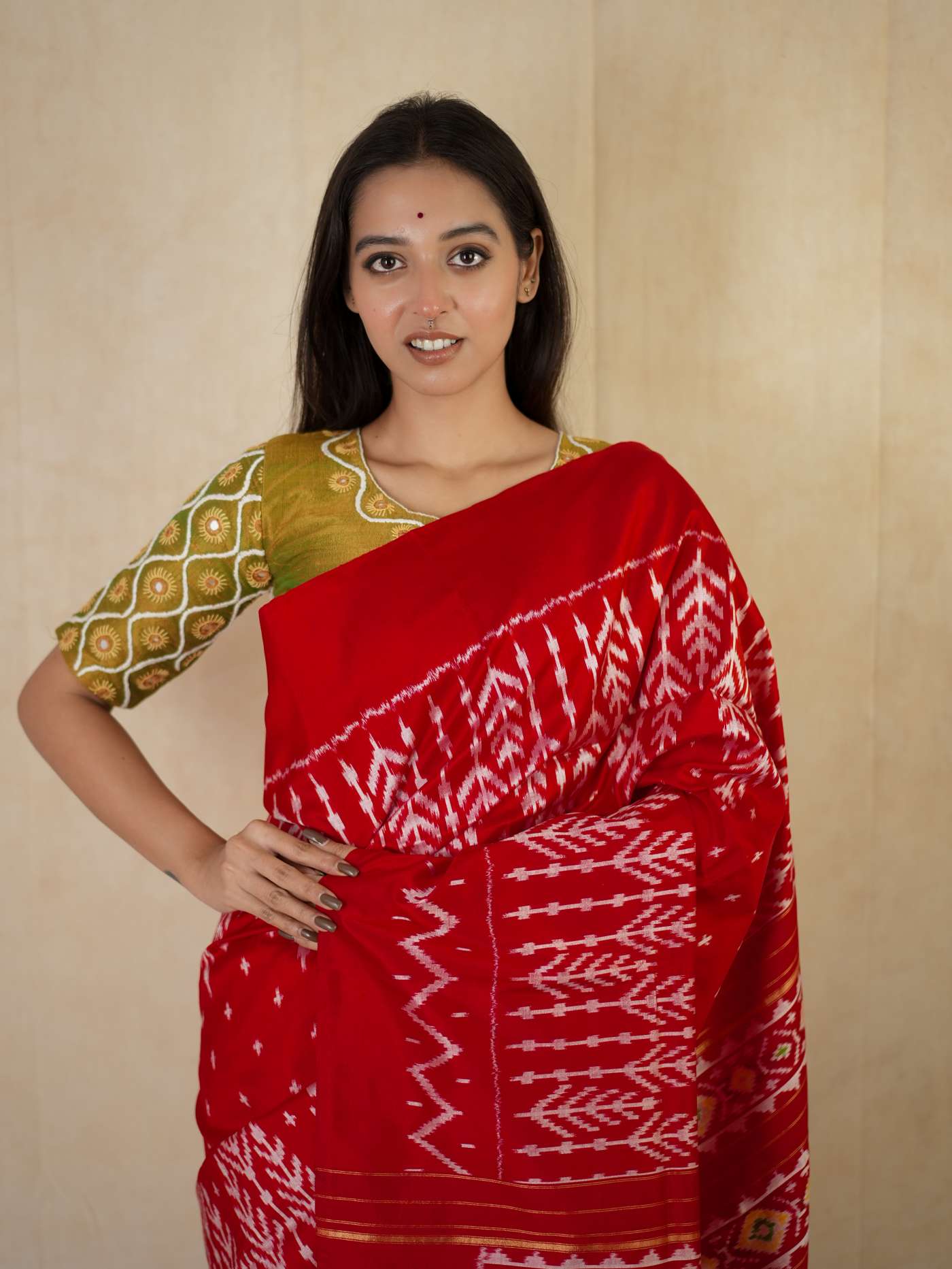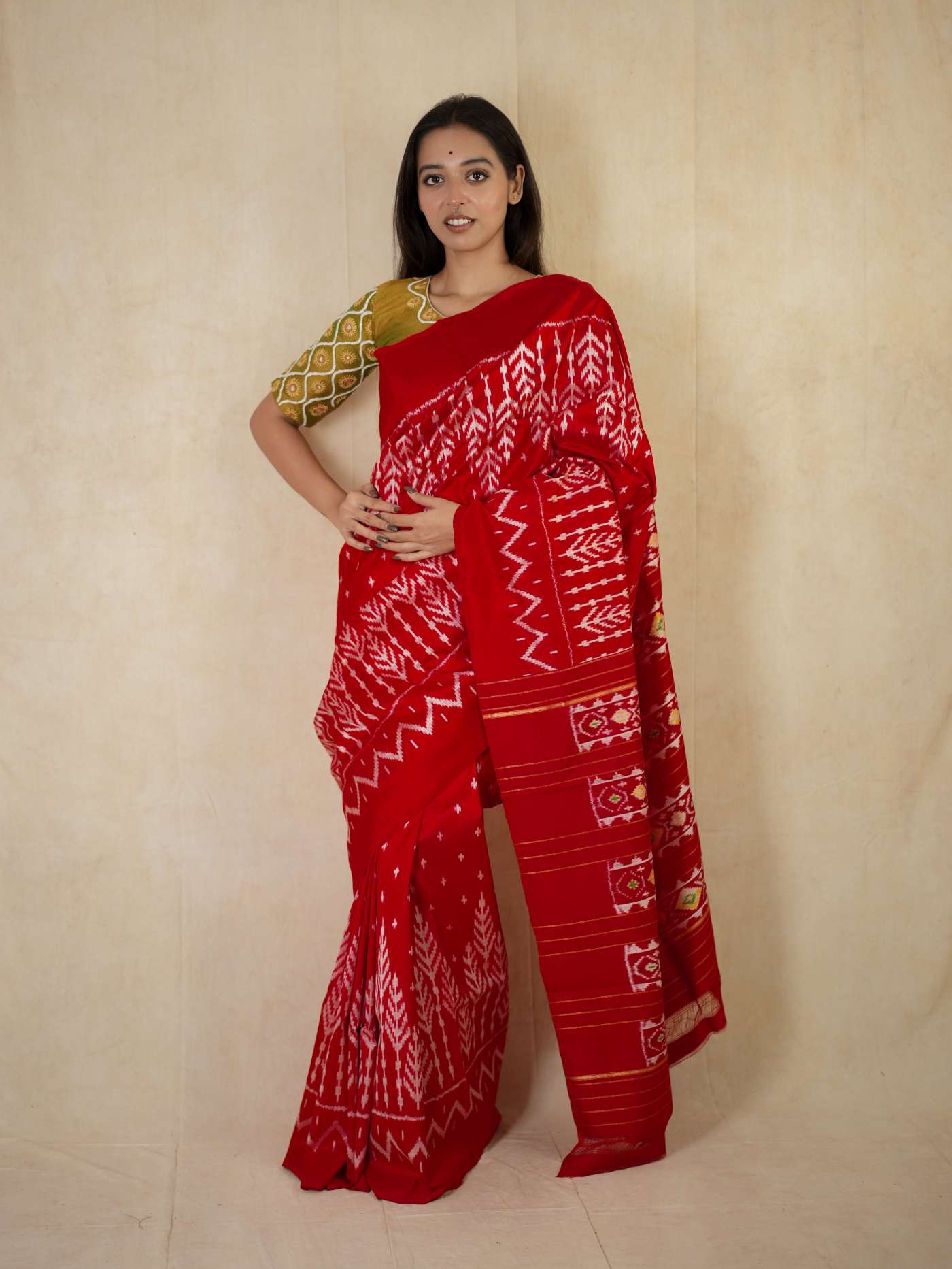 Add a touch of elegance to your ethnic wardrobe with our handwoven silk pochampally saree, featuring off white coloured ikkat inspired motifs on red monochromatic body. The highlight of this saree is the striking border featuring mostly zigzag pattern that add a regal touch. Perfect for any occasion , this saree effortlessly combines tradition with contemporary style, ensuring you to always look your best.