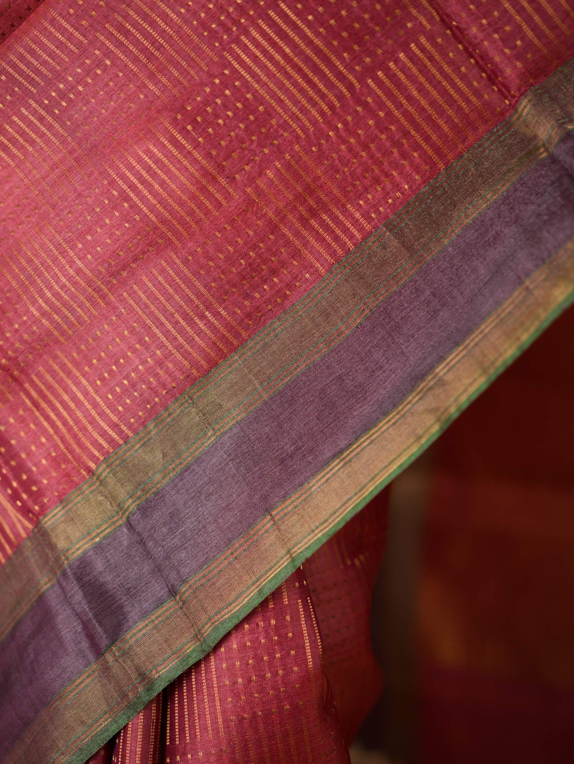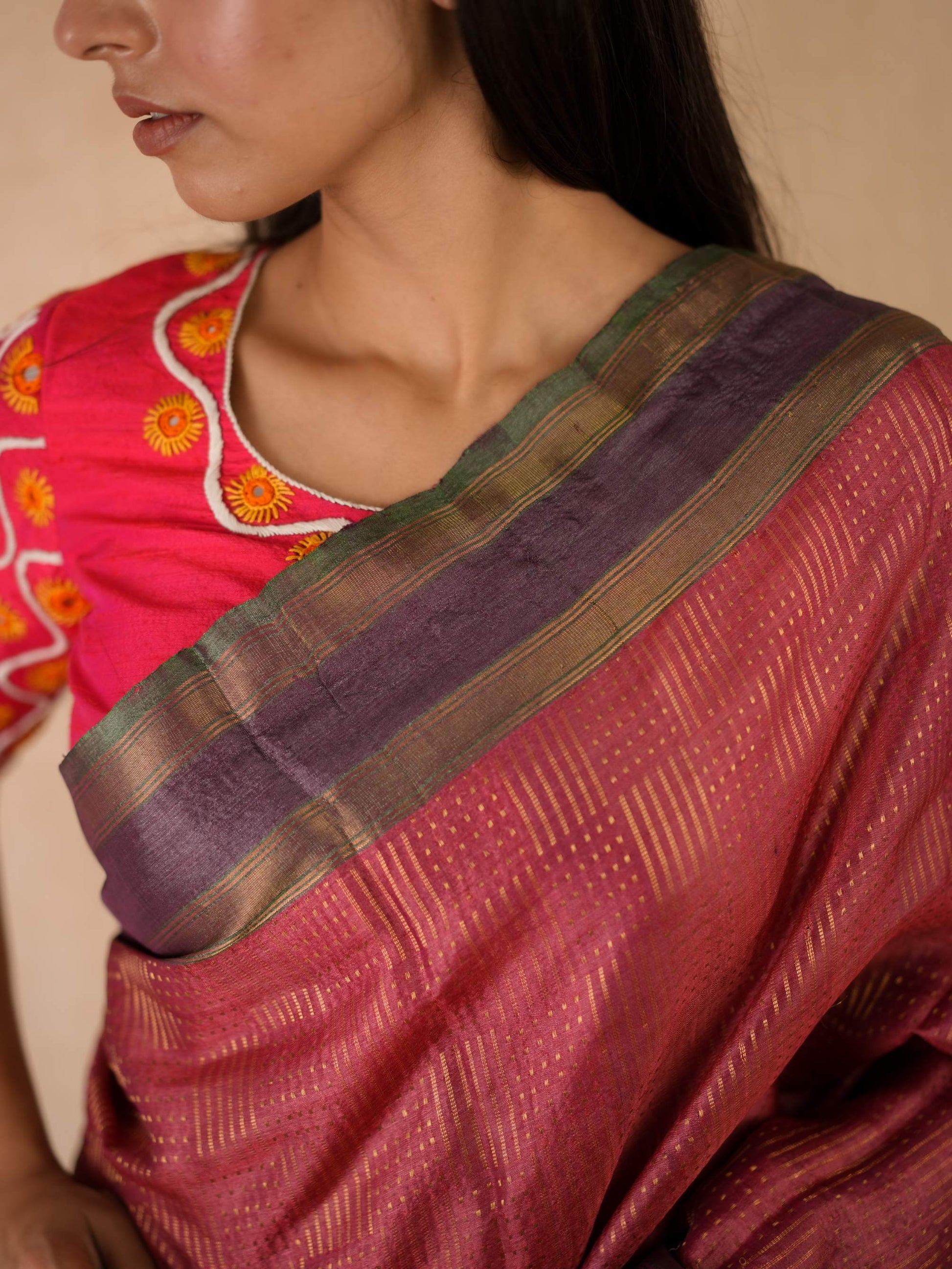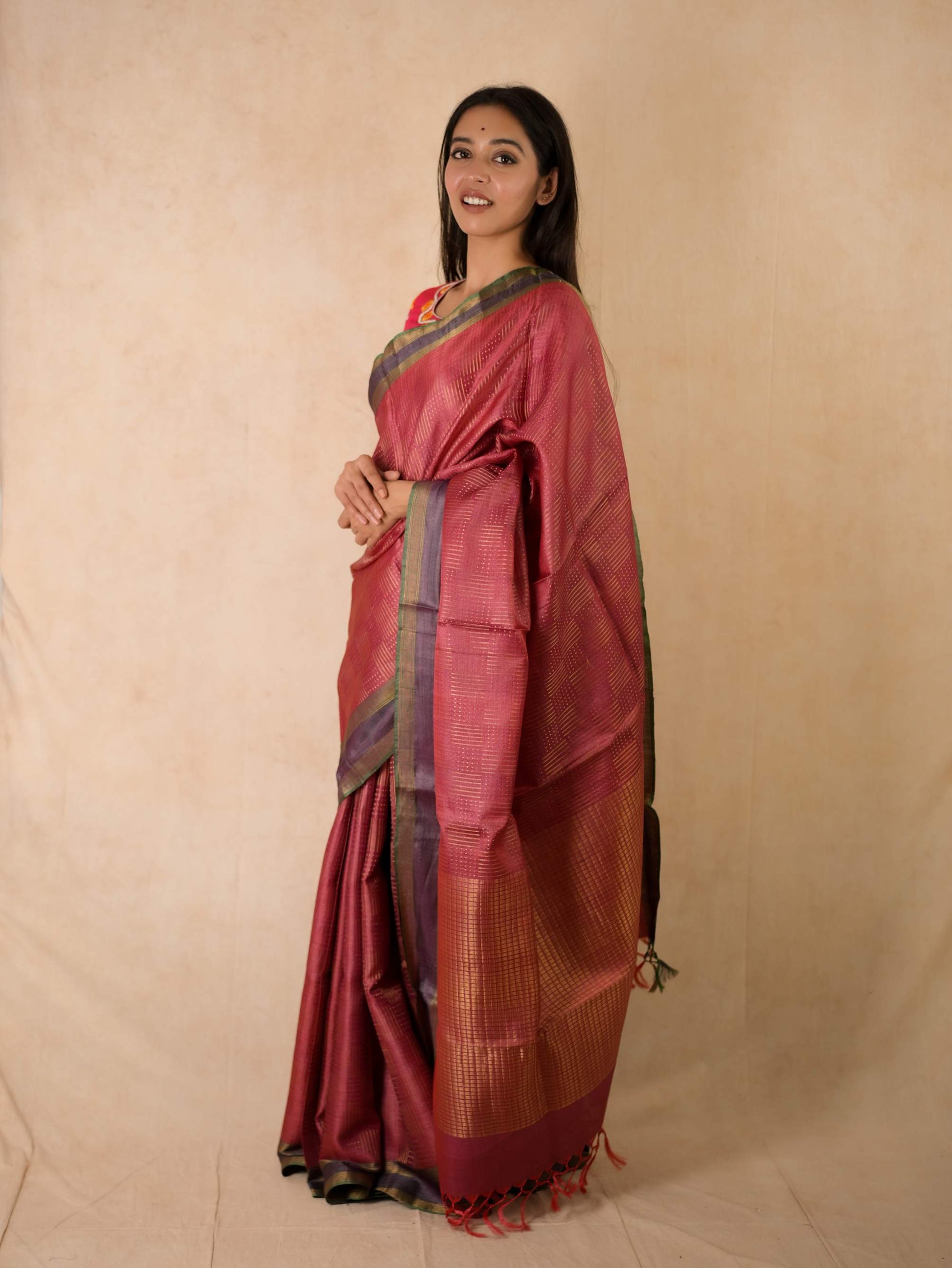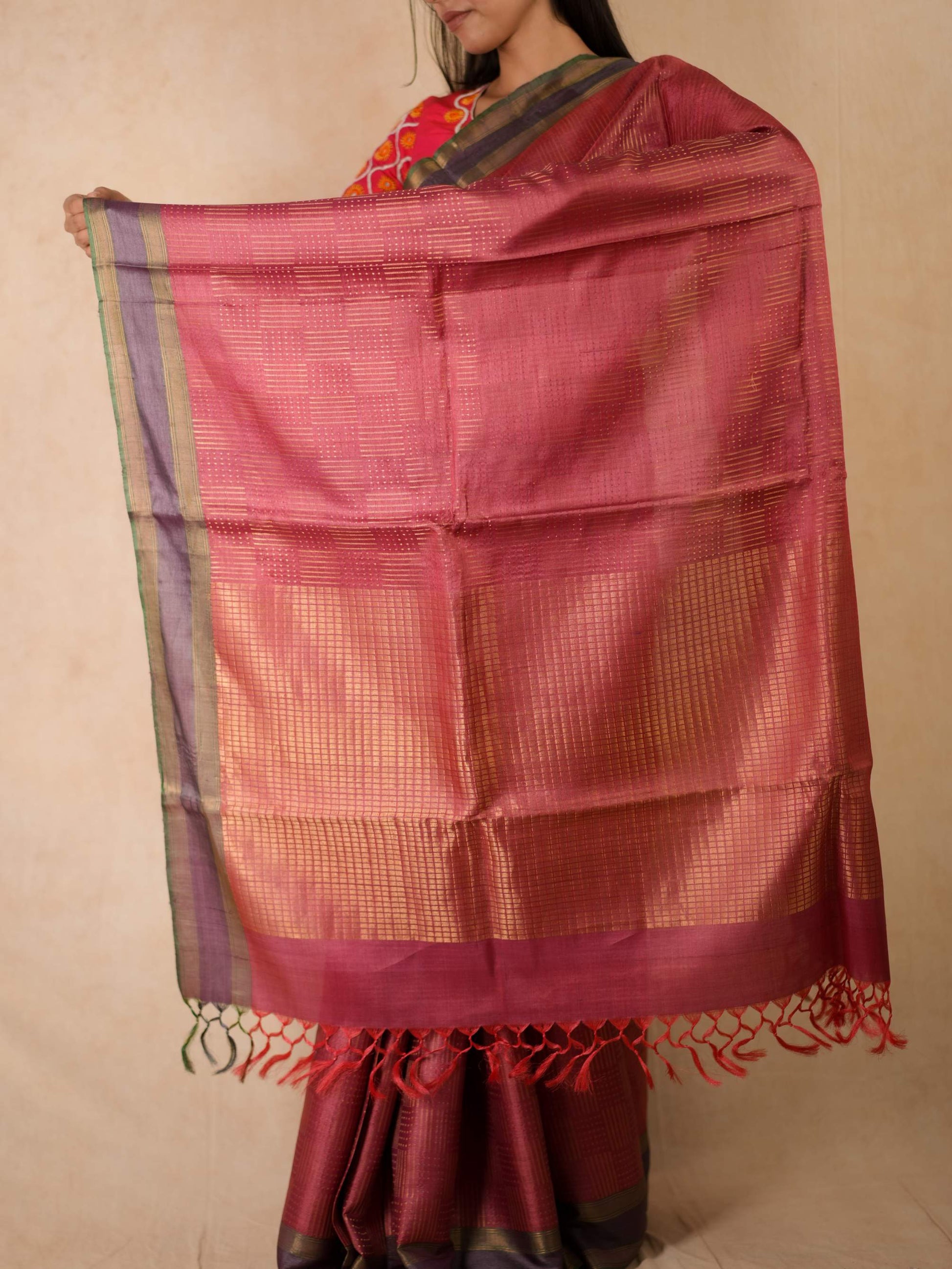 Immerse yourself in the regal charm of our pink Handwoven Kosa silk saree from Chhattisgarh, adorned with a shimmering blend of golden zari work all across the body. Renowned for its natural sheen and refined elegance, this saree is a true reflection of Chhattisgarh’s rich weaving heritage. Perfect for special occasions, it embodies timeless sophistication and the unmatched artistry of traditional craftsmanship.