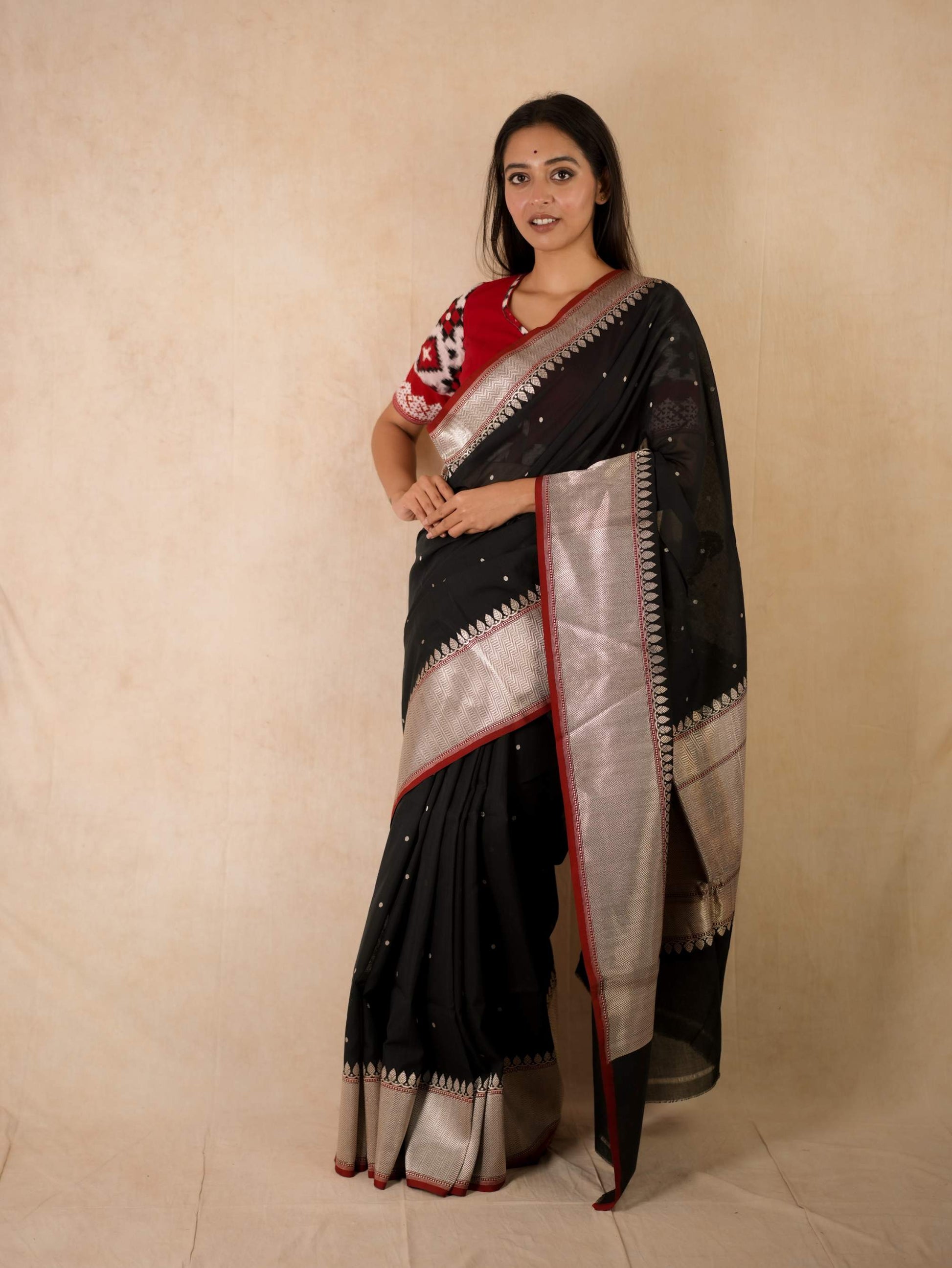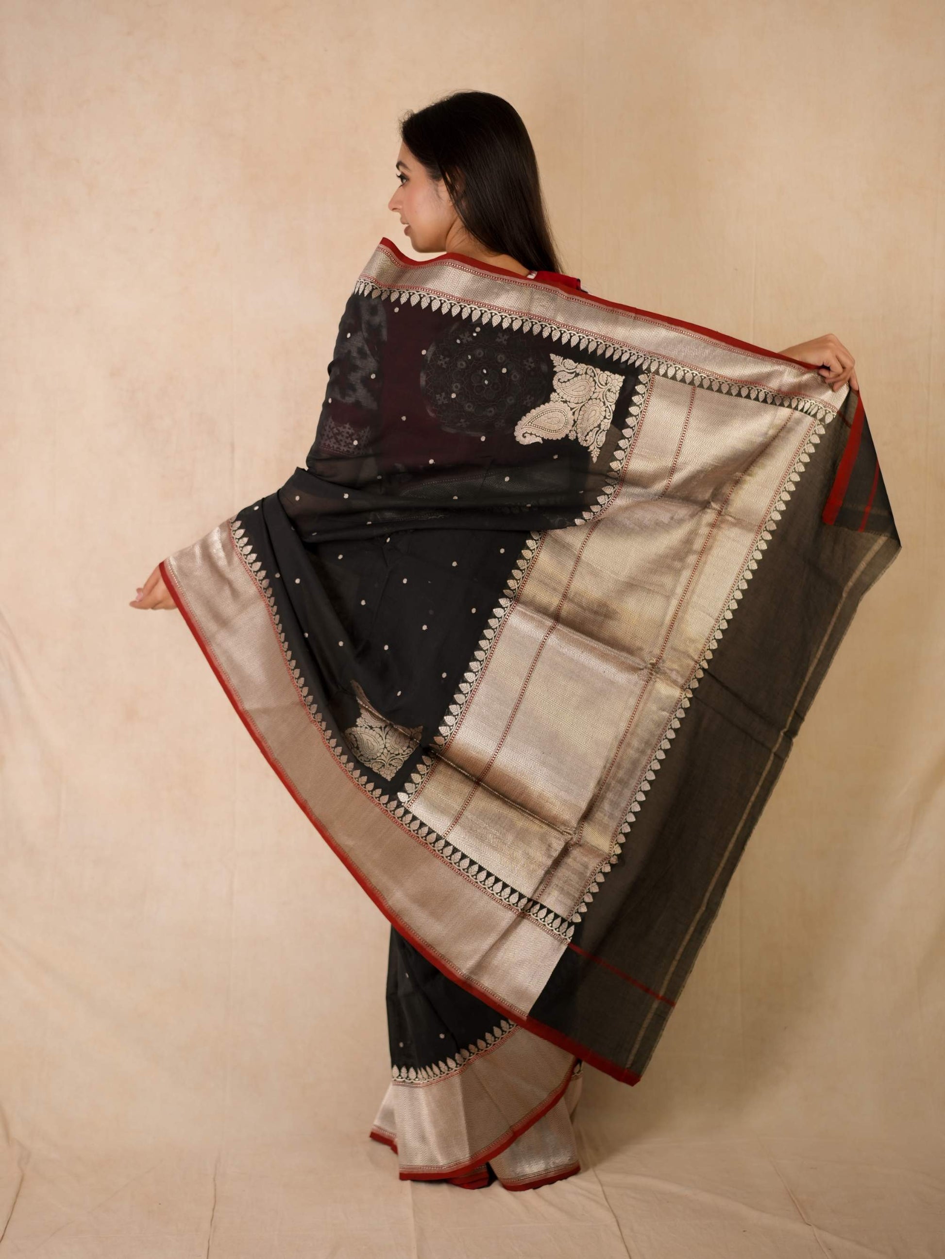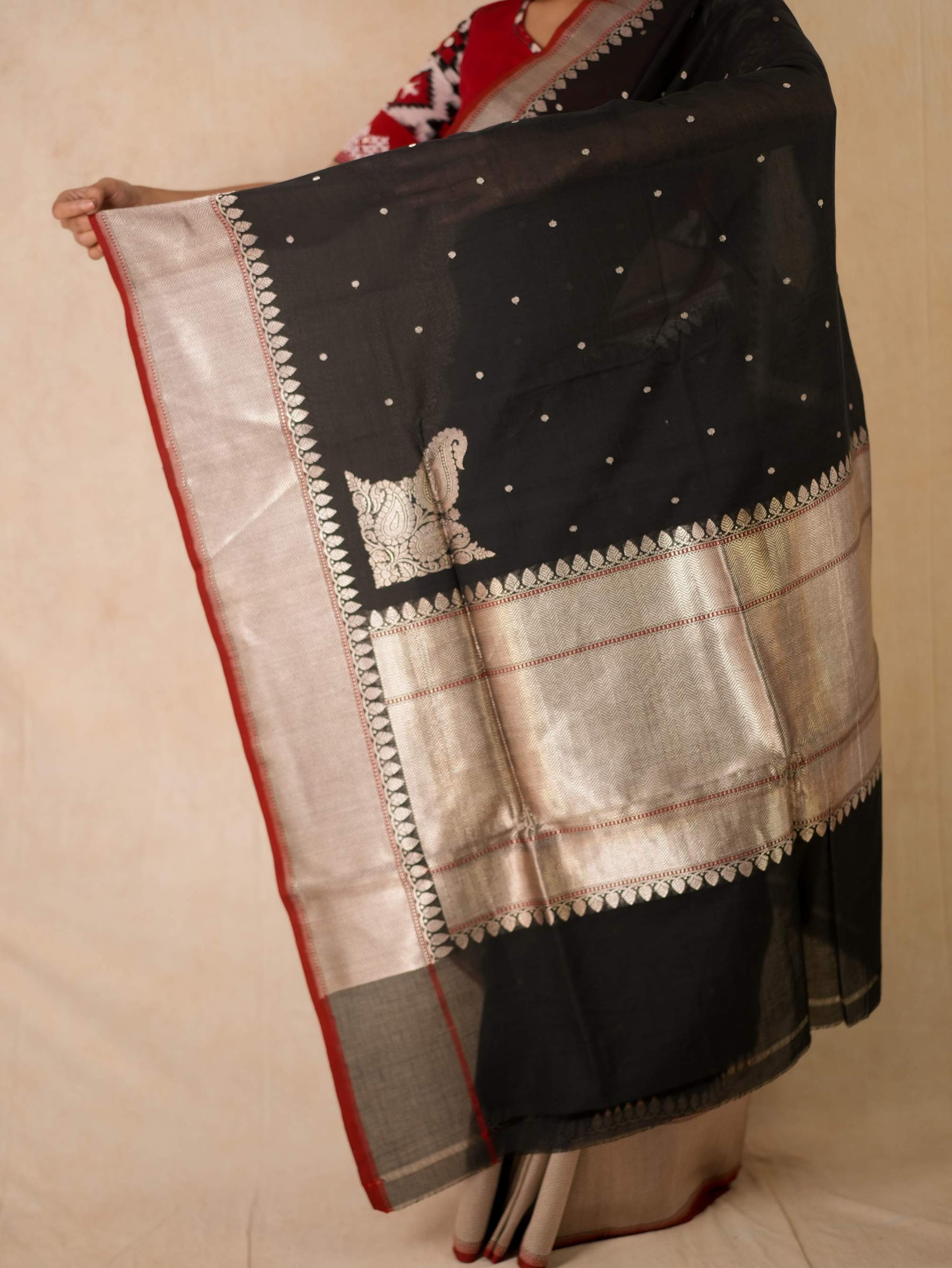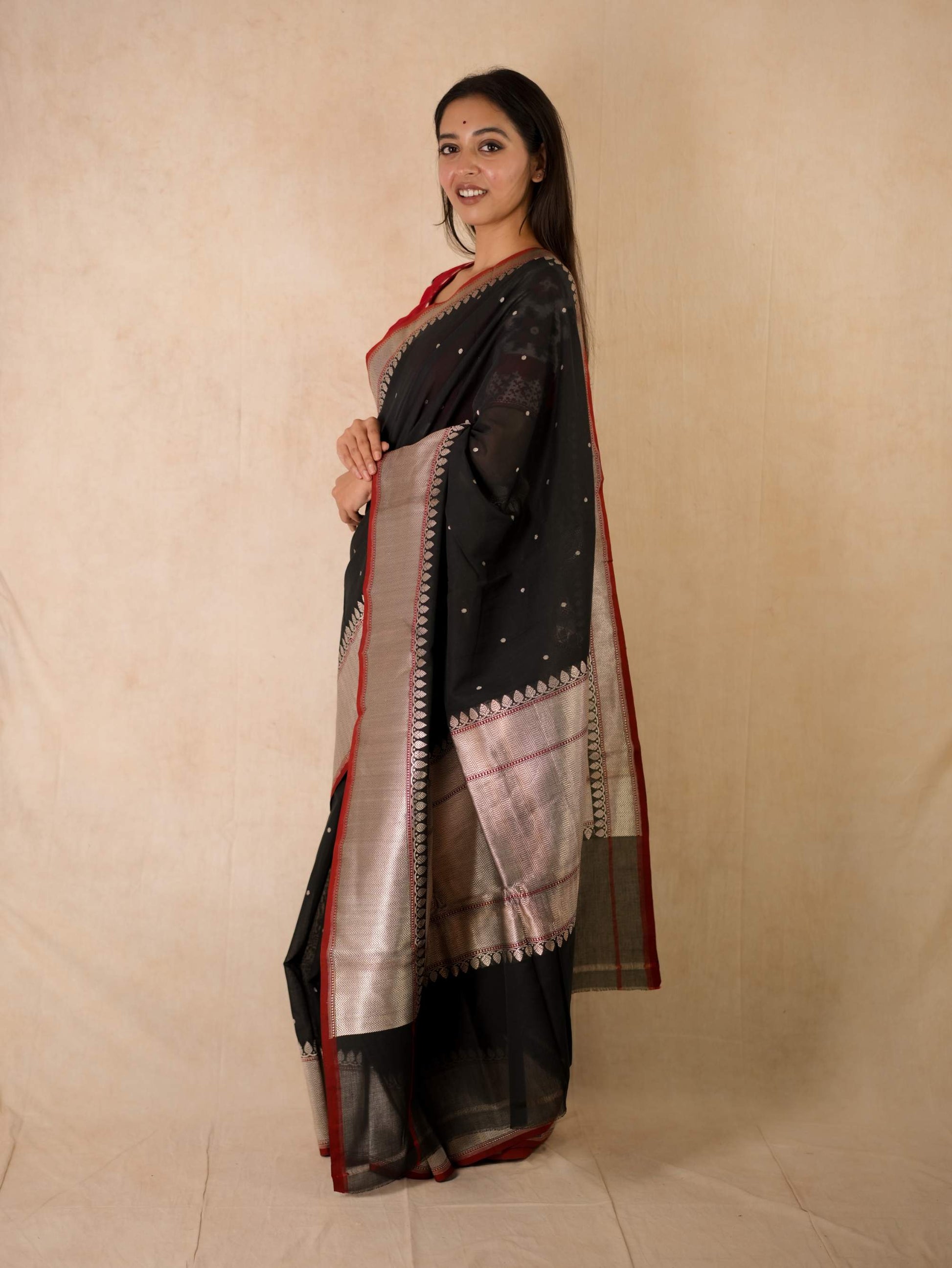 Discover the grace of black cotton Banarasi sarees, where elegance meets comfort. It is crafted with delicate silver zari work in the border and pallu. The red coloured selvedge gives a contrasting edge to the look the saree itself. The saree blended with the softness of cotton with the intricate craftsmanship of Banaras are perfect for both festive occasions and everyday elegance. Embrace timeless style with a touch of heritage in every drape.
